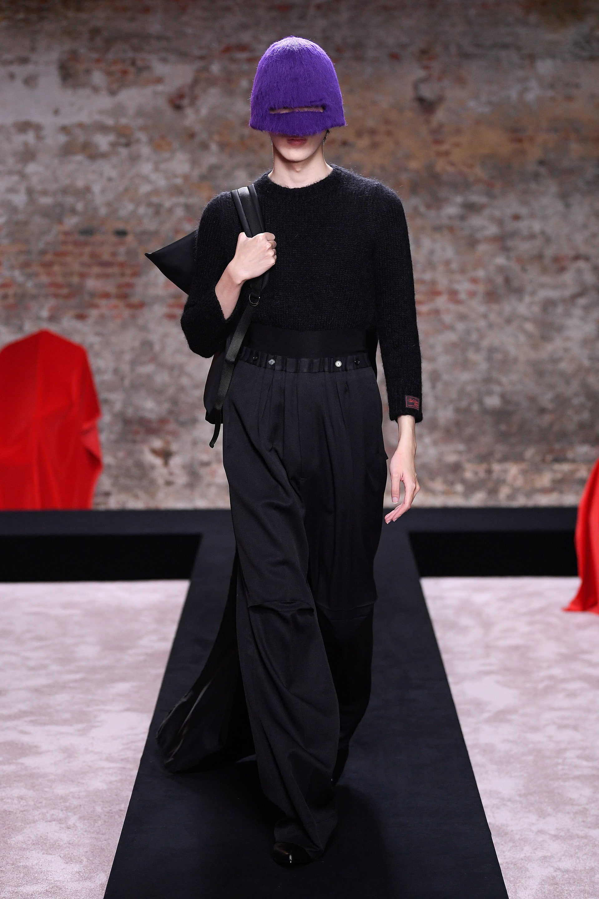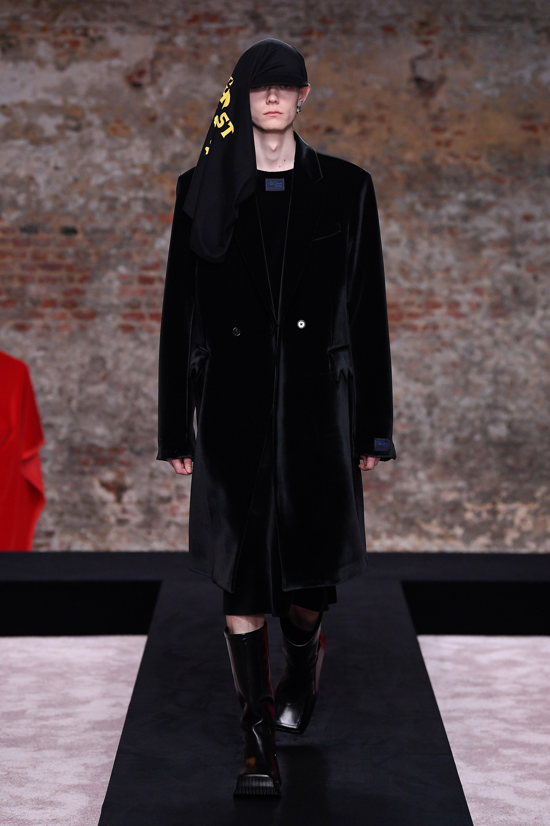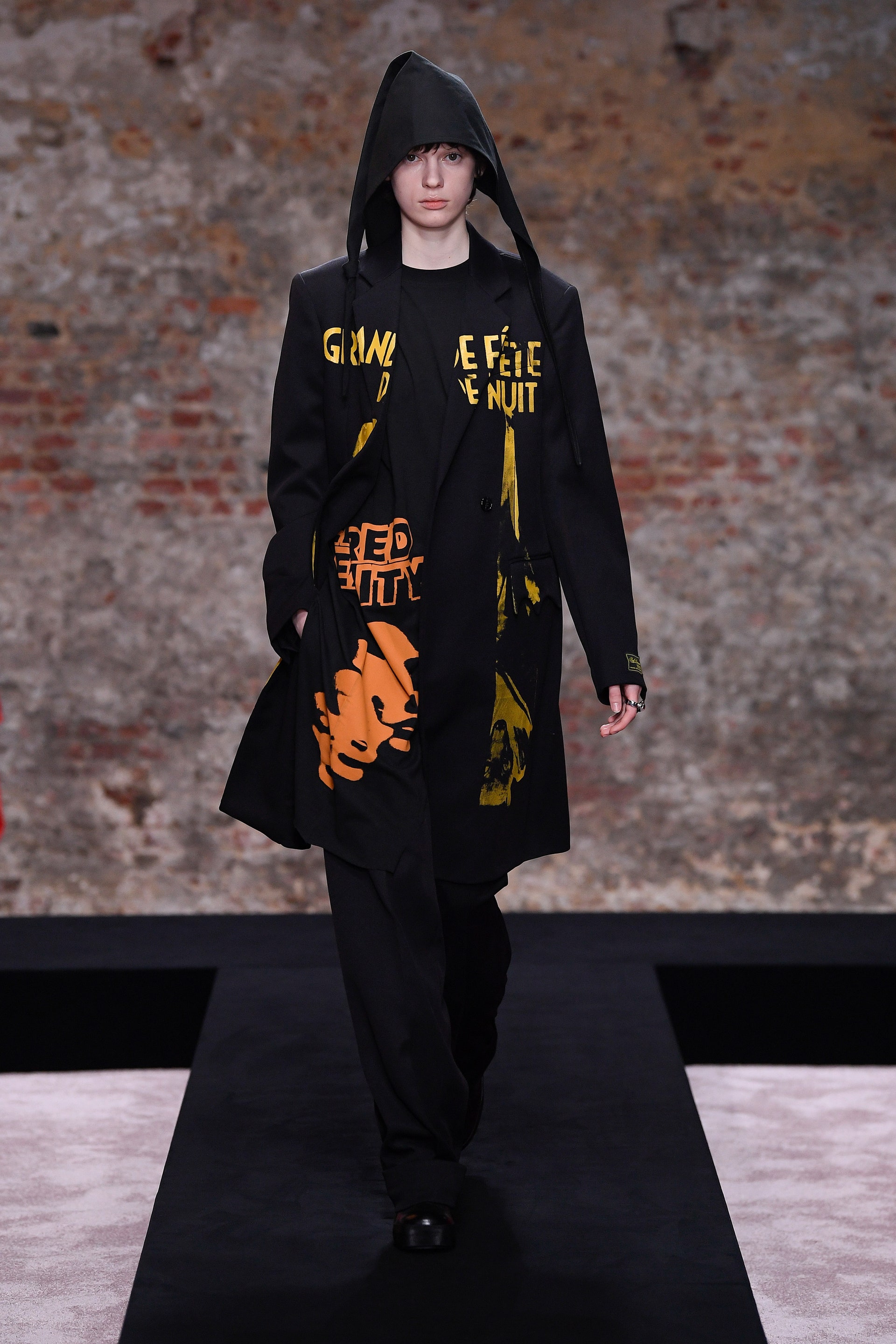 Вдохновением для Симонса послужила картина Питера Брейгеля Старшего "Нидерландские пословицы" (или "Мир вверх тормашками"). Как в самой коллекции, так и в сет-дизайне выставочного пространства с подиумом превалировали оттенки красного, синего, яркого зеленого и фиолетового, а также глиняного и землисто-черного. Как и в весенней коллекции, дизайнер предложил носить куртки и рубашки с названиями и лайнами выдуманных гранж- и рок-групп и цветные панамы, к которым добавил мохеровые головные уборы с прорезями для глаз. Главным образом оммаж Брейгелю Старшему был выражен в синем плаще с цельнокроеным капюшоном-шляпой, повторяющем облачение центральной фигуры "Нидерландских пословиц". Также отпечатки мифопоэтического Средневековья можно было заметить в "худощавом" красном кейпе с нарисованными руками, держащими букет, длинных платьях-сорочках и головных уборах, прикрывающих уши. Одним из главных материалов Раф Симонс выбрал винил, чем усилил нарратив запретности и готической таинственности своего повествования.
