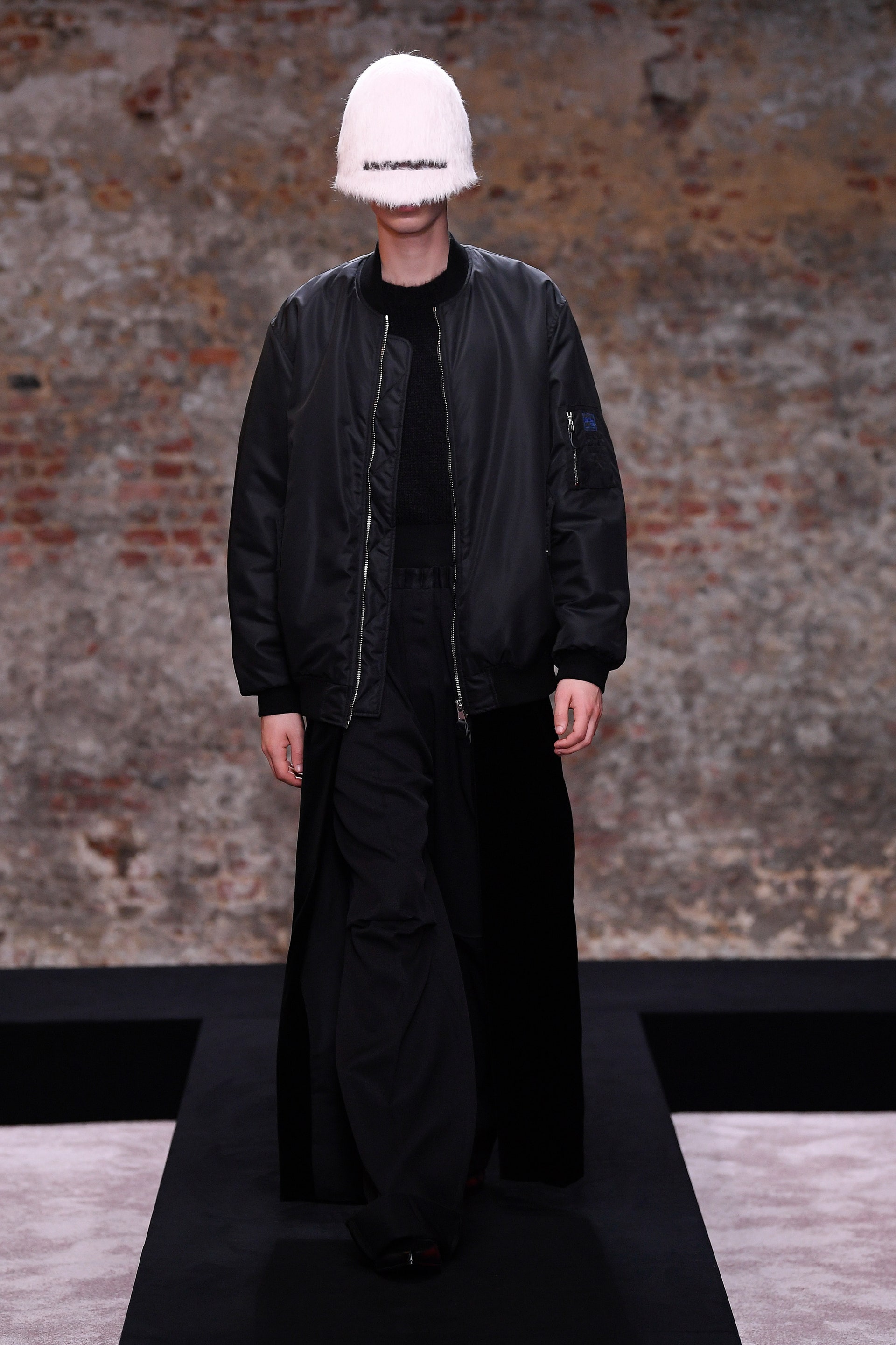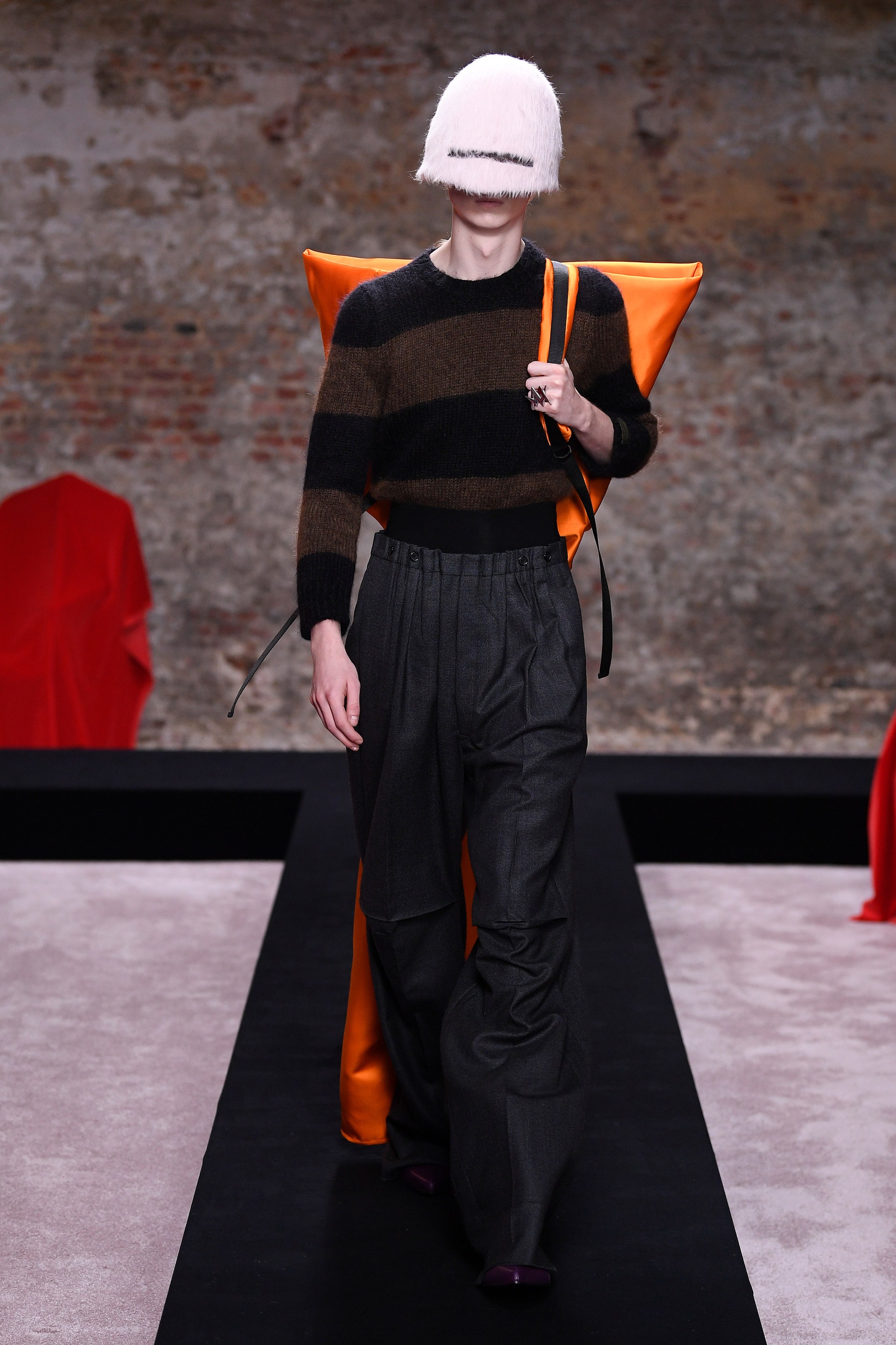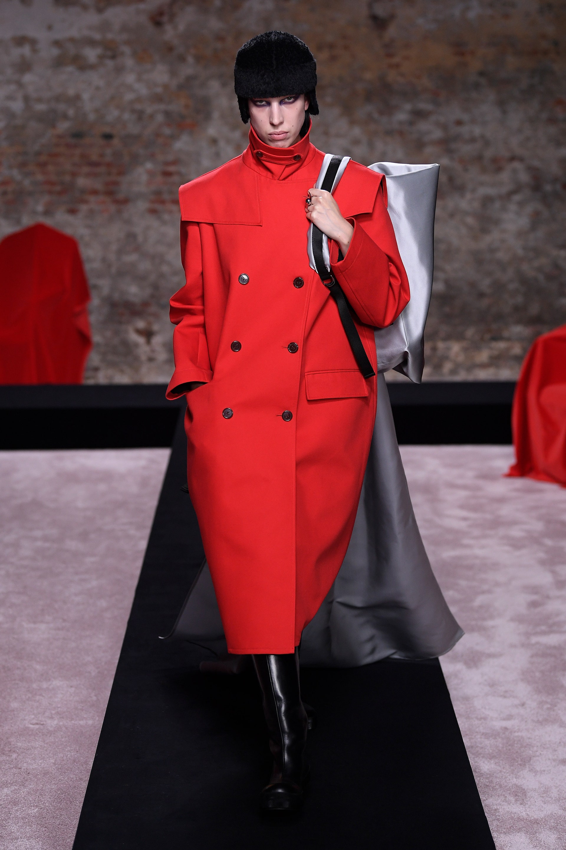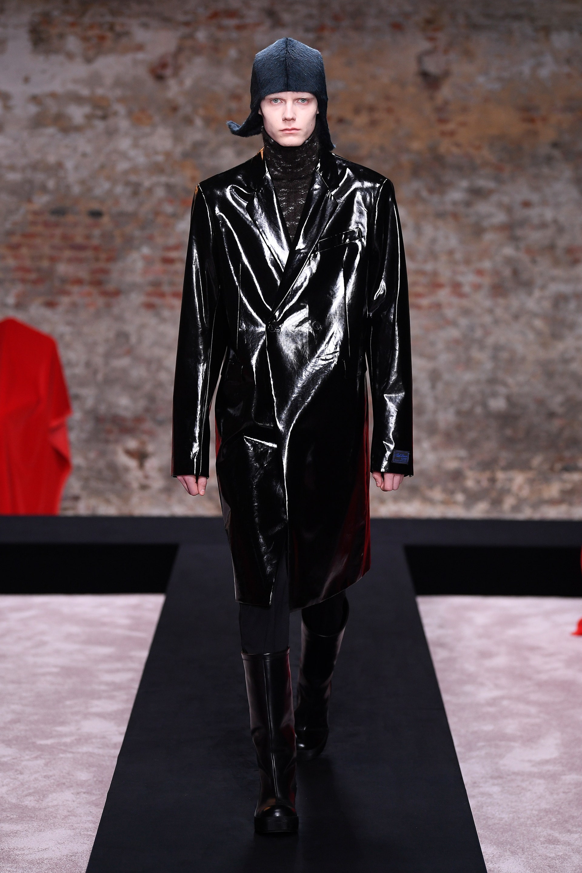 Вдохновением для Симонса послужила картина Питера Брейгеля Старшего "Нидерландские пословицы" (или "Мир вверх тормашками"). Как в самой коллекции, так и в сет-дизайне выставочного пространства с подиумом превалировали оттенки красного, синего, яркого зеленого и фиолетового, а также глиняного и землисто-черного. Как и в весенней коллекции, дизайнер предложил носить куртки и рубашки с названиями и лайнами выдуманных гранж- и рок-групп и цветные панамы, к которым добавил мохеровые головные уборы с прорезями для глаз. Главным образом оммаж Брейгелю Старшему был выражен в синем плаще с цельнокроеным капюшоном-шляпой, повторяющем облачение центральной фигуры "Нидерландских пословиц". Также отпечатки мифопоэтического Средневековья можно было заметить в "худощавом" красном кейпе с нарисованными руками, держащими букет, длинных платьях-сорочках и головных уборах, прикрывающих уши. Одним из главных материалов Раф Симонс выбрал винил, чем усилил нарратив запретности и готической таинственности своего повествования.
