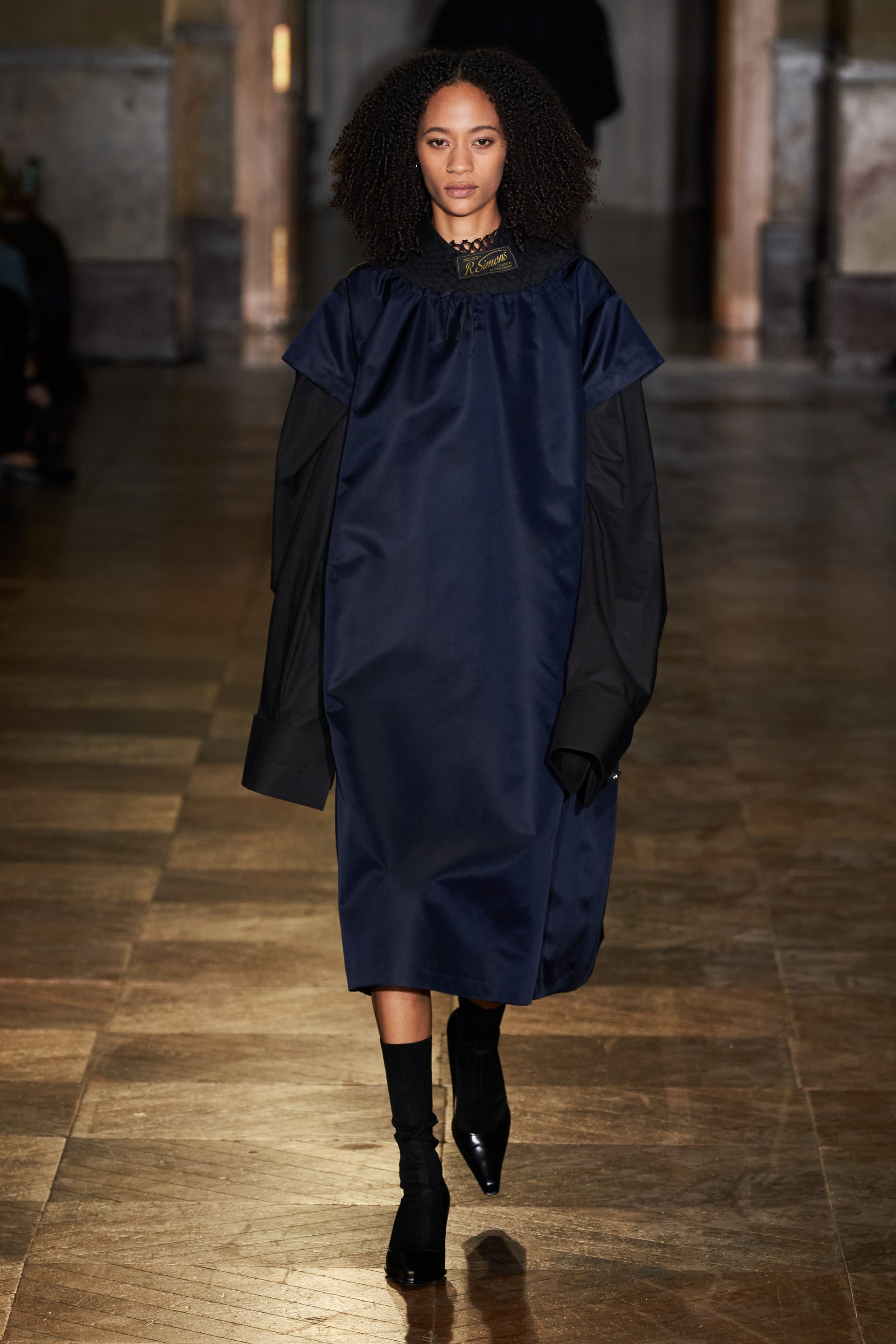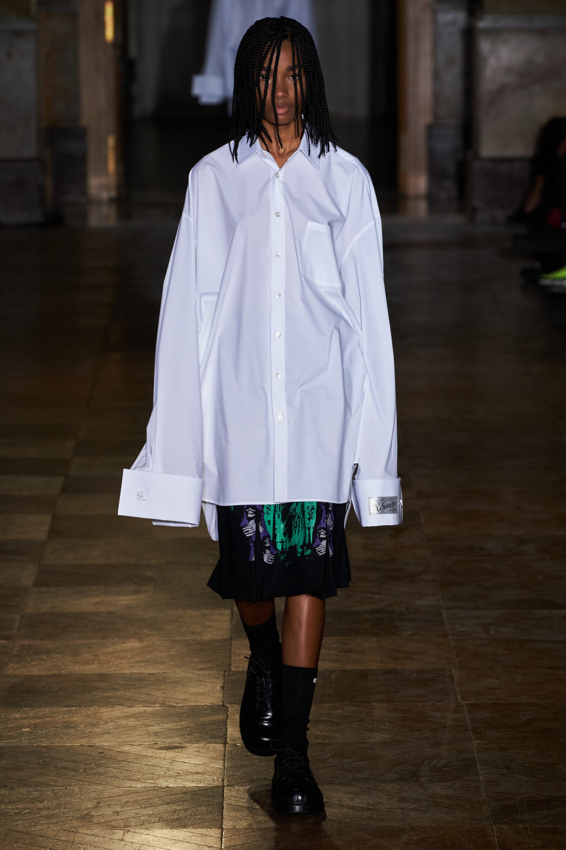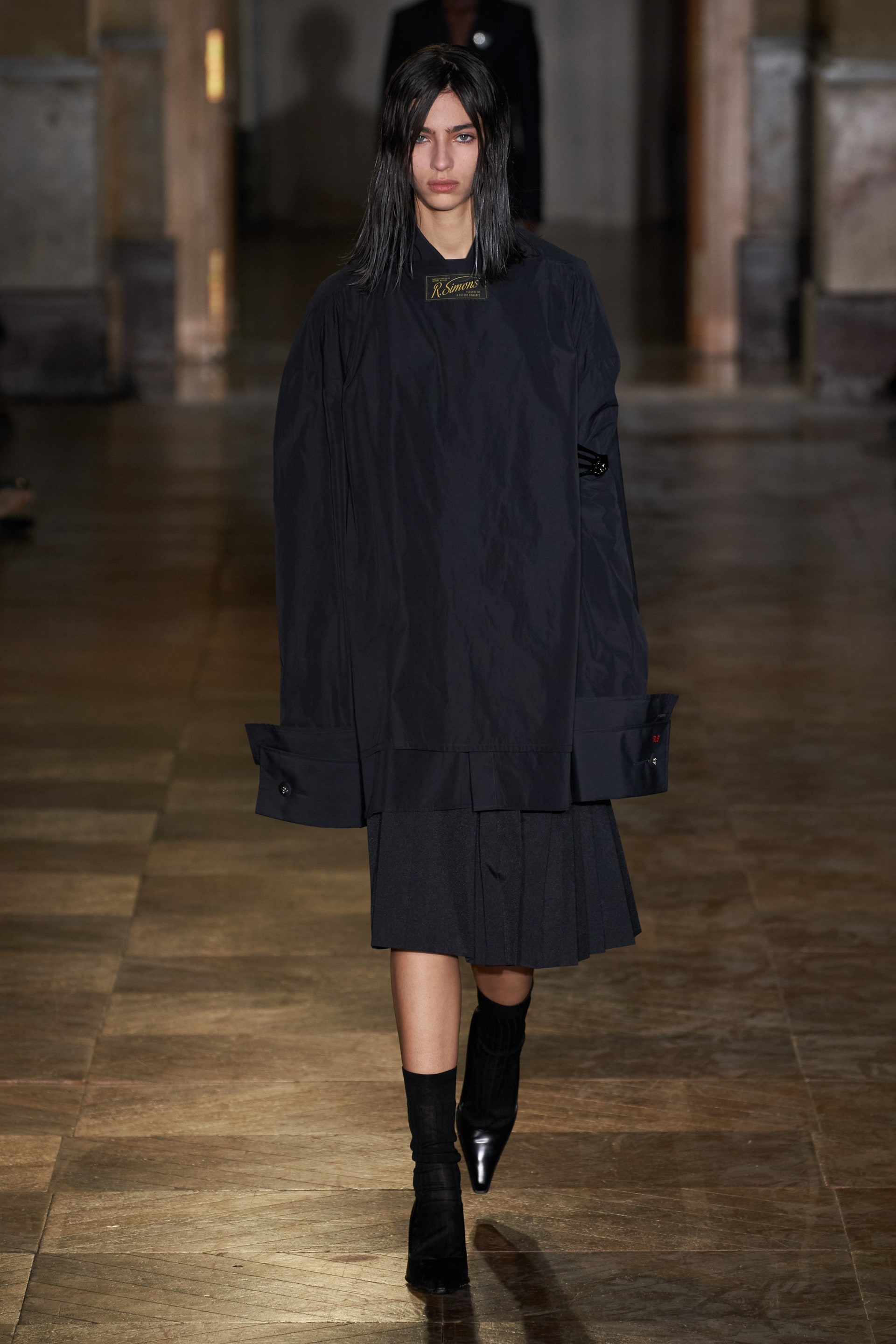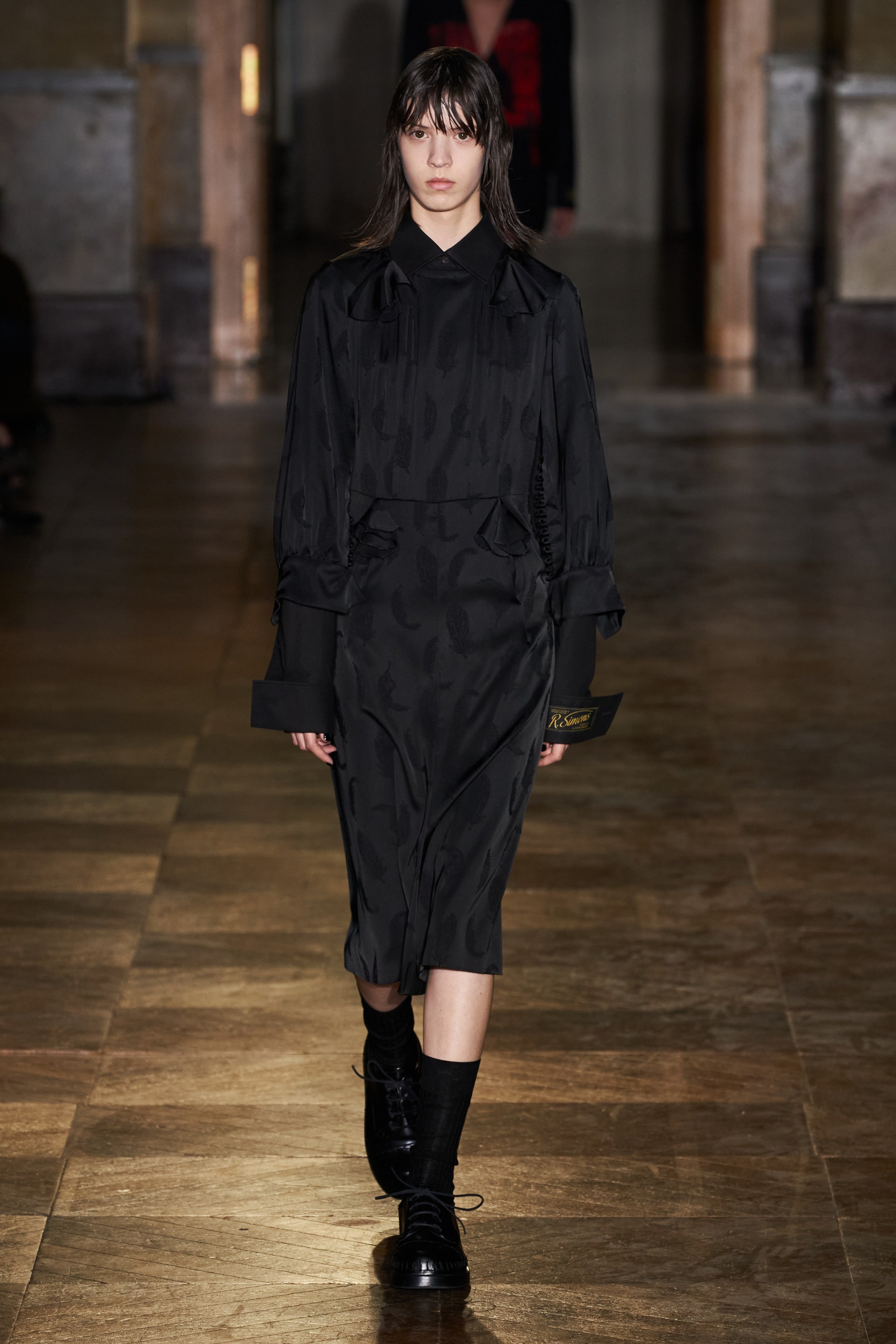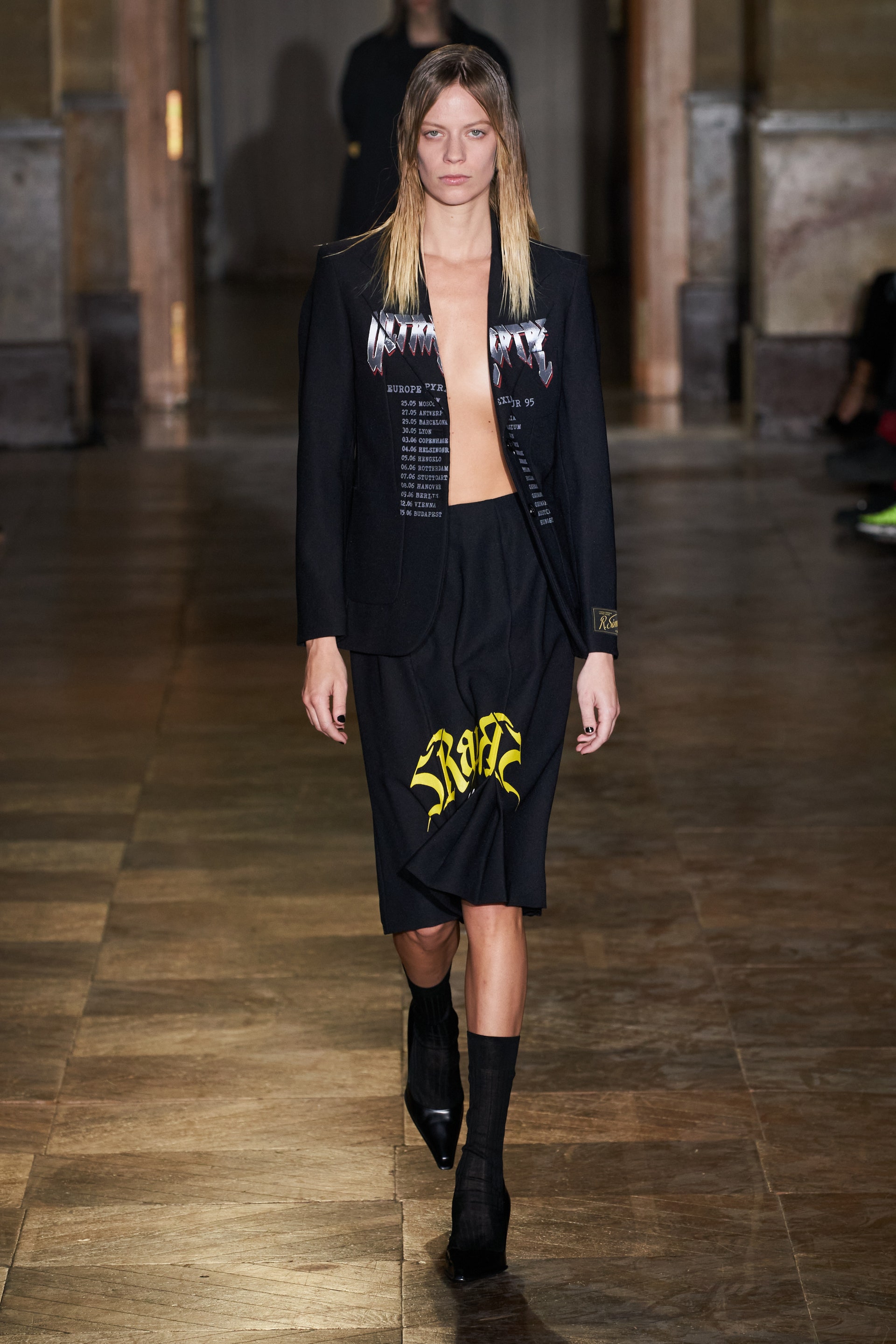 После своего яркого осенне-зимнего шоу, ставшего настоящим торжеством цвета, Раф Симонс представил весеннюю коллекцию, которая почти полностью состоит из черных вещей. Дизайнер уже не первый сезон озадачен целью работать с гардеробом, в одинаковой степени подходящим для мужчин и женщин. Бросить вызов привычному дресс-коду Раф решил с помощью удлиненных пиджаков и прямых юбок, платьев-рубашек и нарочито "мужских" лыжных свитеров. Предплечья моделей, как и на предыдущем показе, обнимали браслеты в виде рук скелетов — своеобразный символ бренда. В качестве принта на вещах расположились стилизованные лайнапы рок-фестивалей и названия условных doom- и metal-групп (фестивальная стилистика набирает обороты с каждой следующей коллекцией весеннего сезона).