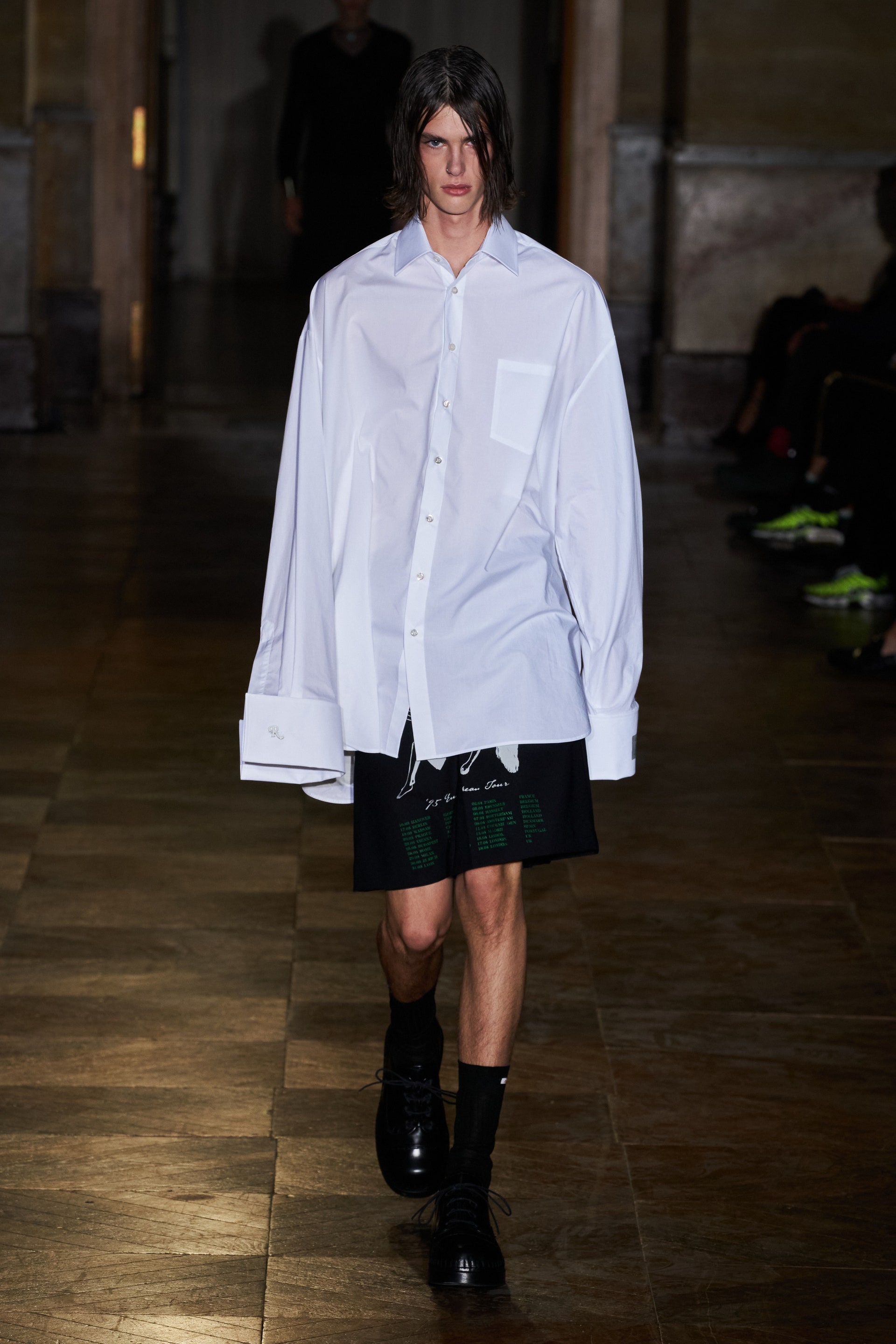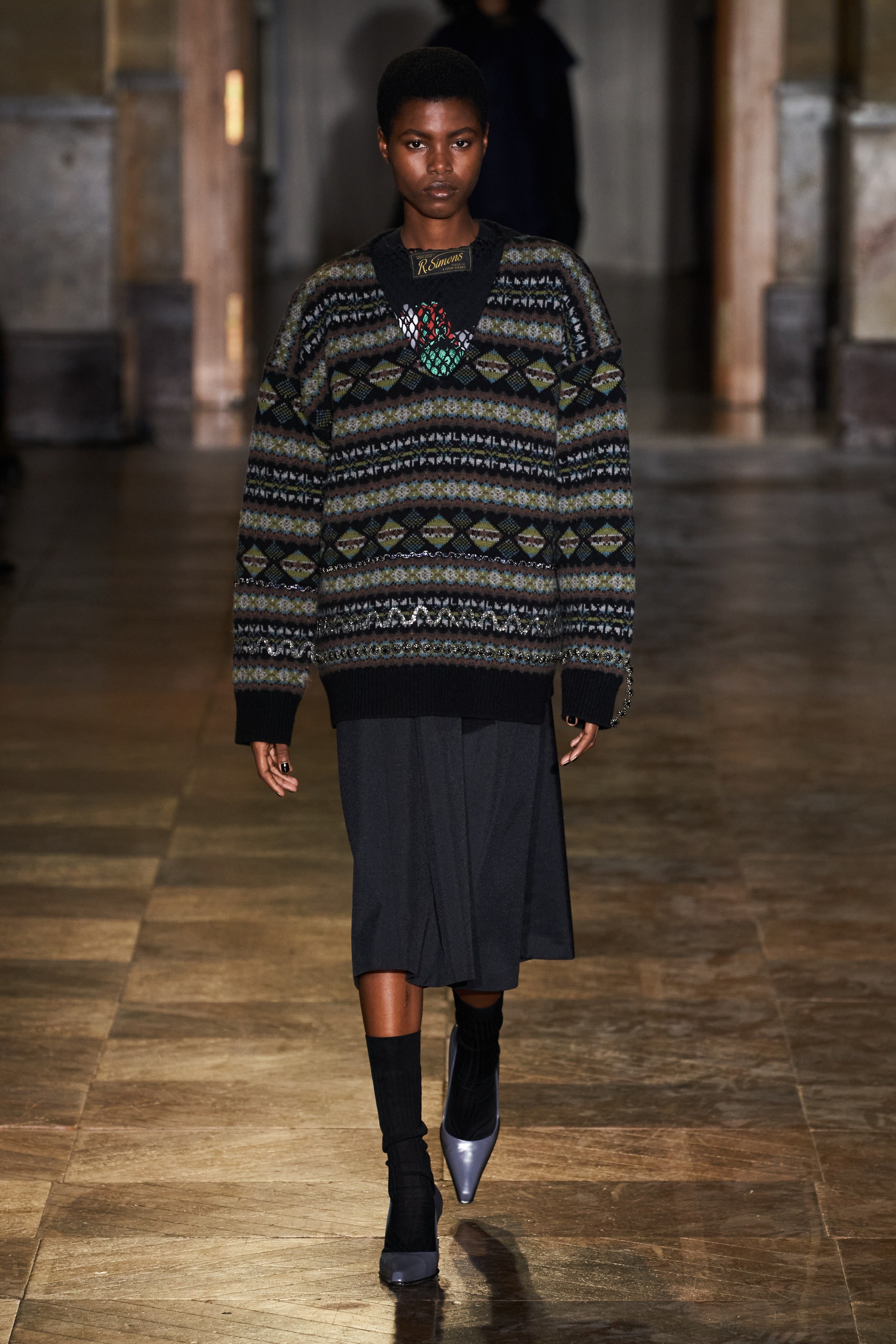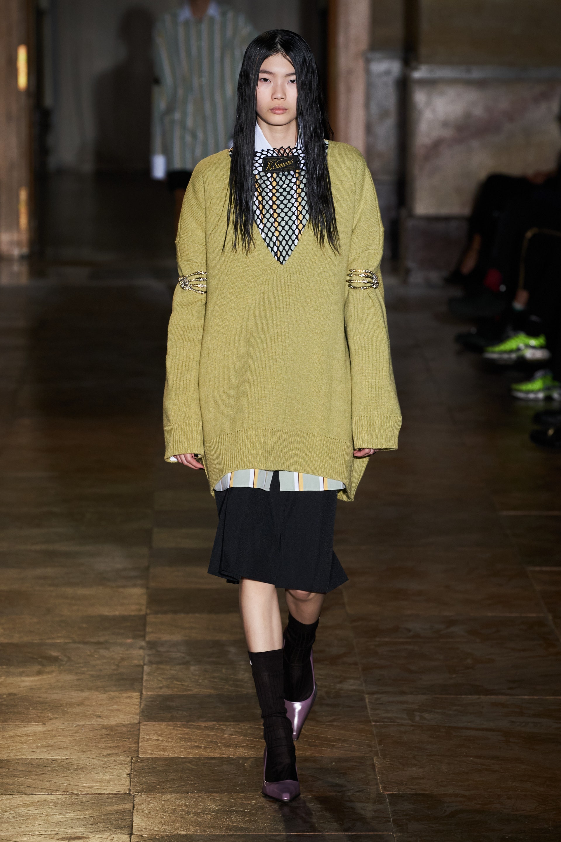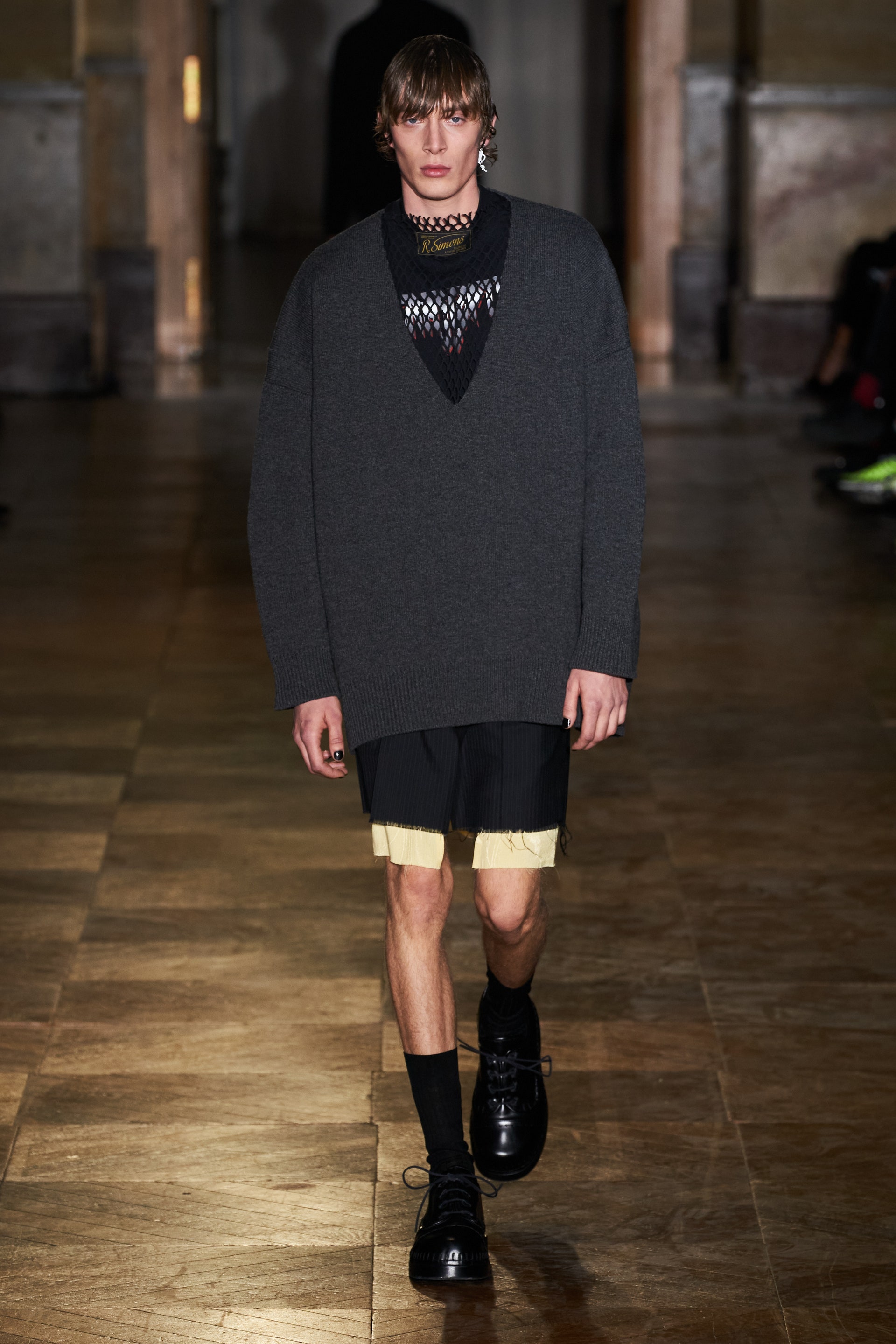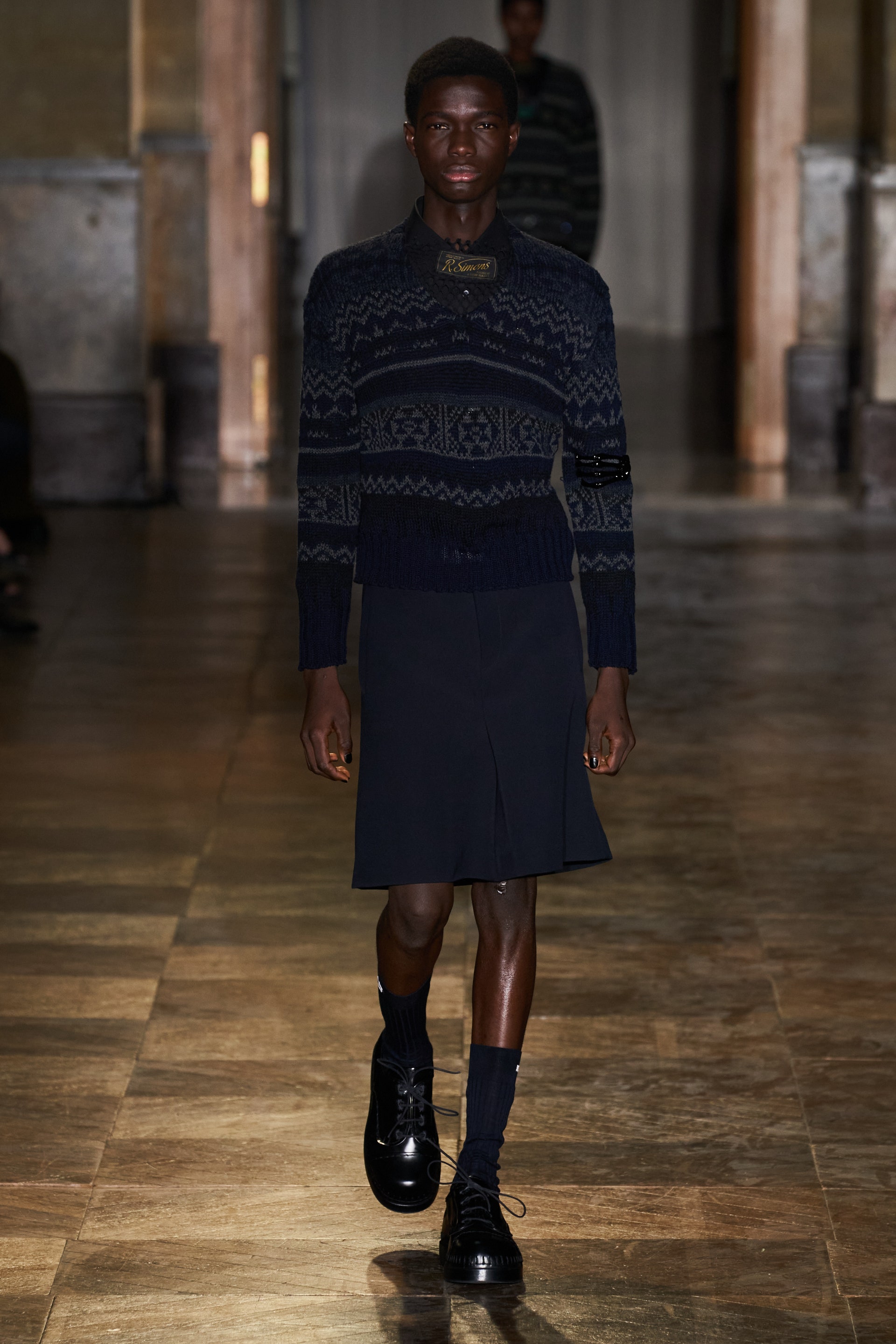 После своего яркого осенне-зимнего шоу, ставшего настоящим торжеством цвета, Раф Симонс представил весеннюю коллекцию, которая почти полностью состоит из черных вещей. Дизайнер уже не первый сезон озадачен целью работать с гардеробом, в одинаковой степени подходящим для мужчин и женщин. Бросить вызов привычному дресс-коду Раф решил с помощью удлиненных пиджаков и прямых юбок, платьев-рубашек и нарочито "мужских" лыжных свитеров. Предплечья моделей, как и на предыдущем показе, обнимали браслеты в виде рук скелетов — своеобразный символ бренда. В качестве принта на вещах расположились стилизованные лайнапы рок-фестивалей и названия условных doom- и metal-групп (фестивальная стилистика набирает обороты с каждой следующей коллекцией весеннего сезона).