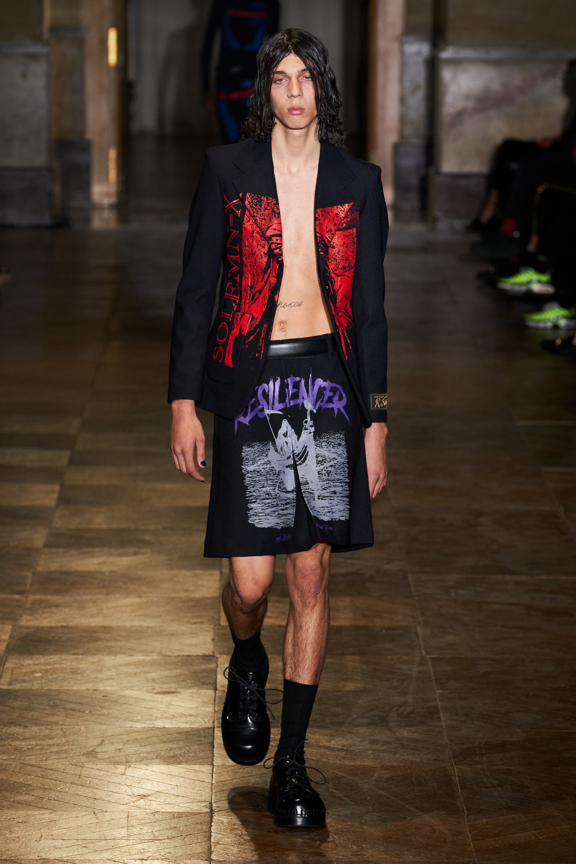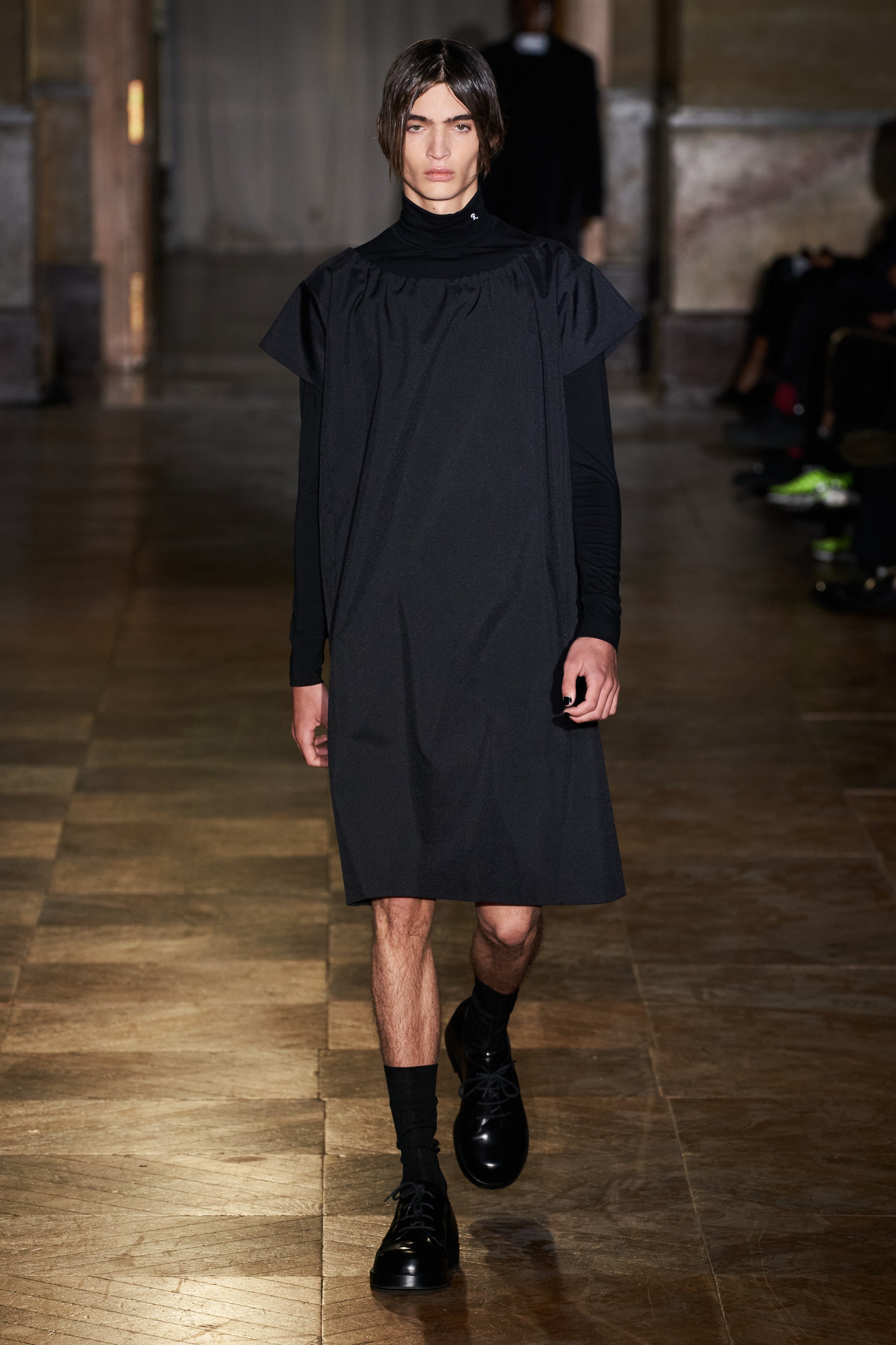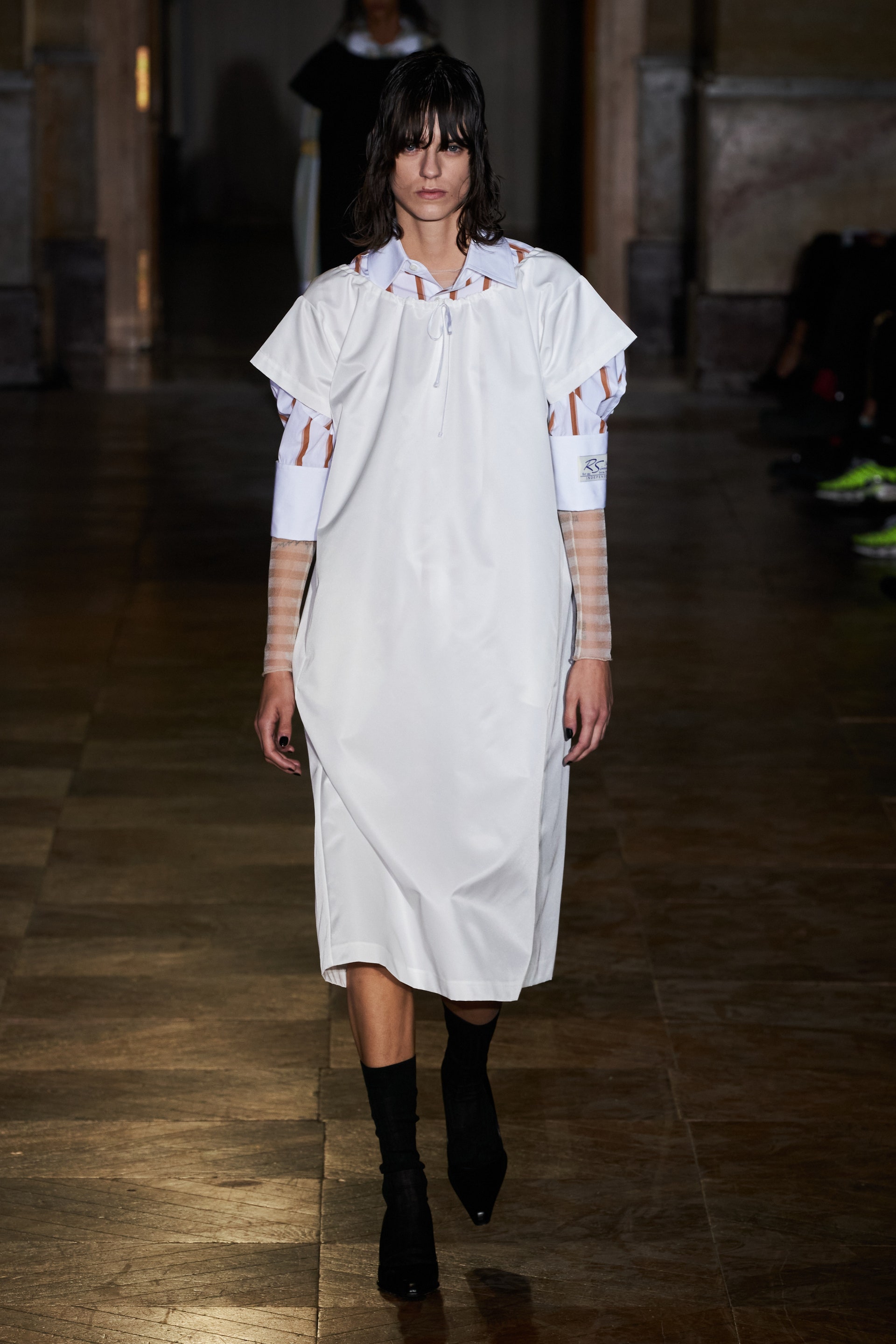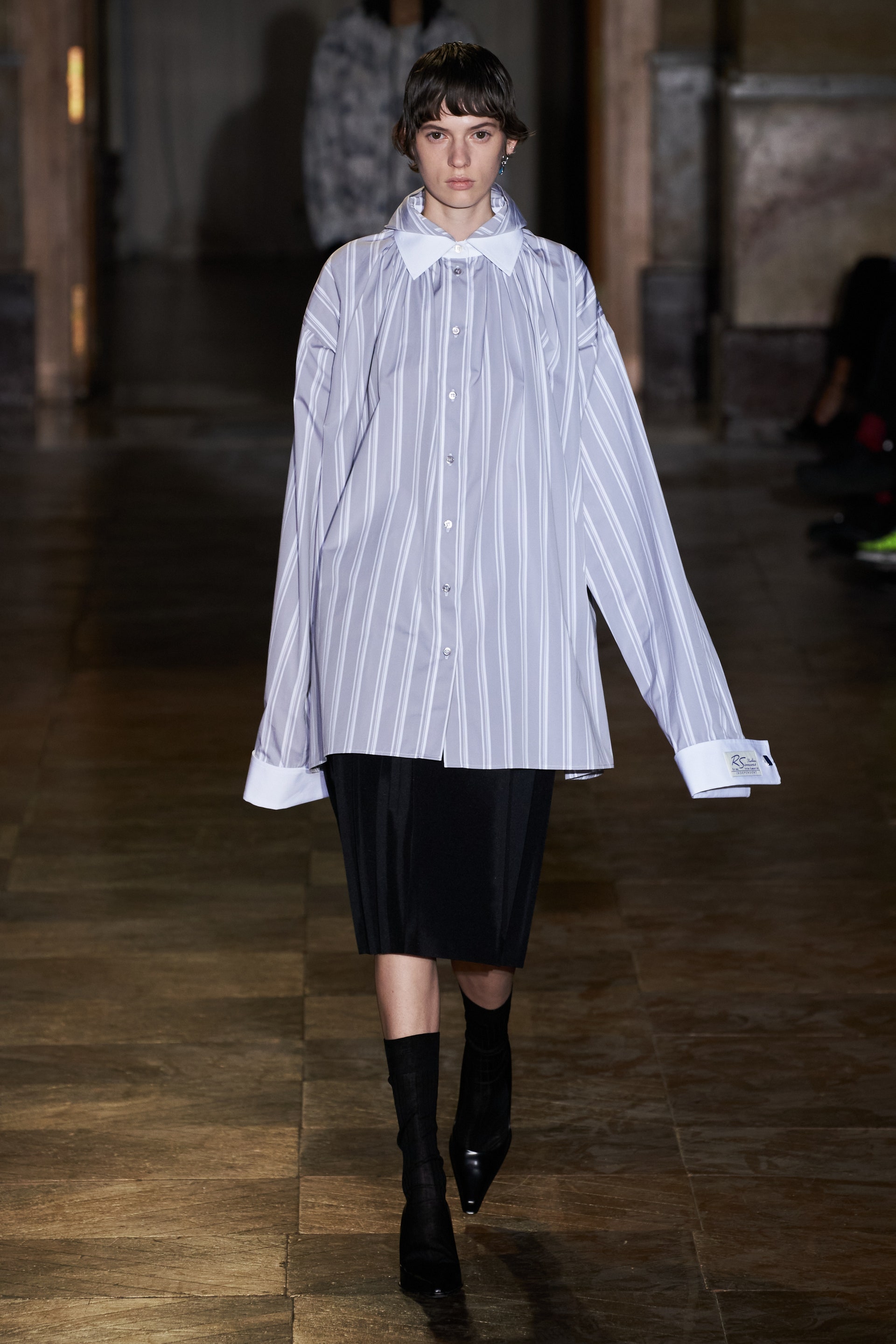 После своего яркого осенне-зимнего шоу, ставшего настоящим торжеством цвета, Раф Симонс представил весеннюю коллекцию, которая почти полностью состоит из черных вещей. Дизайнер уже не первый сезон озадачен целью работать с гардеробом, в одинаковой степени подходящим для мужчин и женщин. Бросить вызов привычному дресс-коду Раф решил с помощью удлиненных пиджаков и прямых юбок, платьев-рубашек и нарочито "мужских" лыжных свитеров. Предплечья моделей, как и на предыдущем показе, обнимали браслеты в виде рук скелетов — своеобразный символ бренда. В качестве принта на вещах расположились стилизованные лайнапы рок-фестивалей и названия условных doom- и metal-групп (фестивальная стилистика набирает обороты с каждой следующей коллекцией весеннего сезона).