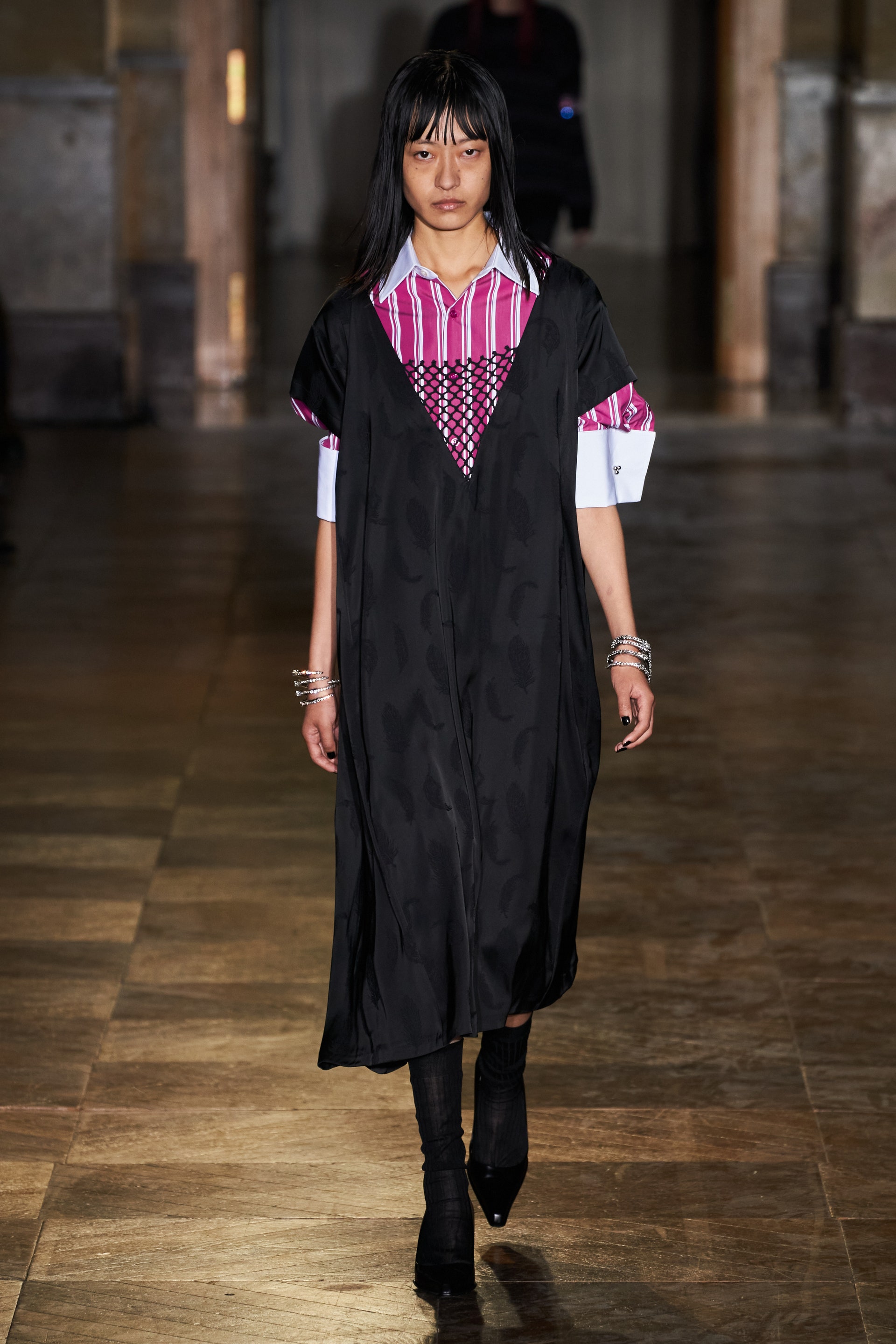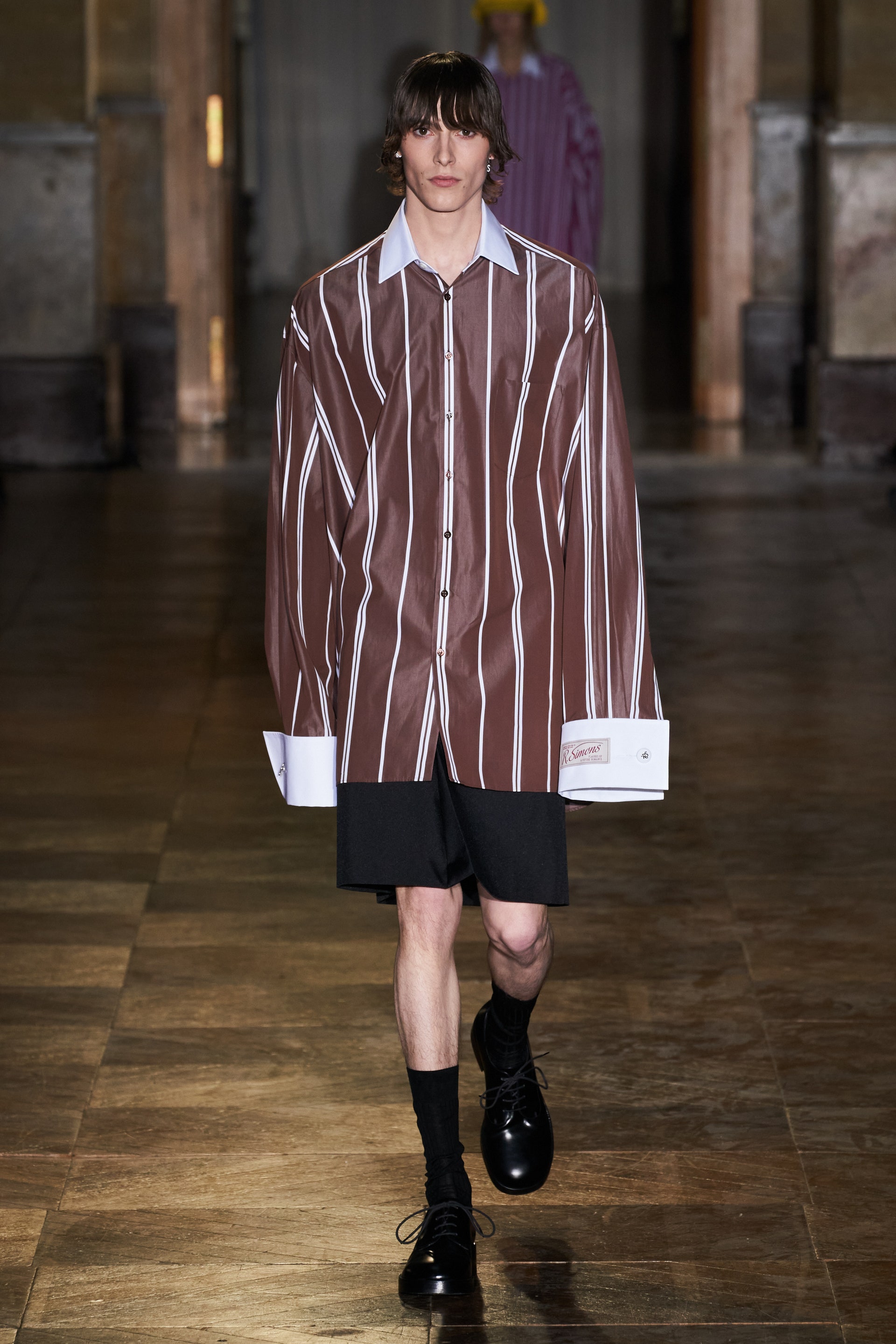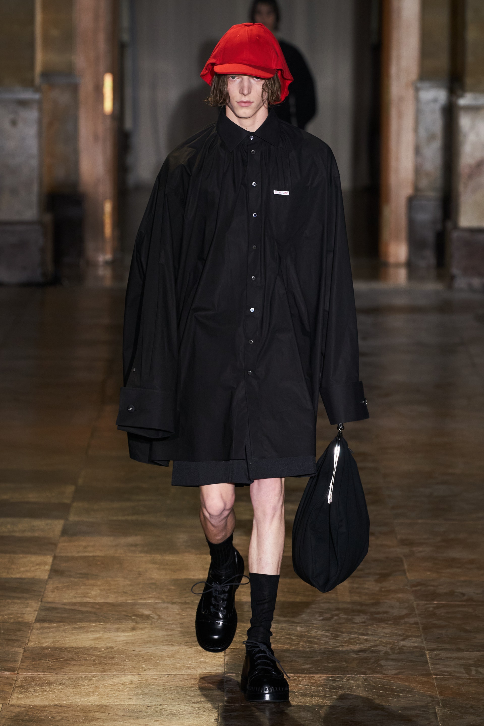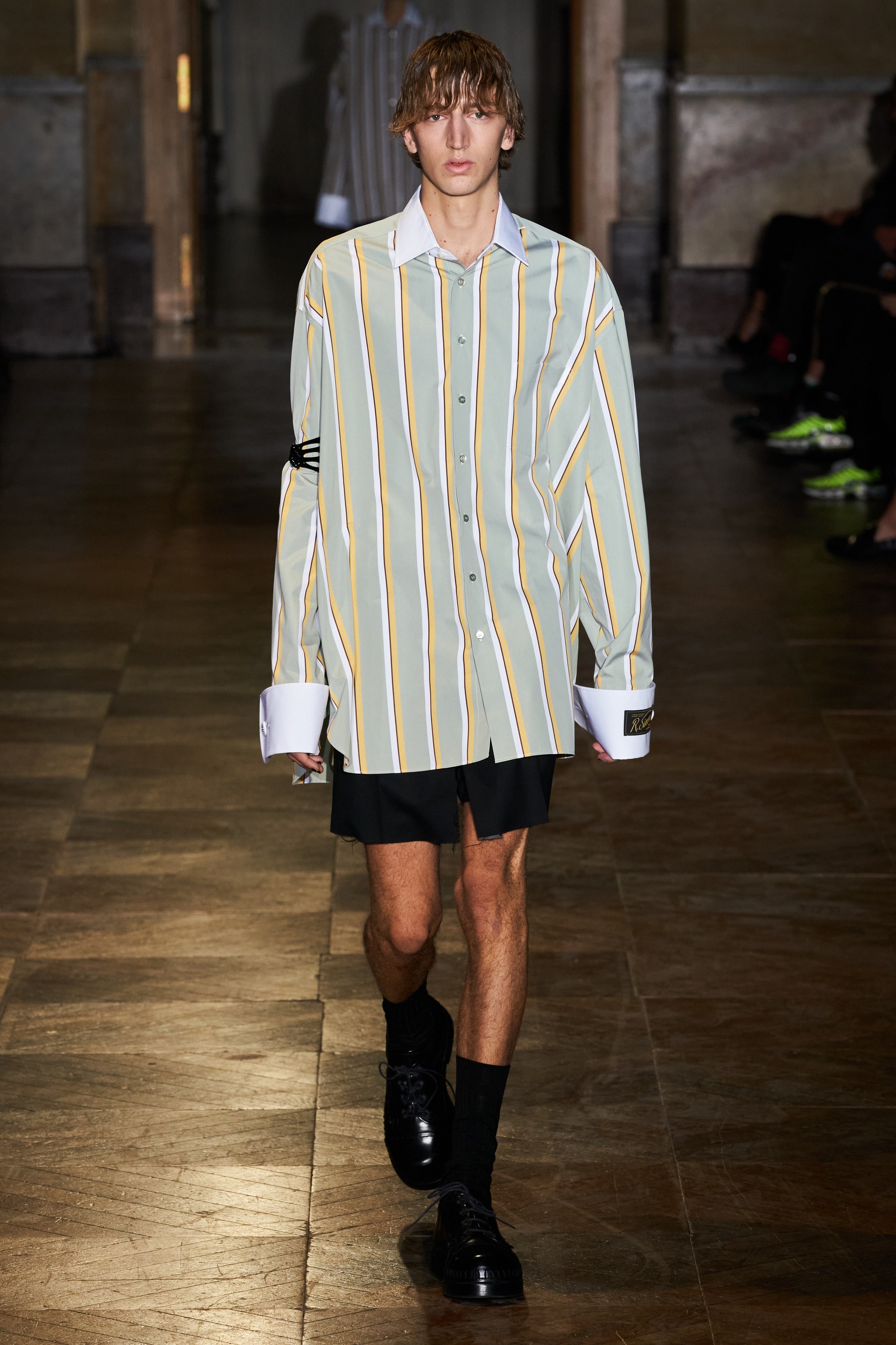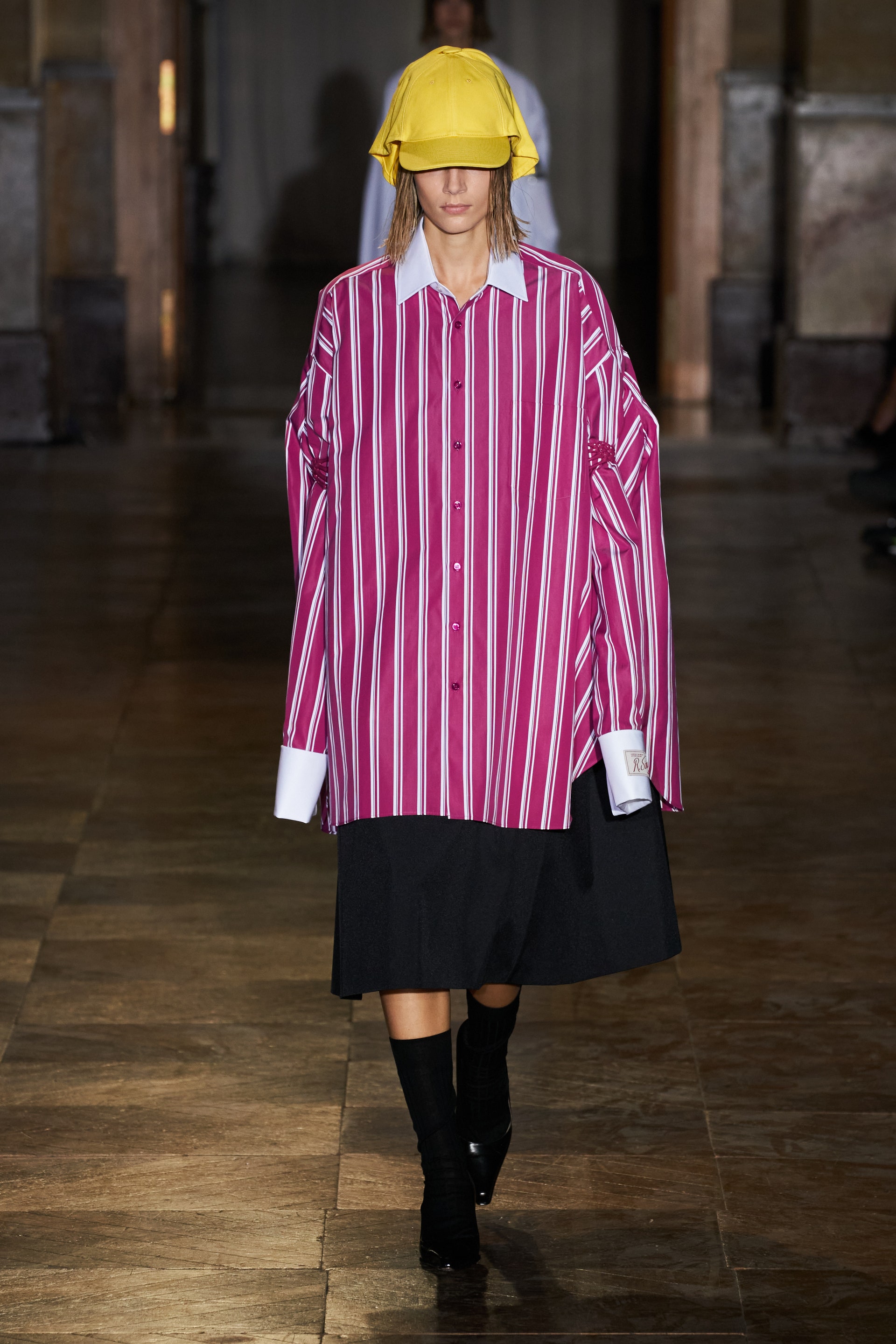 После своего яркого осенне-зимнего шоу, ставшего настоящим торжеством цвета, Раф Симонс представил весеннюю коллекцию, которая почти полностью состоит из черных вещей. Дизайнер уже не первый сезон озадачен целью работать с гардеробом, в одинаковой степени подходящим для мужчин и женщин. Бросить вызов привычному дресс-коду Раф решил с помощью удлиненных пиджаков и прямых юбок, платьев-рубашек и нарочито "мужских" лыжных свитеров. Предплечья моделей, как и на предыдущем показе, обнимали браслеты в виде рук скелетов — своеобразный символ бренда. В качестве принта на вещах расположились стилизованные лайнапы рок-фестивалей и названия условных doom- и metal-групп (фестивальная стилистика набирает обороты с каждой следующей коллекцией весеннего сезона).