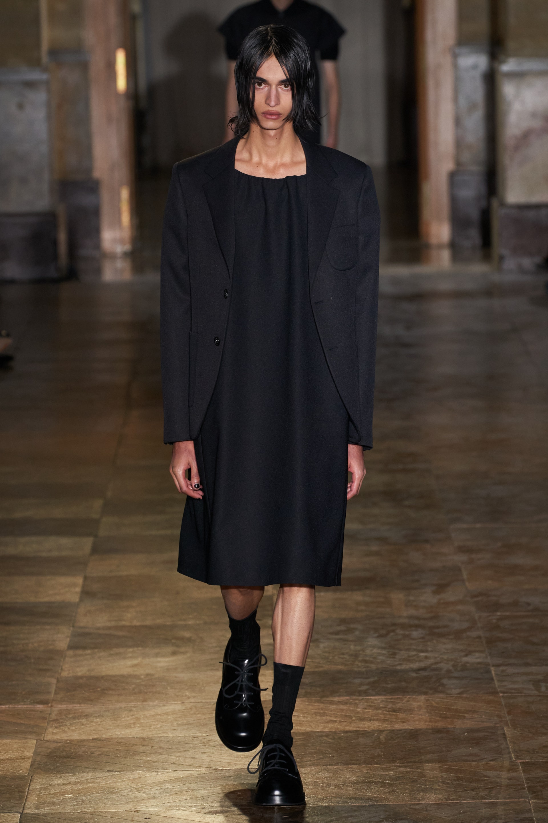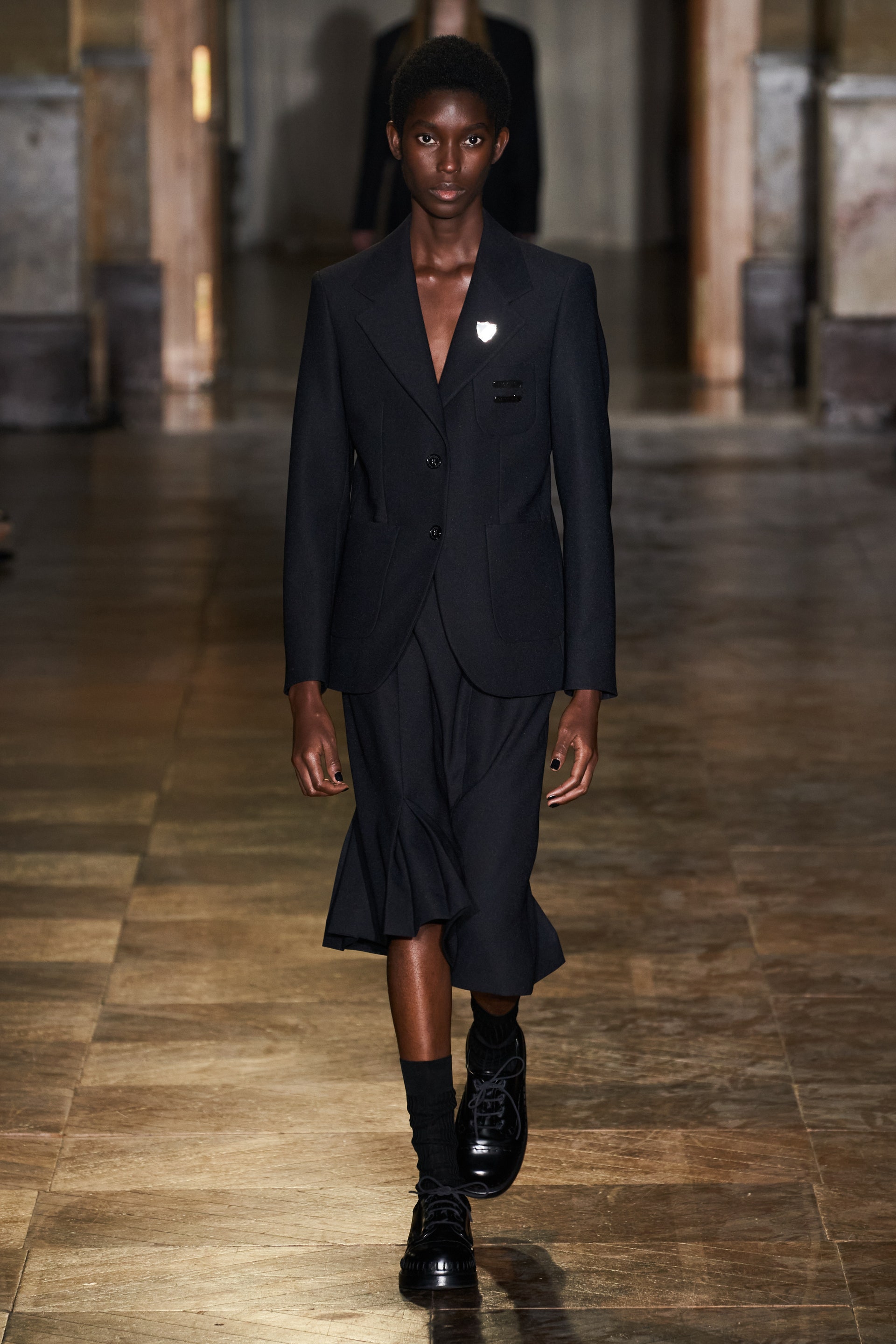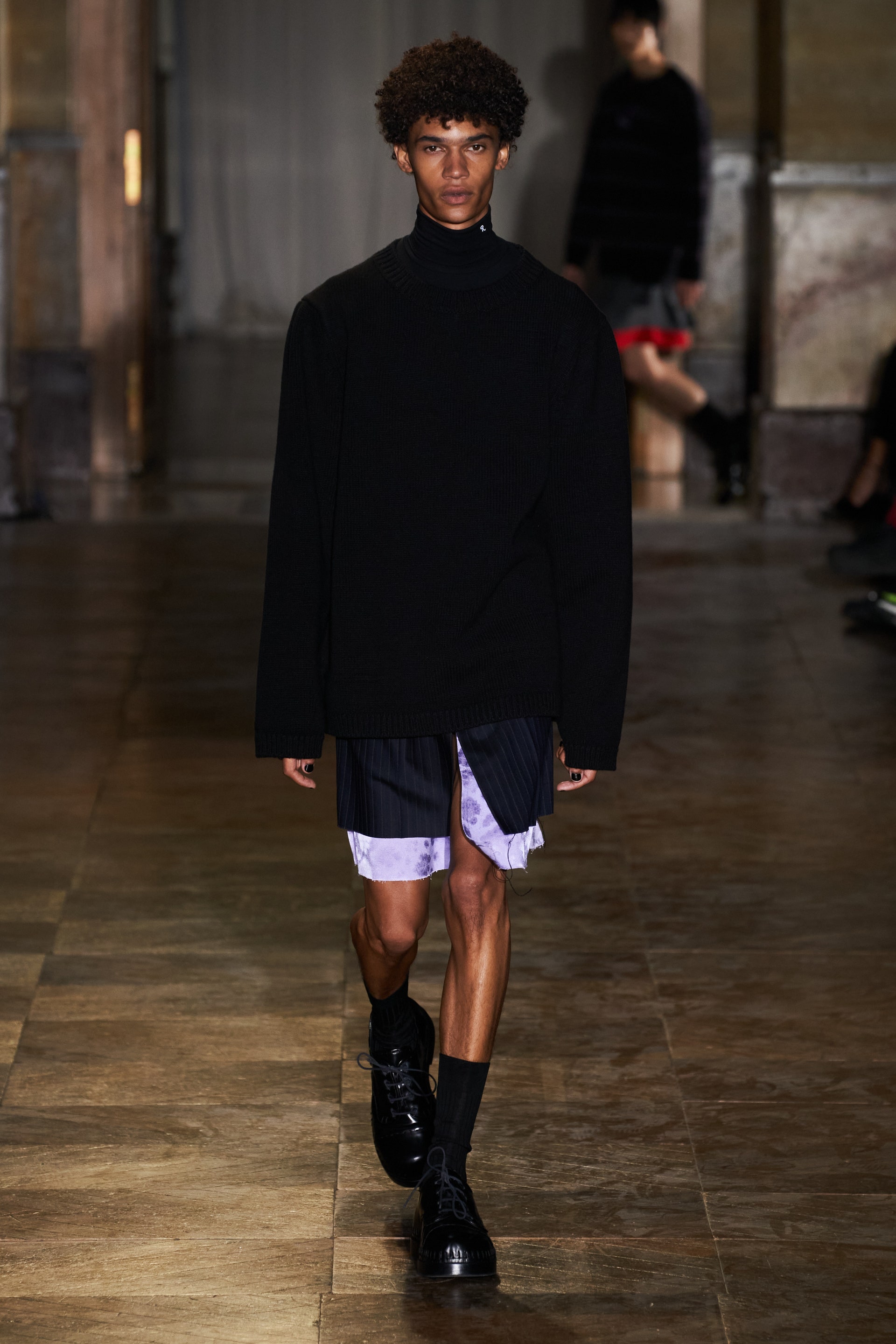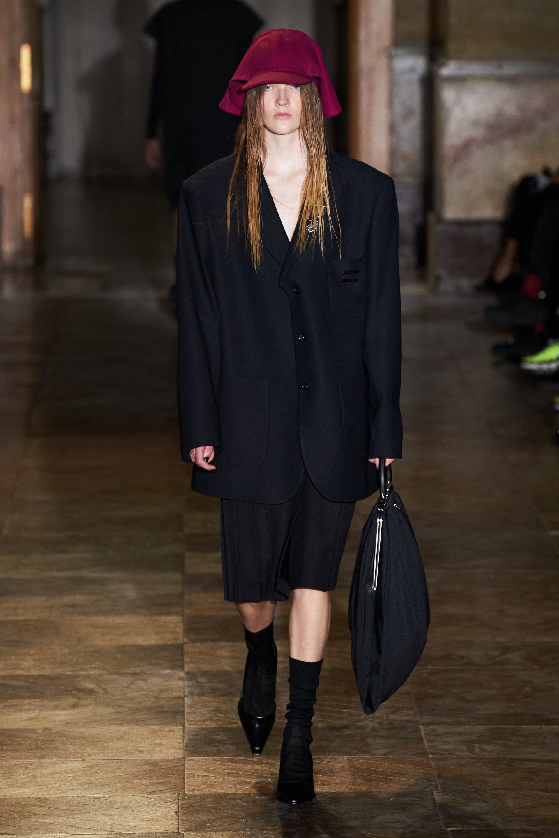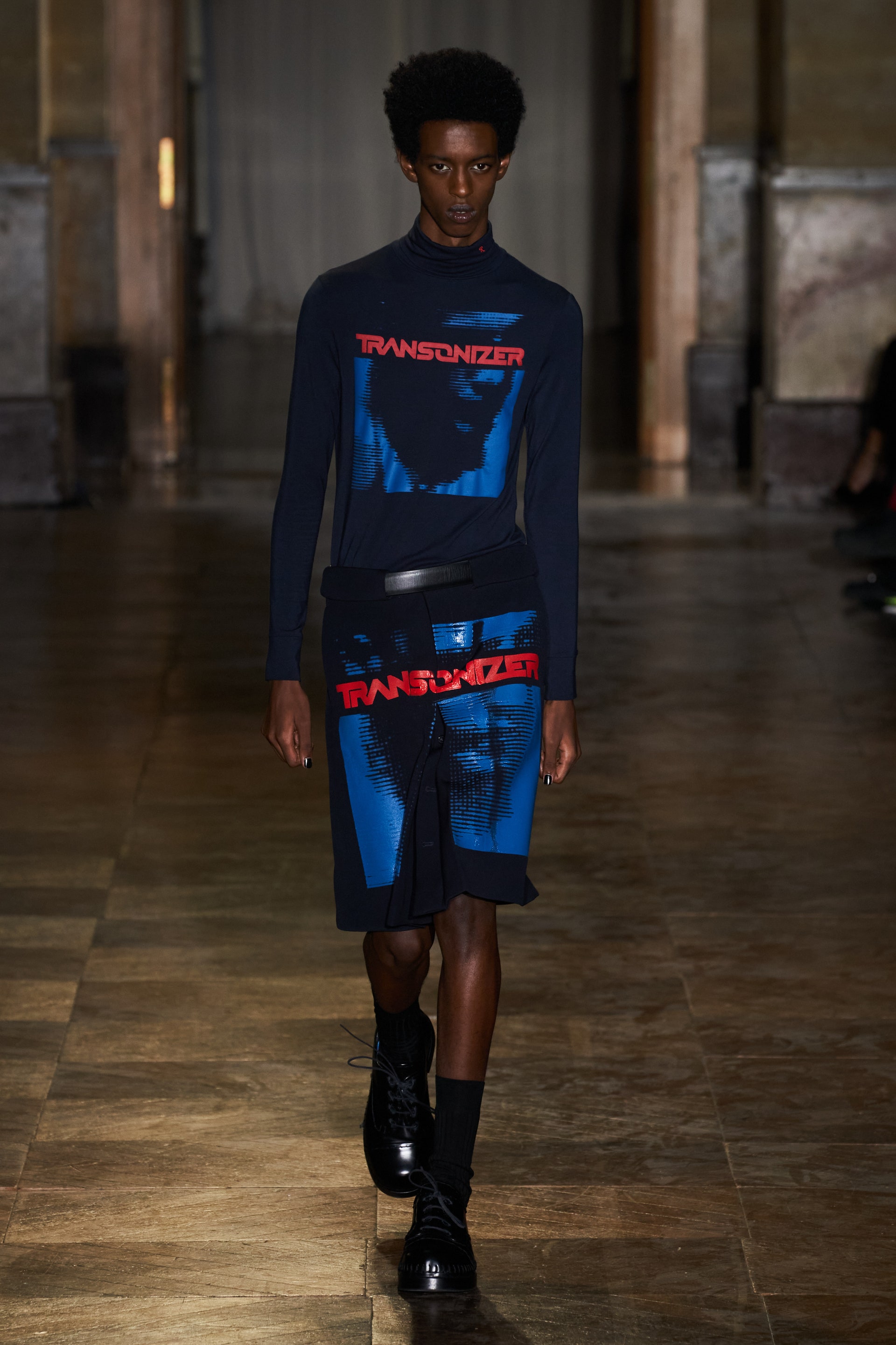 После своего яркого осенне-зимнего шоу, ставшего настоящим торжеством цвета, Раф Симонс представил весеннюю коллекцию, которая почти полностью состоит из черных вещей. Дизайнер уже не первый сезон озадачен целью работать с гардеробом, в одинаковой степени подходящим для мужчин и женщин. Бросить вызов привычному дресс-коду Раф решил с помощью удлиненных пиджаков и прямых юбок, платьев-рубашек и нарочито "мужских" лыжных свитеров. Предплечья моделей, как и на предыдущем показе, обнимали браслеты в виде рук скелетов — своеобразный символ бренда. В качестве принта на вещах расположились стилизованные лайнапы рок-фестивалей и названия условных doom- и metal-групп (фестивальная стилистика набирает обороты с каждой следующей коллекцией весеннего сезона).