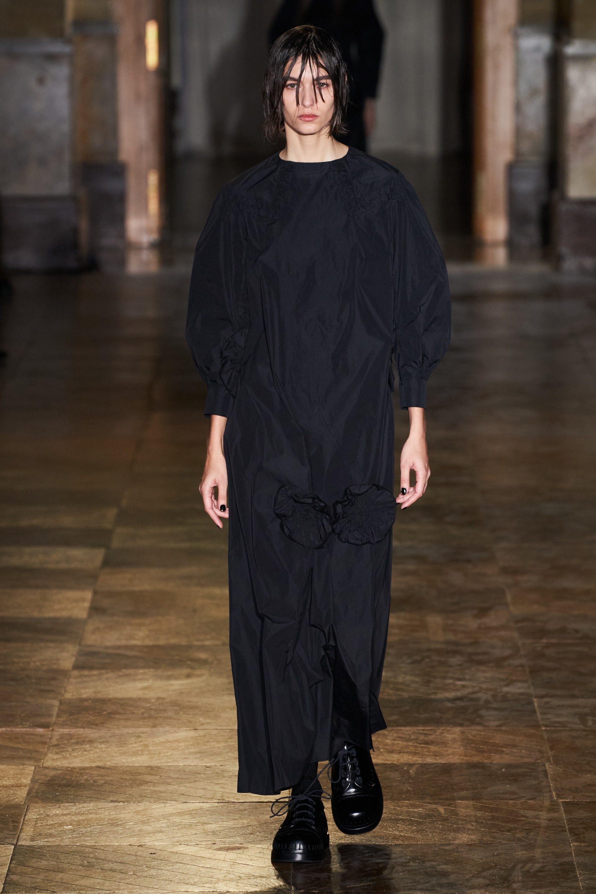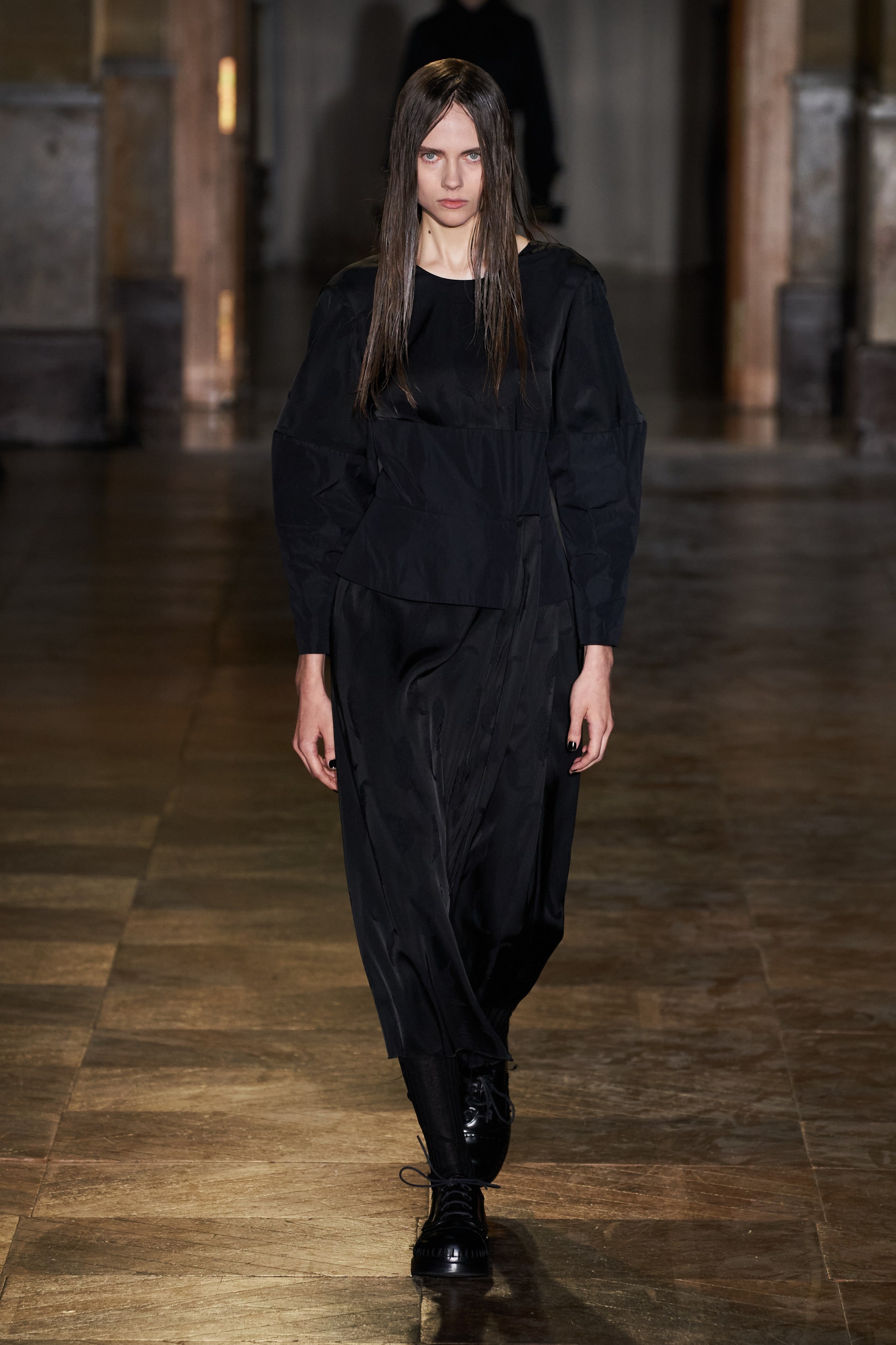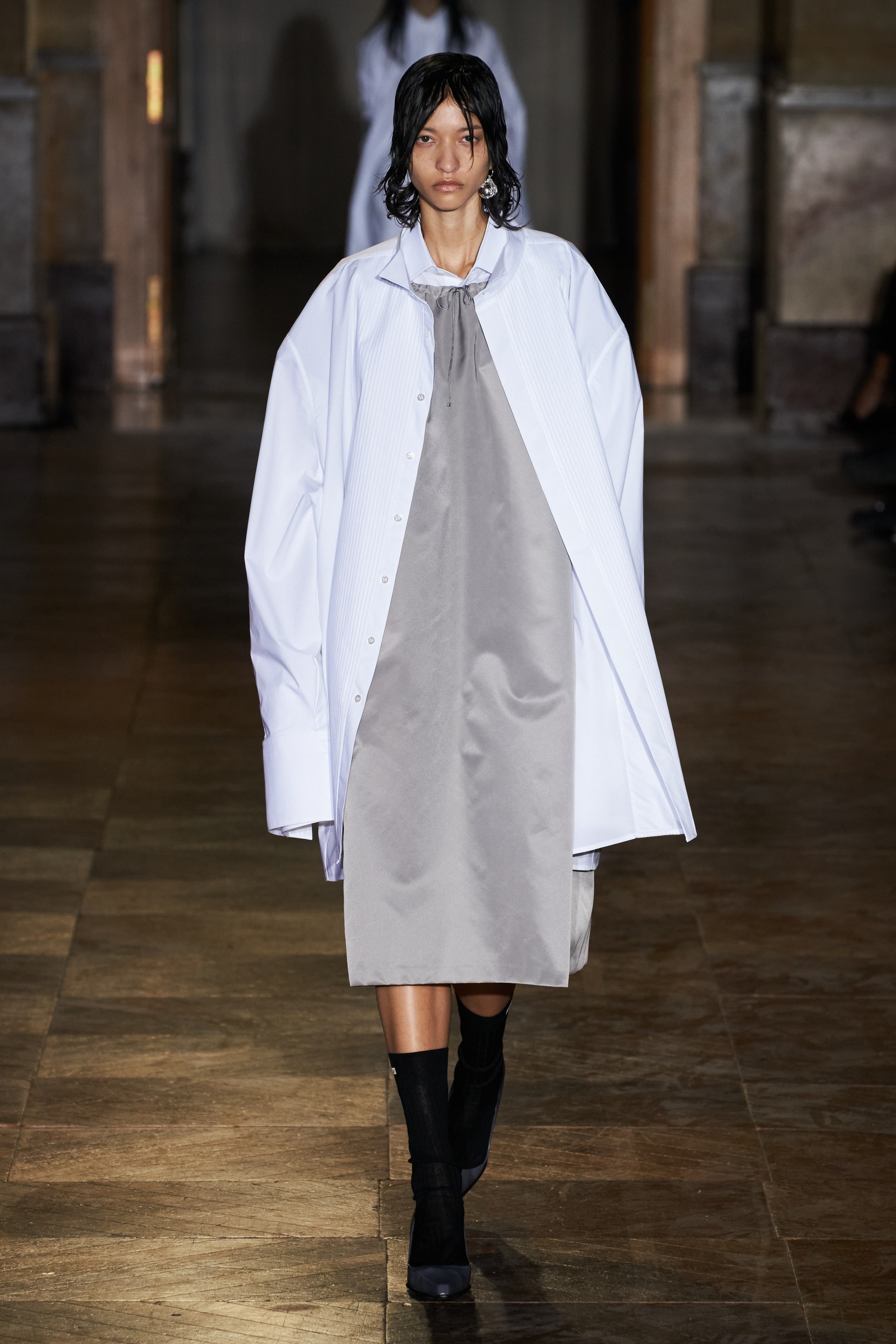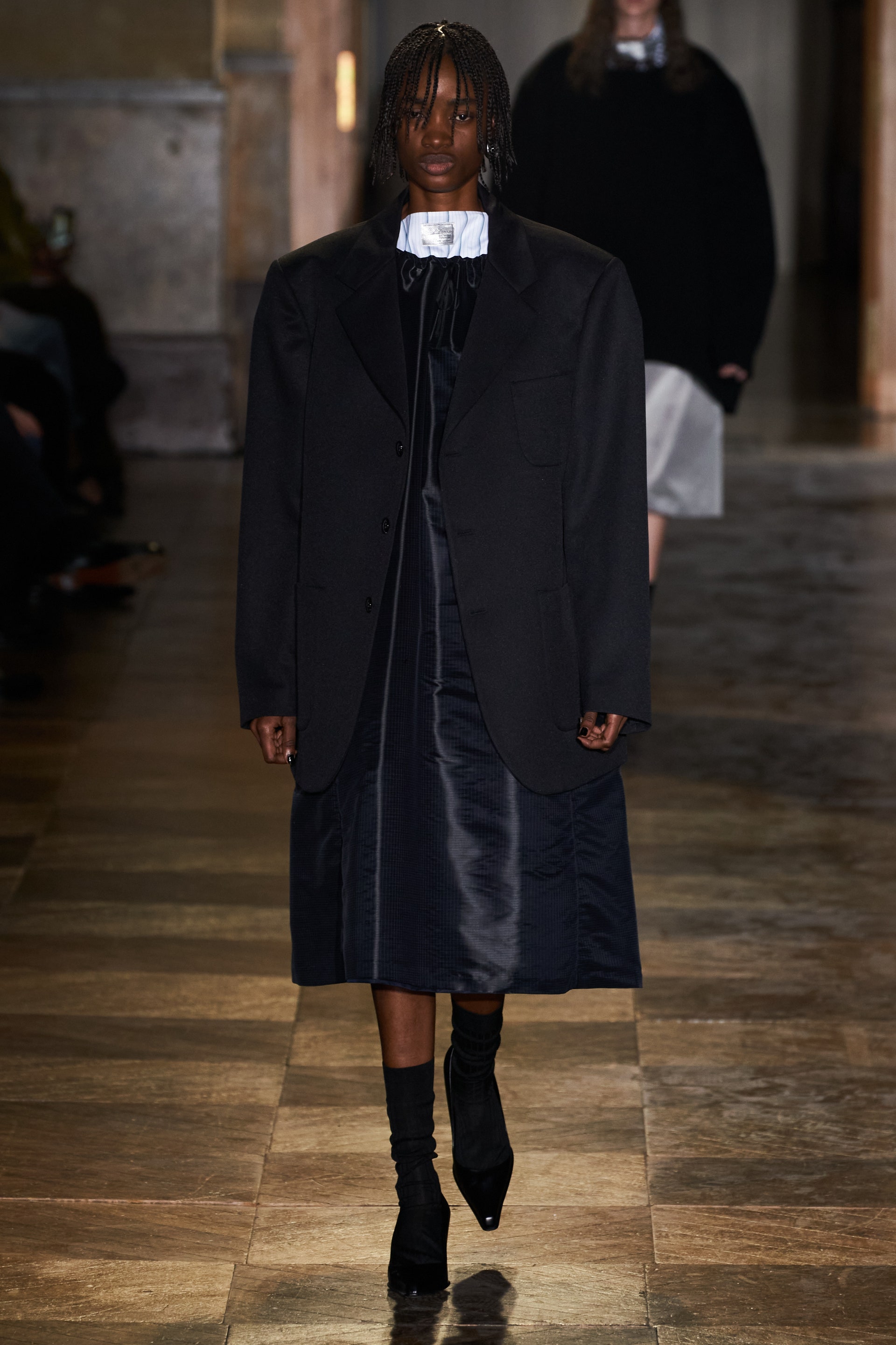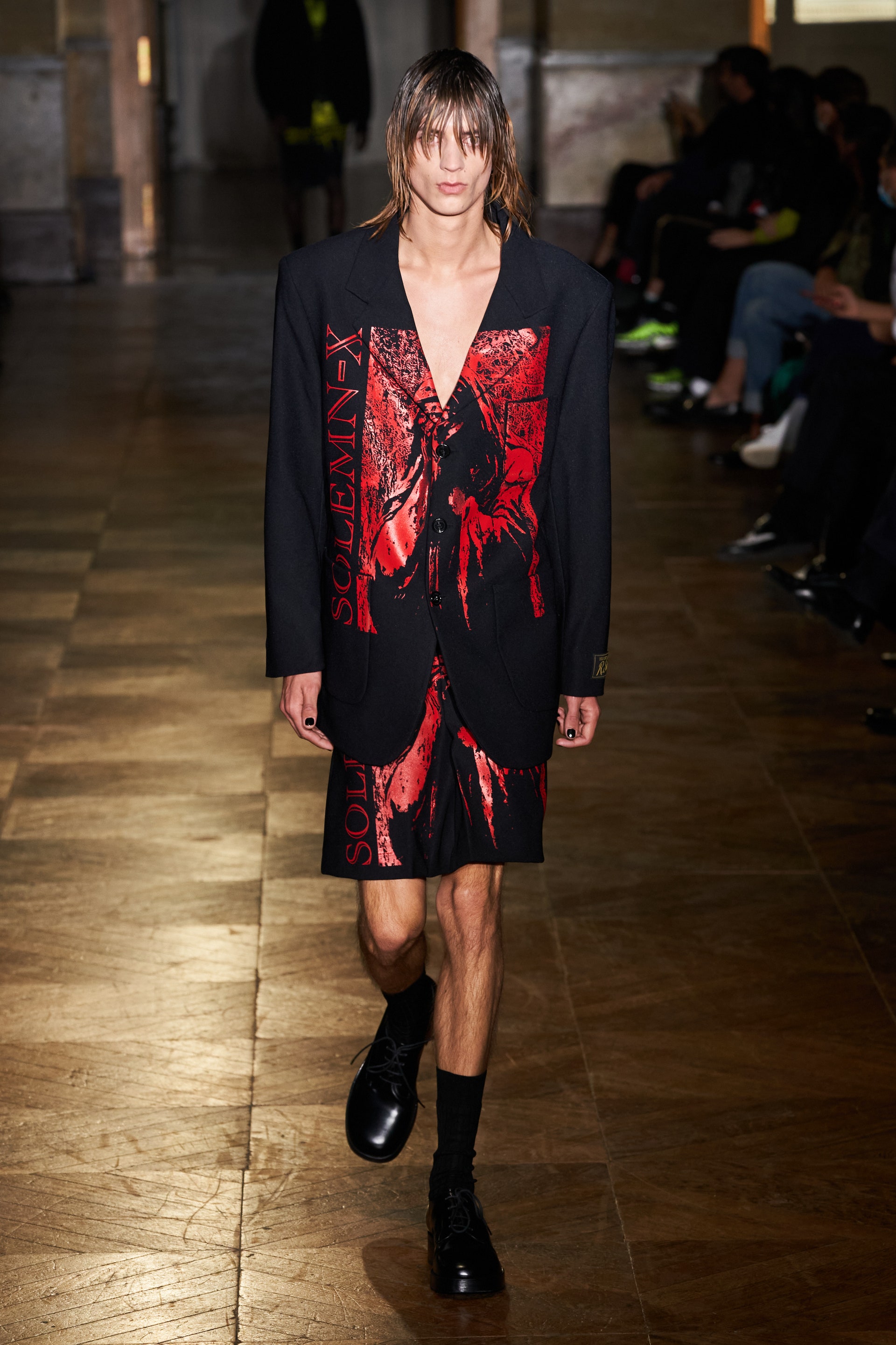 После своего яркого осенне-зимнего шоу, ставшего настоящим торжеством цвета, Раф Симонс представил весеннюю коллекцию, которая почти полностью состоит из черных вещей. Дизайнер уже не первый сезон озадачен целью работать с гардеробом, в одинаковой степени подходящим для мужчин и женщин. Бросить вызов привычному дресс-коду Раф решил с помощью удлиненных пиджаков и прямых юбок, платьев-рубашек и нарочито "мужских" лыжных свитеров. Предплечья моделей, как и на предыдущем показе, обнимали браслеты в виде рук скелетов — своеобразный символ бренда. В качестве принта на вещах расположились стилизованные лайнапы рок-фестивалей и названия условных doom- и metal-групп (фестивальная стилистика набирает обороты с каждой следующей коллекцией весеннего сезона).