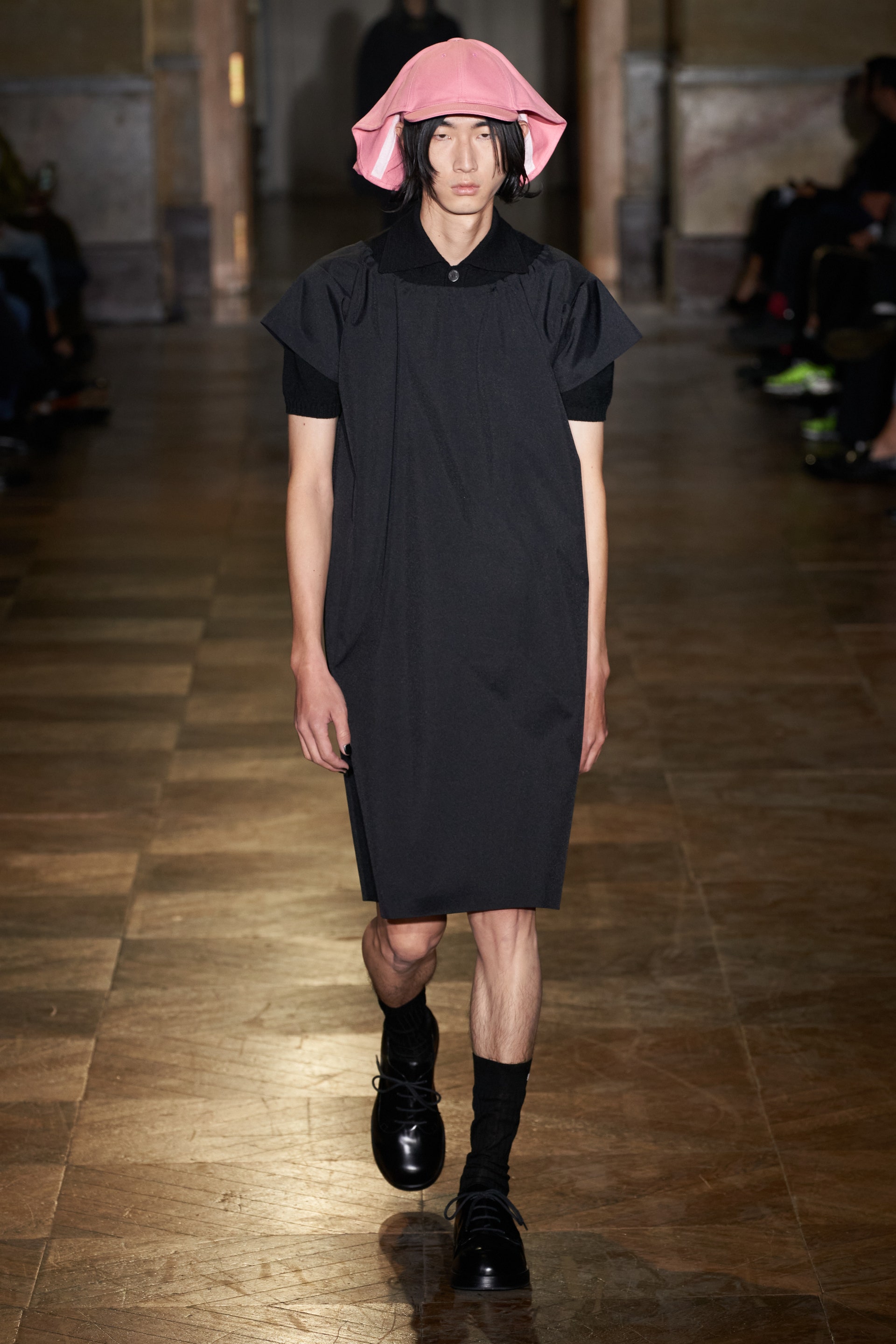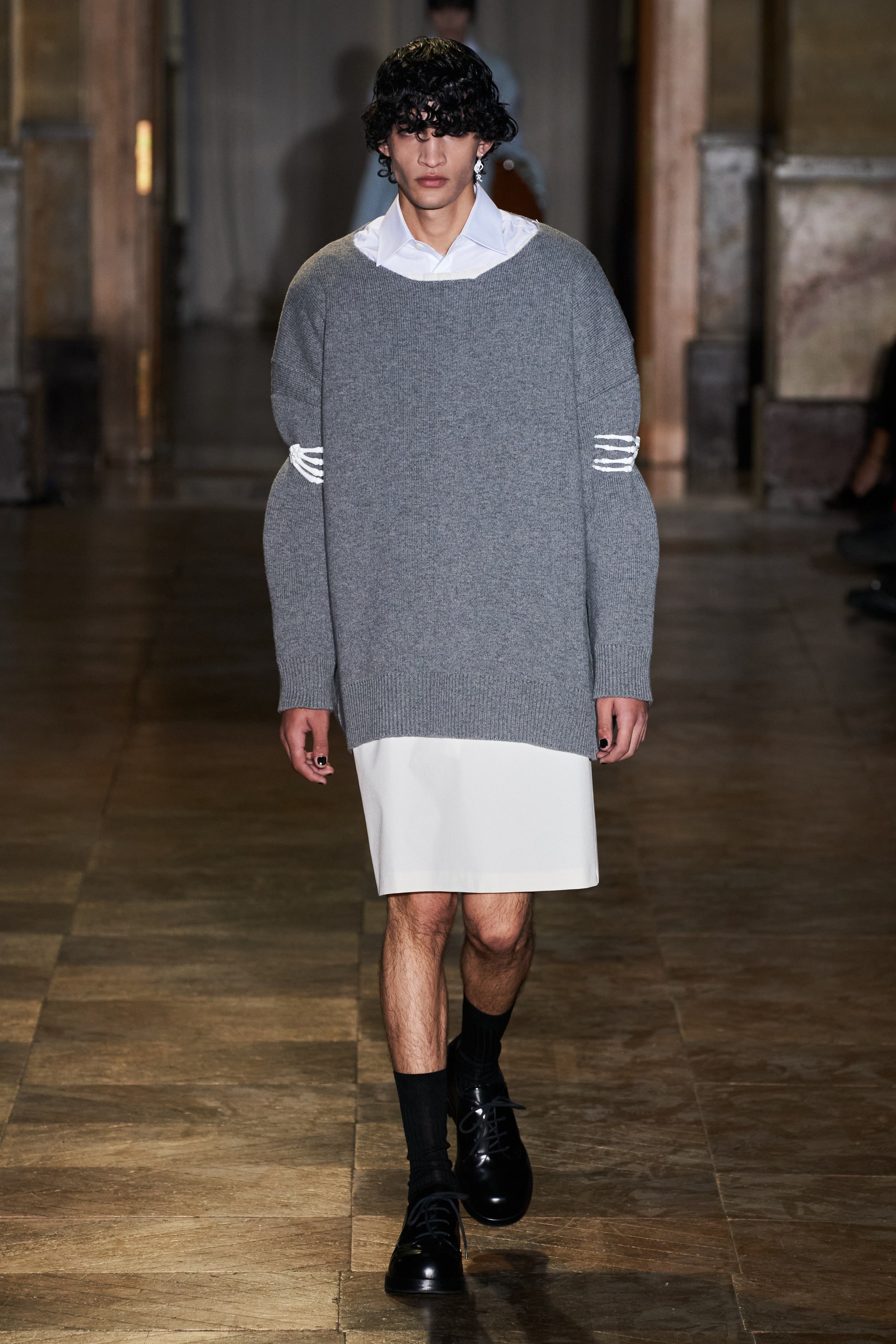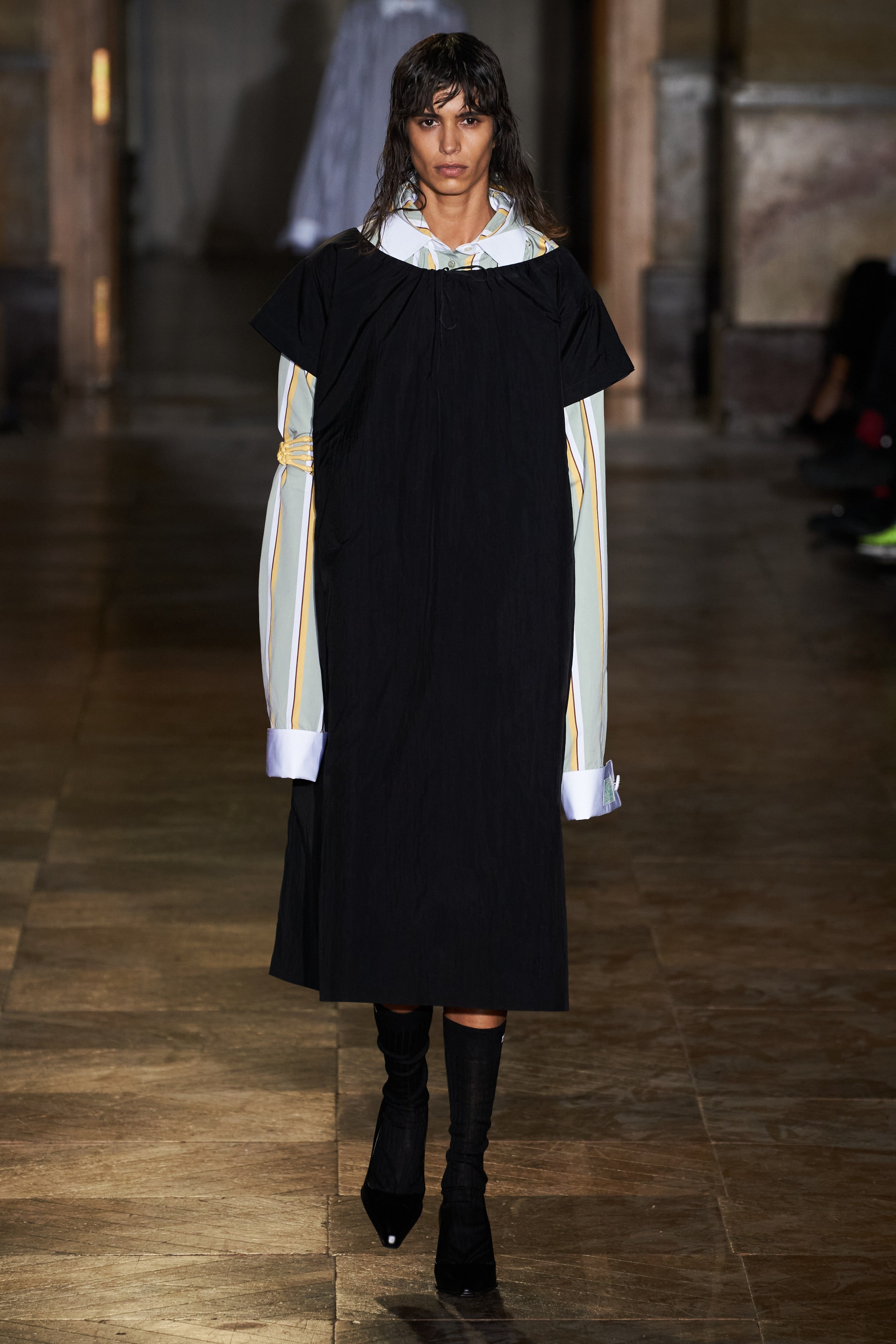 Модели-мужчины, как и женщины, носили удлиненные свитеры с V-образной горловиной поверх маек с рисунками, прямые платья-чехлы и рубашки в полоску. Одними из самых эффектных женских образов стали объемные бомберы в цветочный принт, дополненные юбками миди.