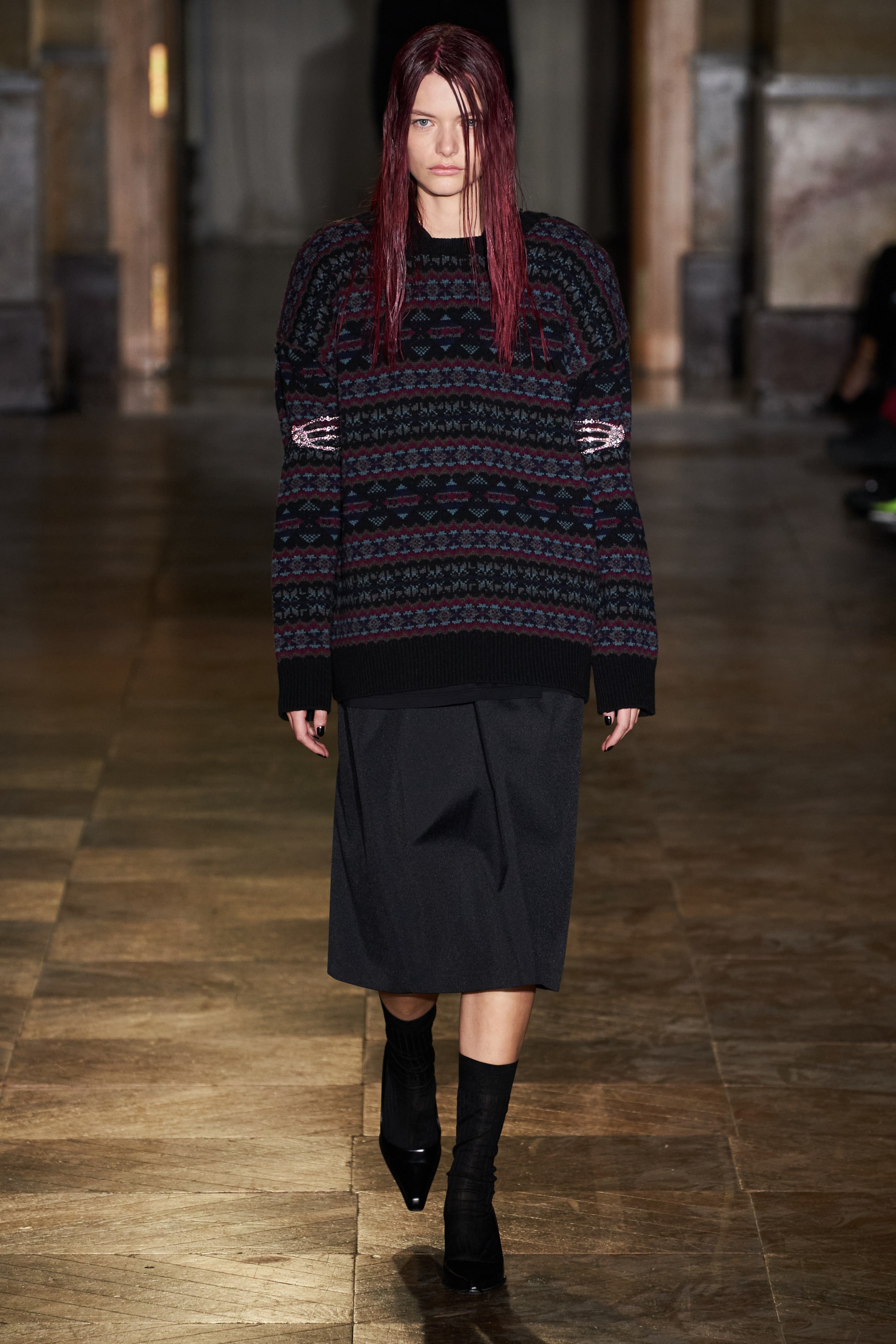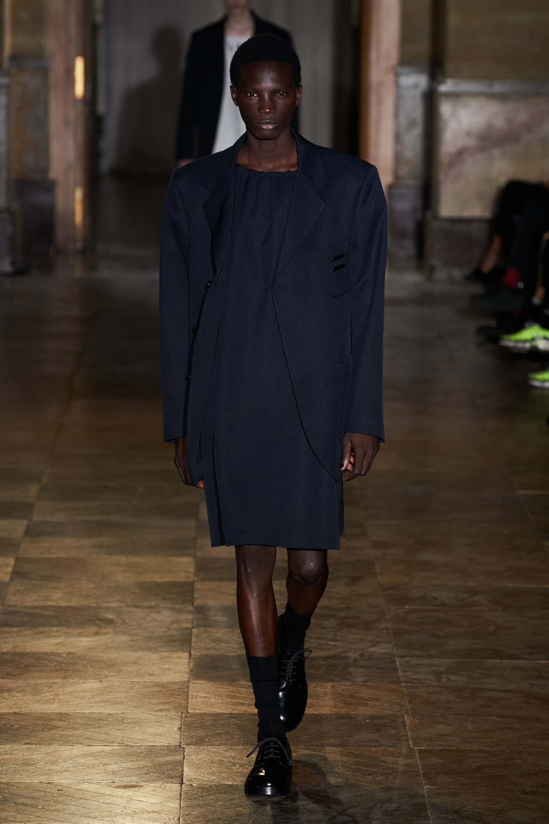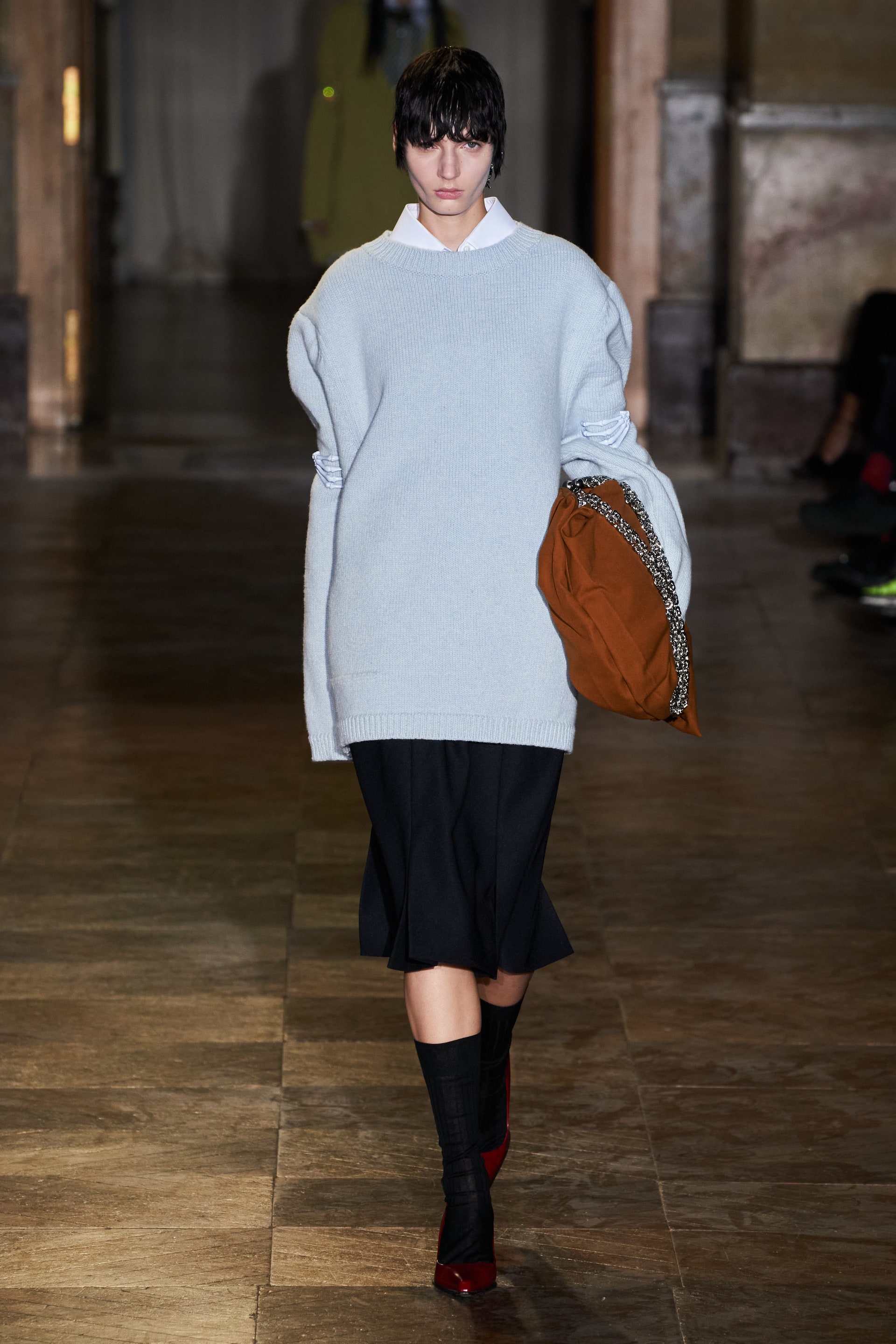 Модели-мужчины, как и женщины, носили удлиненные свитеры с V-образной горловиной поверх маек с рисунками, прямые платья-чехлы и рубашки в полоску. Одними из самых эффектных женских образов стали объемные бомберы в цветочный принт, дополненные юбками миди.