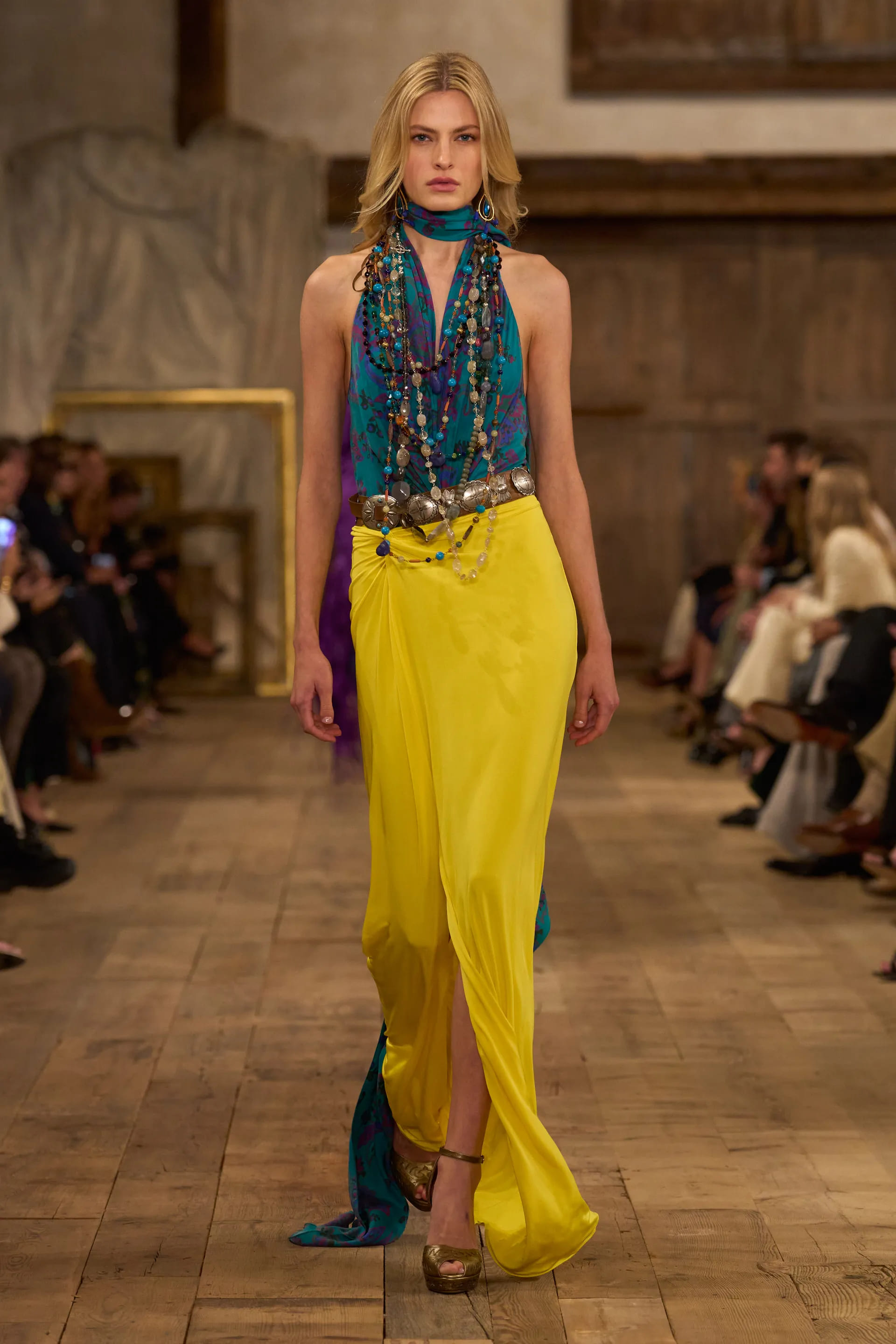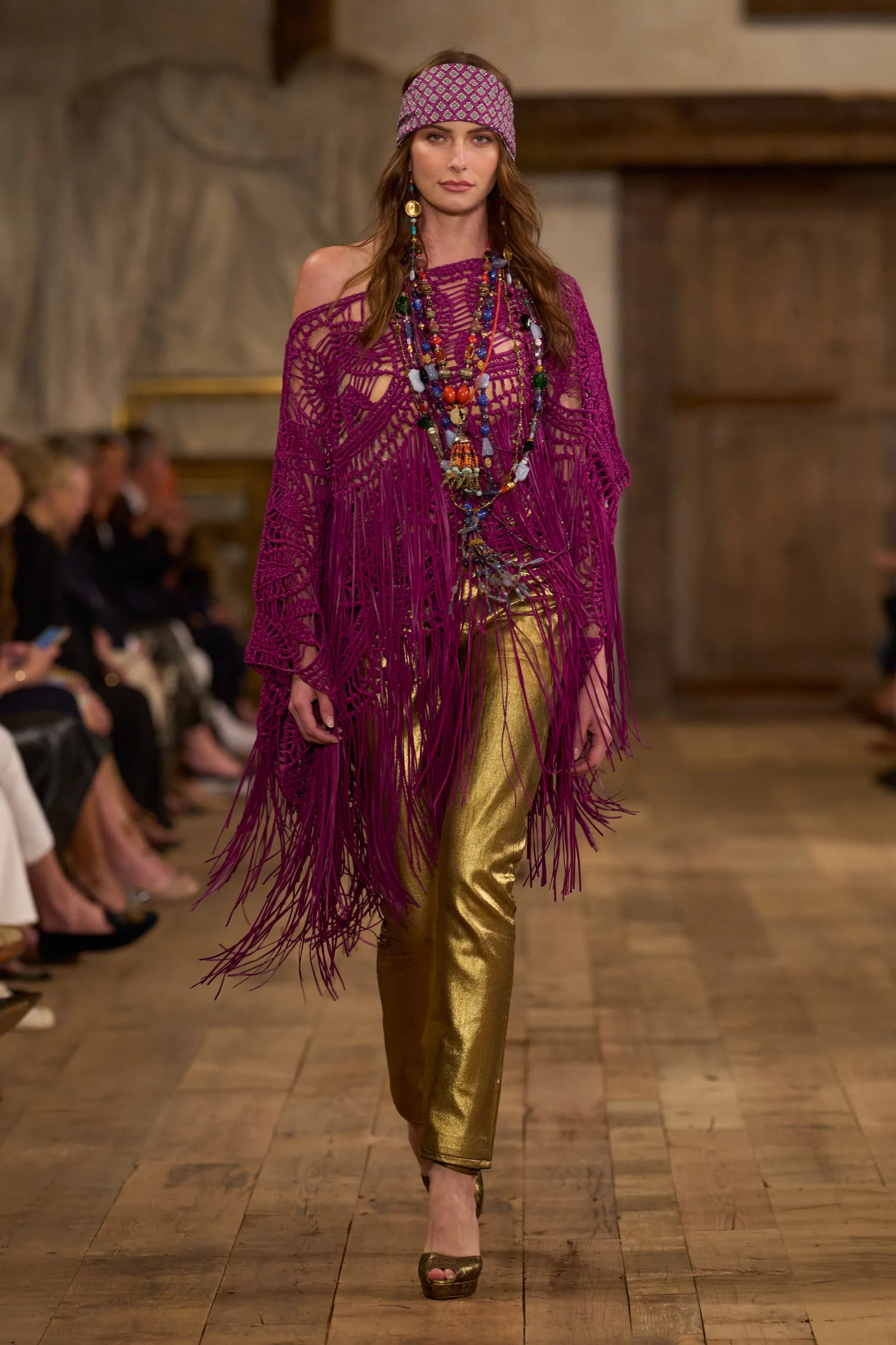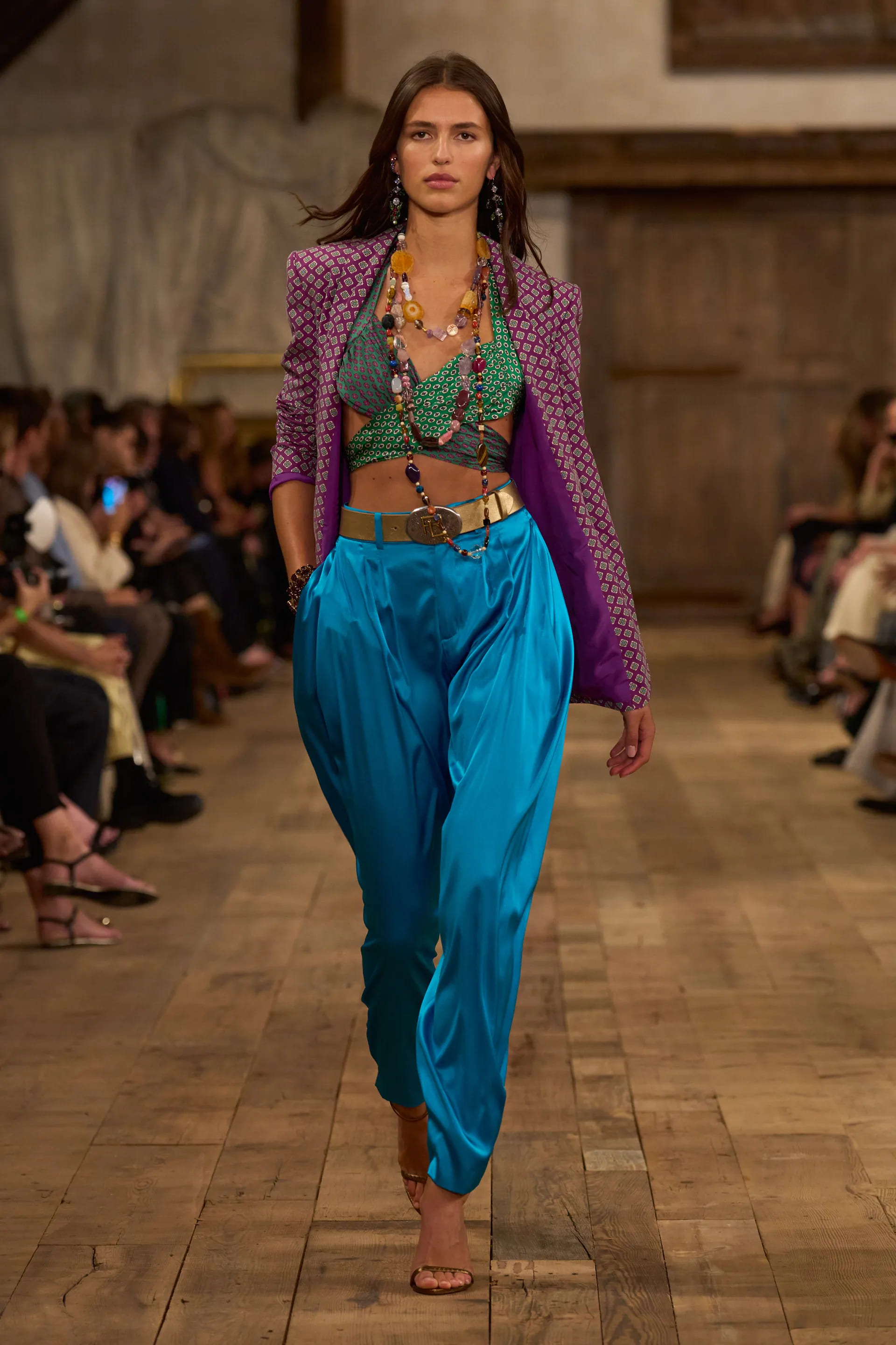 В останній секції шоу – уніформа музичного фестивалю «Коачелла» у напівкутюрній інтепритації. Дизайнер сміливо експериментує з кольорами, пропонуючи фешионістам яскраві поєднання. Насичено-фіолетовий, моркв’яний, відтінок синьої гавані та пурпуний – лише скромний перелік палітри, представленої на показі Lauren весна – 2024.