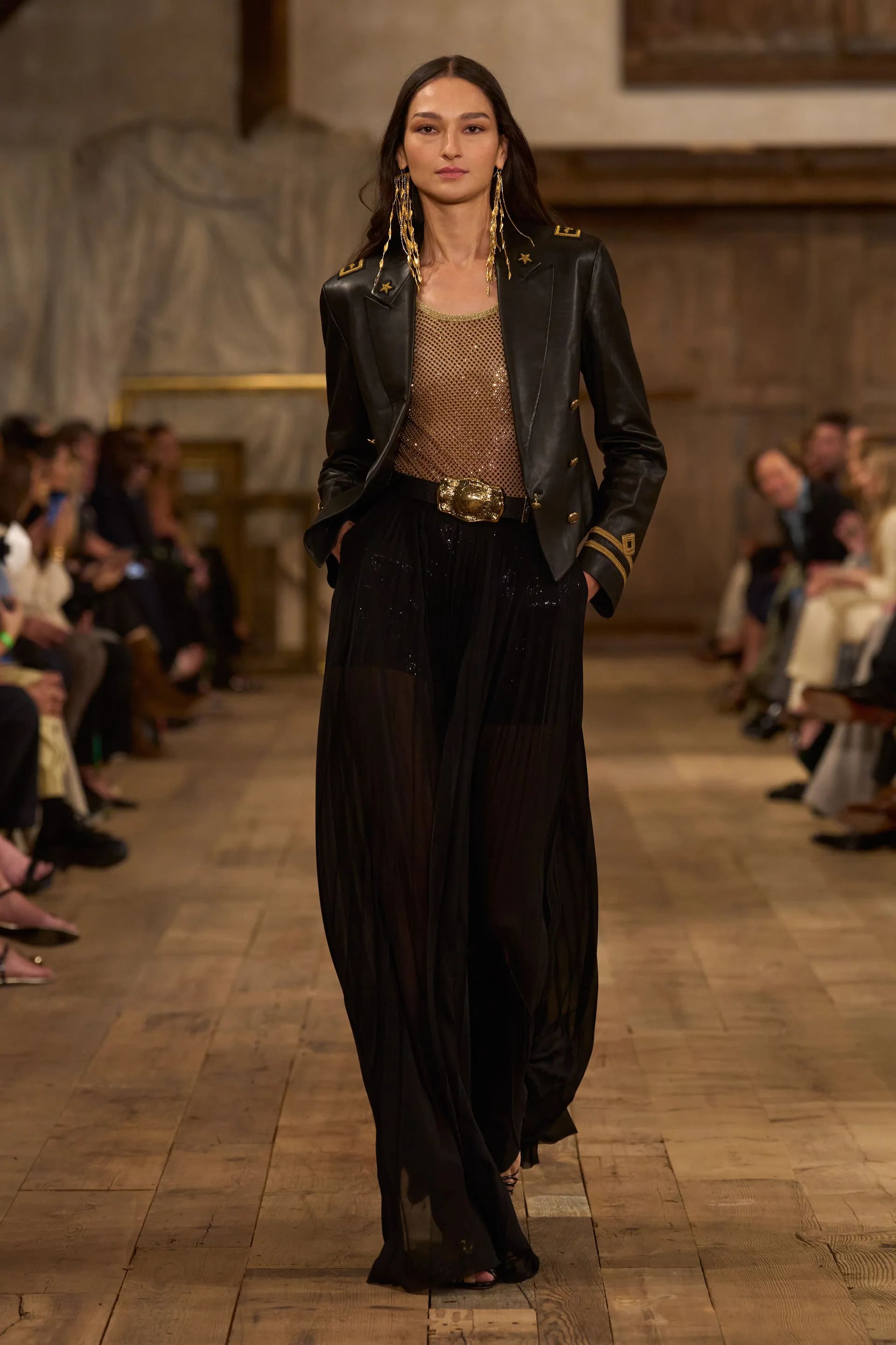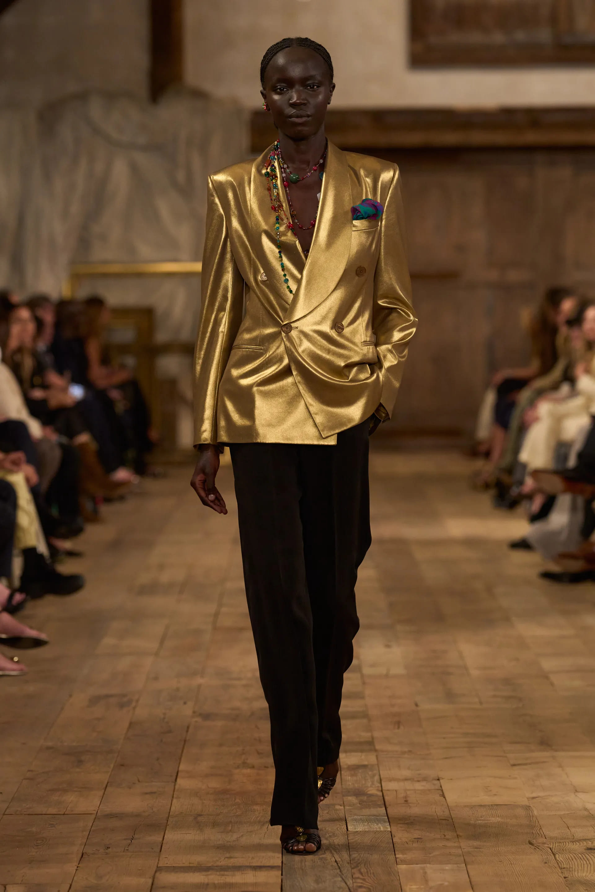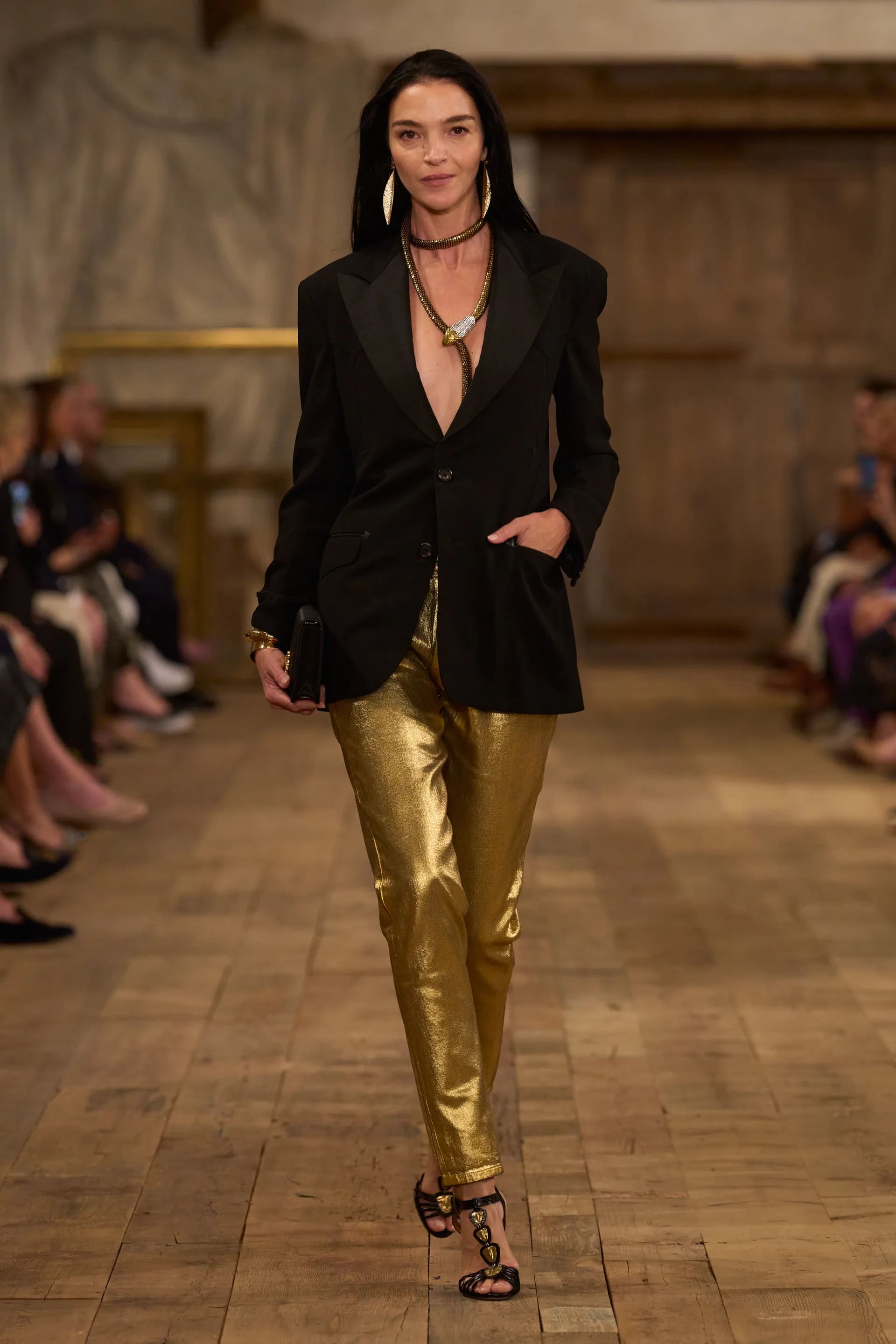 Наступну частину показу відкривала чорно-золота феєрія. Трендовий у цьому році металік Ральф Лорен переніс на сукні максі, структуровані жакети, брюки та навіть футболки-поло. Помпезності образам з колекції весна – 2024 додавали такі вишукані прийоми, як бісер і бахрома. Лорен залишається вірним модним кодам свого Дому. Дизайнер, як один з «китів» стилю old money, віддає перевагу тихій розкоші, наносячи логотип і монограми лише на пряжки ременів (хоча й масивних!).