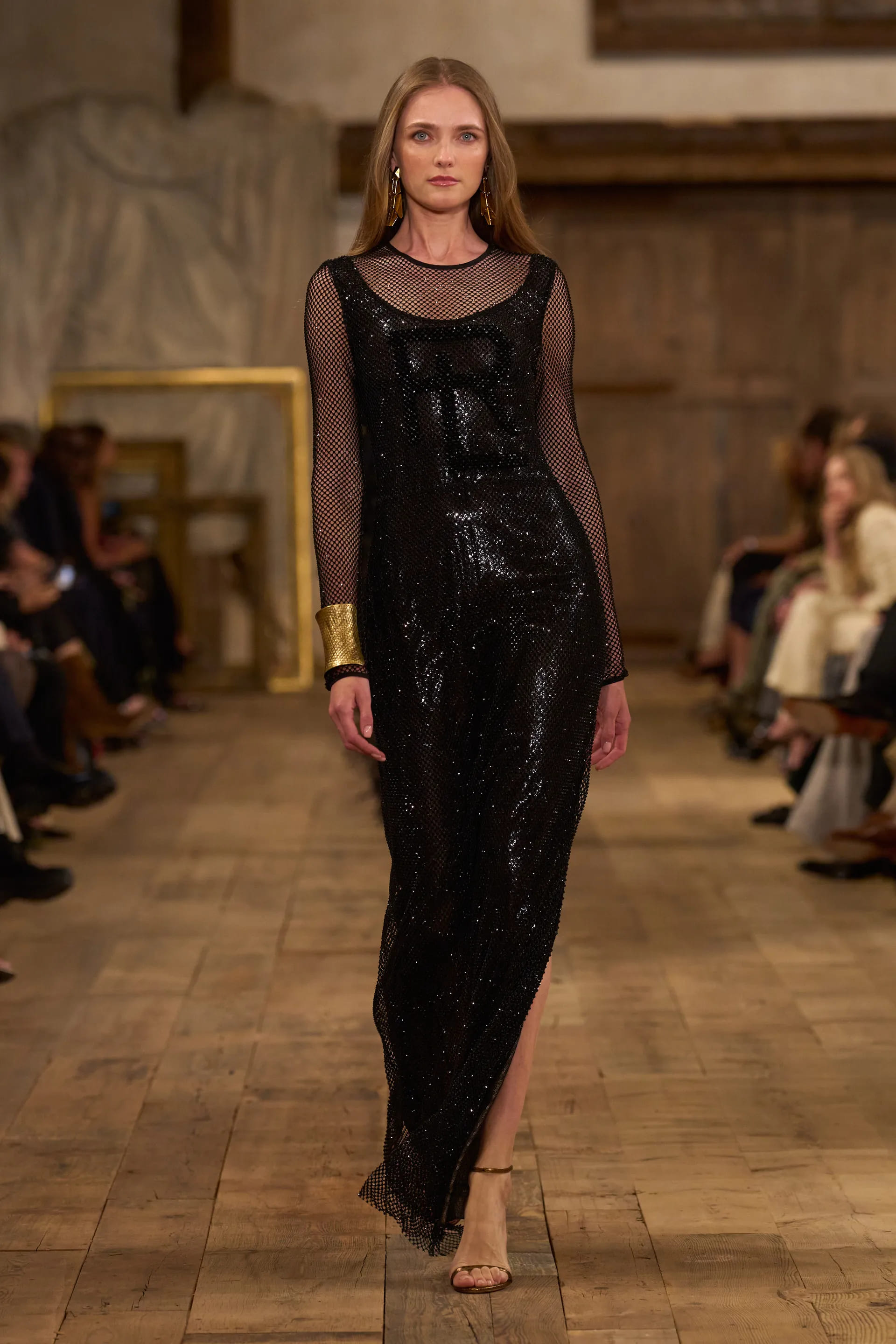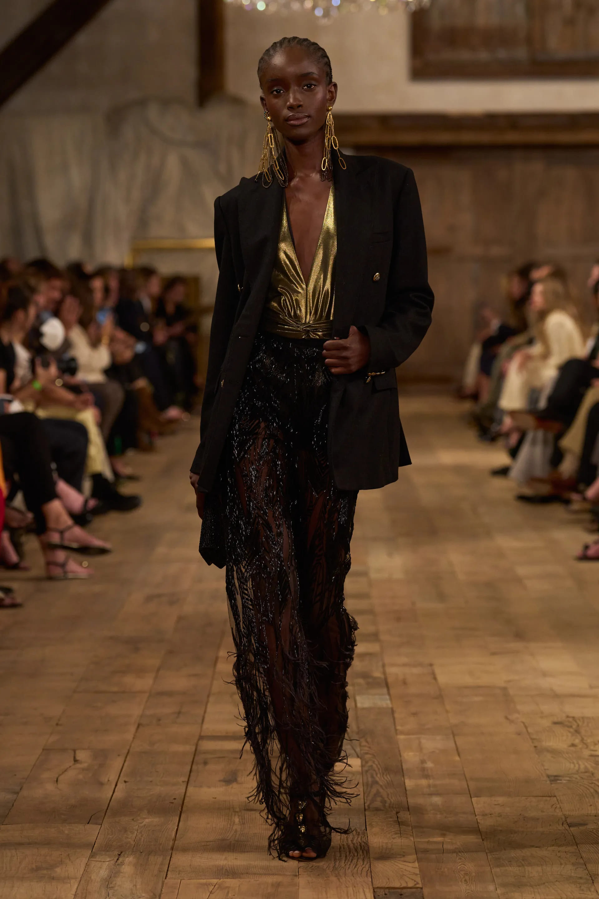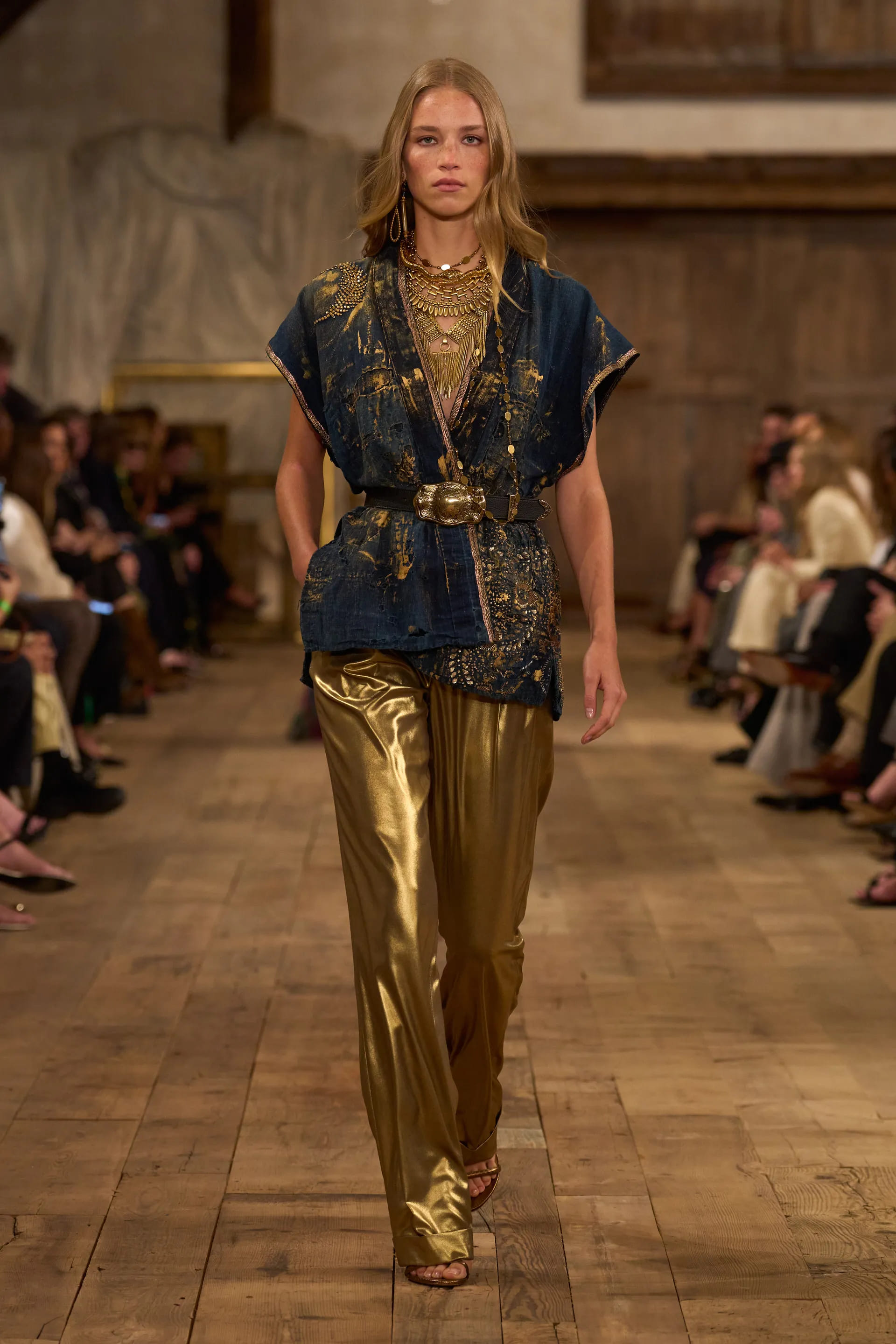 Наступну частину показу відкривала чорно-золота феєрія. Трендовий у цьому році металік Ральф Лорен переніс на сукні максі, структуровані жакети, брюки та навіть футболки-поло. Помпезності образам з колекції весна – 2024 додавали такі вишукані прийоми, як бісер і бахрома. Лорен залишається вірним модним кодам свого Дому. Дизайнер, як один з «китів» стилю old money, віддає перевагу тихій розкоші, наносячи логотип і монограми лише на пряжки ременів (хоча й масивних!).