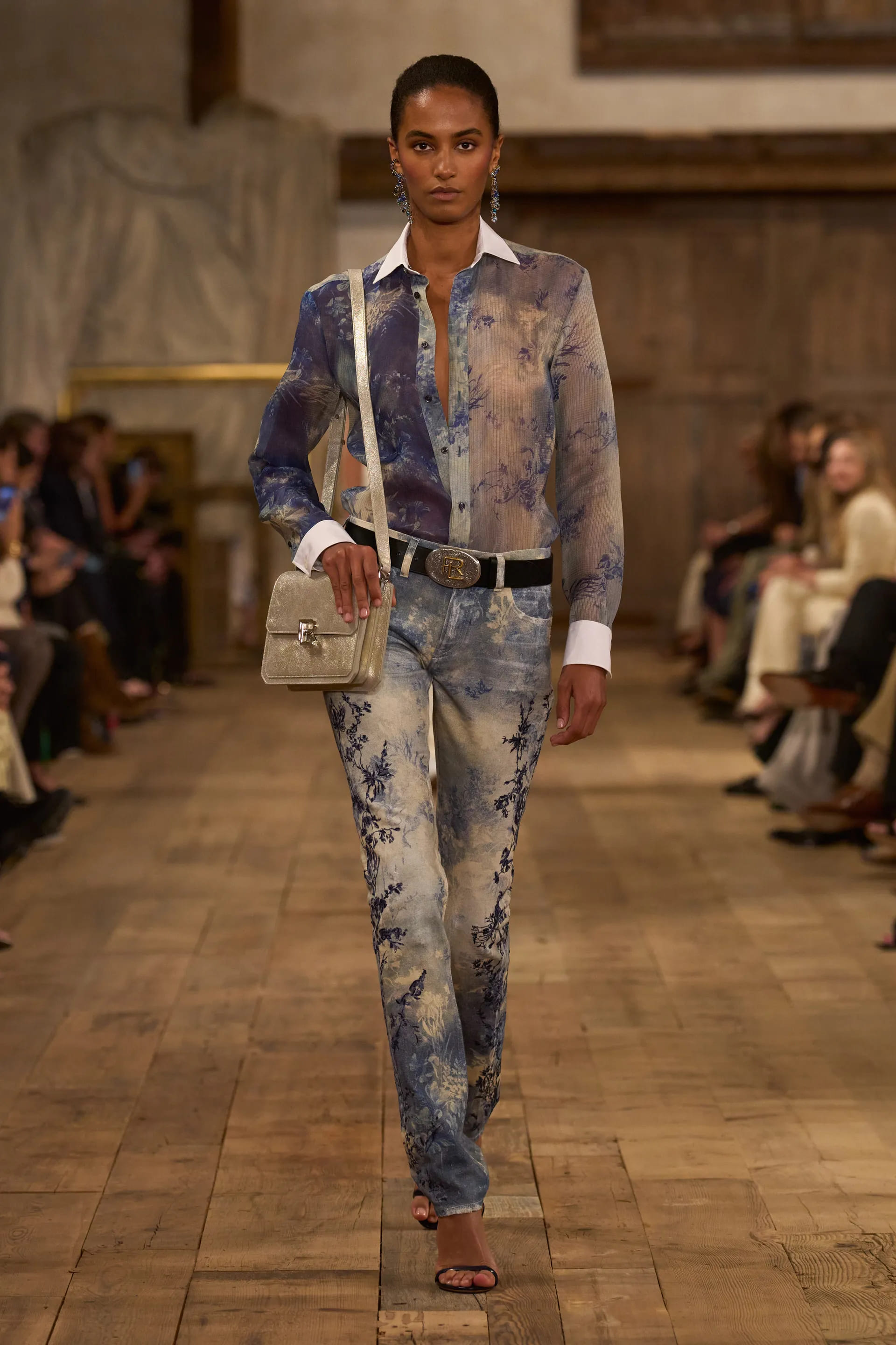 Шоу весна – 2024 розпочалося з силуетів, виготовлених з чи не найбільш американського матеріалу – деніму. Ralph Lauren експериментує з його кольором і фактурою в топах, бюстьє, спідницях і костюмах. Також гра з денімом продовжується й у флористичних принтах, нанесених на джинс.