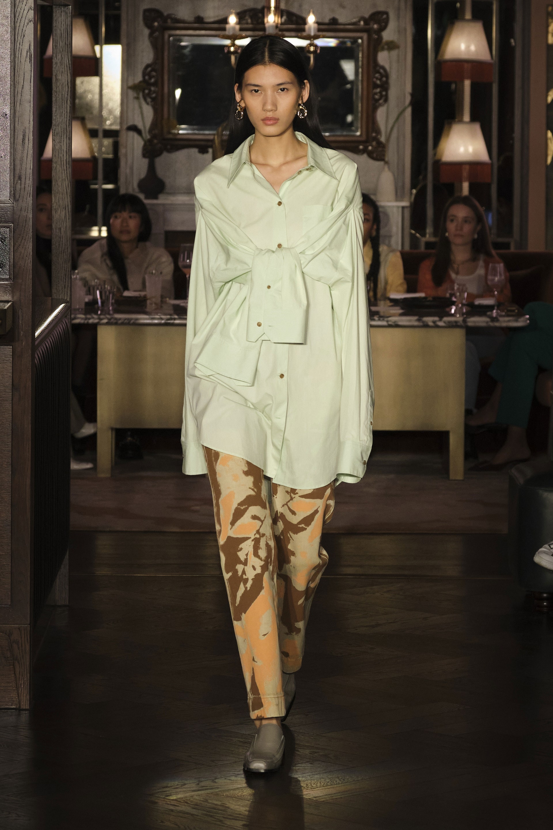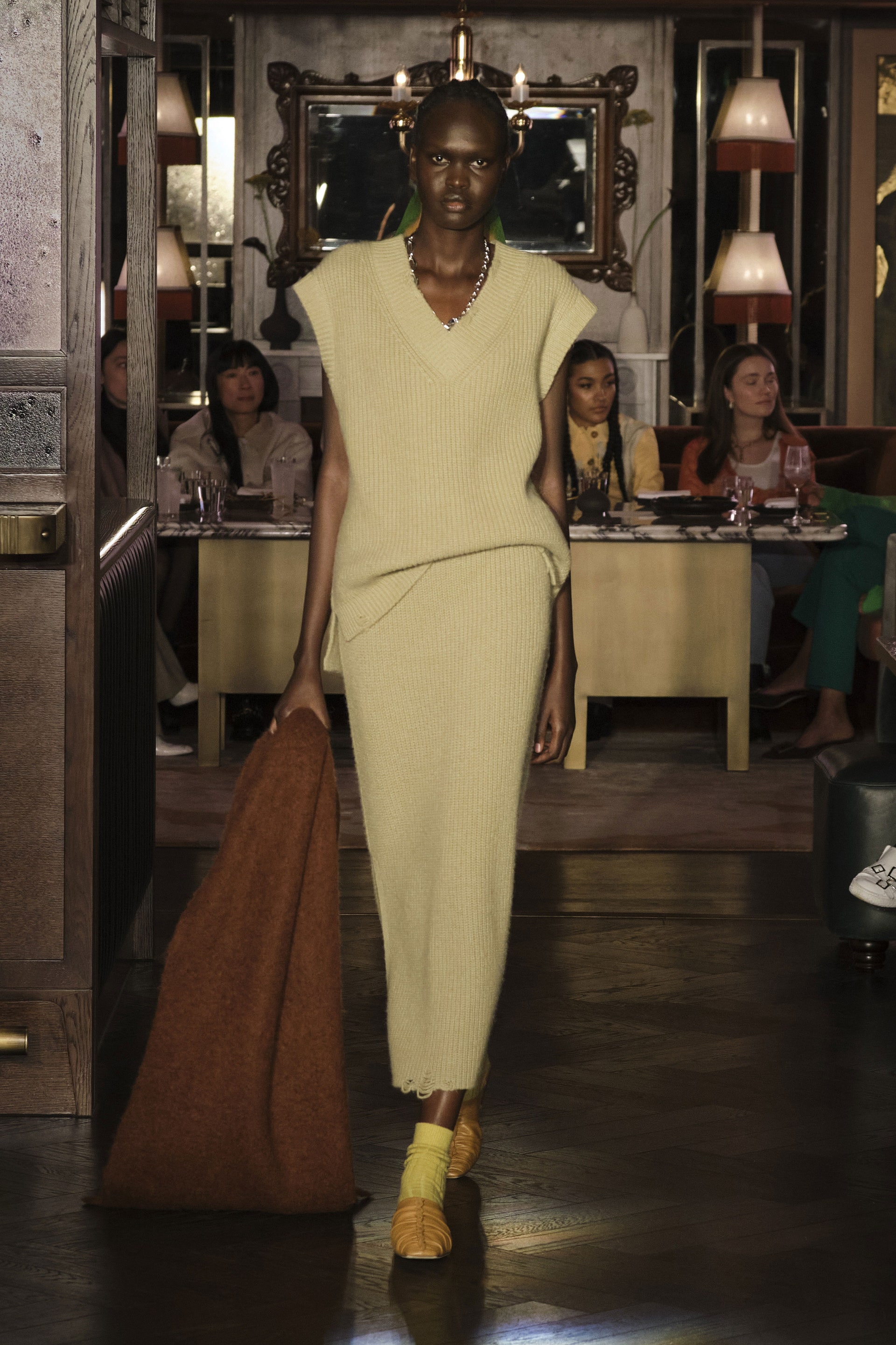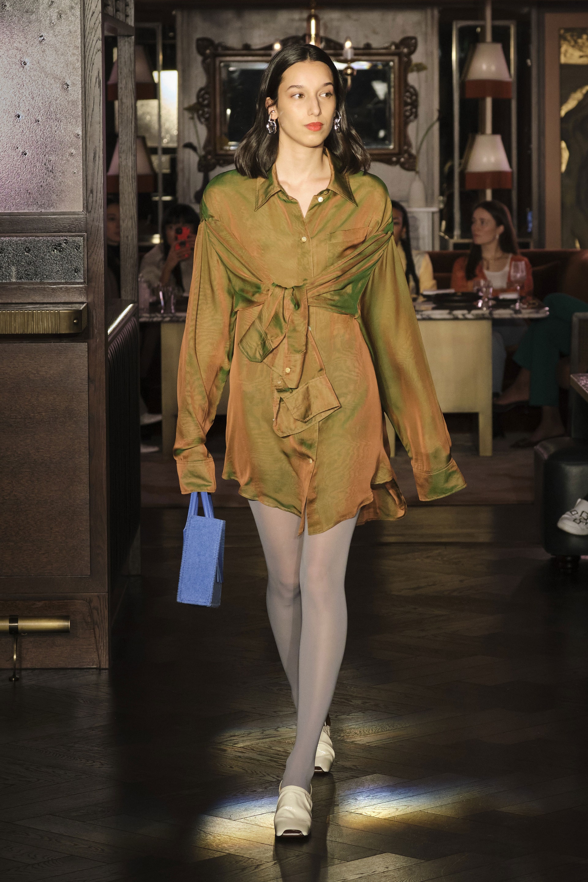 Целью Пио было уйти от подражания эпохе в сторону современной интерпретации, и у неё получилось. Вещи из "потертого" денима отсылали к кодам рабочей одежды, платье-рубашка с лишней парой рукавов лишь отдаленно напоминает повседневные платья гарсонеток, а принт в стиле ар-деко оцифрован и имеет психоделический оттенок. Коллекция дополнена полноценной линейкой сумок: от войлочных и миниатюрных поясных до красочных наплечных.