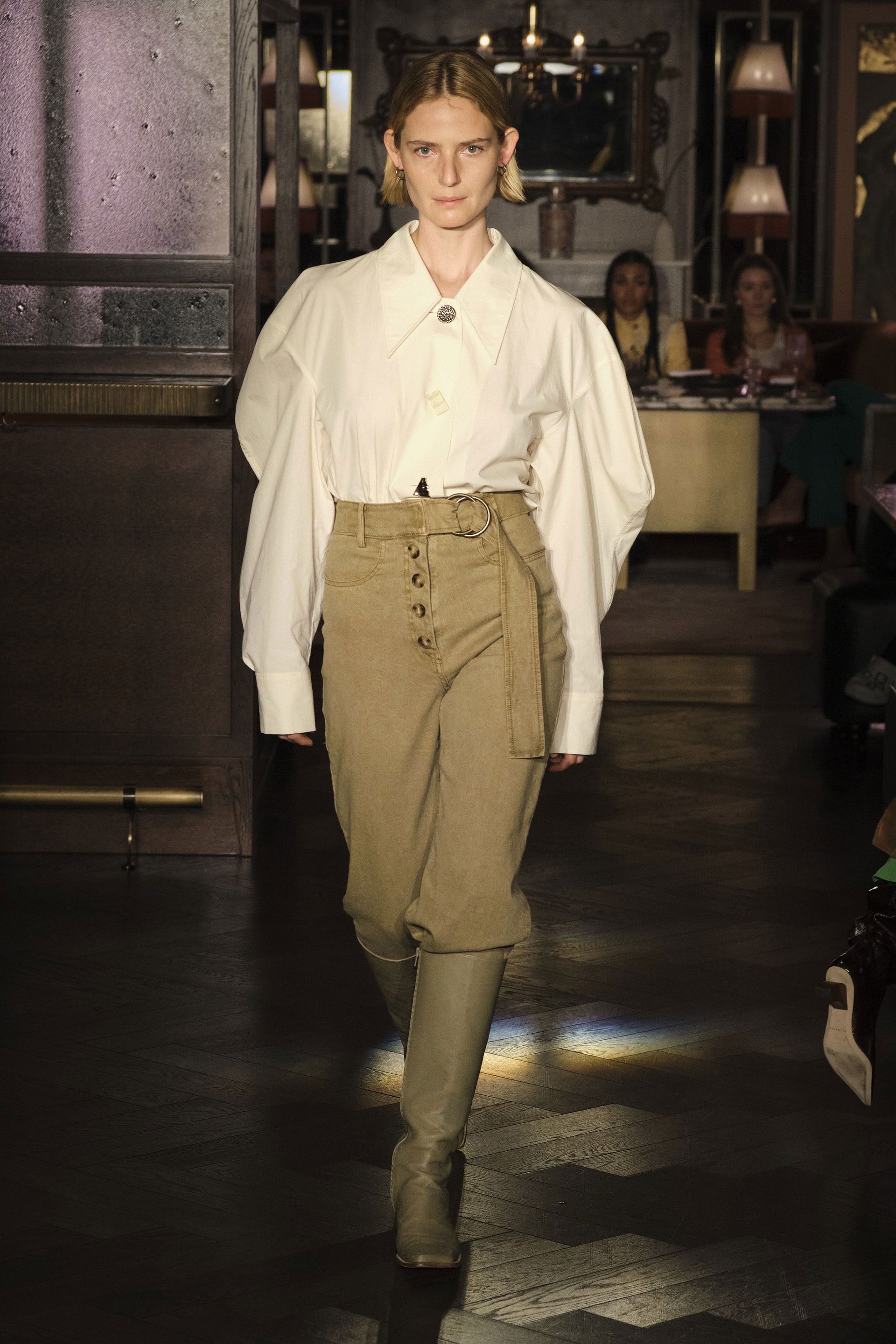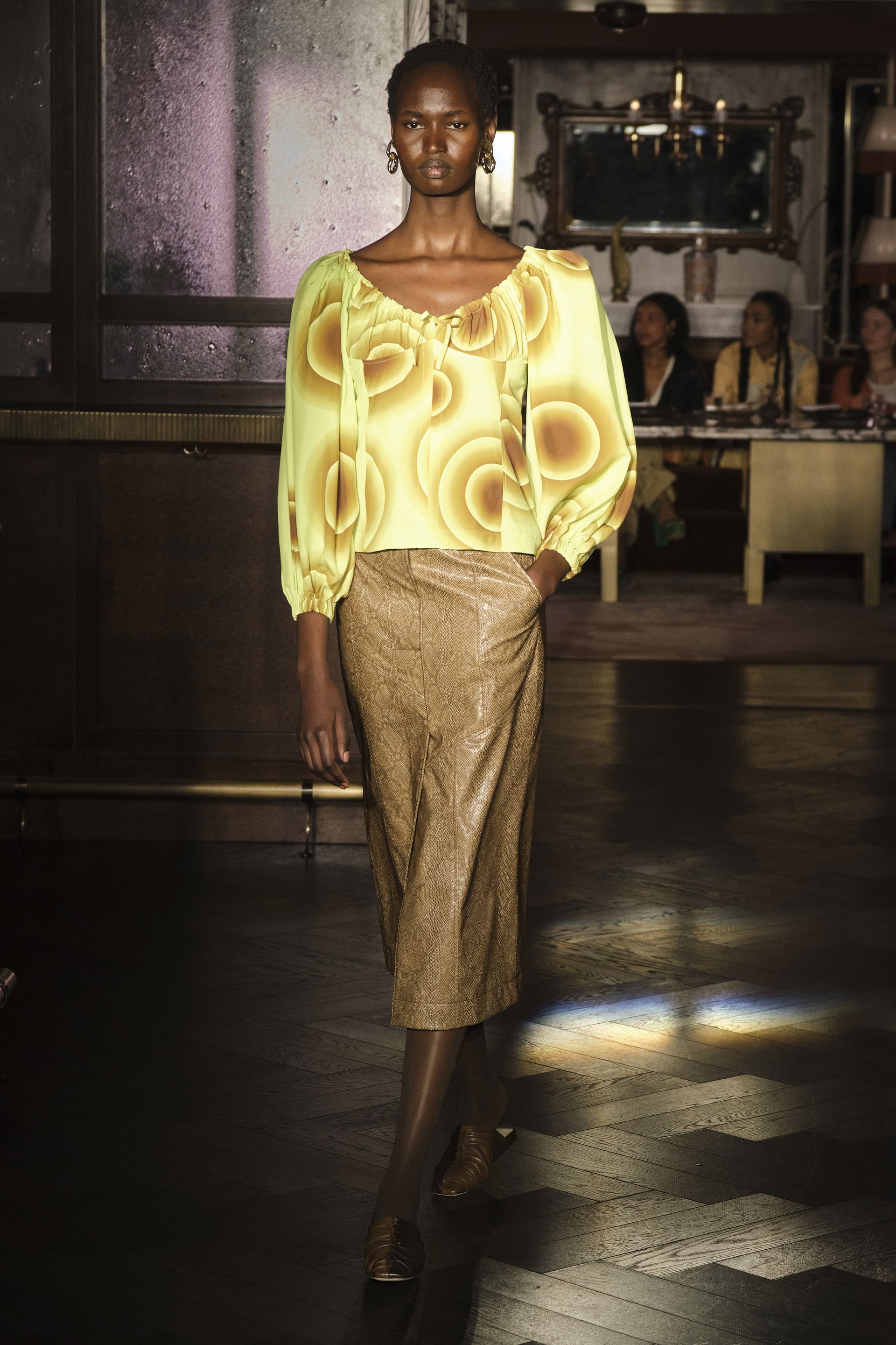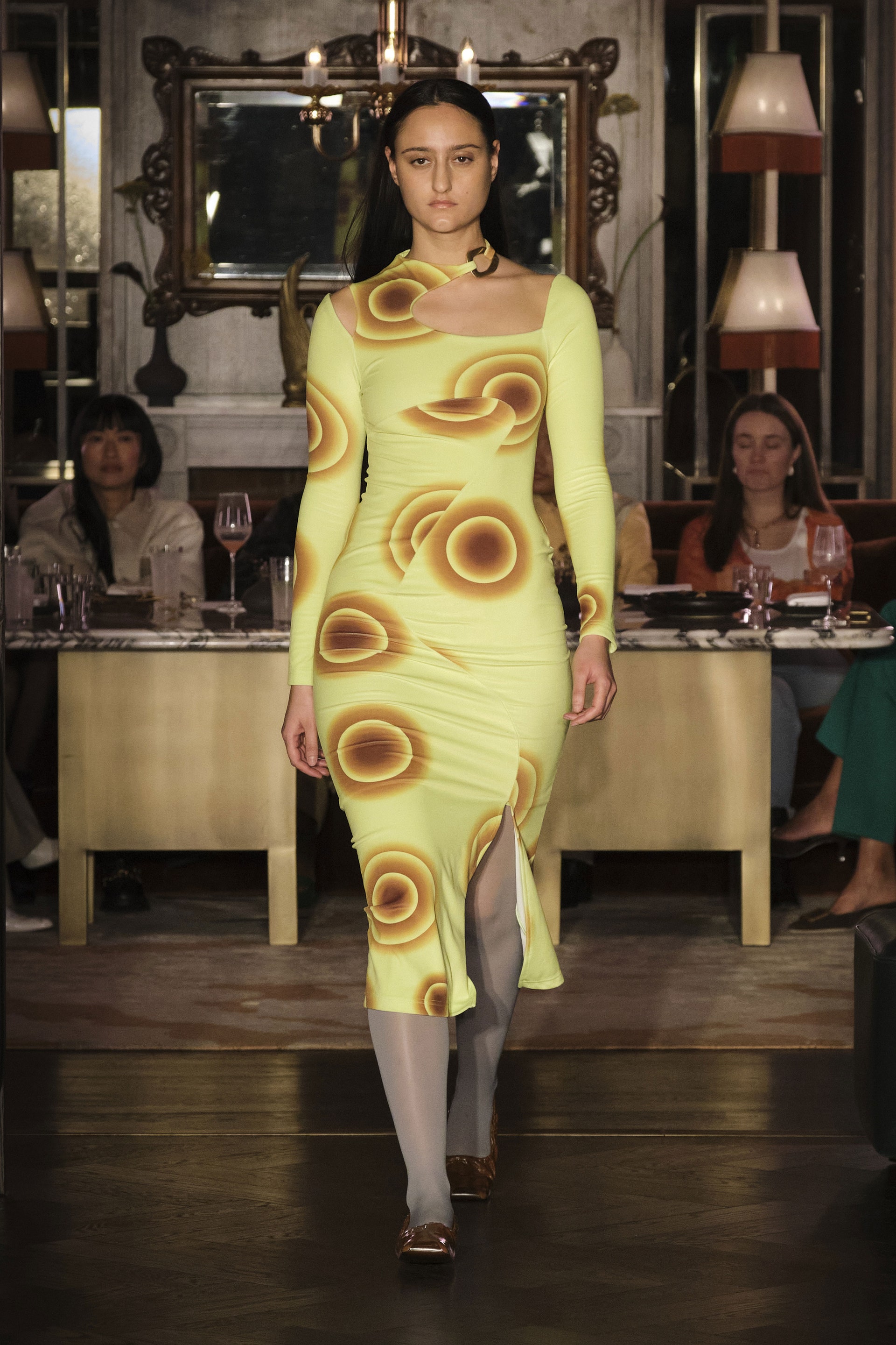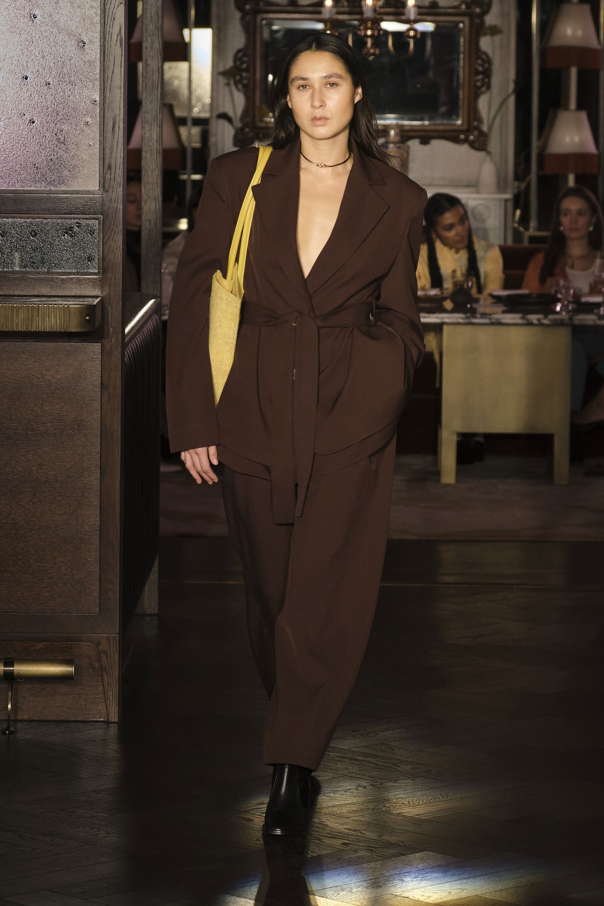 Целью Пио было уйти от подражания эпохе в сторону современной интерпретации, и у неё получилось. Вещи из "потертого" денима отсылали к кодам рабочей одежды, платье-рубашка с лишней парой рукавов лишь отдаленно напоминает повседневные платья гарсонеток, а принт в стиле ар-деко оцифрован и имеет психоделический оттенок. Коллекция дополнена полноценной линейкой сумок: от войлочных и миниатюрных поясных до красочных наплечных.