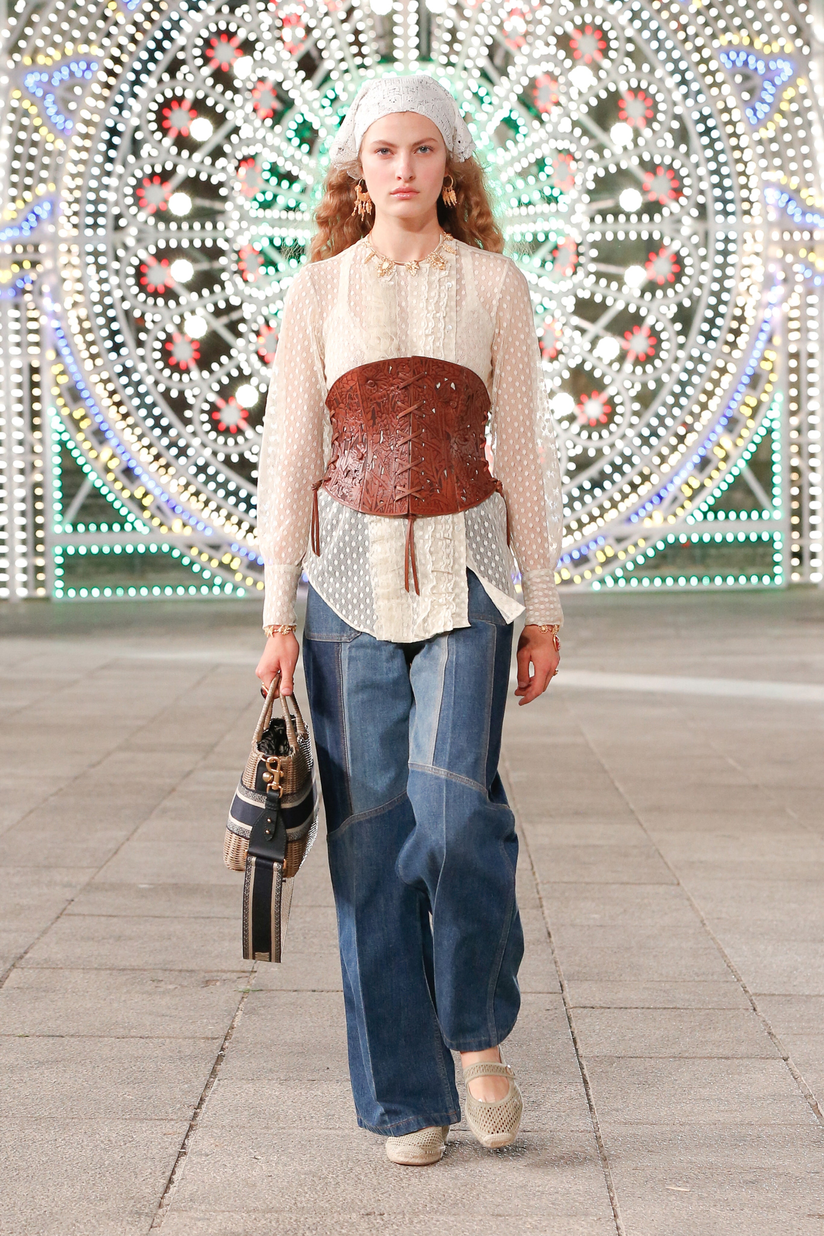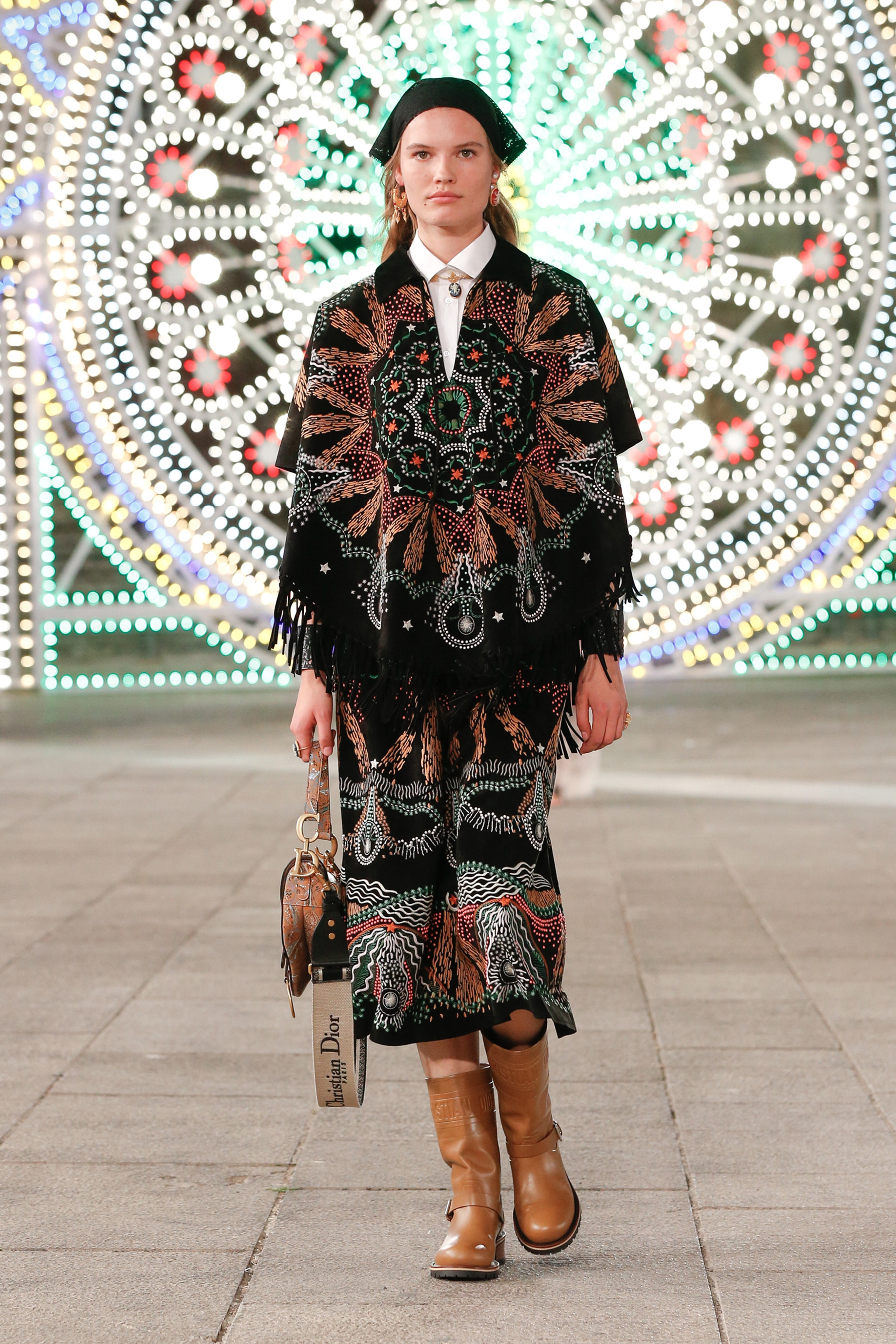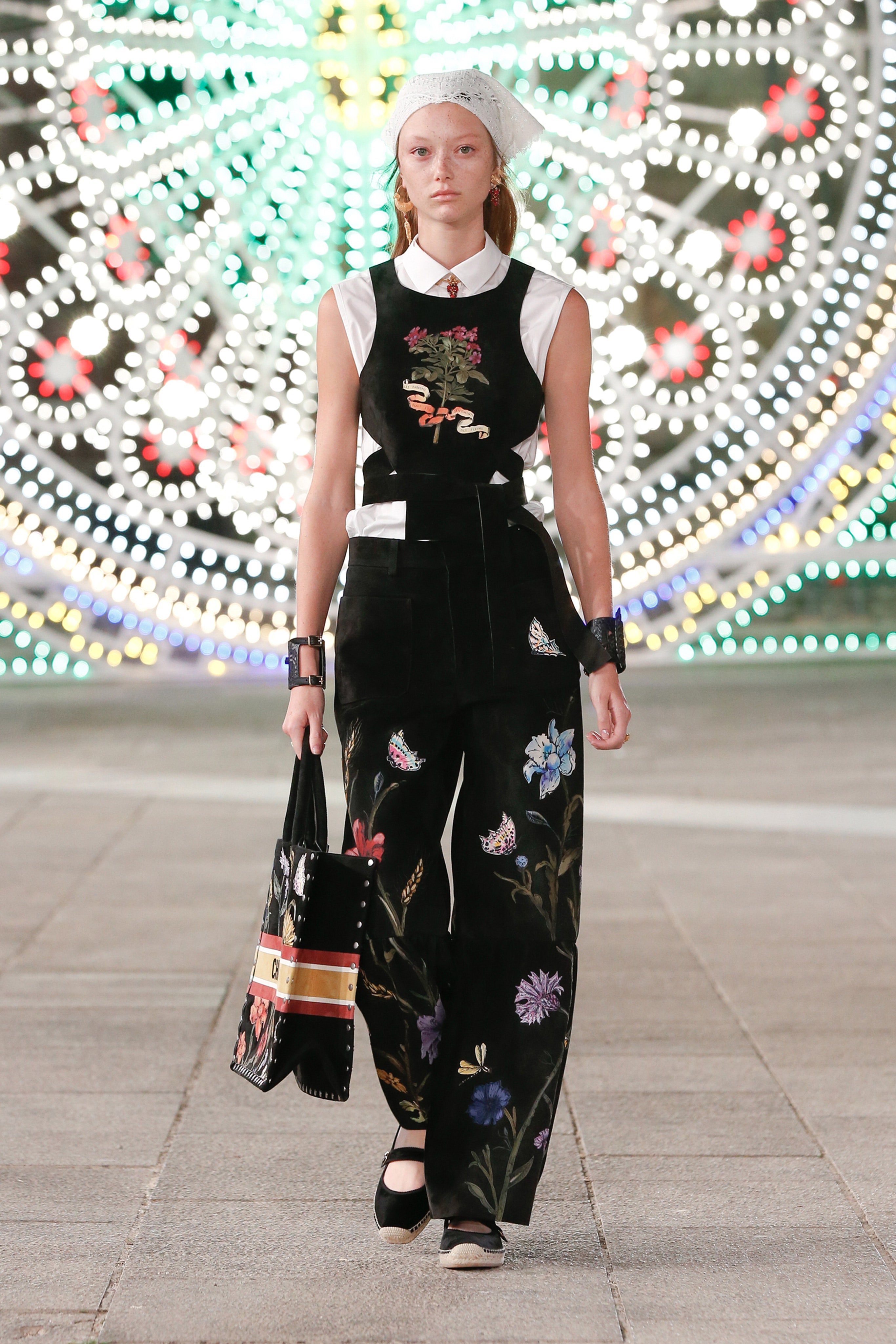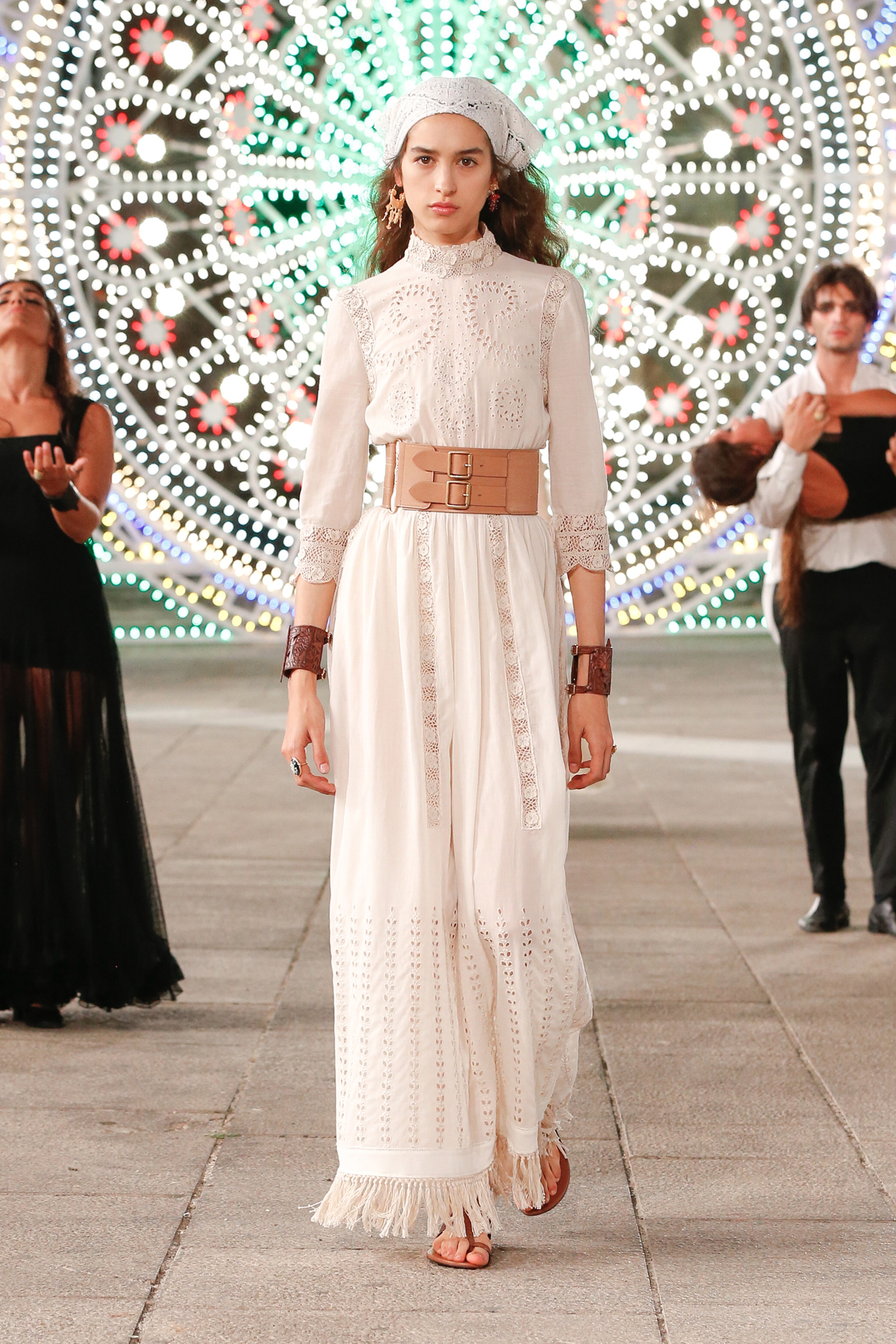 Мария Грация Кьюри, для которой маленький юг Италии является родиной, выдержала грань между скромностью и изысканностью в сарафанах и платьях с вышивкой, тканых костюмах и корсажных юбках на старинный манер с пасторальными кисточками, вязаных жилетах и наглухо застегнутых рубашках. Образы были дополнены белоснежными косынками и нарочито простыми, почти крестьянскими сапогами на плоской подошве.