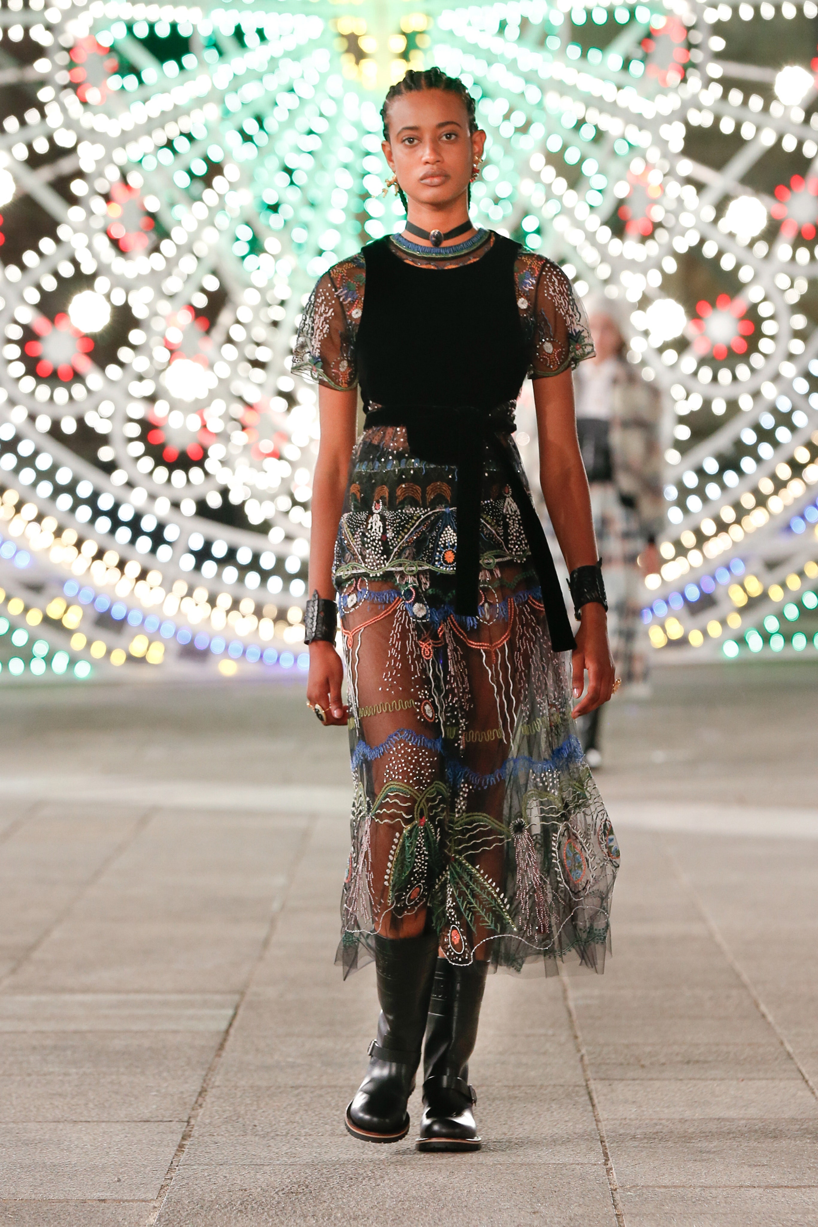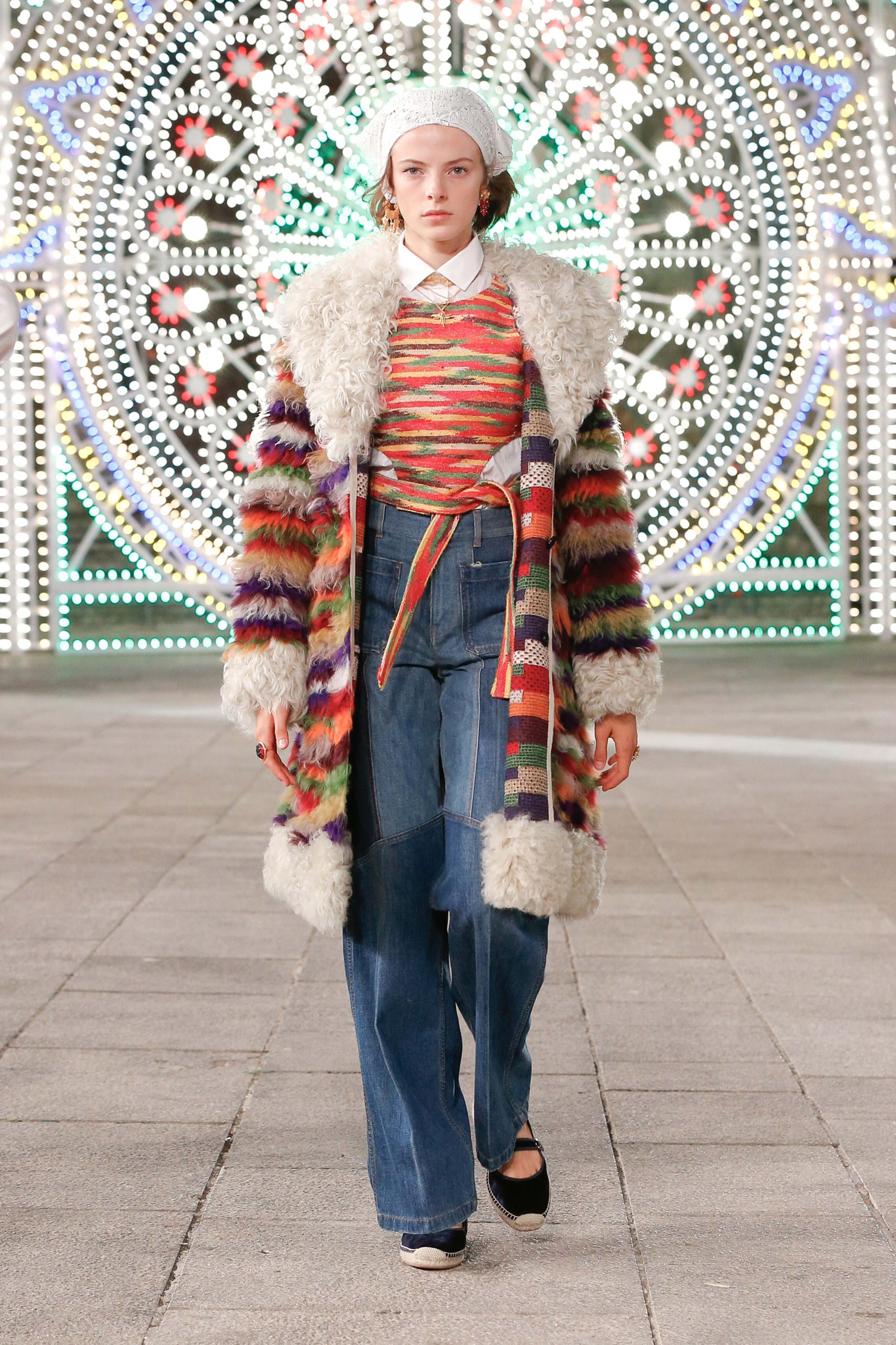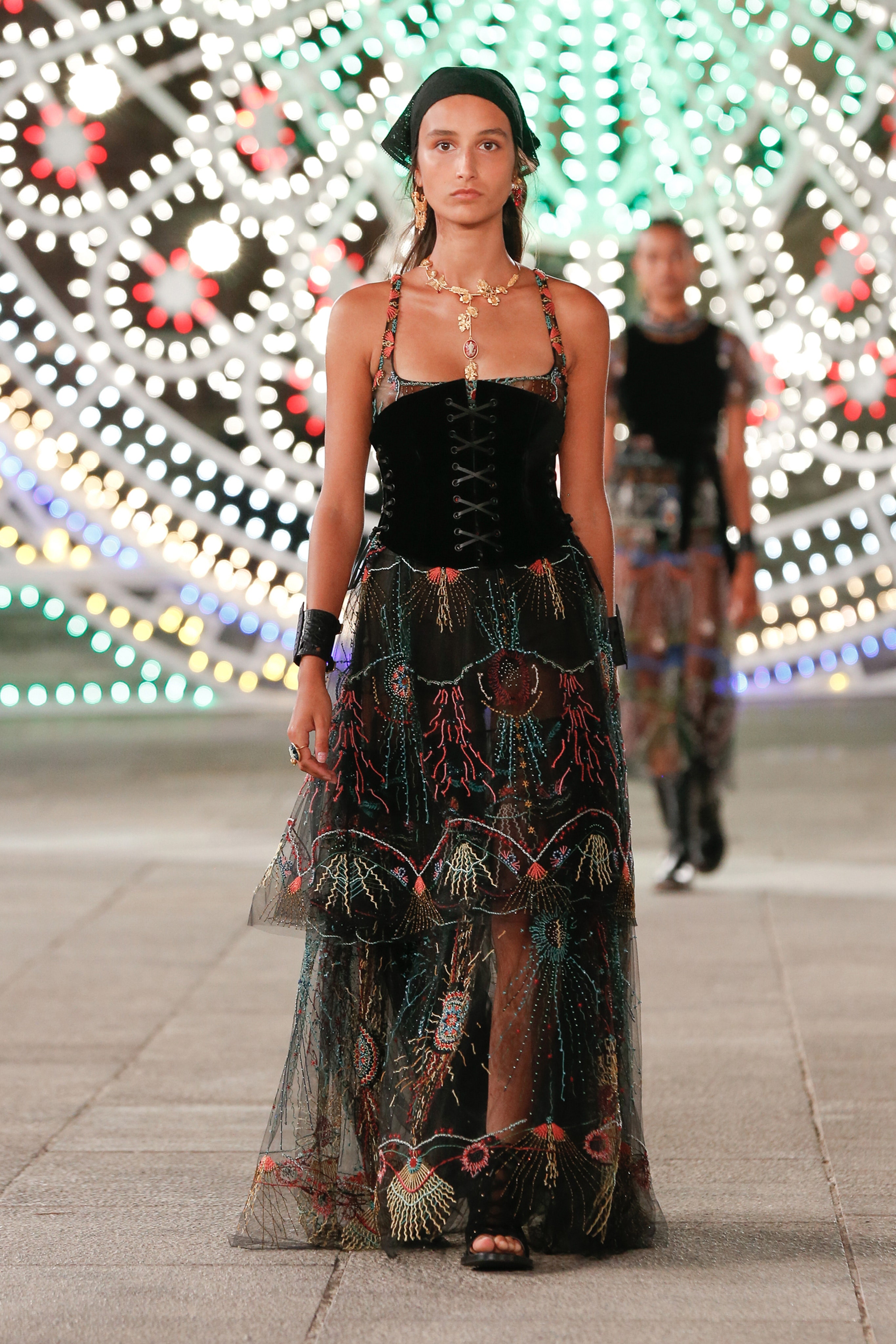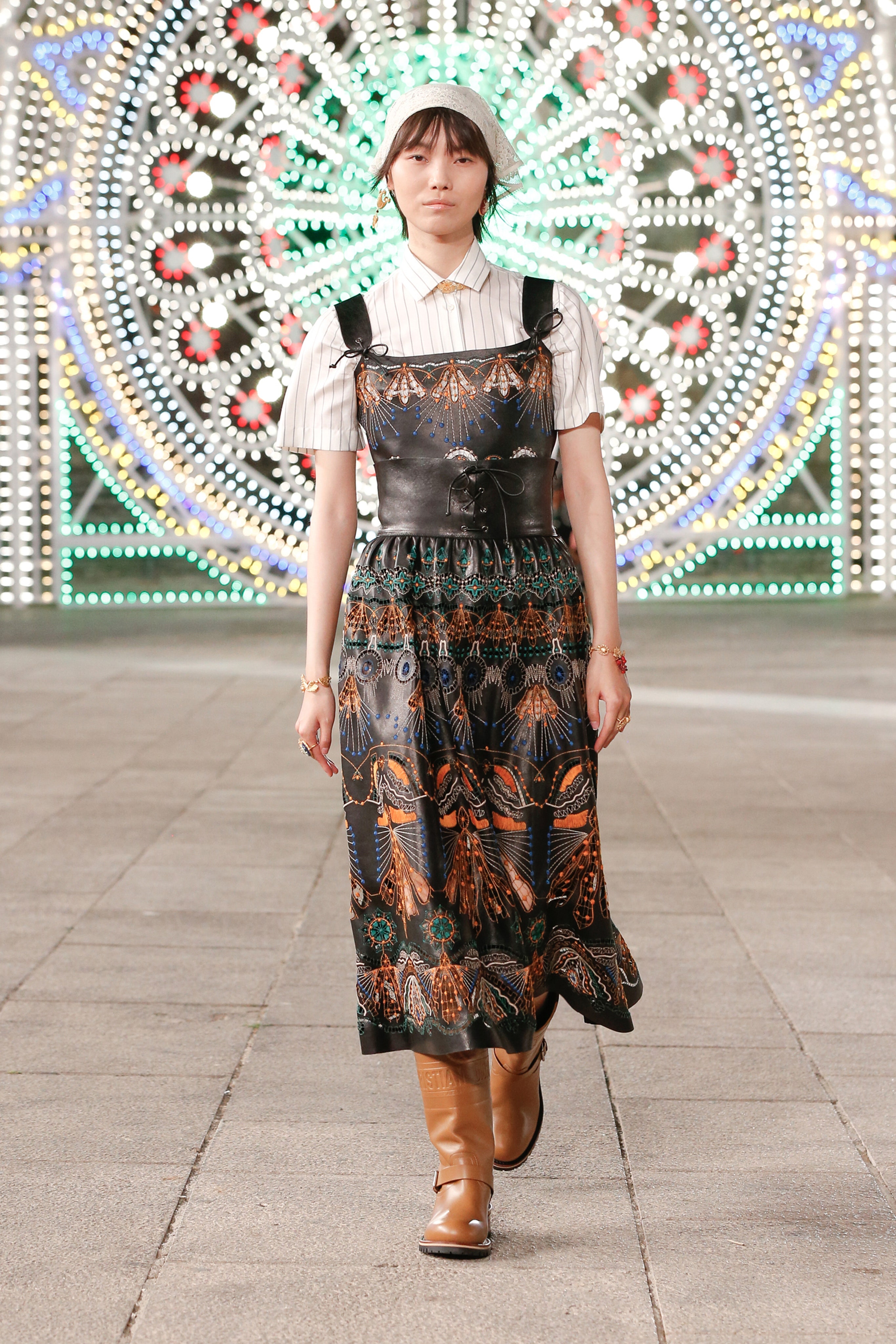 Мария Грация Кьюри, для которой маленький юг Италии является родиной, выдержала грань между скромностью и изысканностью в сарафанах и платьях с вышивкой, тканых костюмах и корсажных юбках на старинный манер с пасторальными кисточками, вязаных жилетах и наглухо застегнутых рубашках. Образы были дополнены белоснежными косынками и нарочито простыми, почти крестьянскими сапогами на плоской подошве.