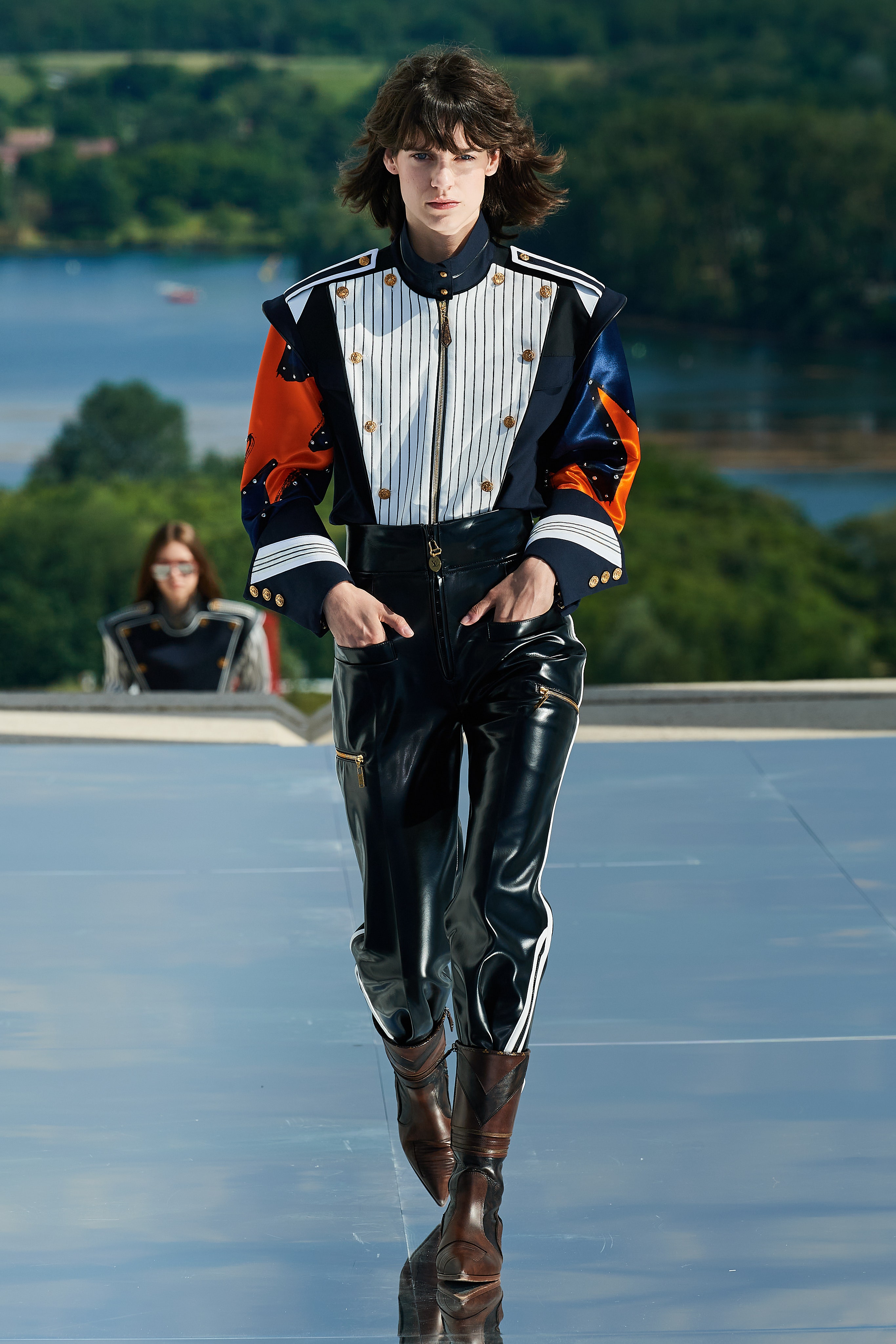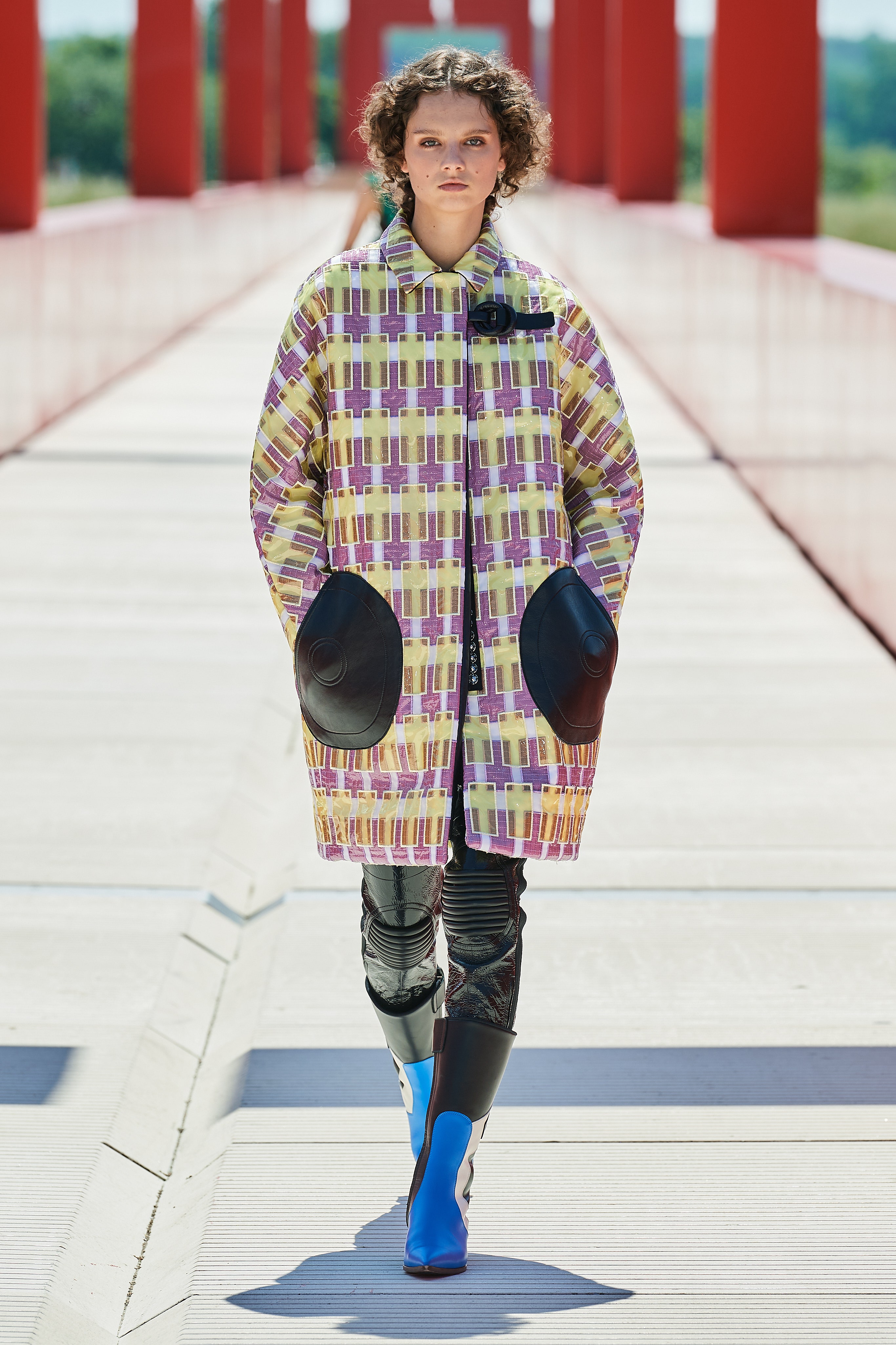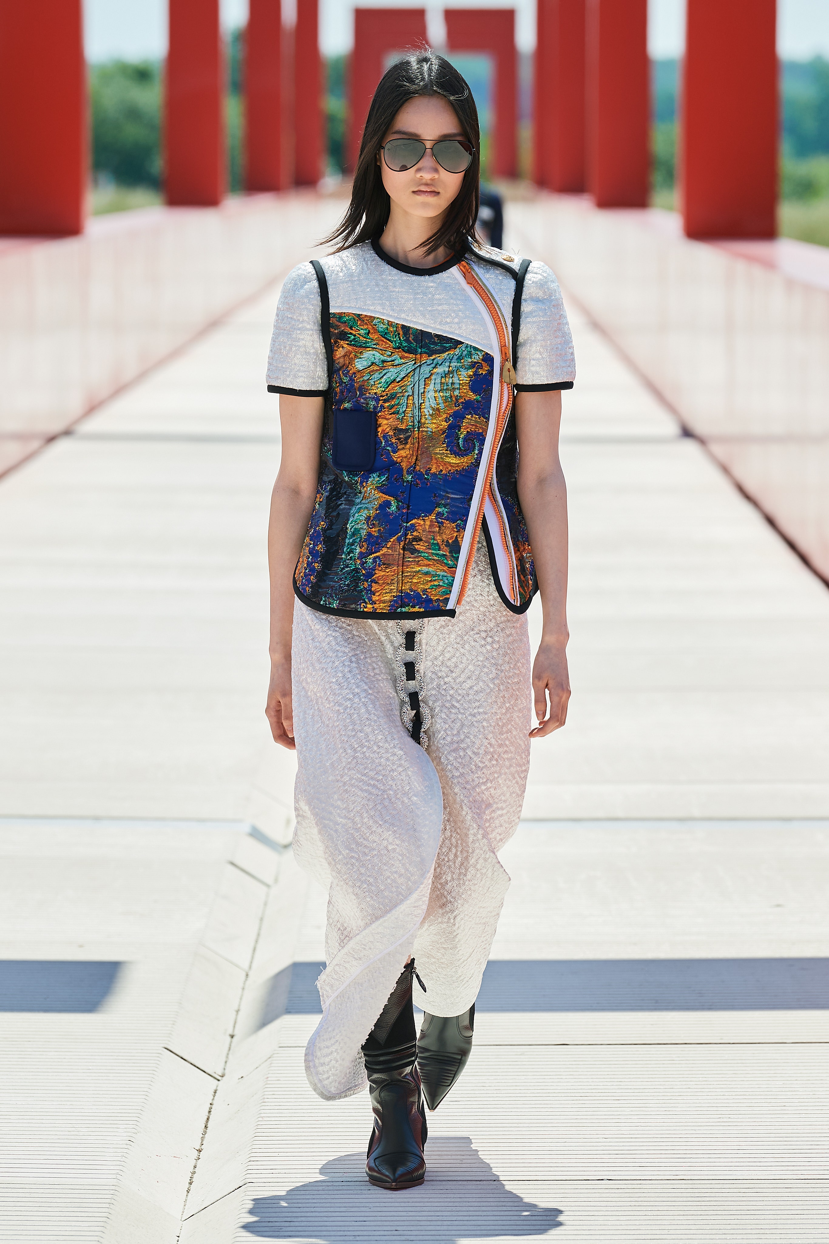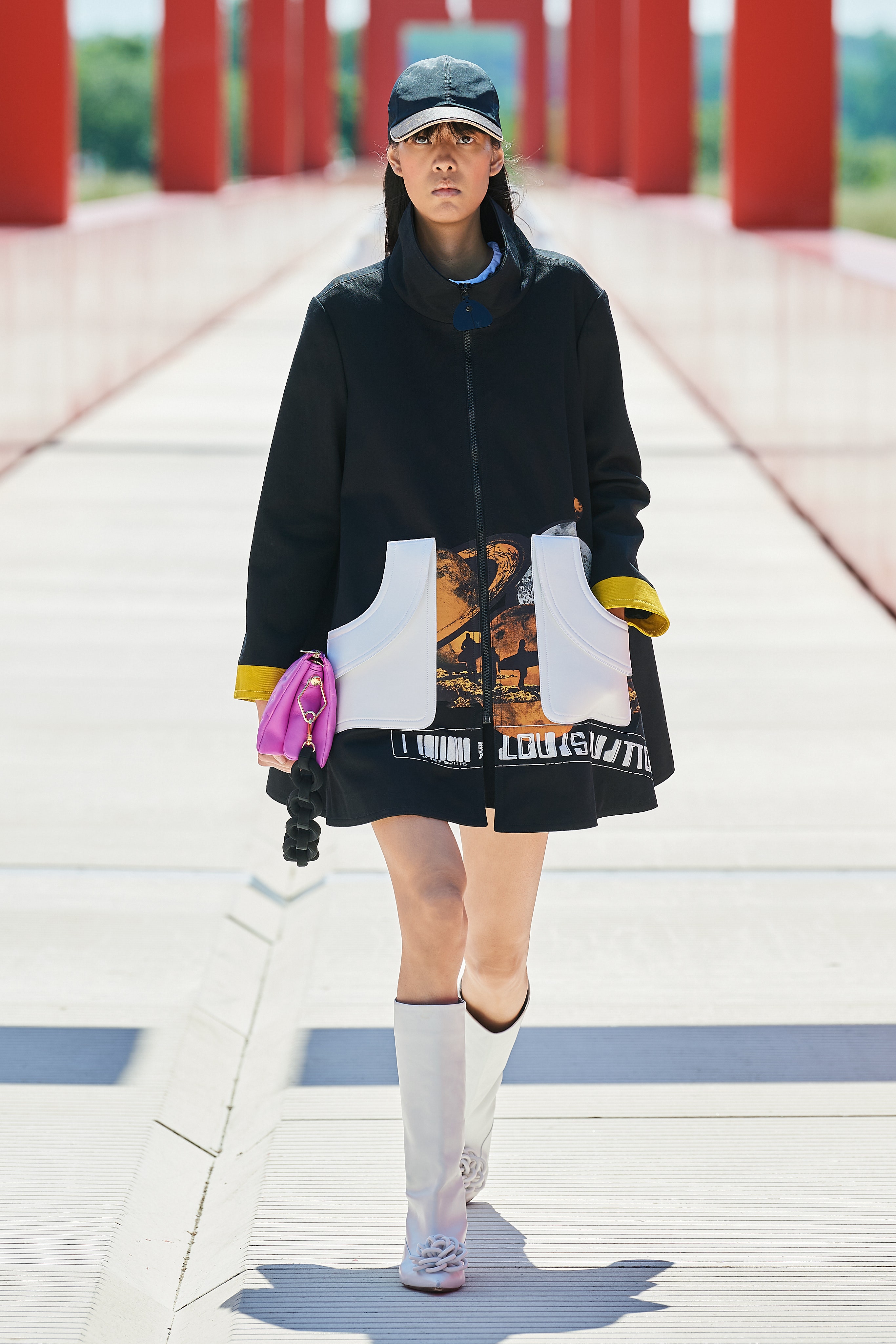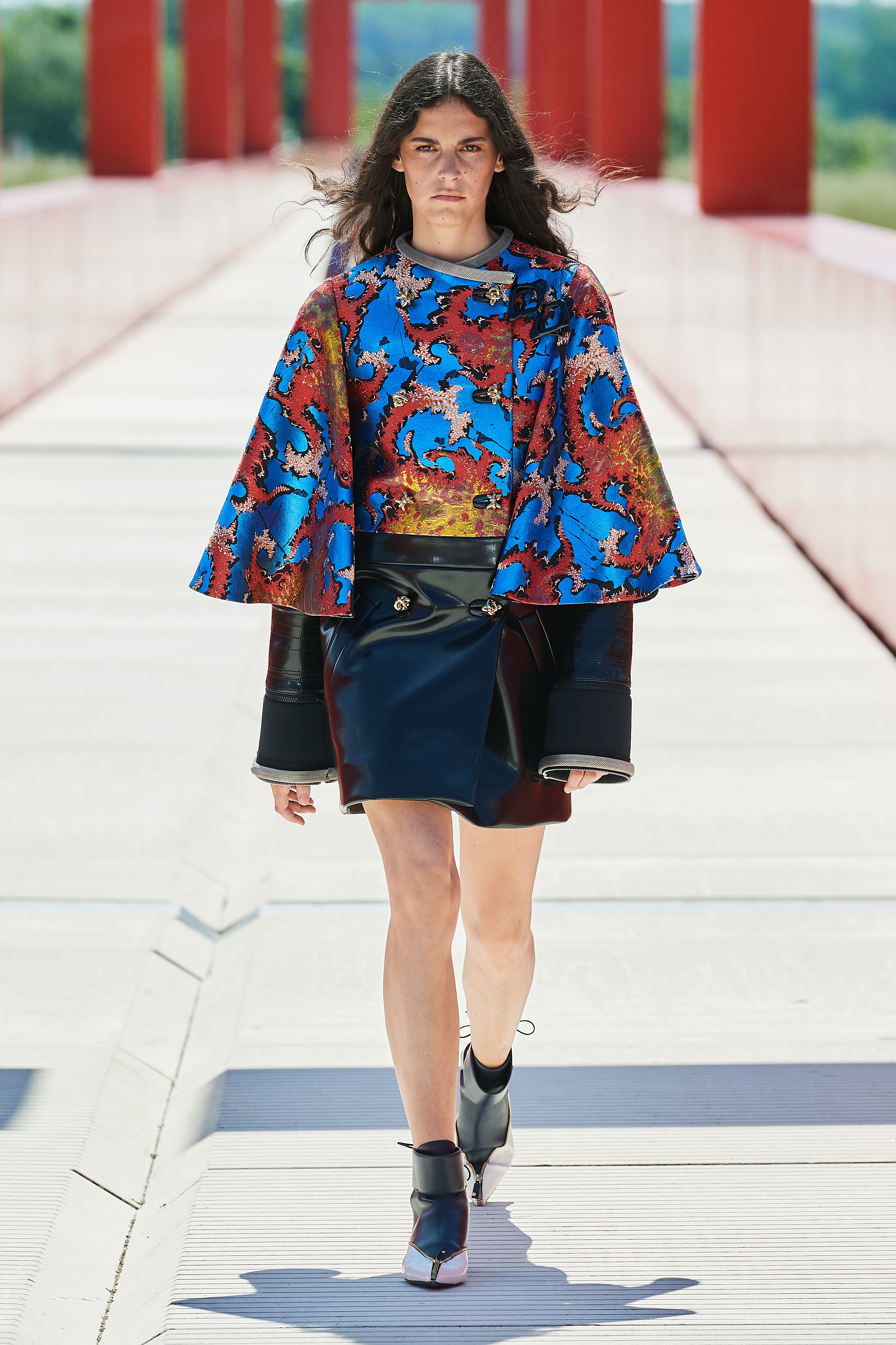 Он поместил на вещи принты, выполненные в духе винтажной плакатной живописи, на которых баскетбольные площадки, эскалаторы и придорожный мотель располагаются среди инопланетных пейзажей. Одни брюки и юбки Гескьер оснастил парашютными завязками, карабинами и складками, другие — стегаными вставками, напоминающими части скафандров. Ставшие ключевыми для дома удлиненные бомберы приобрели еще более коконообразные силуэты, а виниловые мини с геометричными деталями напомнили об экспериментальной моде Андре Куррежа в 60-е.