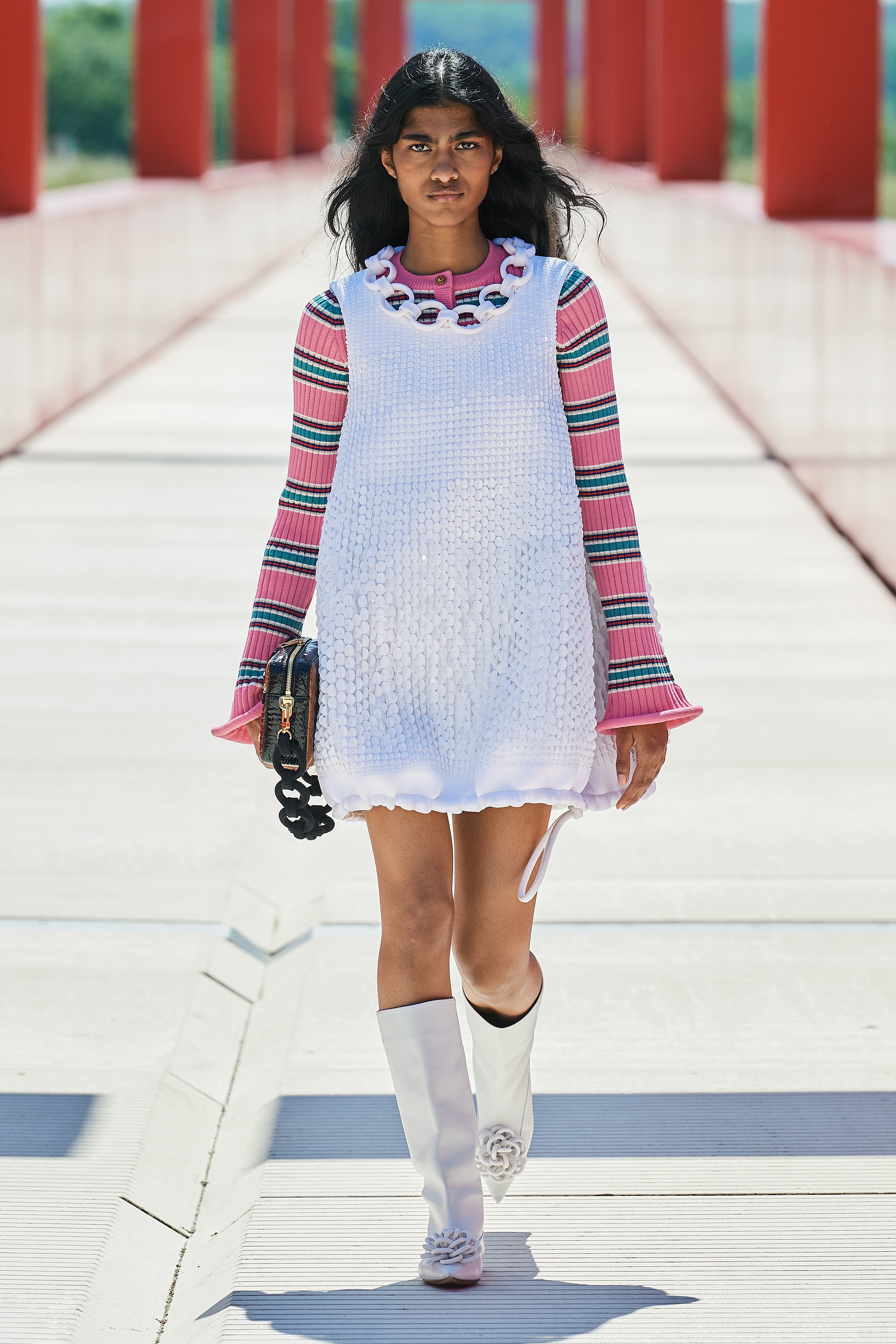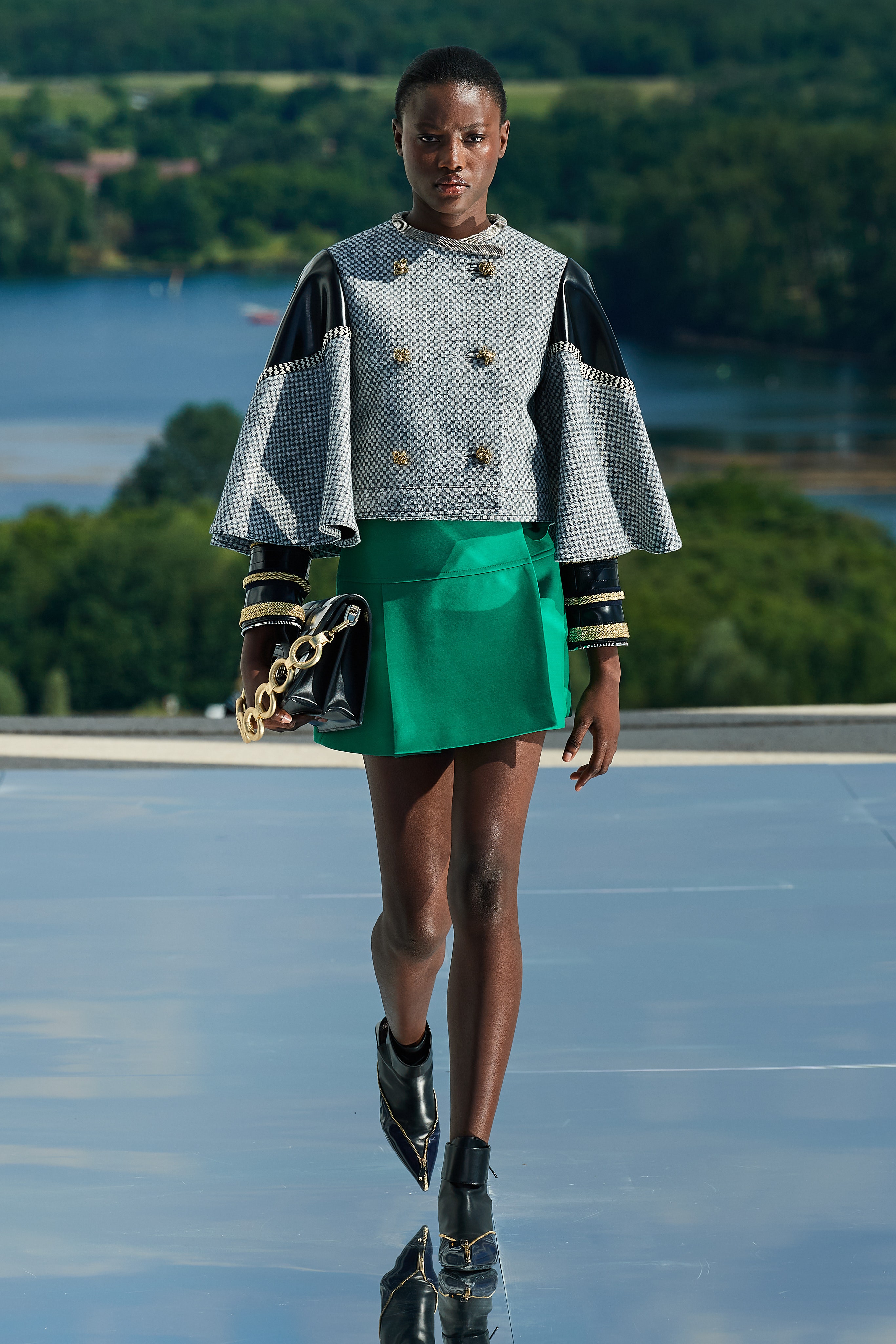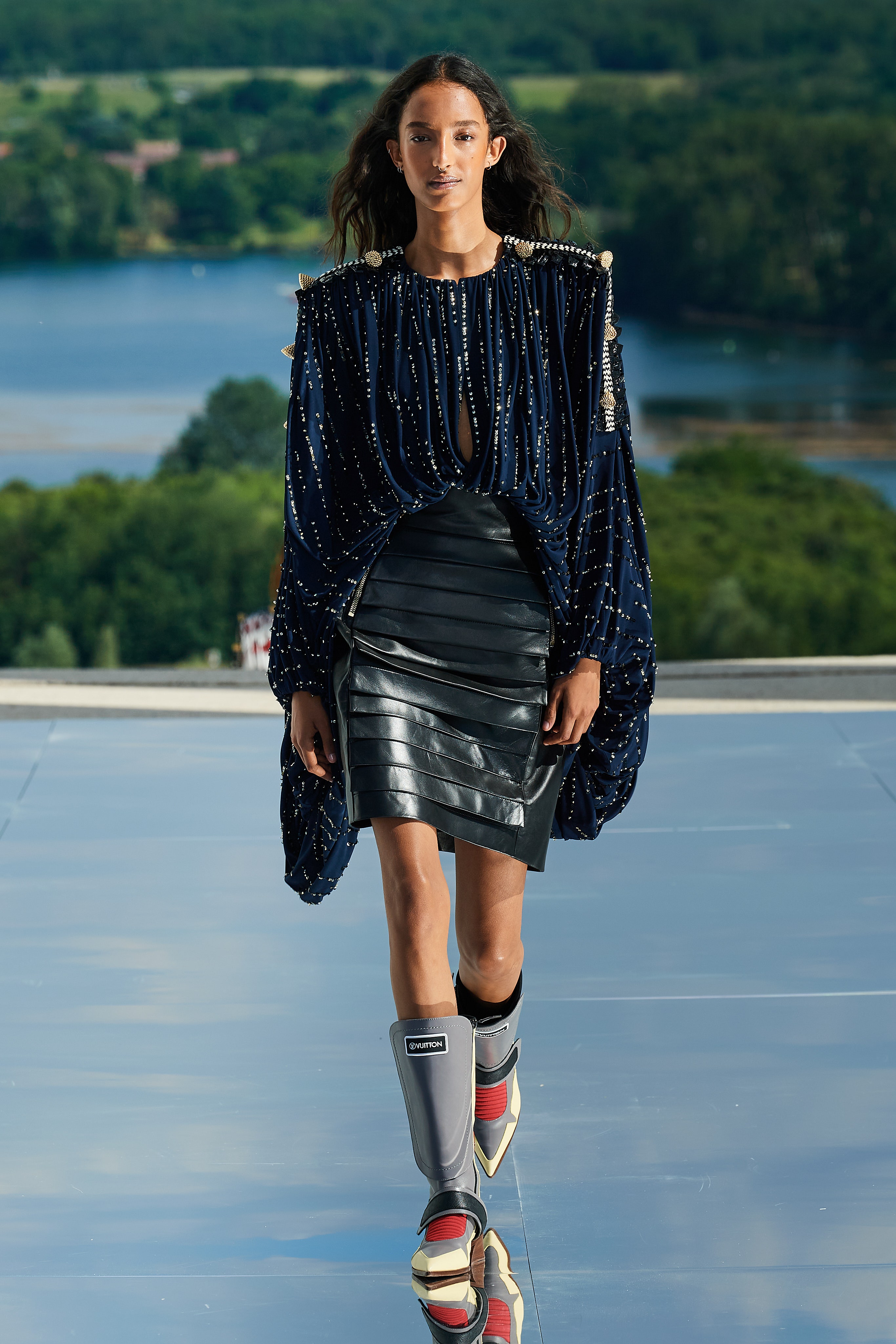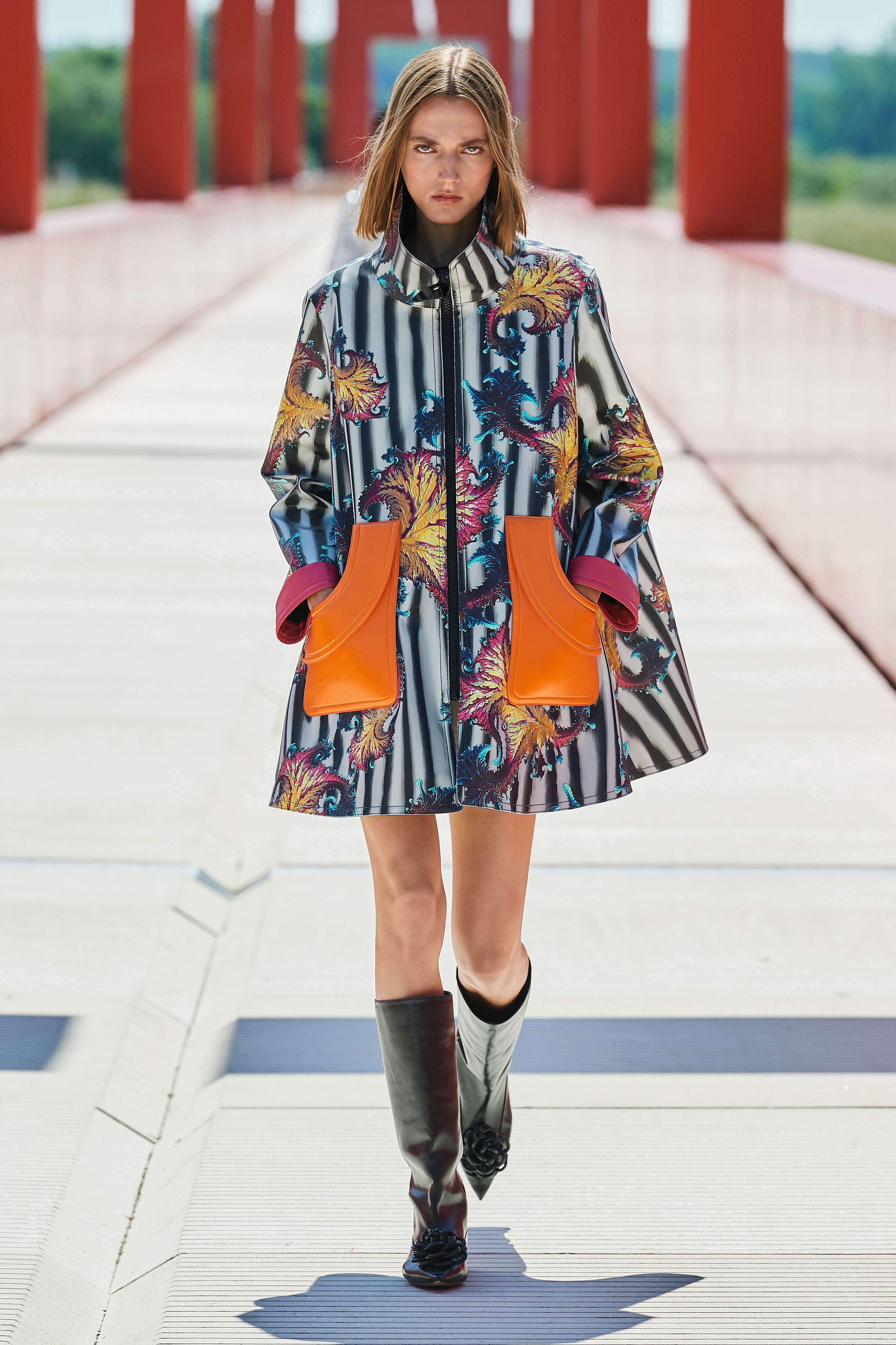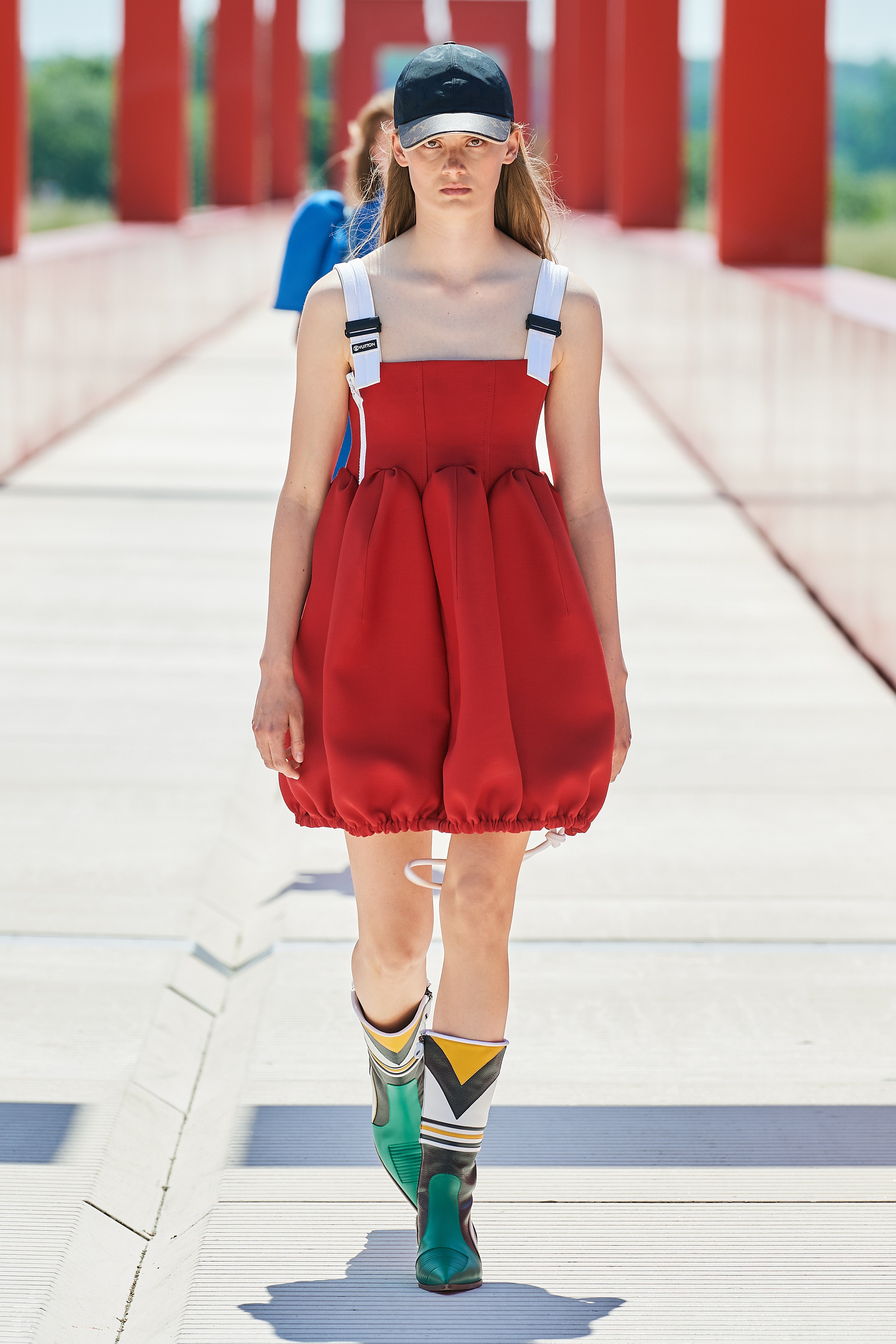 Он поместил на вещи принты, выполненные в духе винтажной плакатной живописи, на которых баскетбольные площадки, эскалаторы и придорожный мотель располагаются среди инопланетных пейзажей. Одни брюки и юбки Гескьер оснастил парашютными завязками, карабинами и складками, другие — стегаными вставками, напоминающими части скафандров. Ставшие ключевыми для дома удлиненные бомберы приобрели еще более коконообразные силуэты, а виниловые мини с геометричными деталями напомнили об экспериментальной моде Андре Куррежа в 60-е.