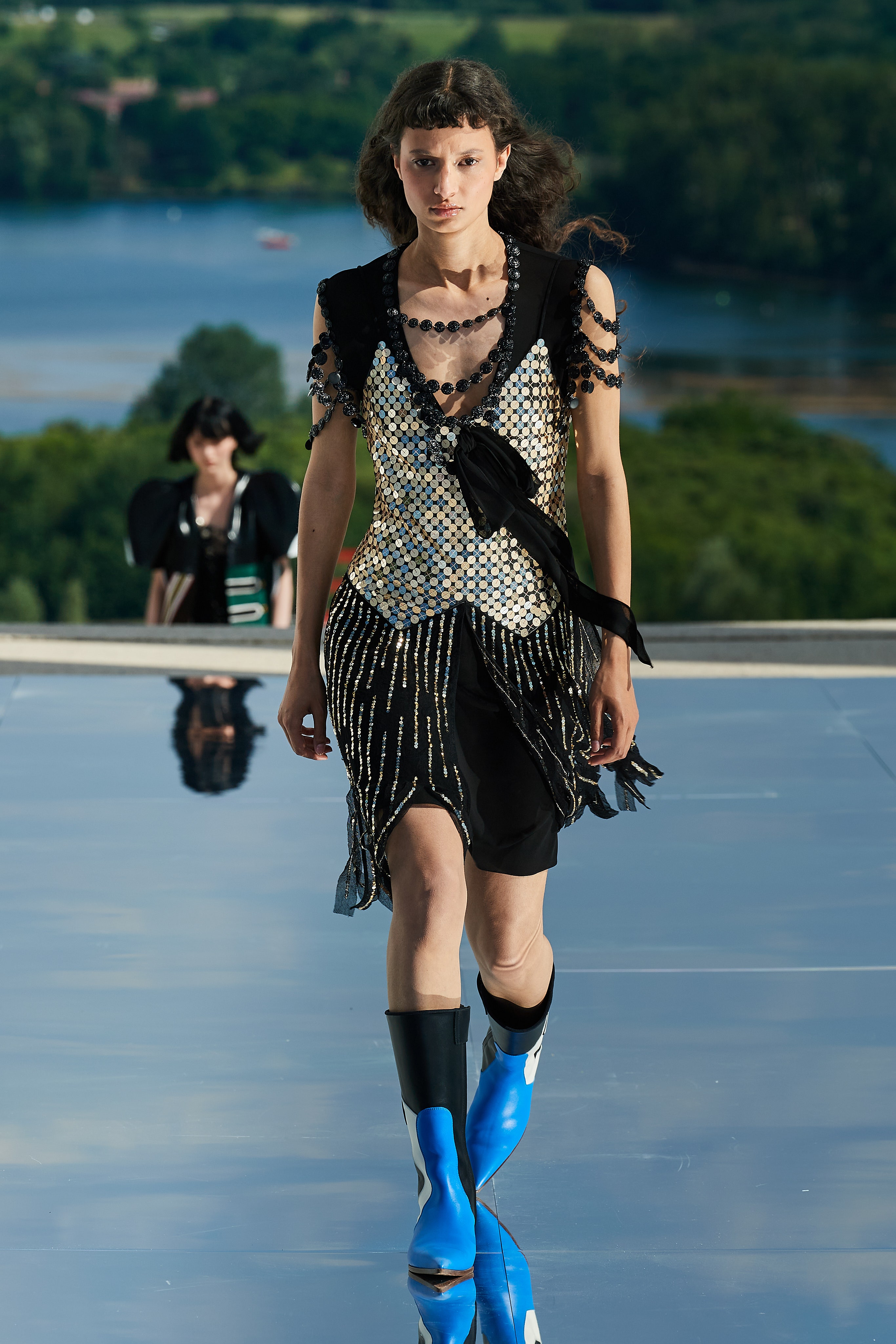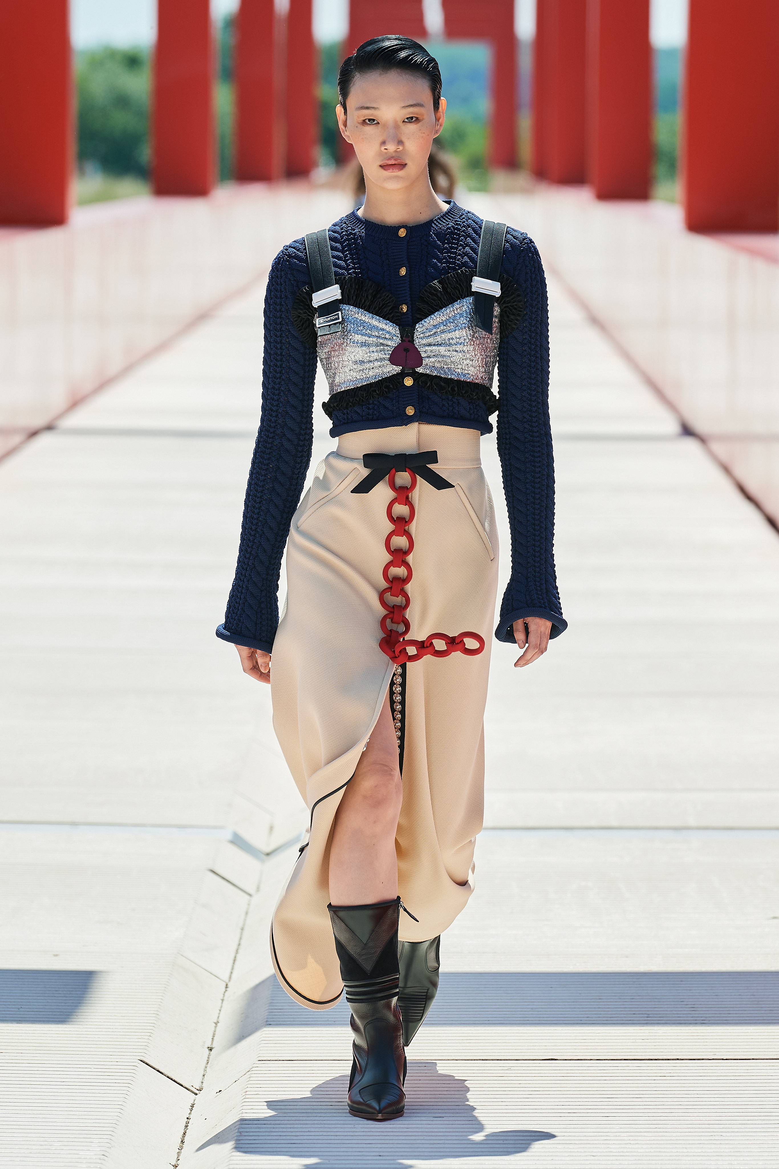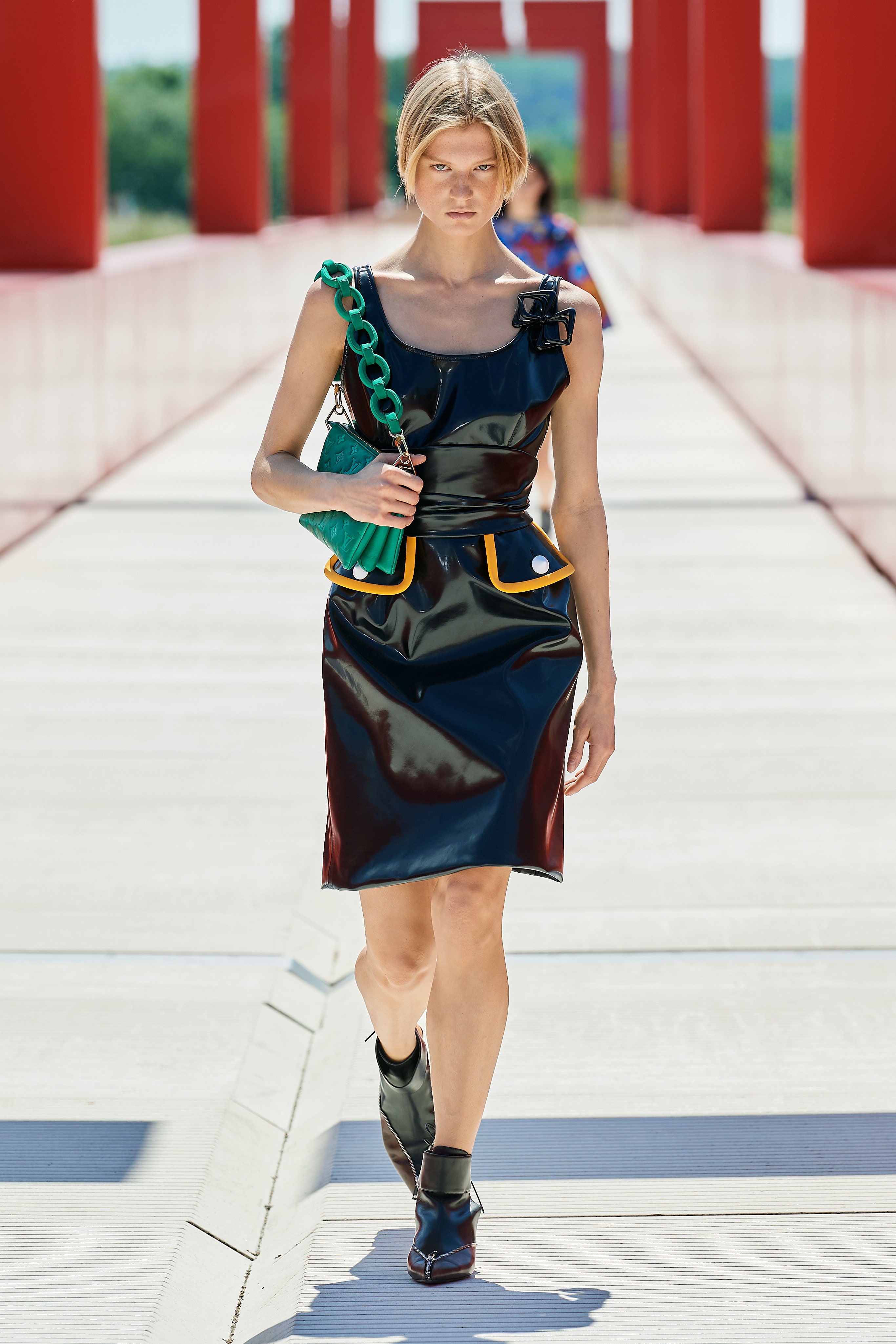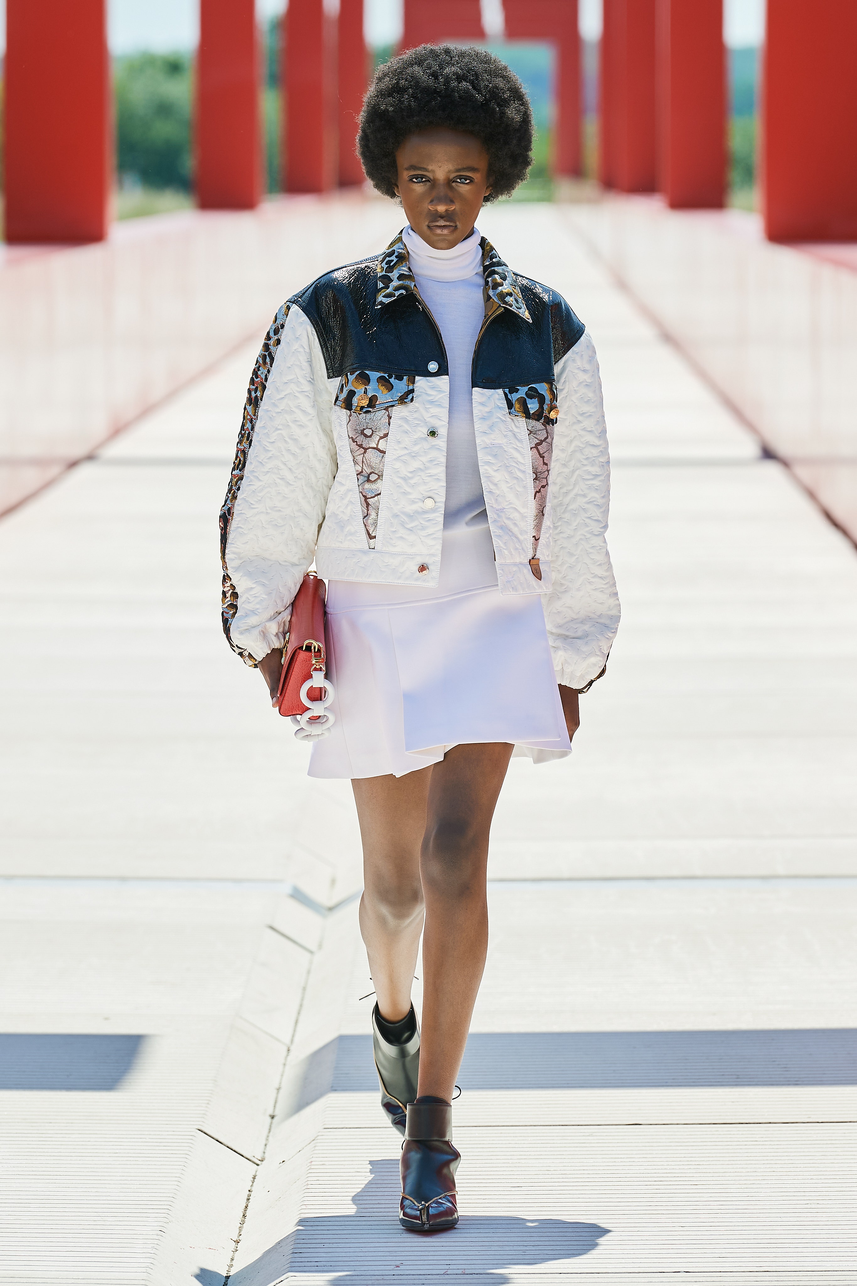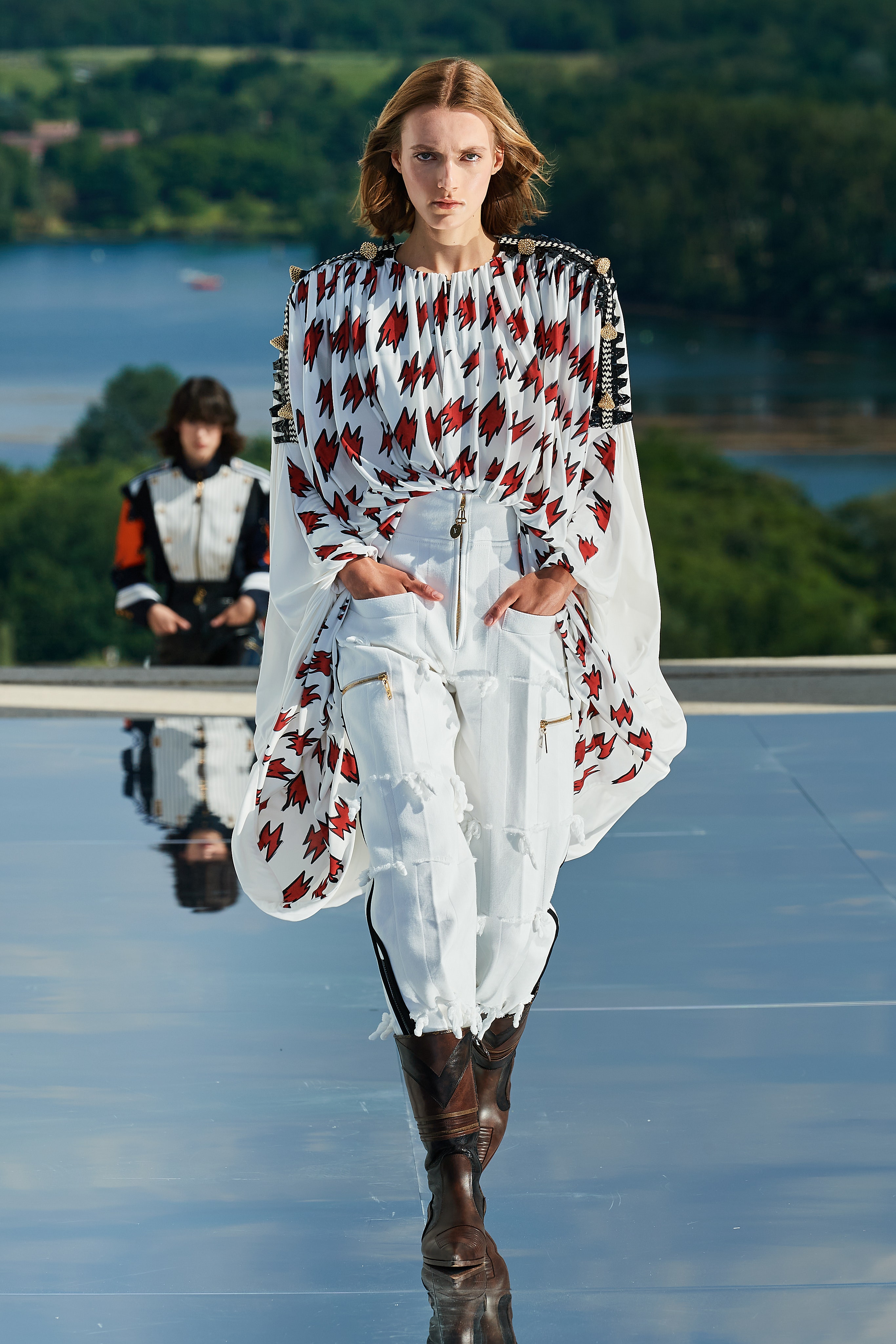 Он поместил на вещи принты, выполненные в духе винтажной плакатной живописи, на которых баскетбольные площадки, эскалаторы и придорожный мотель располагаются среди инопланетных пейзажей. Одни брюки и юбки Гескьер оснастил парашютными завязками, карабинами и складками, другие — стегаными вставками, напоминающими части скафандров. Ставшие ключевыми для дома удлиненные бомберы приобрели еще более коконообразные силуэты, а виниловые мини с геометричными деталями напомнили об экспериментальной моде Андре Куррежа в 60-е.