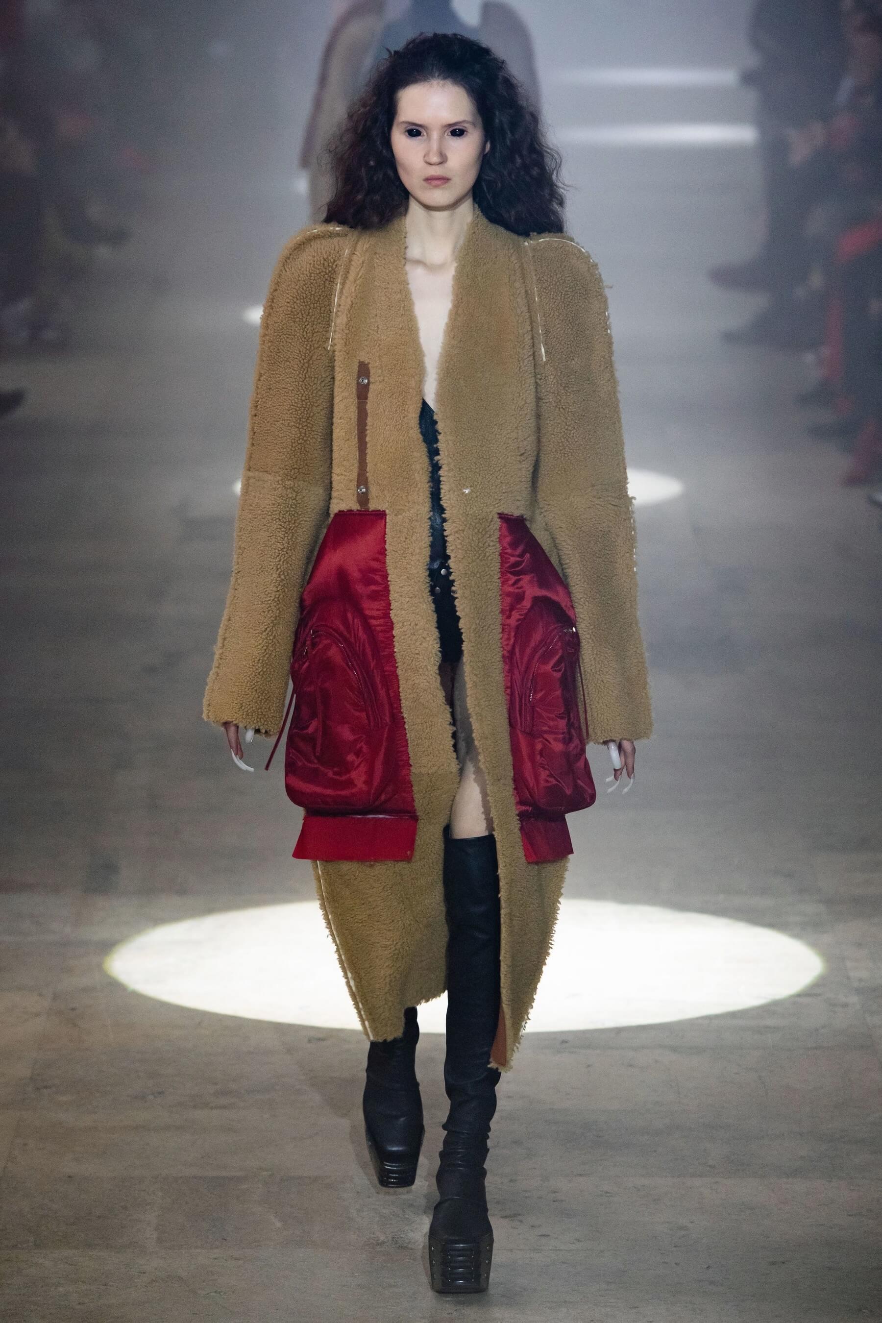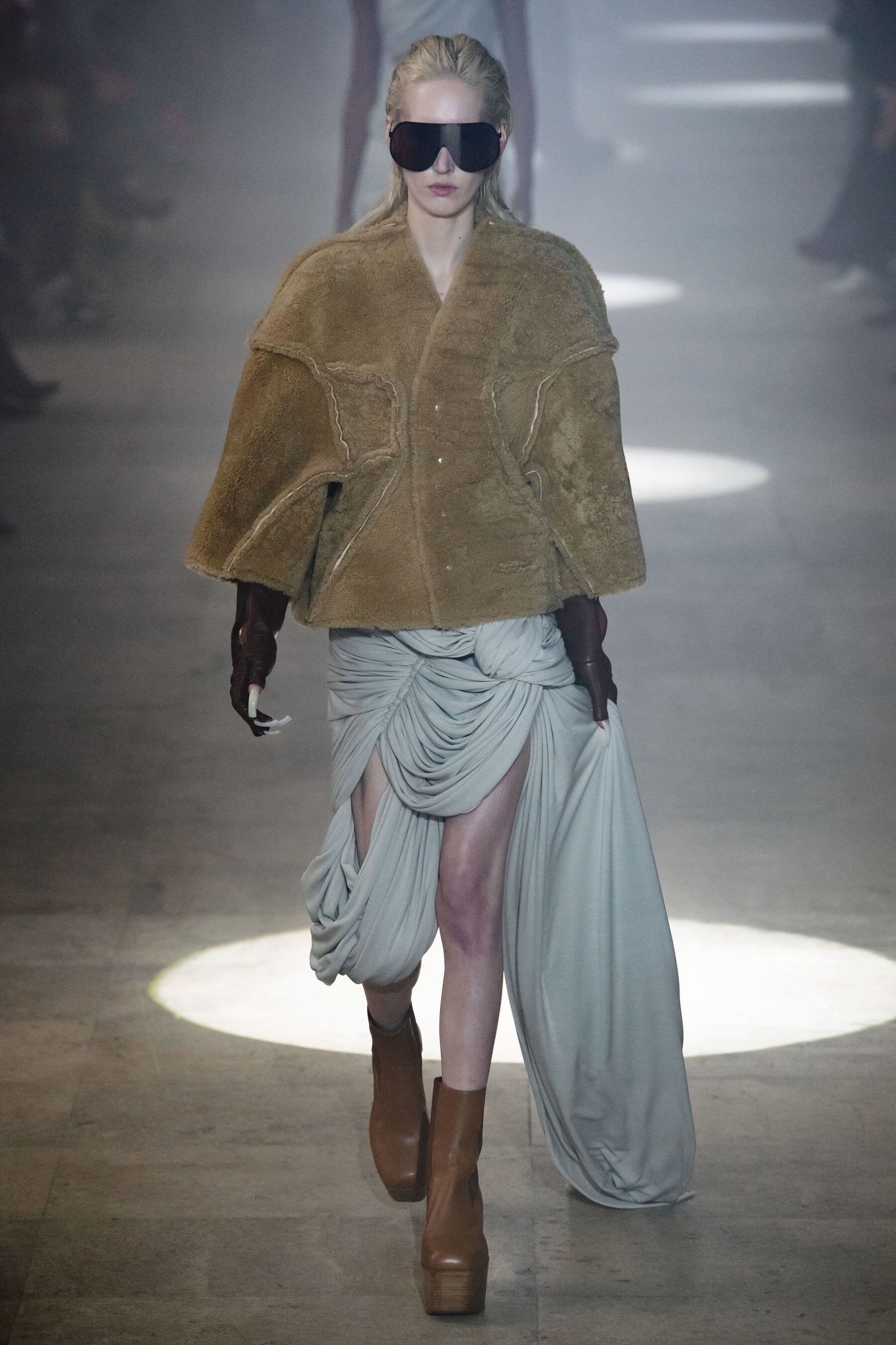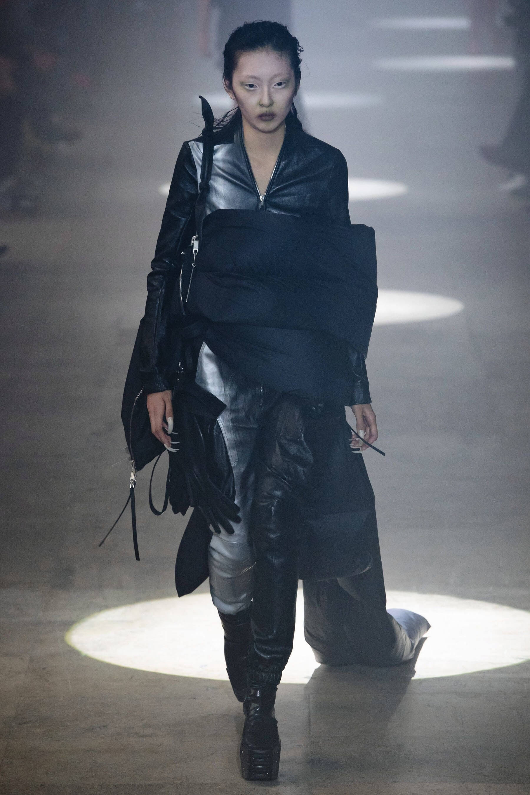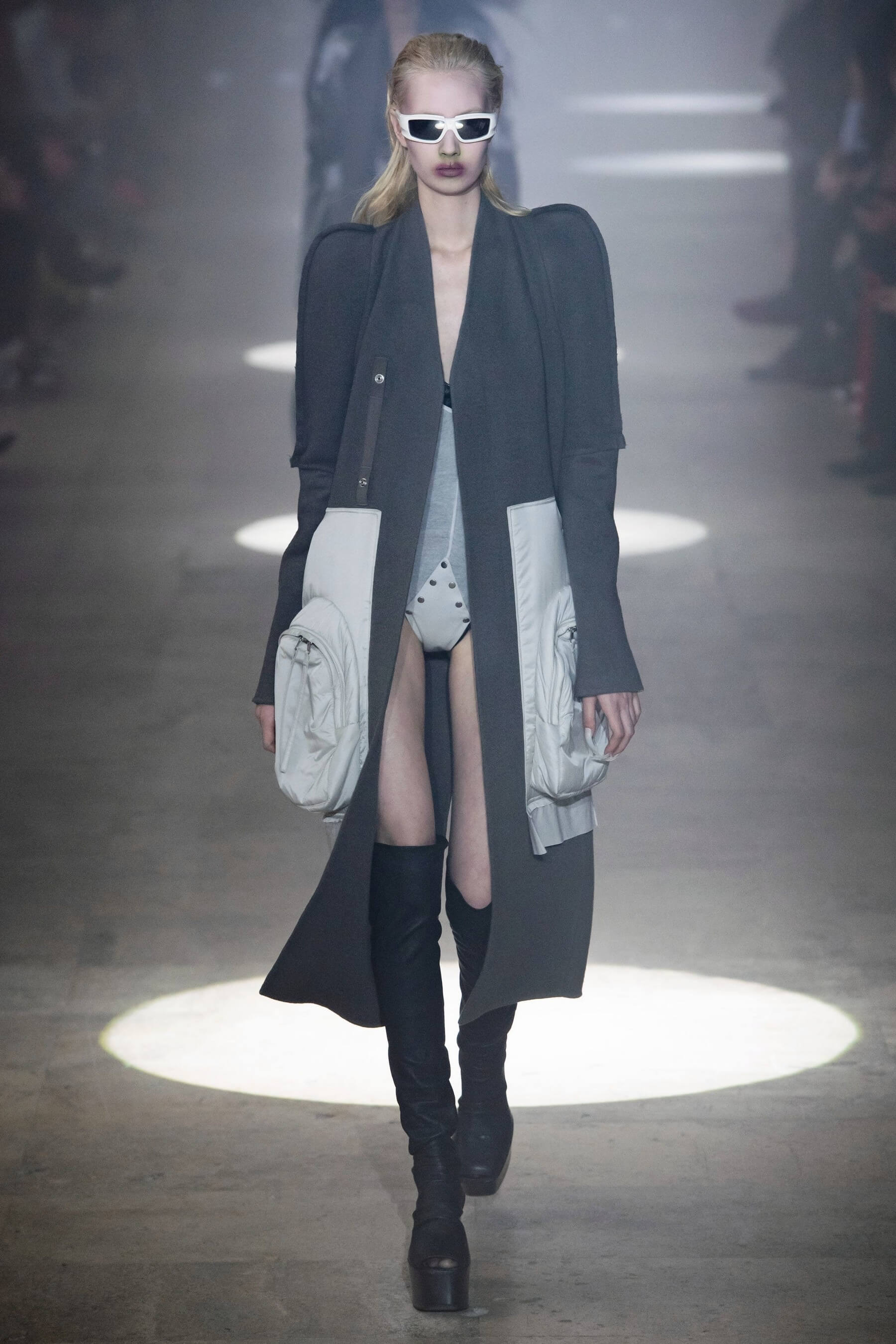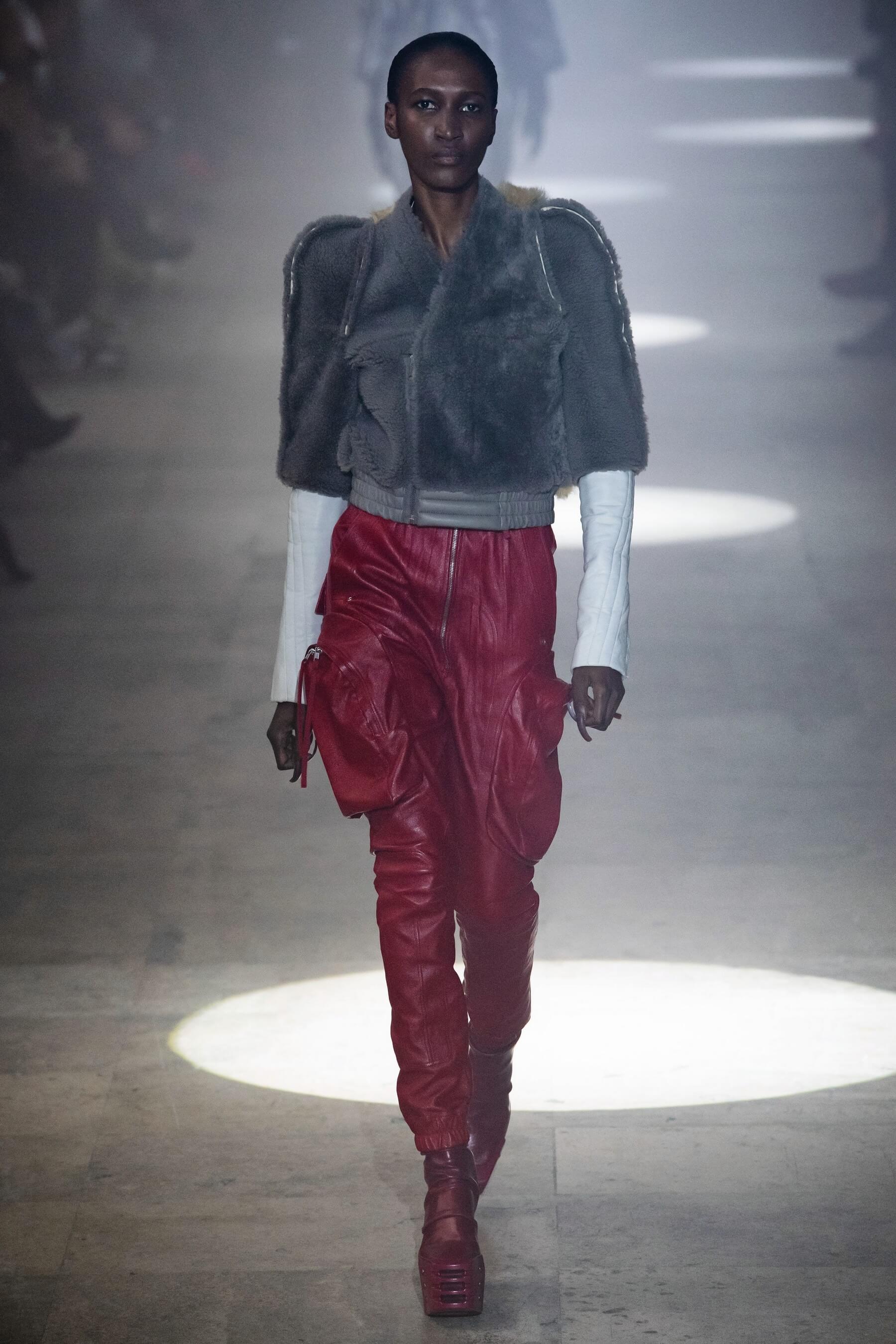 Король гротеска Рик Оуэнс показал новую коллекцию, в которую вошли лаконичные бомберы, пальто и брюки с накладными карманами, кожаные комбинезоны, драпированные платья и шубы с большими плечами.