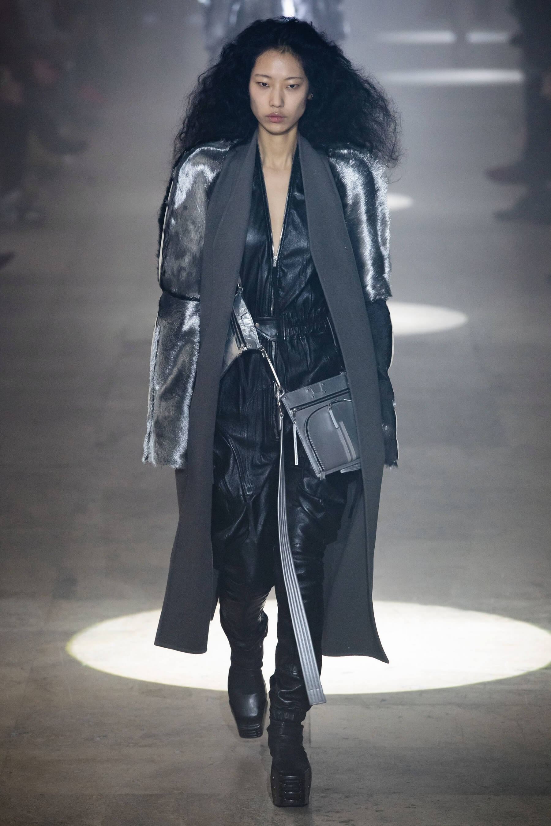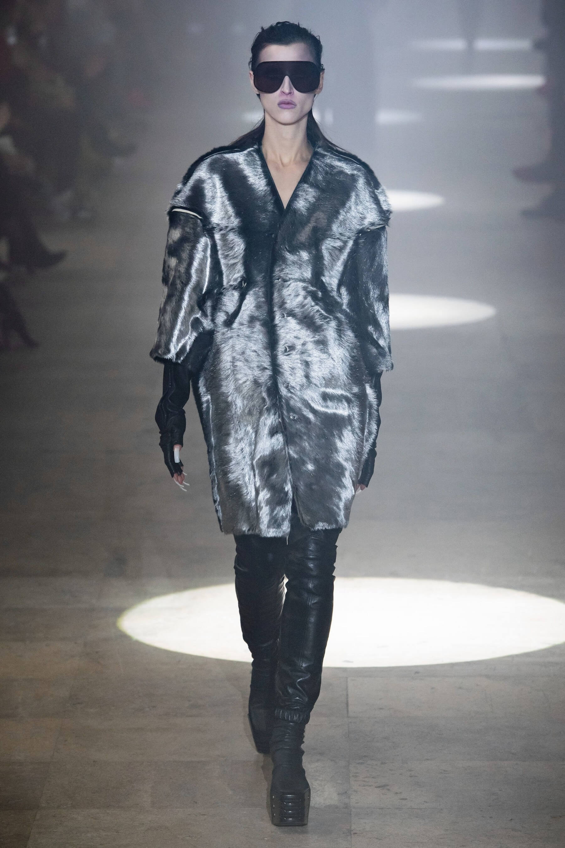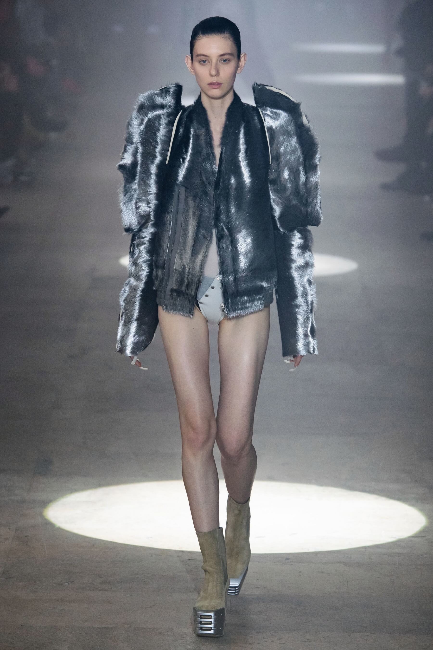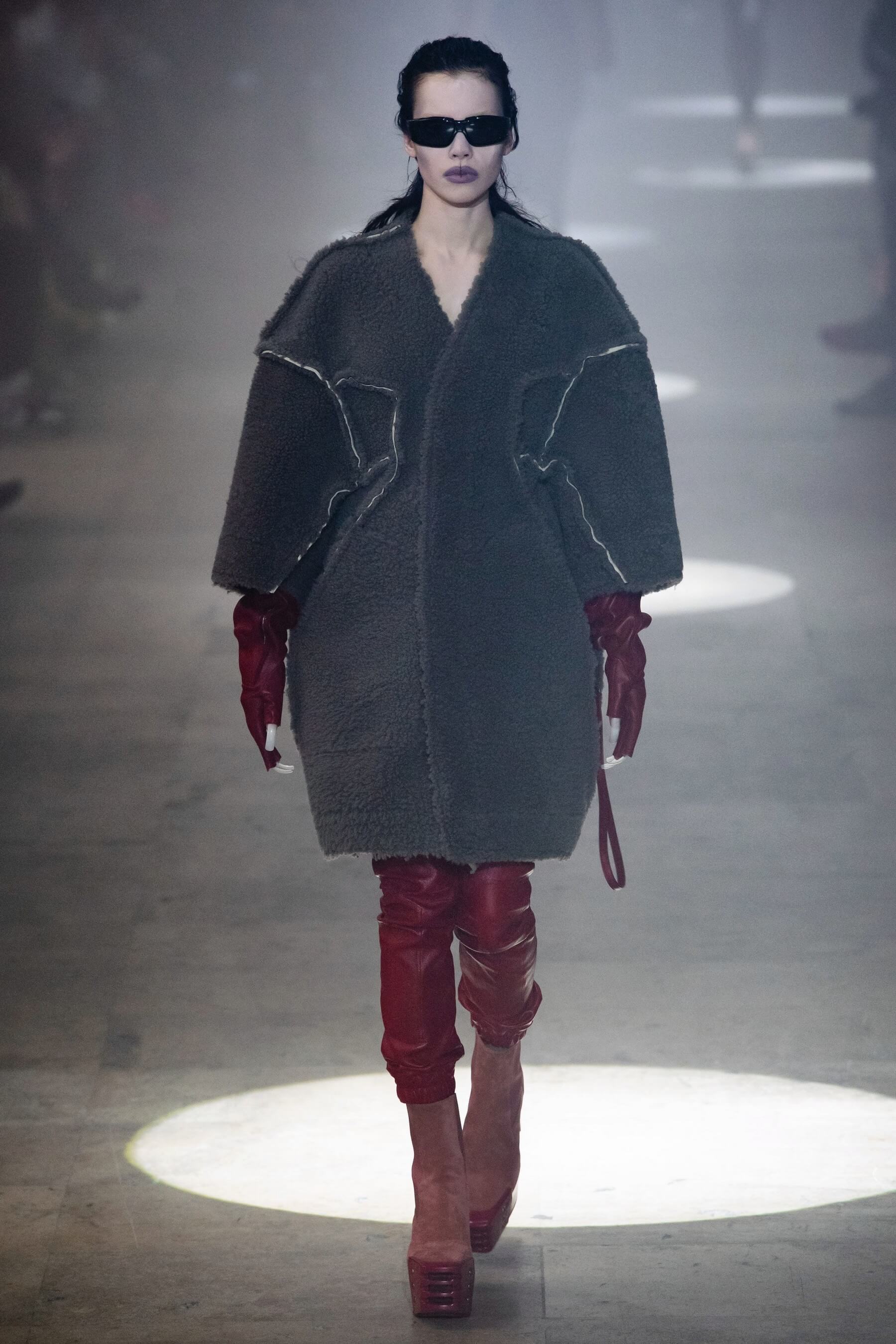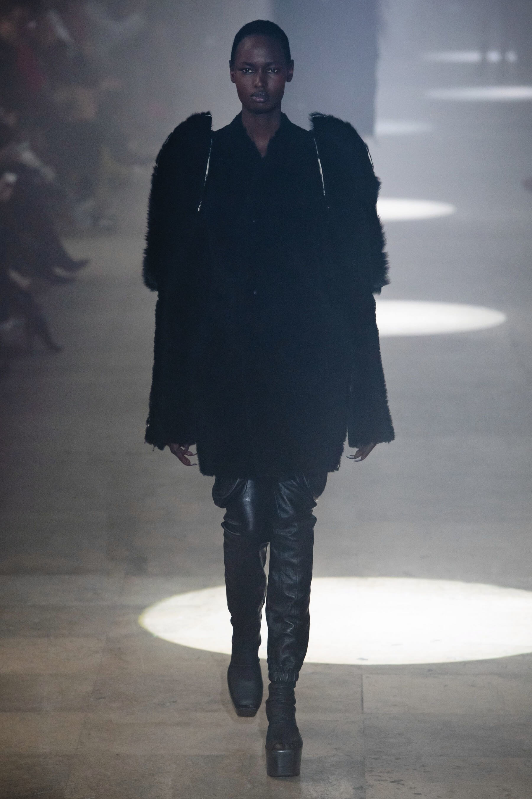 Король гротеска Рик Оуэнс показал новую коллекцию, в которую вошли лаконичные бомберы, пальто и брюки с накладными карманами, кожаные комбинезоны, драпированные платья и шубы с большими плечами.