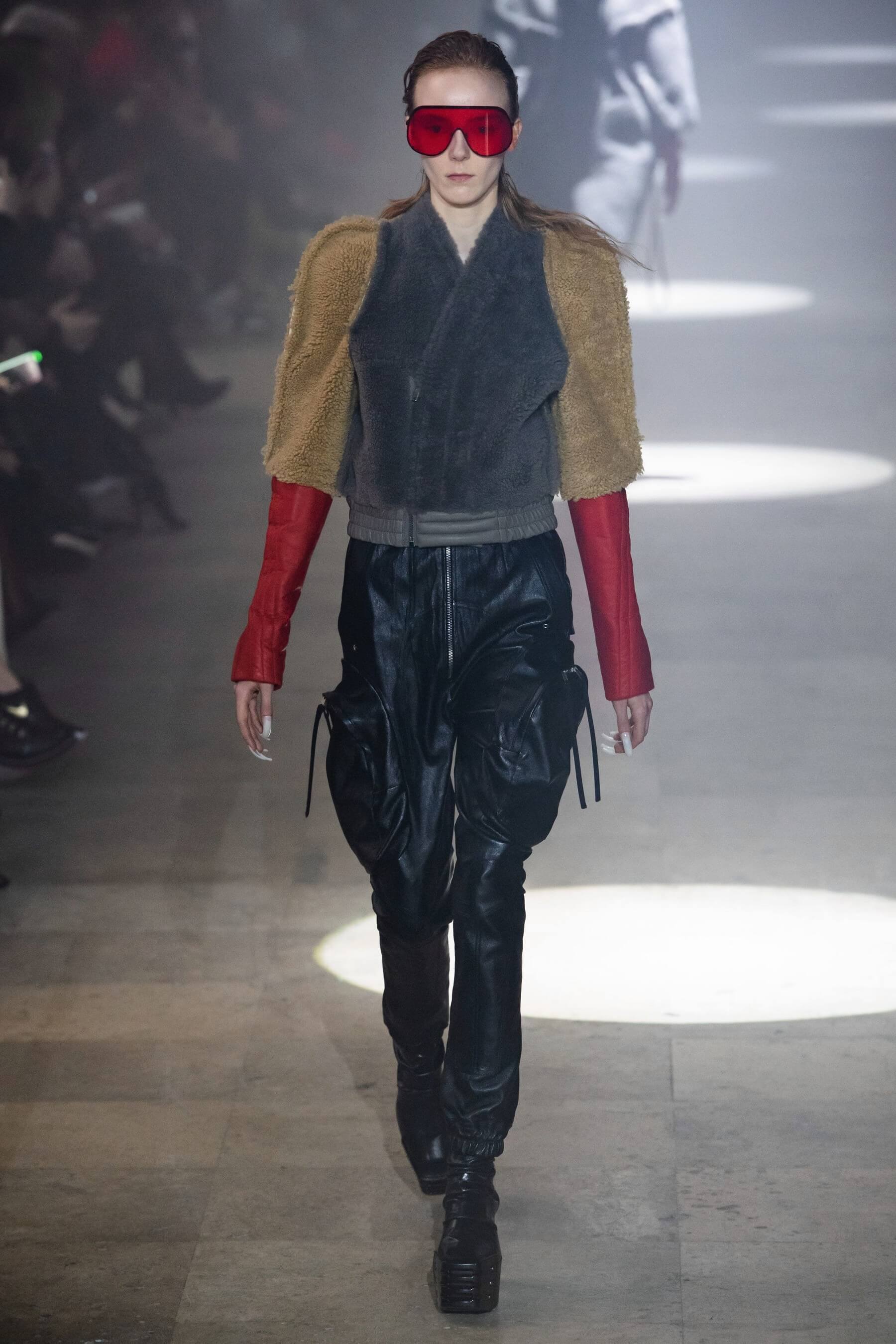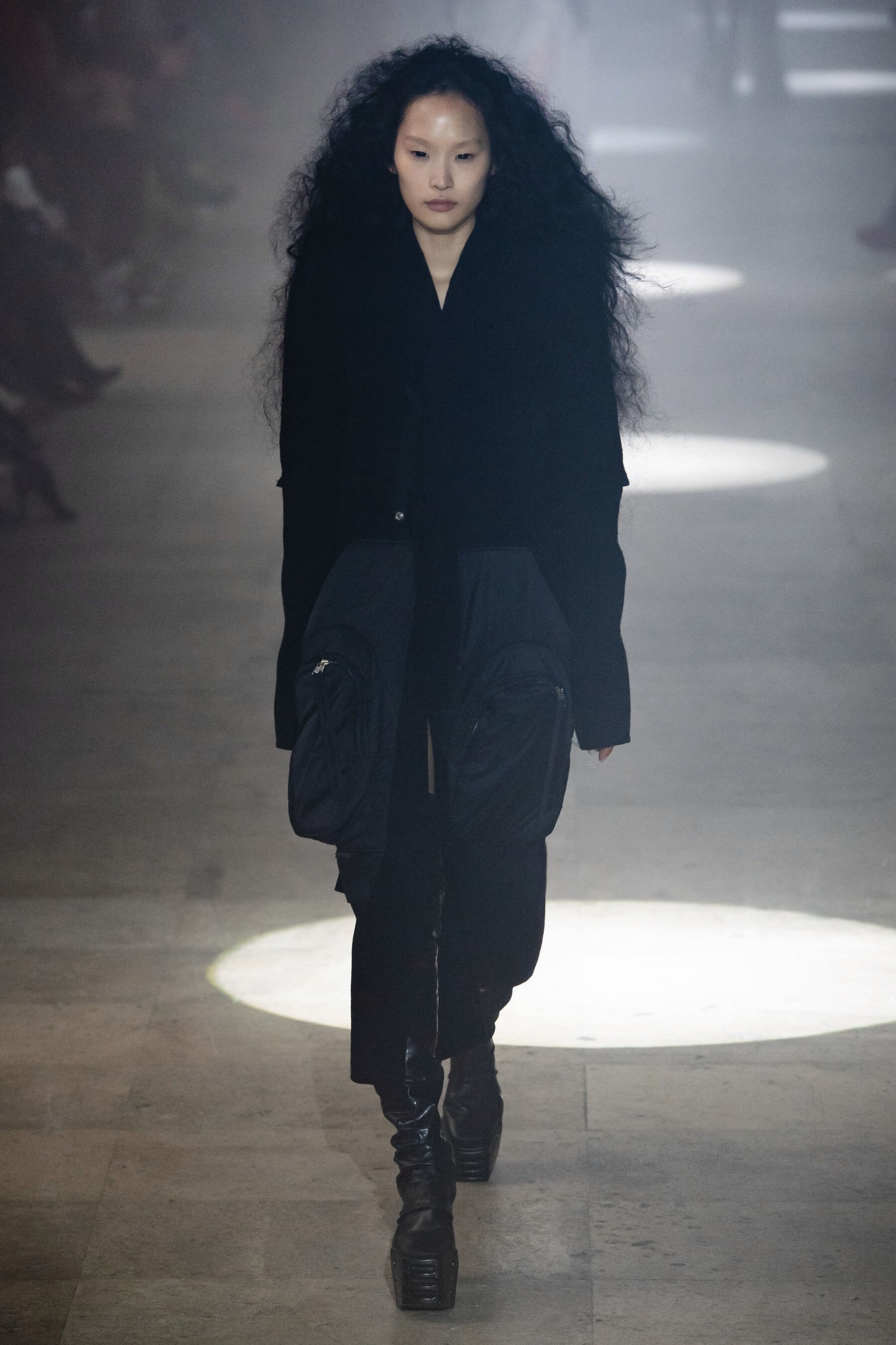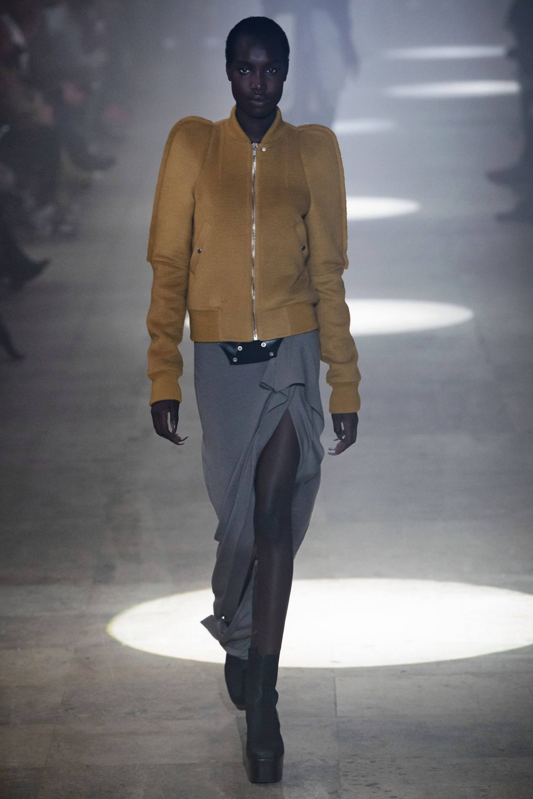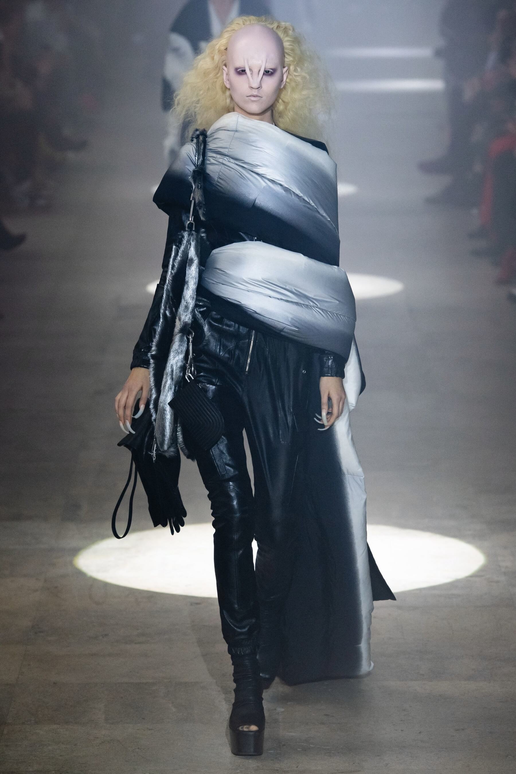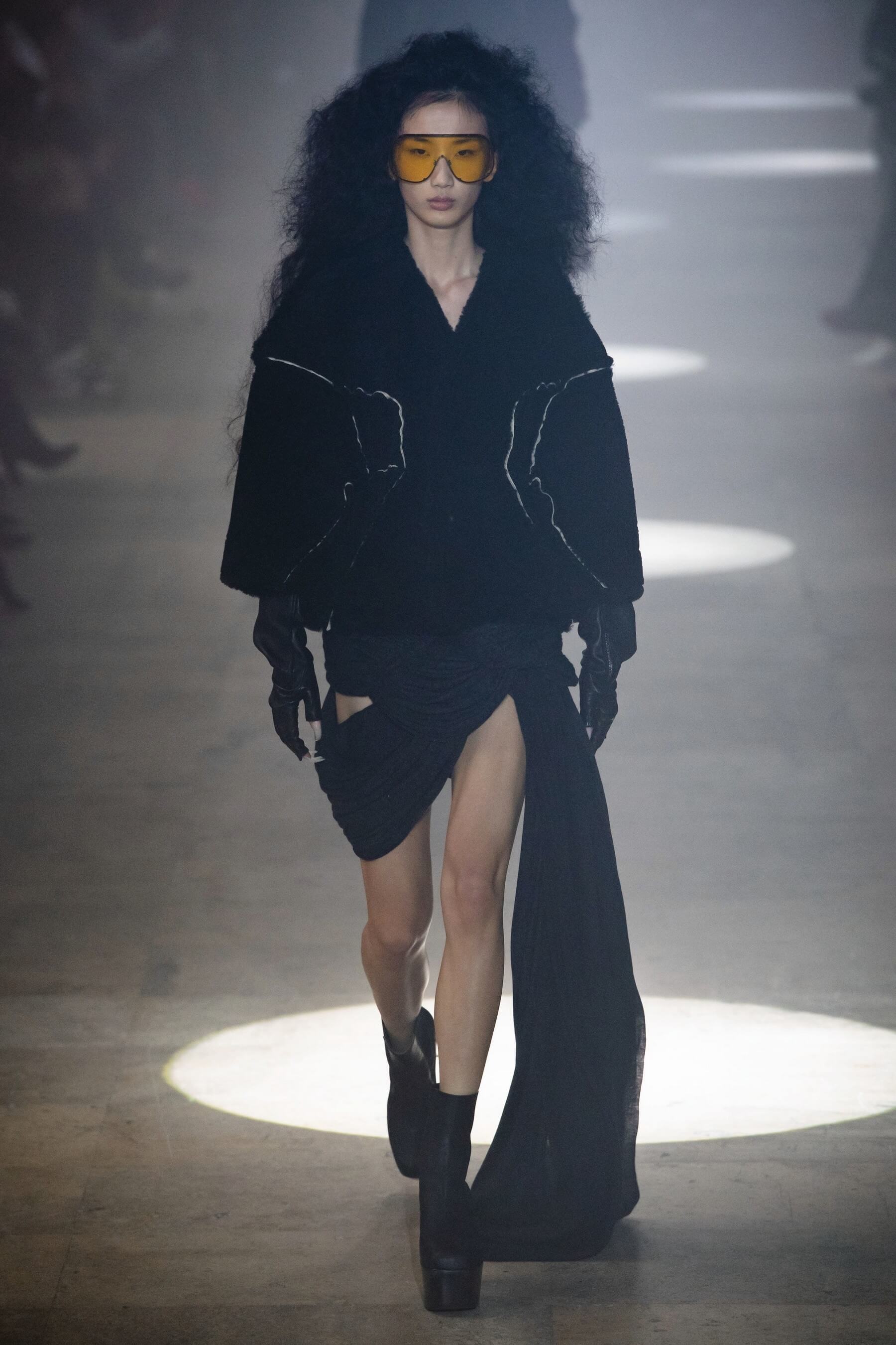 Король гротеска Рик Оуэнс показал новую коллекцию, в которую вошли лаконичные бомберы, пальто и брюки с накладными карманами, кожаные комбинезоны, драпированные платья и шубы с большими плечами.