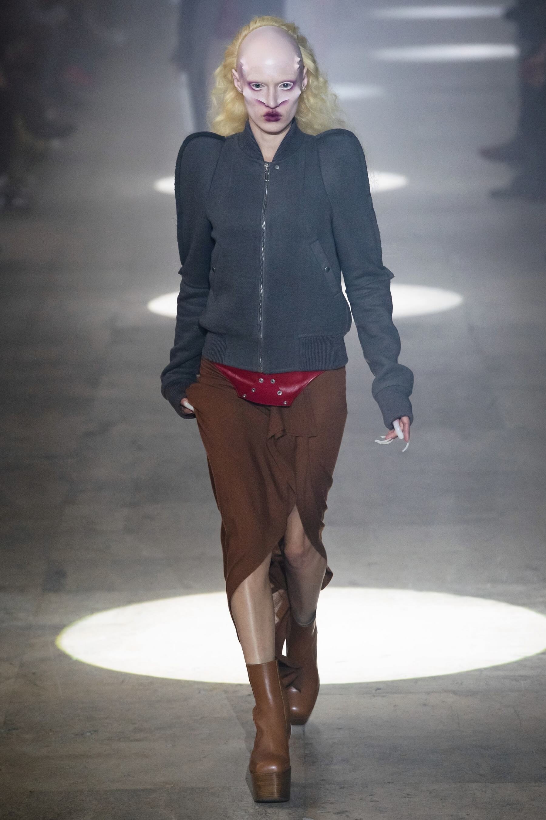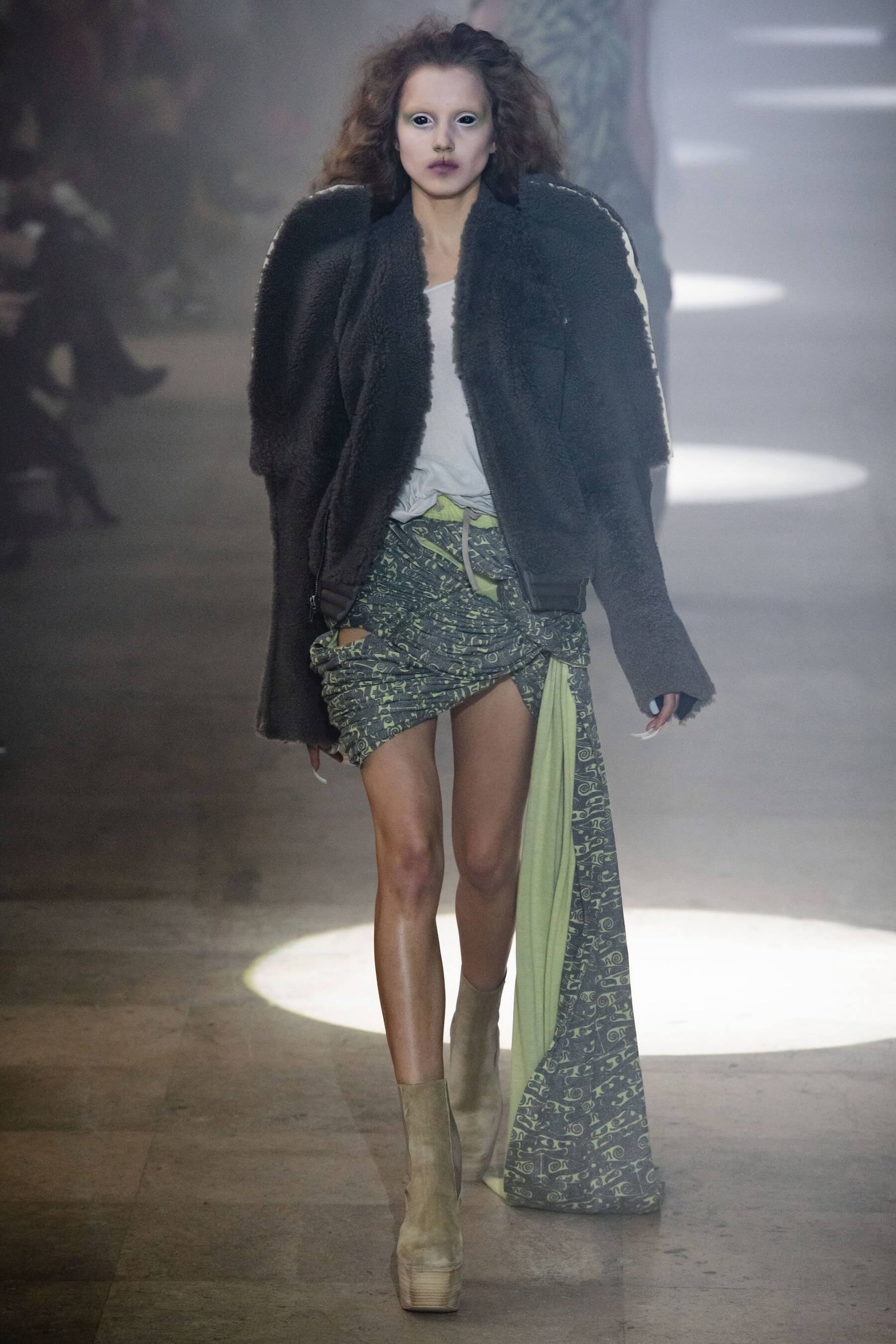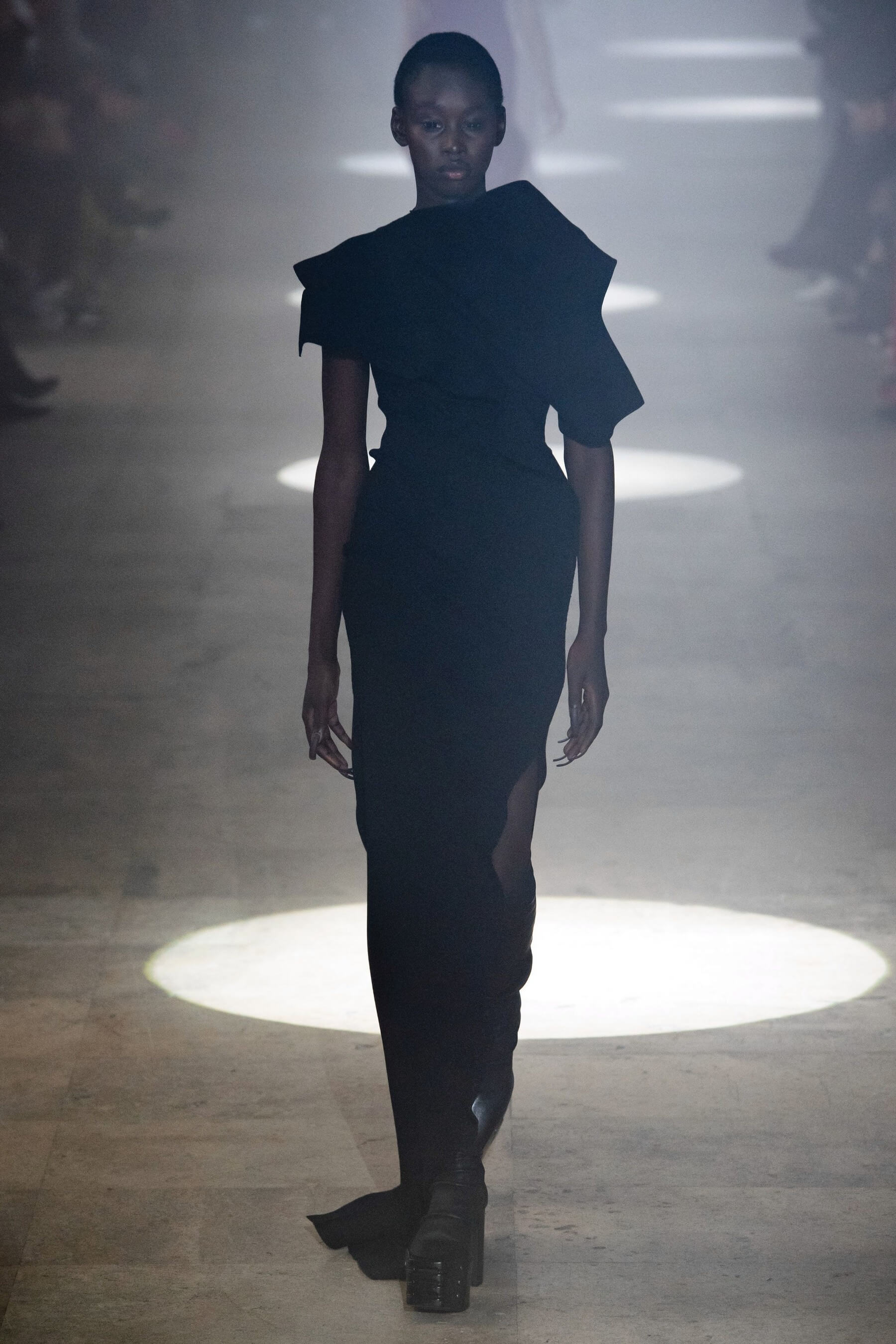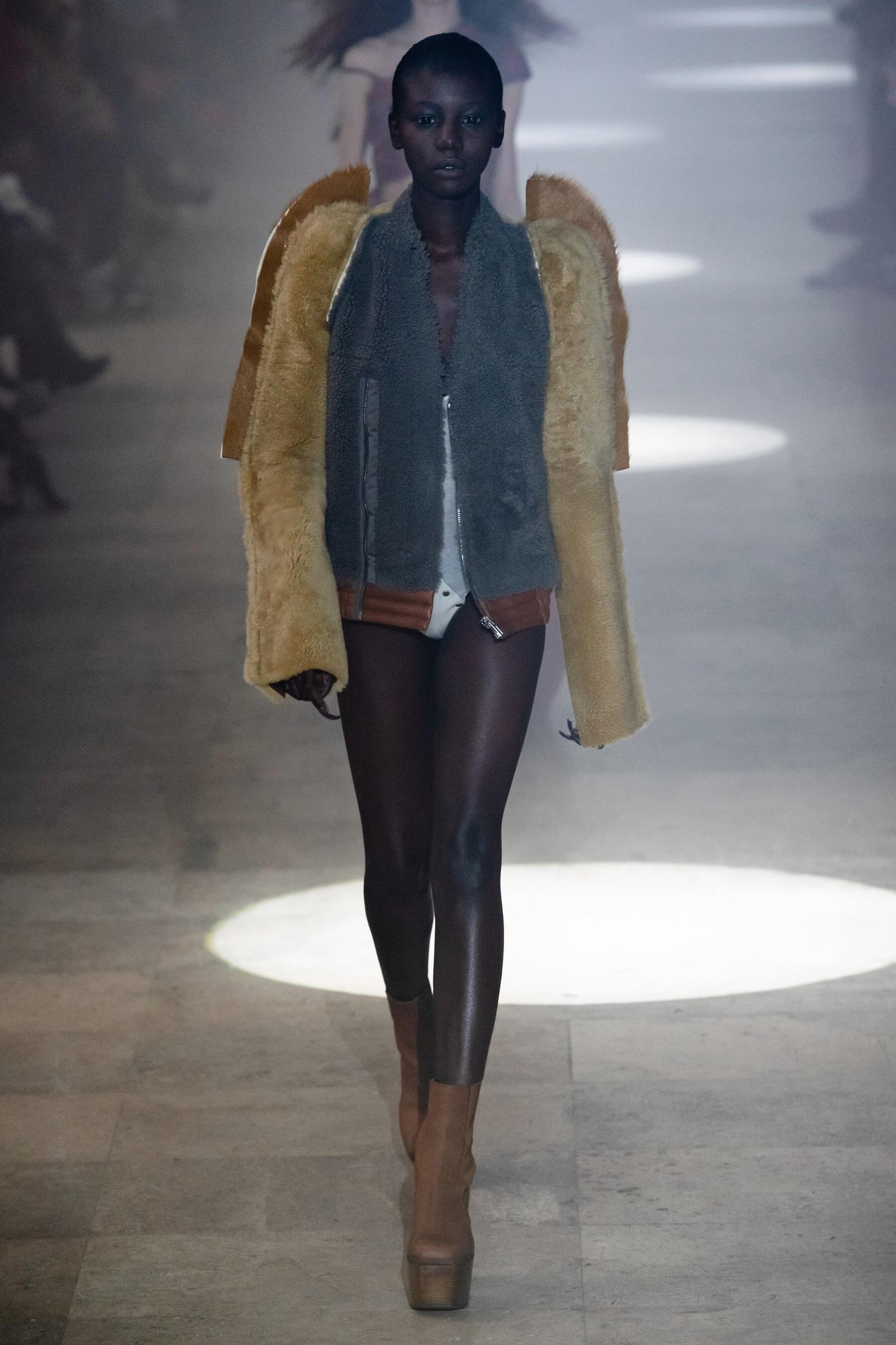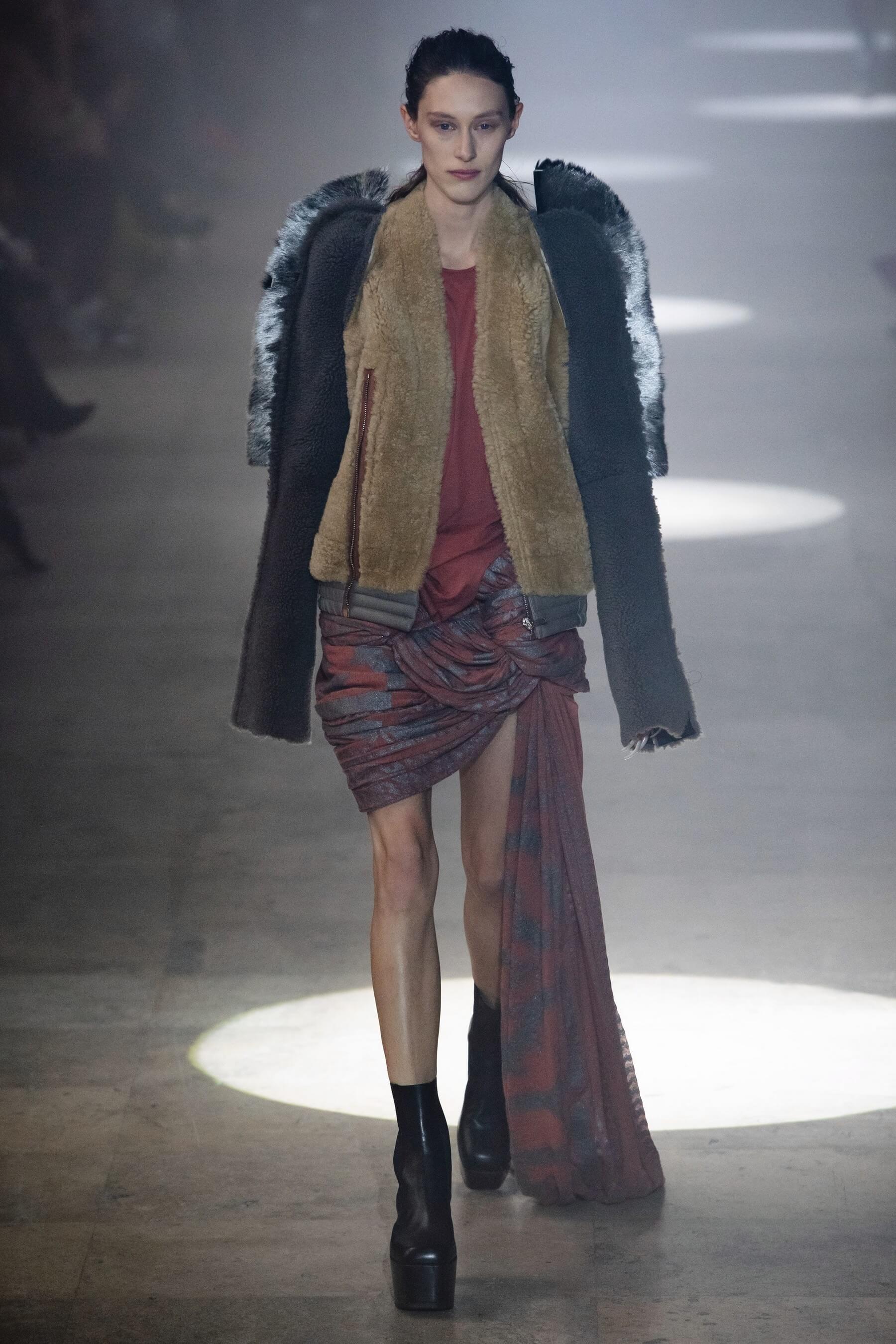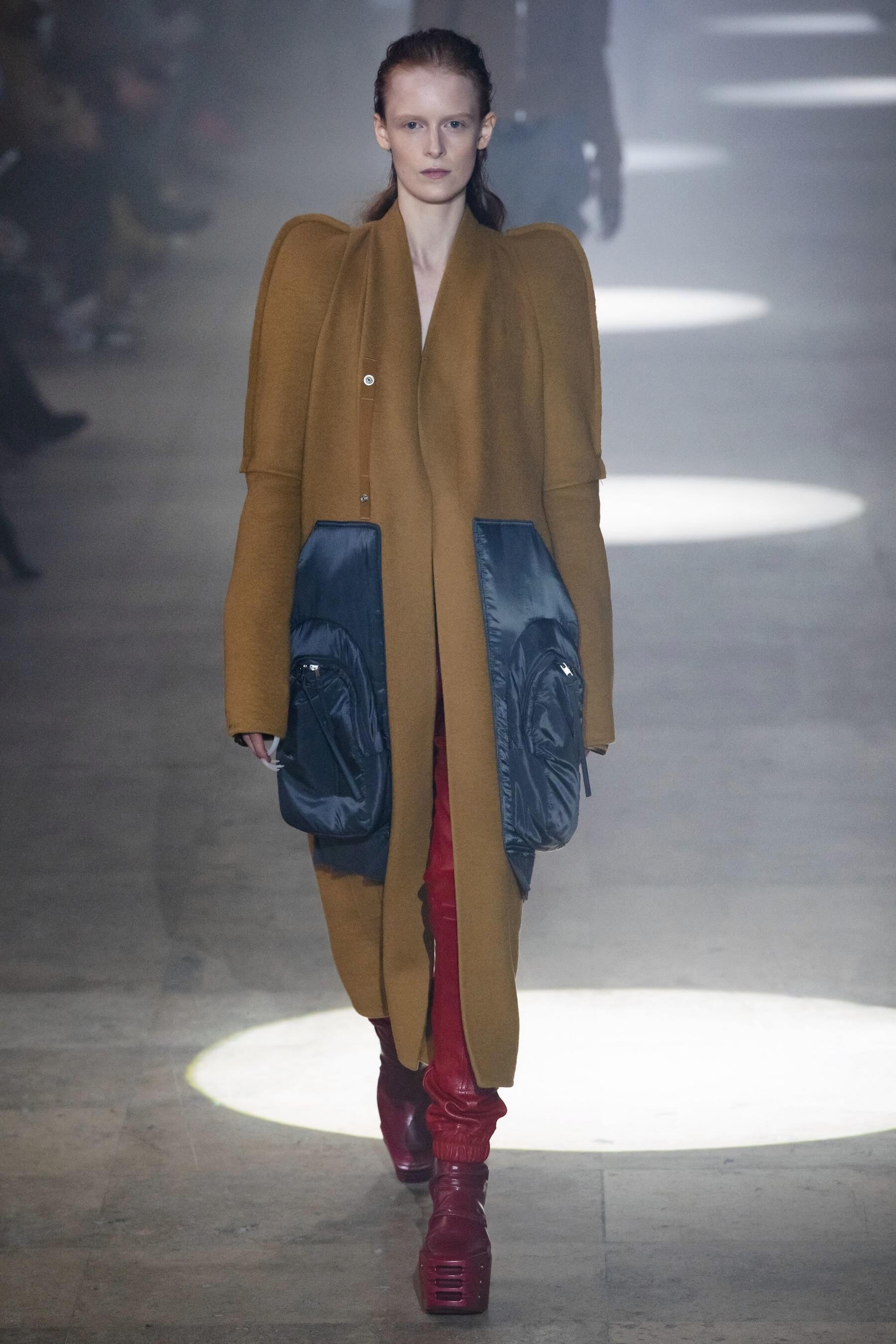 Король гротеска Рик Оуэнс показал новую коллекцию, в которую вошли лаконичные бомберы, пальто и брюки с накладными карманами, кожаные комбинезоны, драпированные платья и шубы с большими плечами.