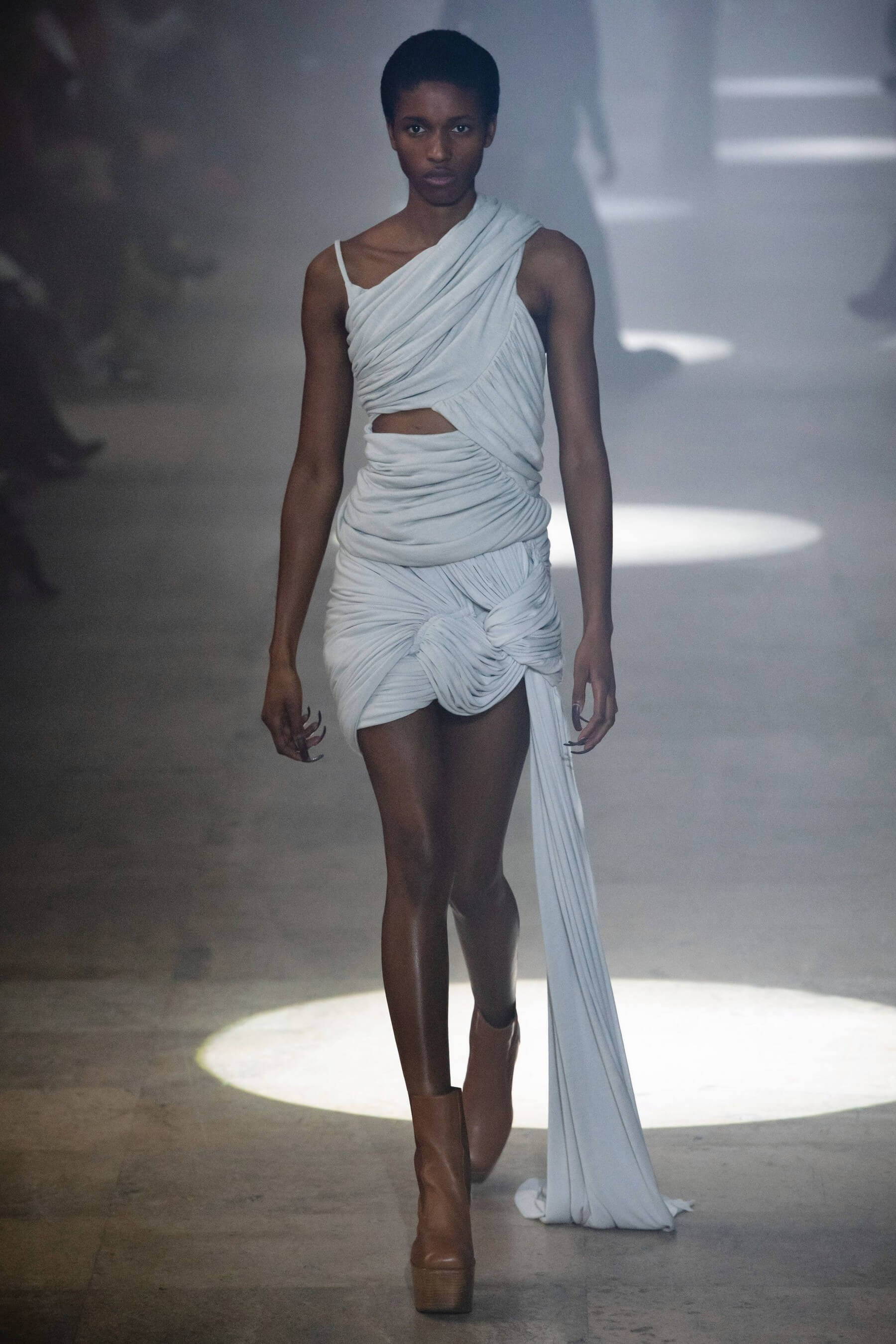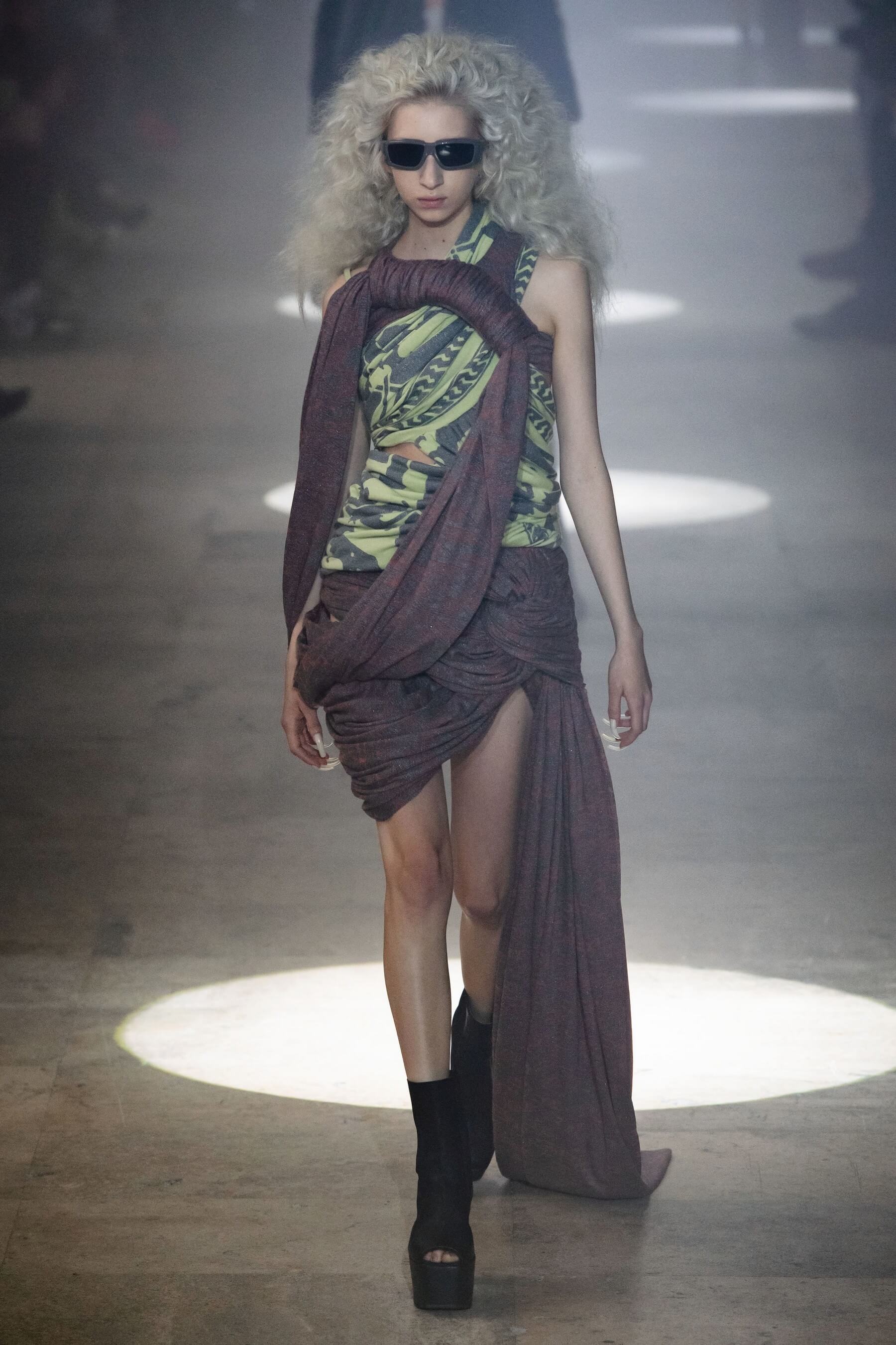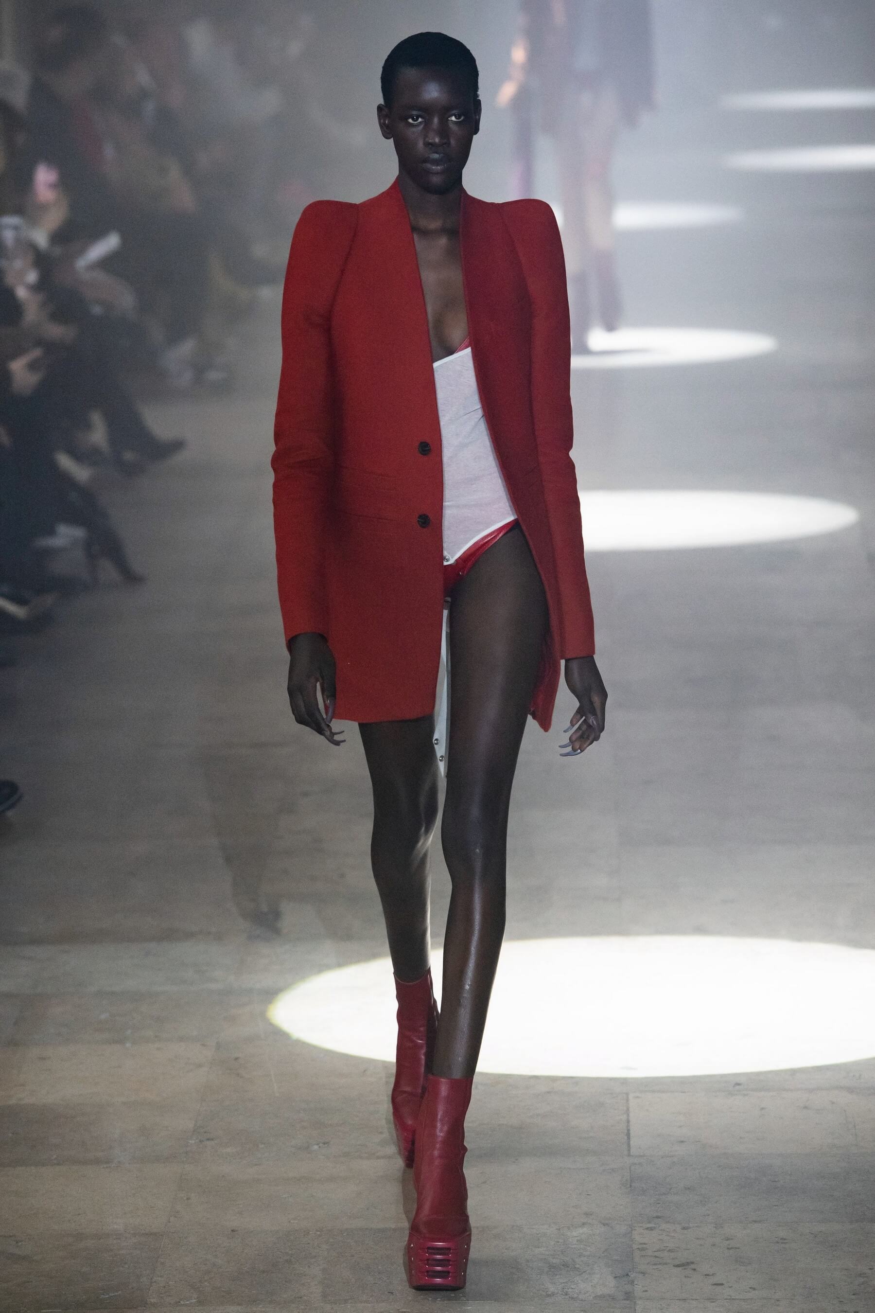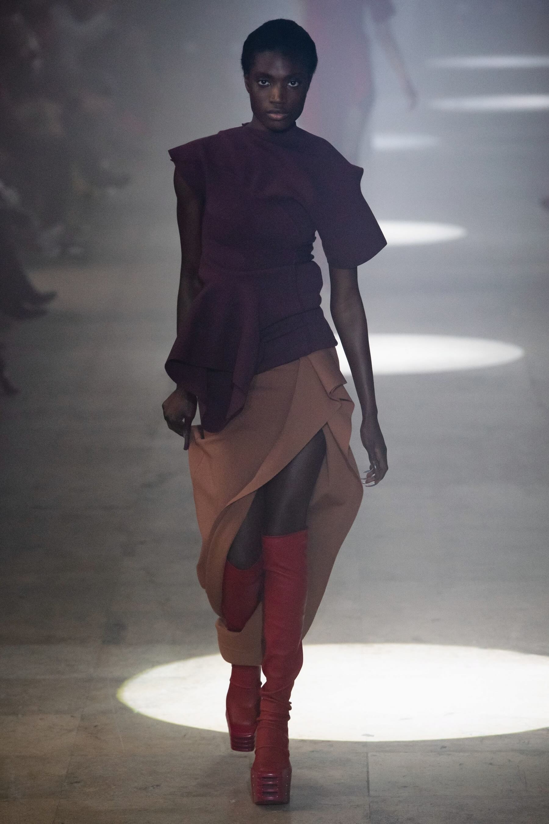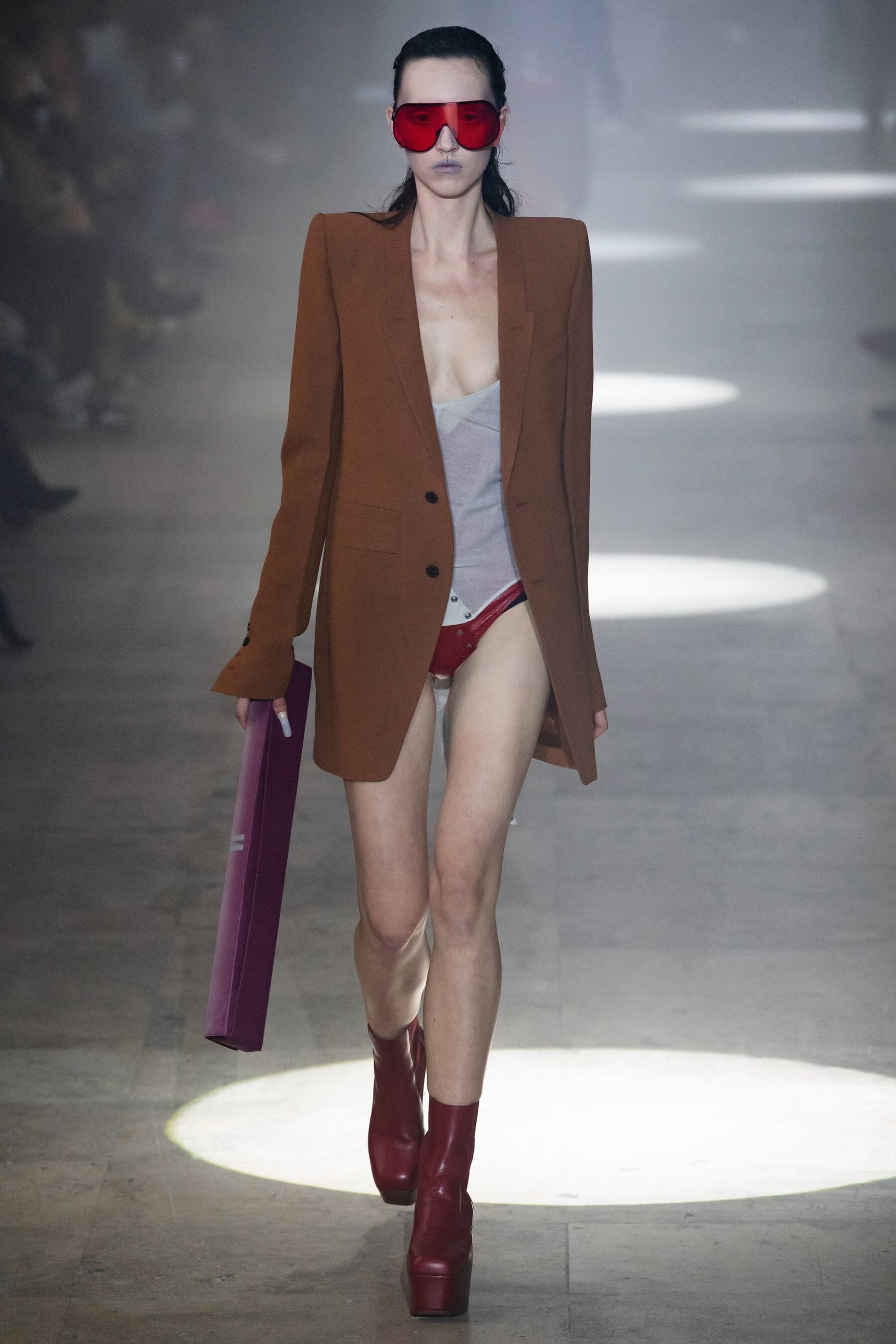 Король гротеска Рик Оуэнс показал новую коллекцию, в которую вошли лаконичные бомберы, пальто и брюки с накладными карманами, кожаные комбинезоны, драпированные платья и шубы с большими плечами.