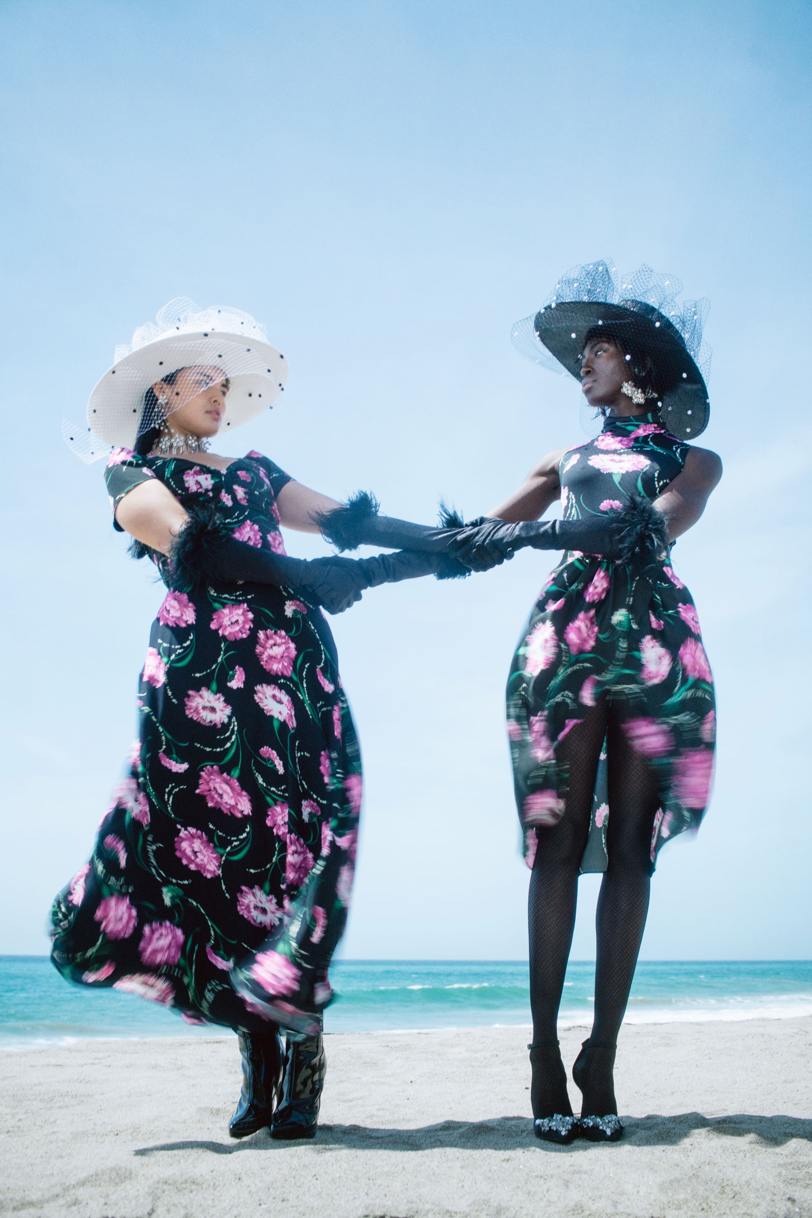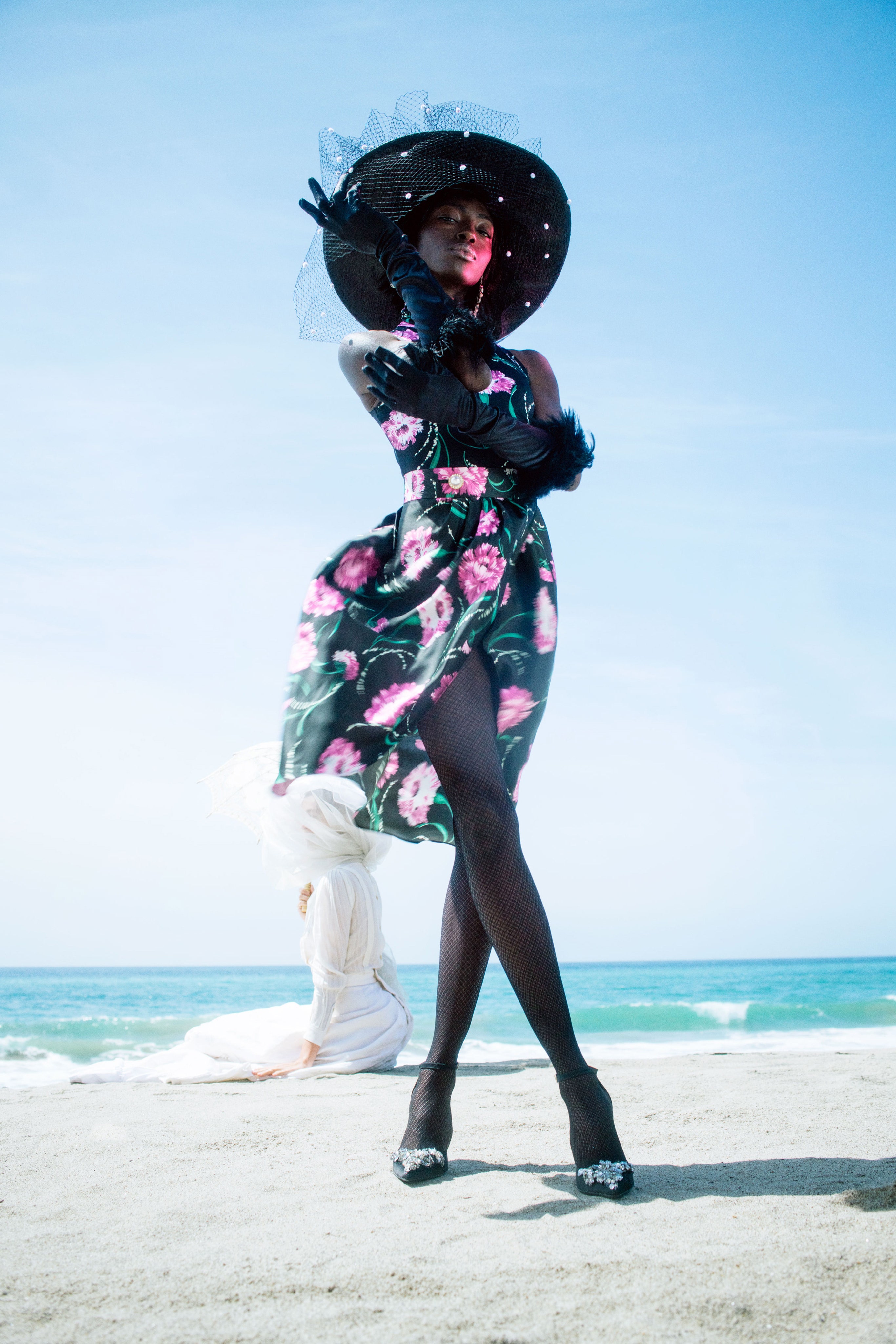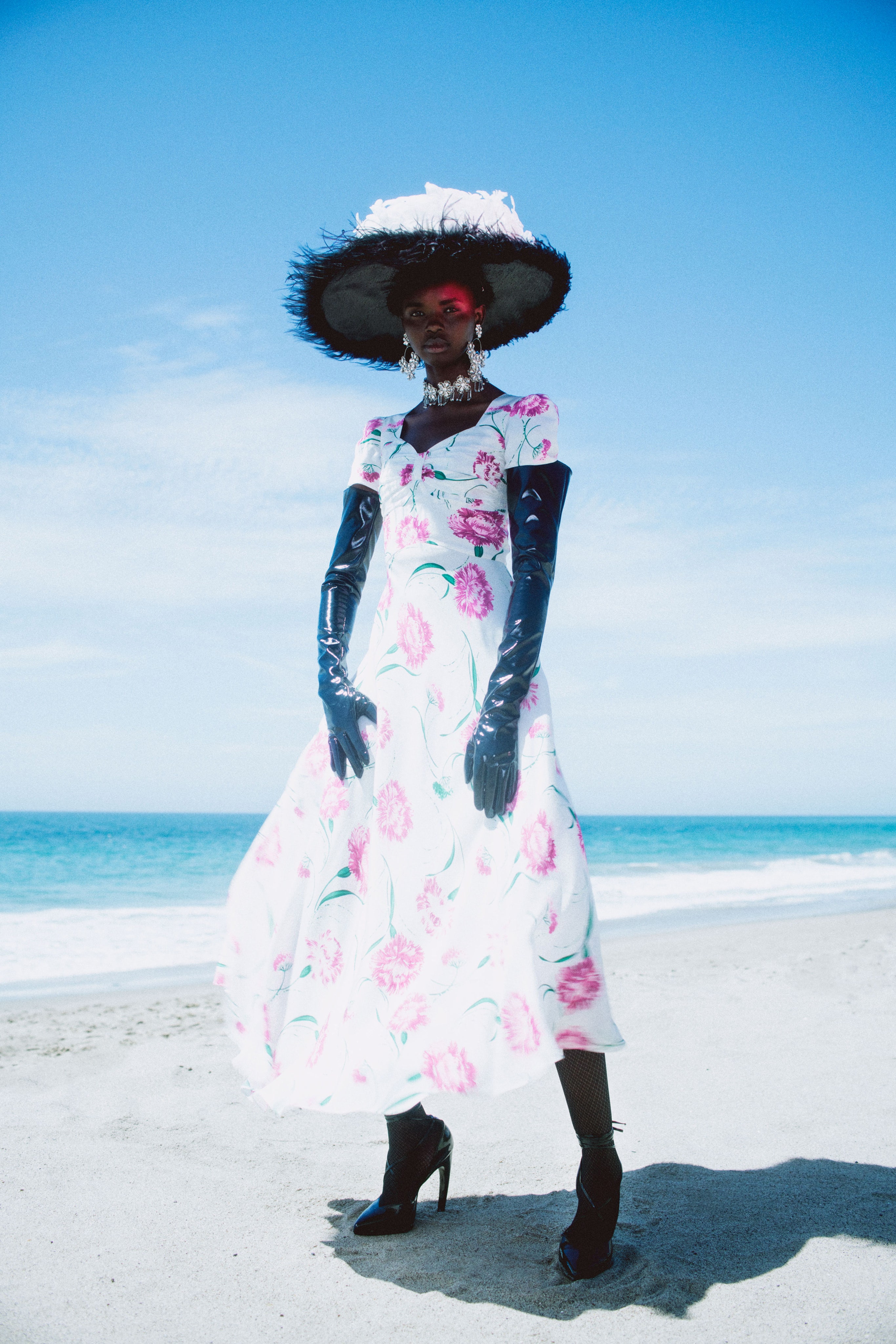 В коллекцию также вошли широкополые шляпы с вуалями, вечерние платья-кейпы, цветочные комбинезоны, структурированные платья в духе винтажных нарядов Chanel, массивные украшения из кристаллов и виниловые перчатки выше локтя.