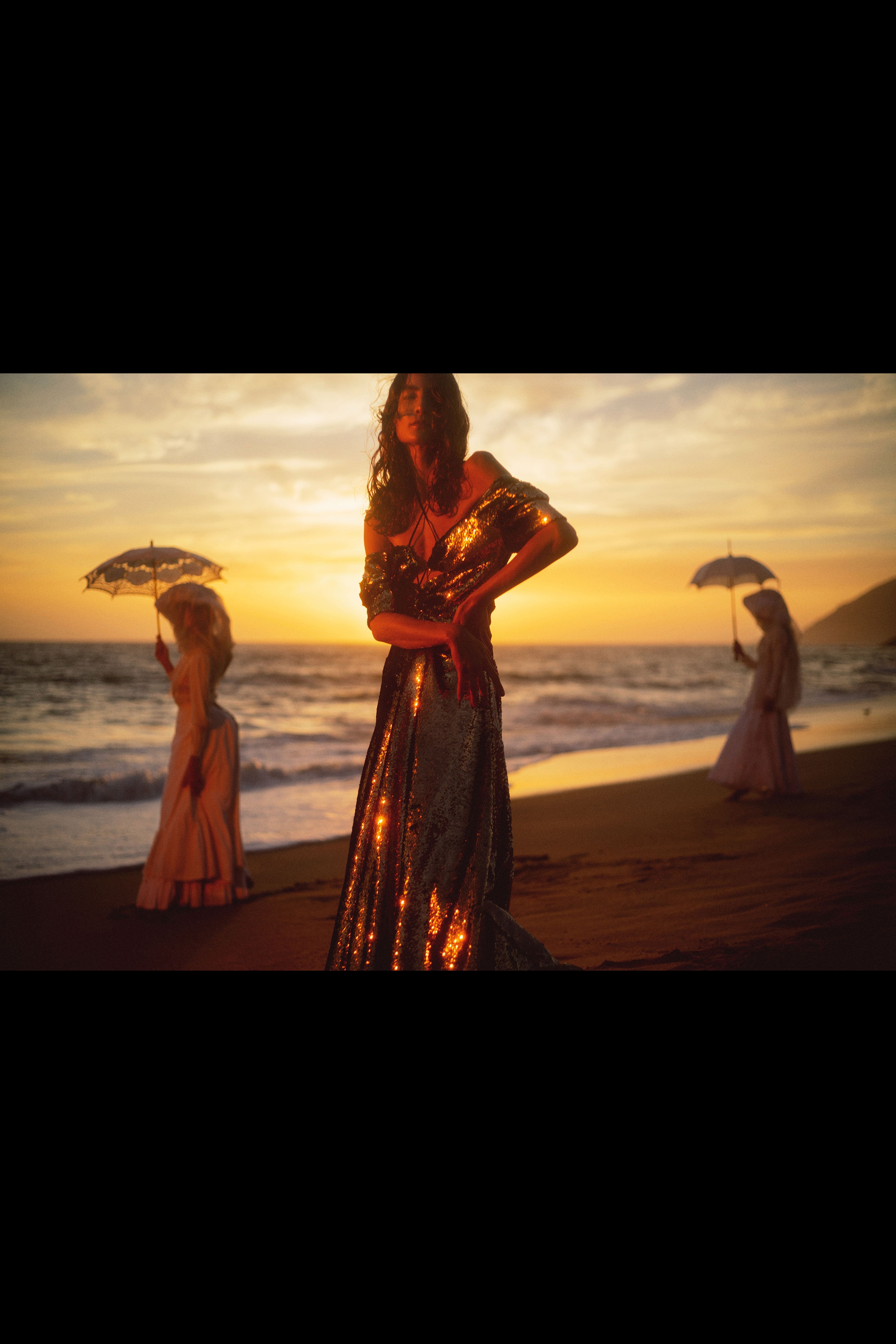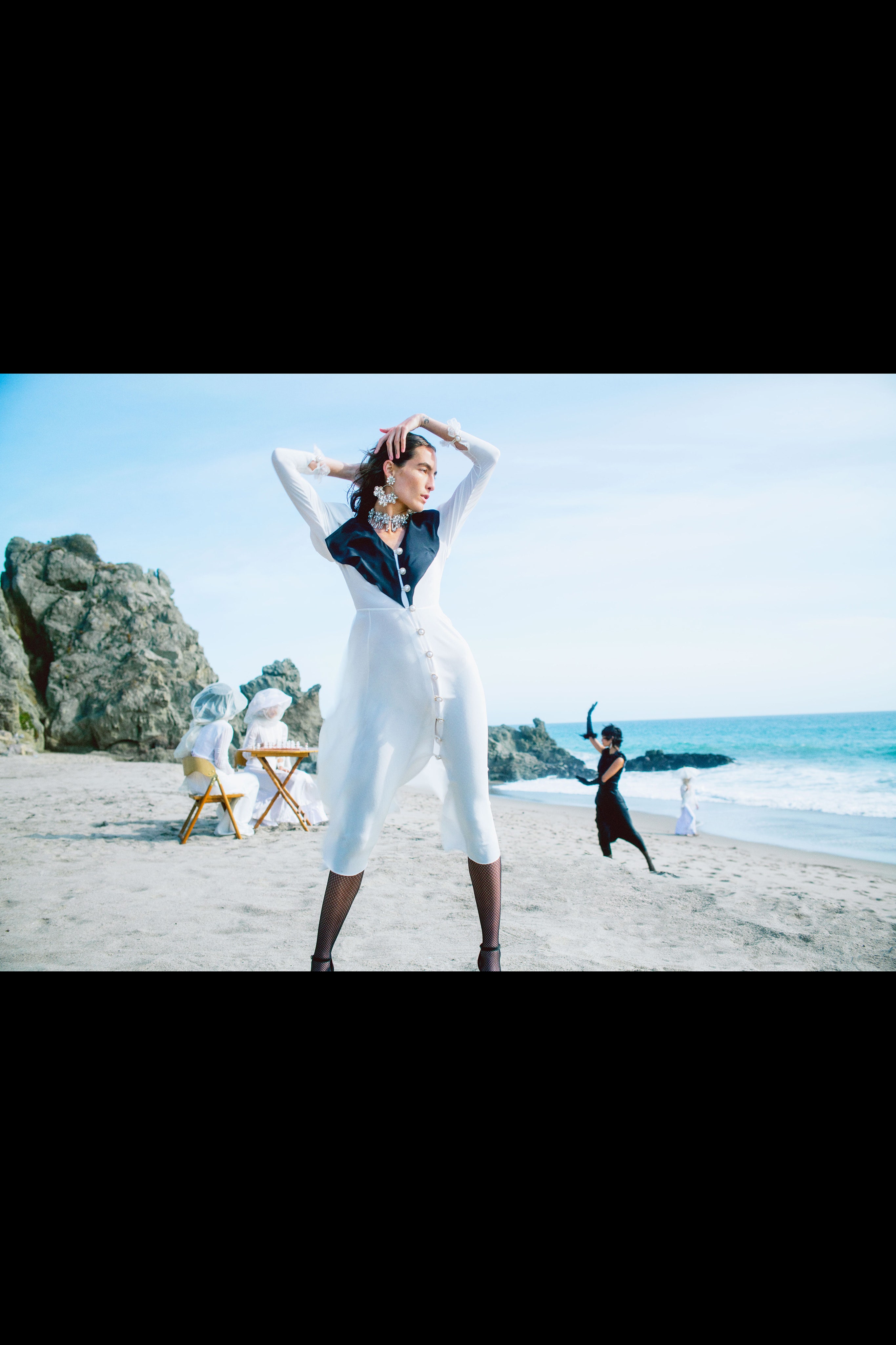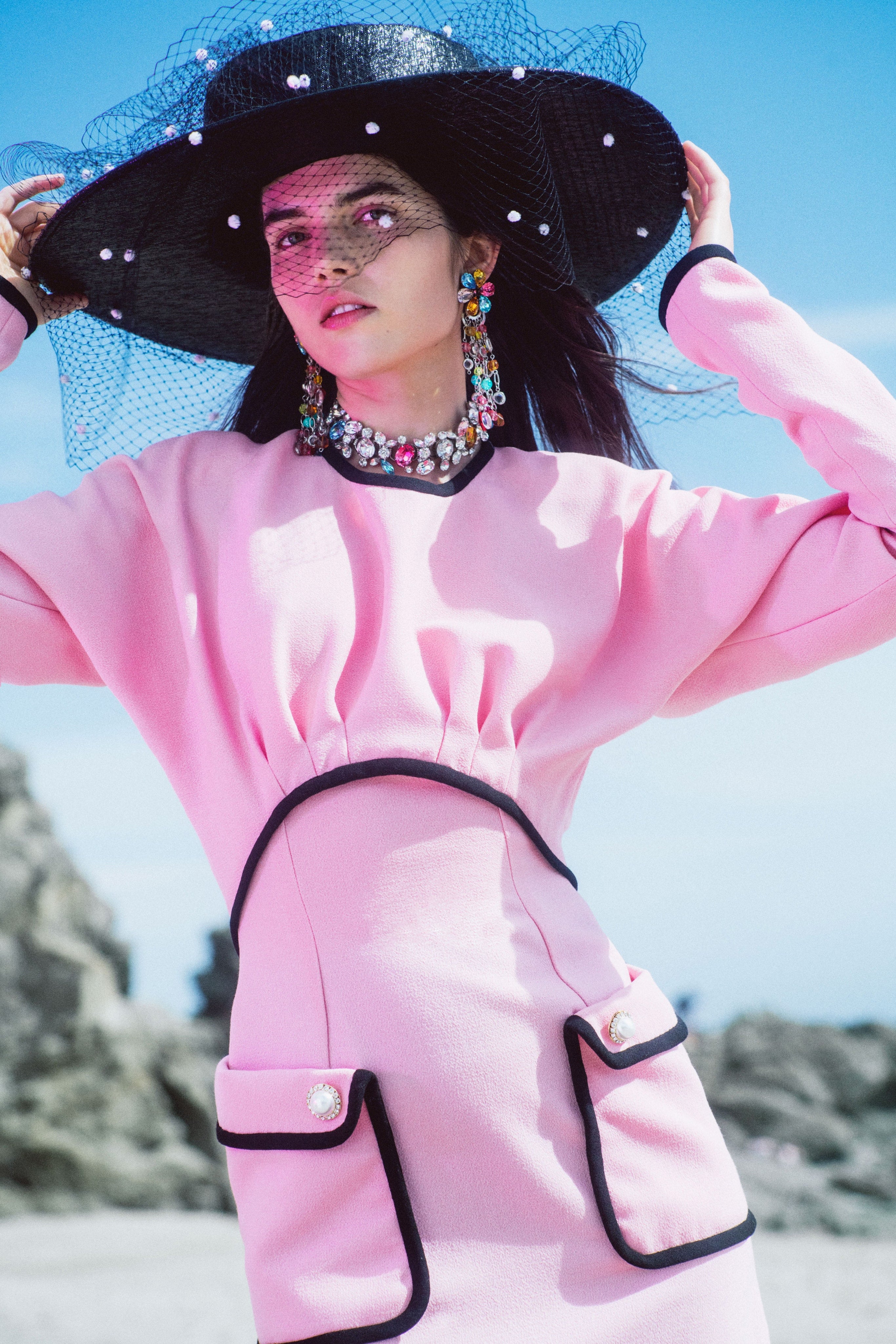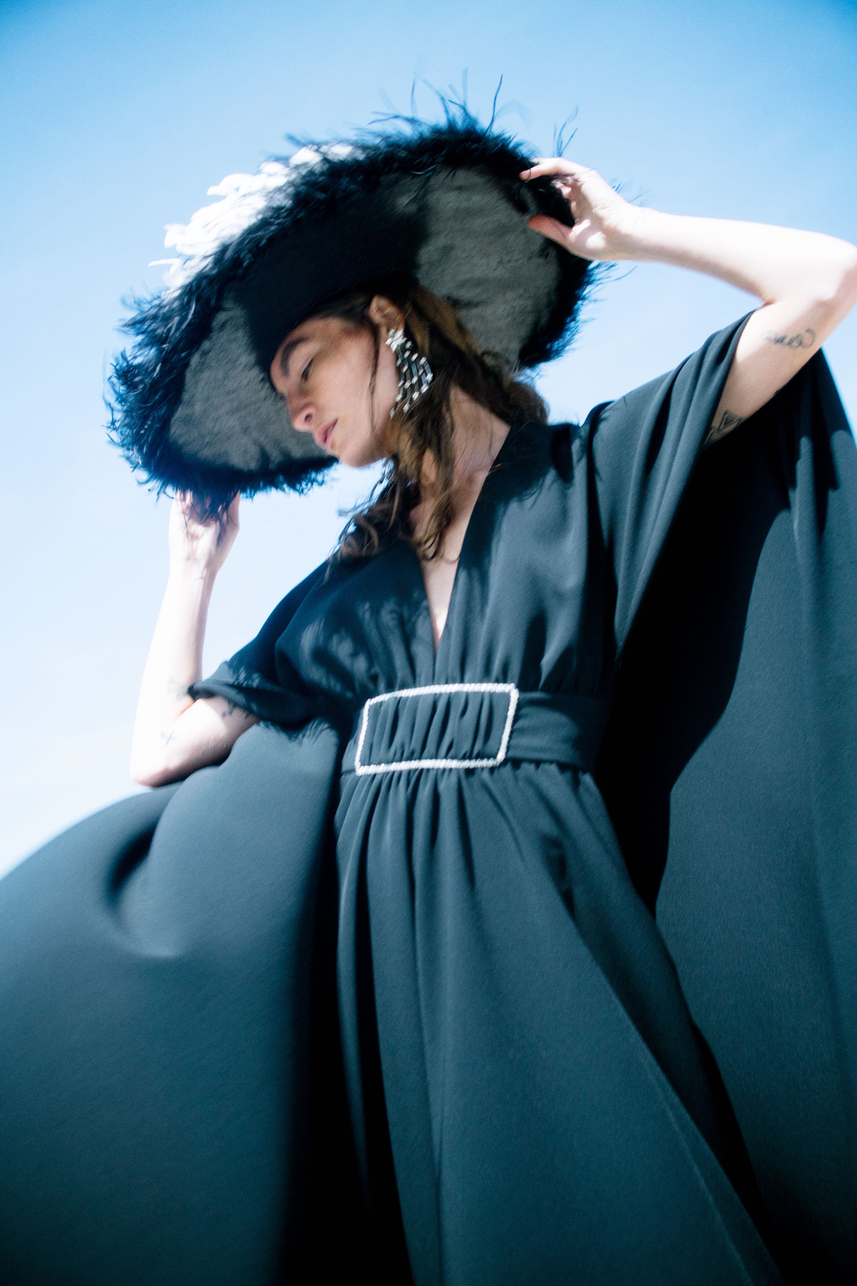 В коллекцию также вошли широкополые шляпы с вуалями, вечерние платья-кейпы, цветочные комбинезоны, структурированные платья в духе винтажных нарядов Chanel, массивные украшения из кристаллов и виниловые перчатки выше локтя.