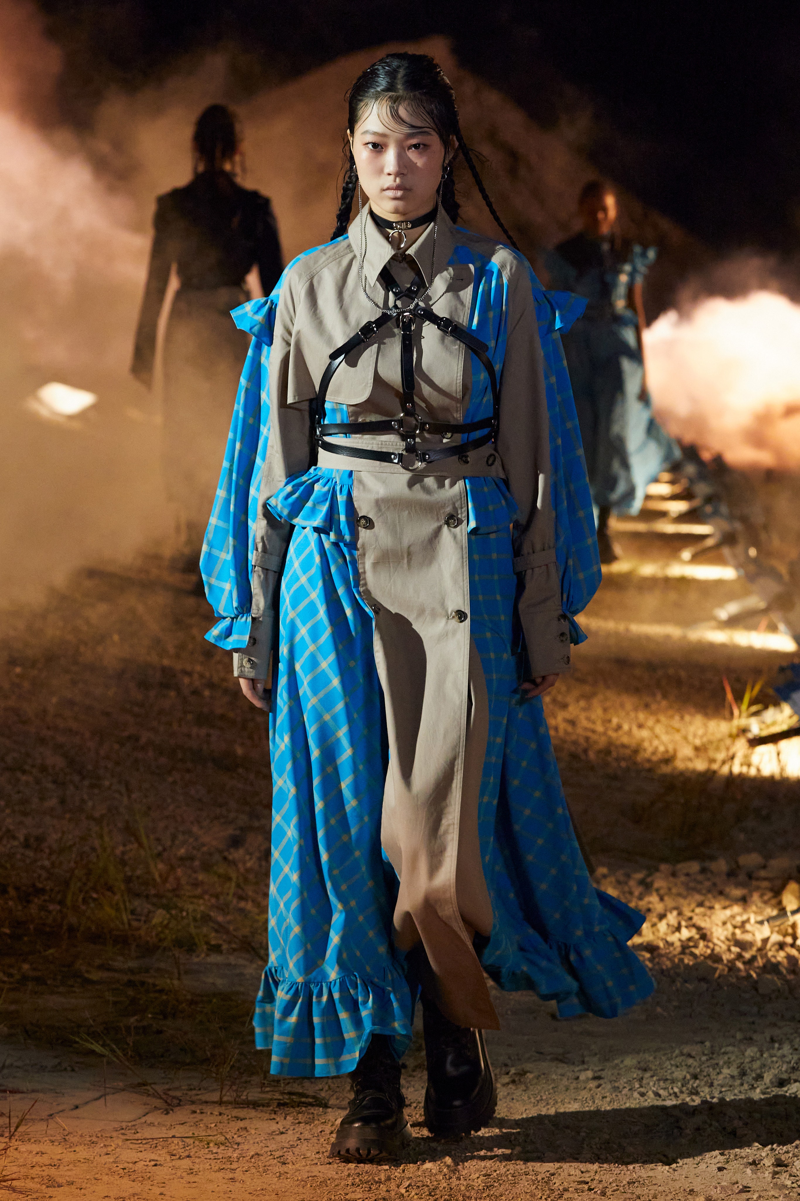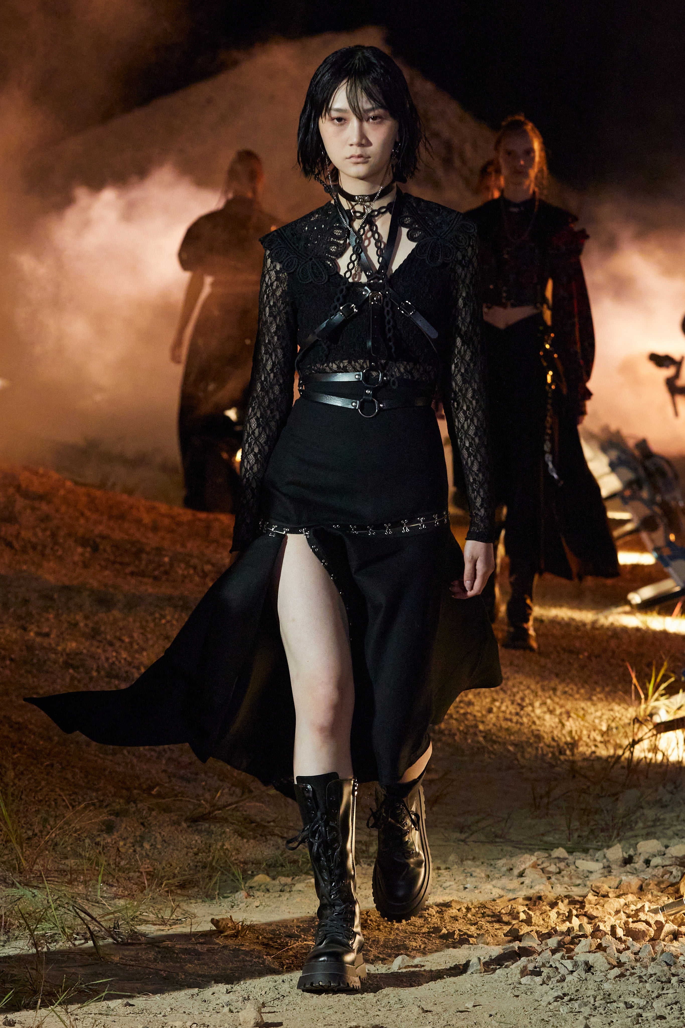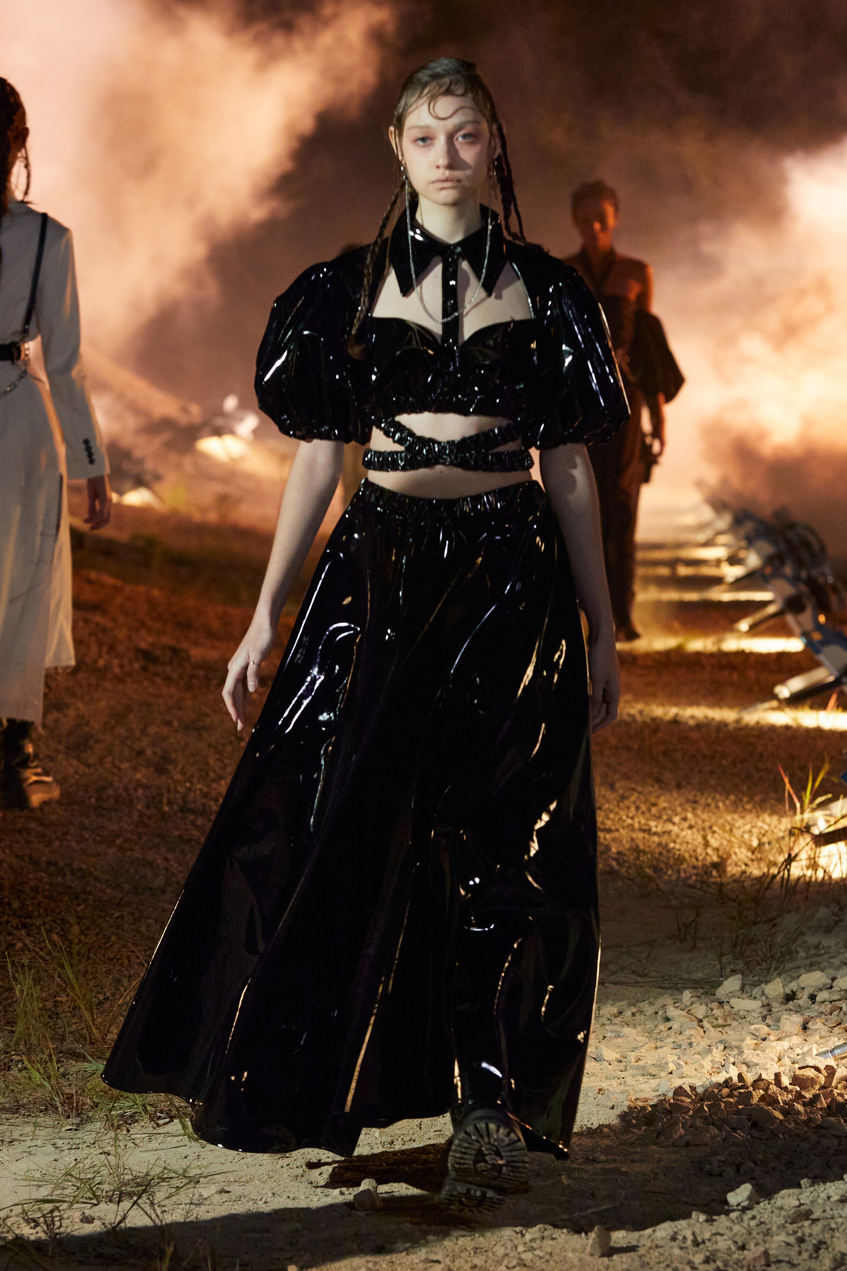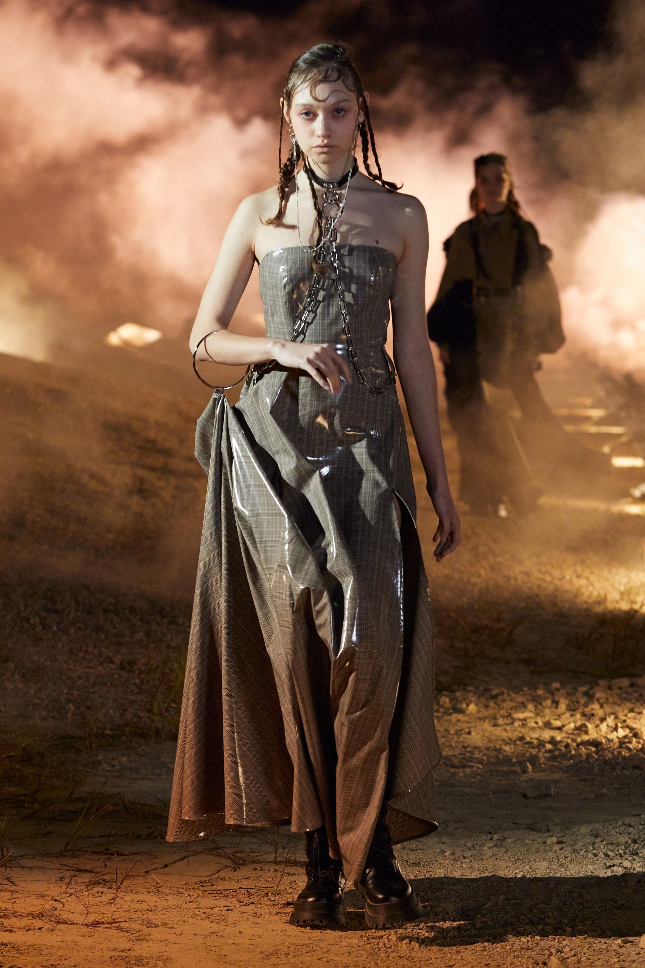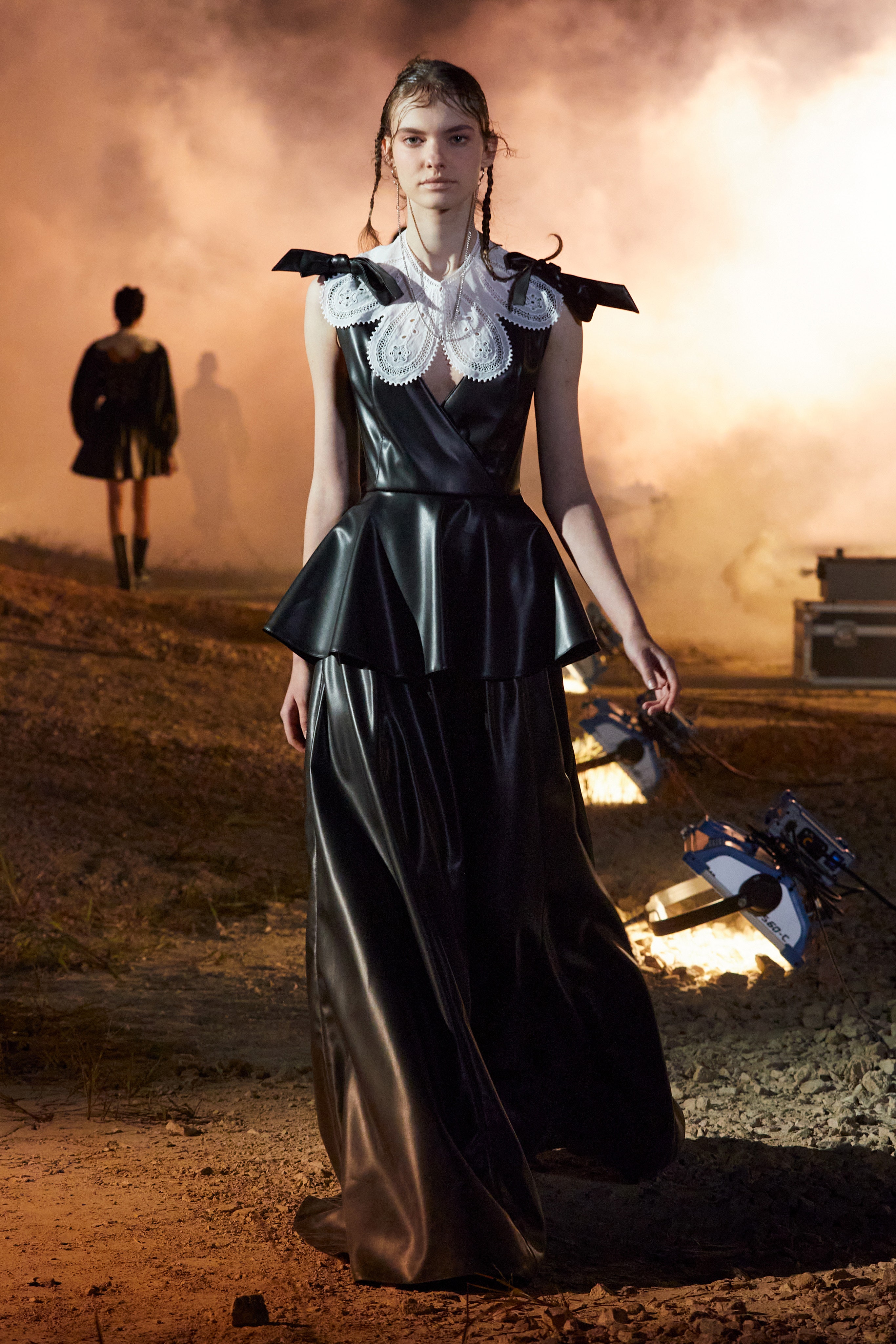 Изящные платья с обозначенной линией талии из шифона и шелка дополнили виниловые рукава, кожаные бондажи и харнессы, а также пояса с цепями. И напротив, в фетишистские кожаные платья дизайнер имплантировал кружевные воротнички и манишки. Коллекция носит название "Ночной странник" — к этому Хуанг пришел после своих прогулок по ночному городу во время карантина. Отзвуки субкультурных стилей из 90-х угадываются в прическах моделей из тонких кос, лоскутах клетчатой ткани в сложных тренчах и многослойных топах, а также в тяжелых лаковых ботинках.