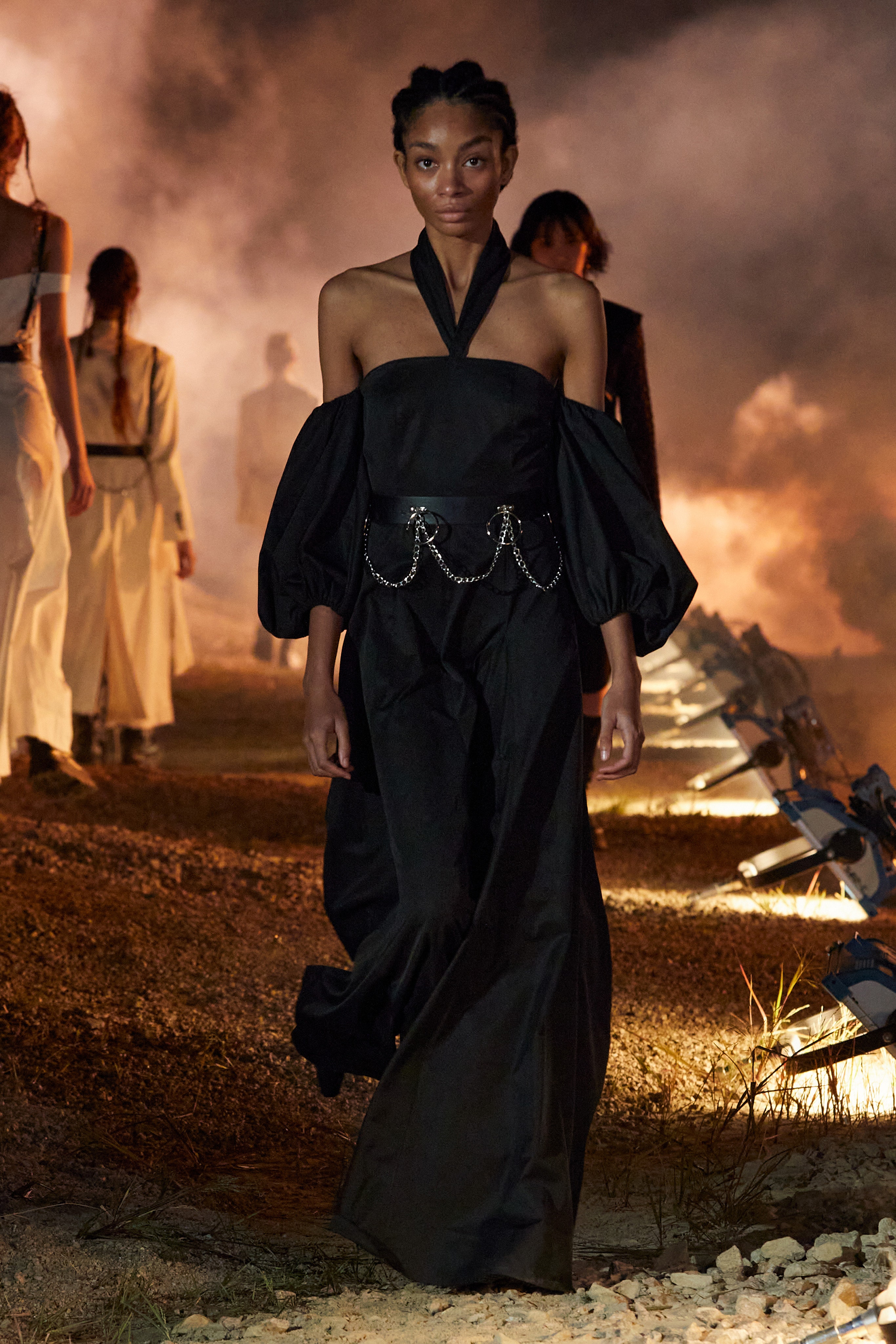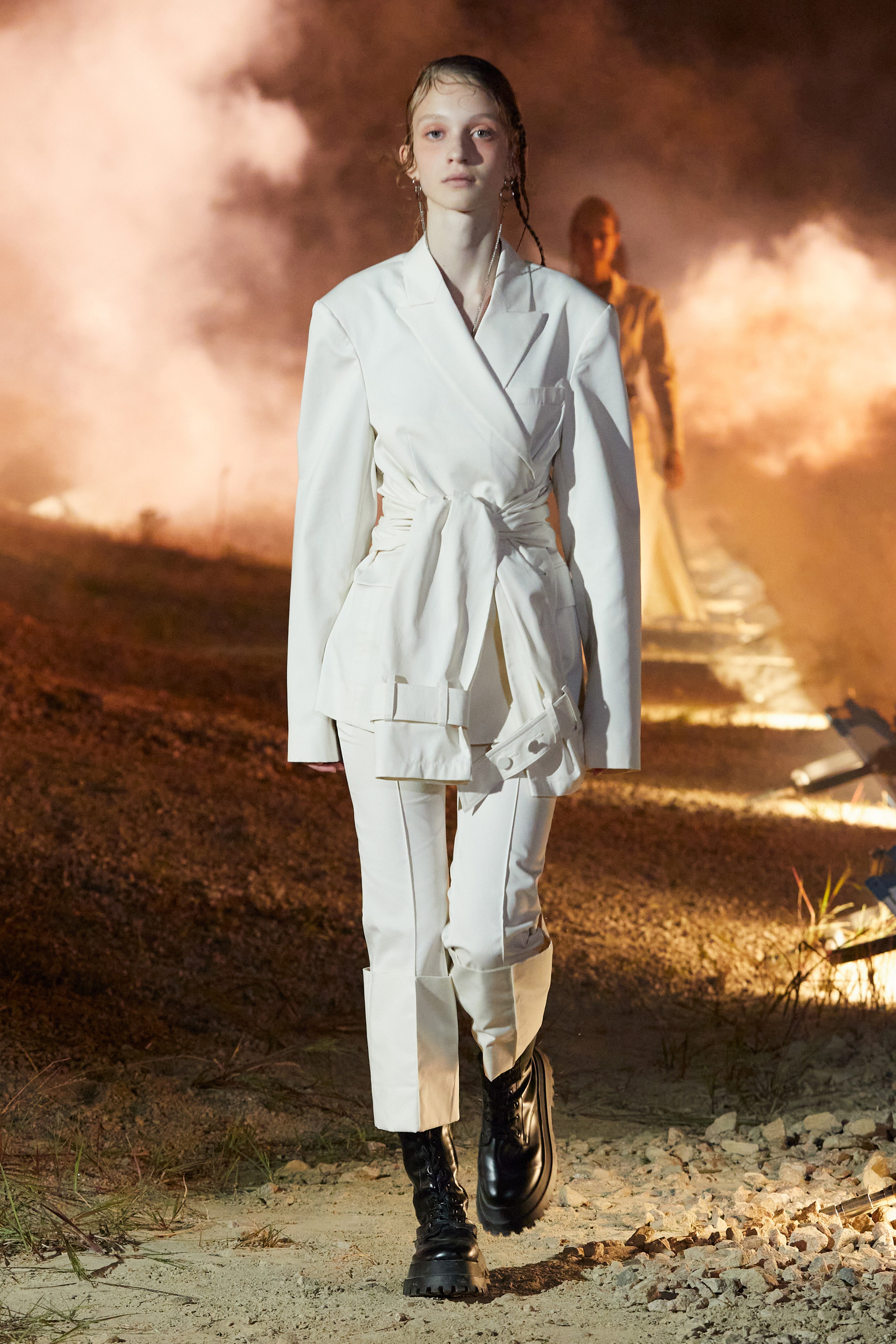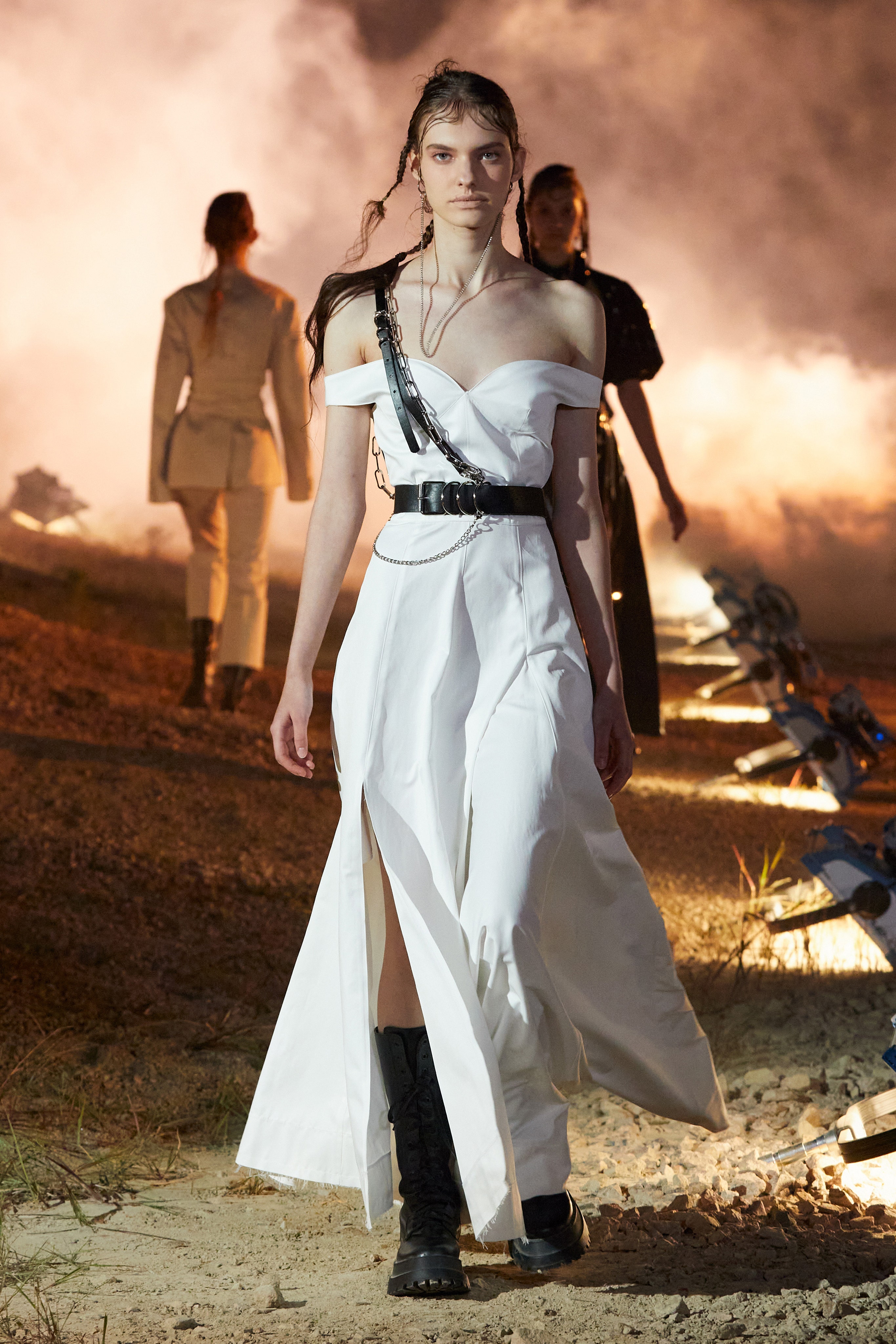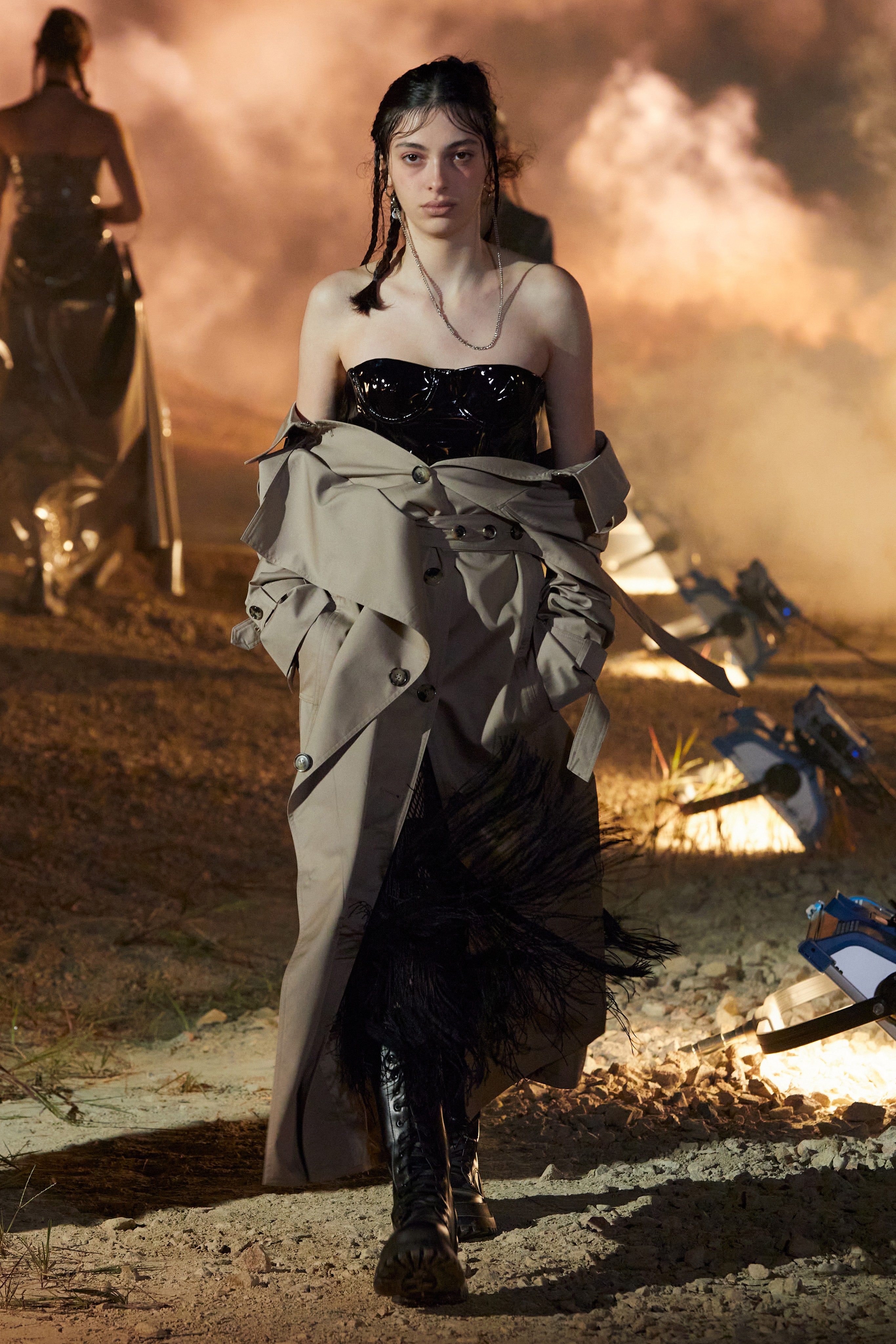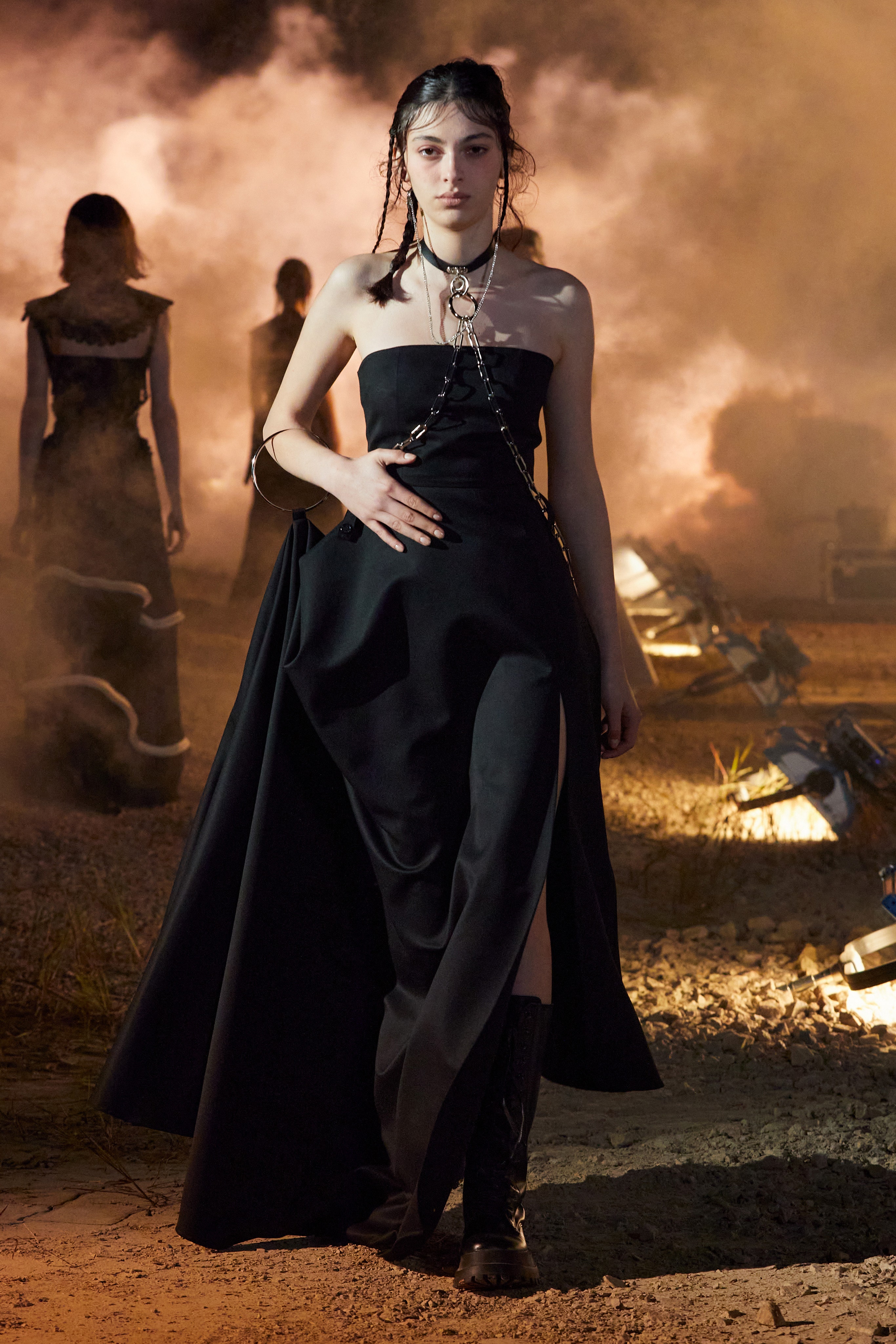 Изящные платья с обозначенной линией талии из шифона и шелка дополнили виниловые рукава, кожаные бондажи и харнессы, а также пояса с цепями. И напротив, в фетишистские кожаные платья дизайнер имплантировал кружевные воротнички и манишки. Коллекция носит название "Ночной странник" — к этому Хуанг пришел после своих прогулок по ночному городу во время карантина. Отзвуки субкультурных стилей из 90-х угадываются в прическах моделей из тонких кос, лоскутах клетчатой ткани в сложных тренчах и многослойных топах, а также в тяжелых лаковых ботинках.