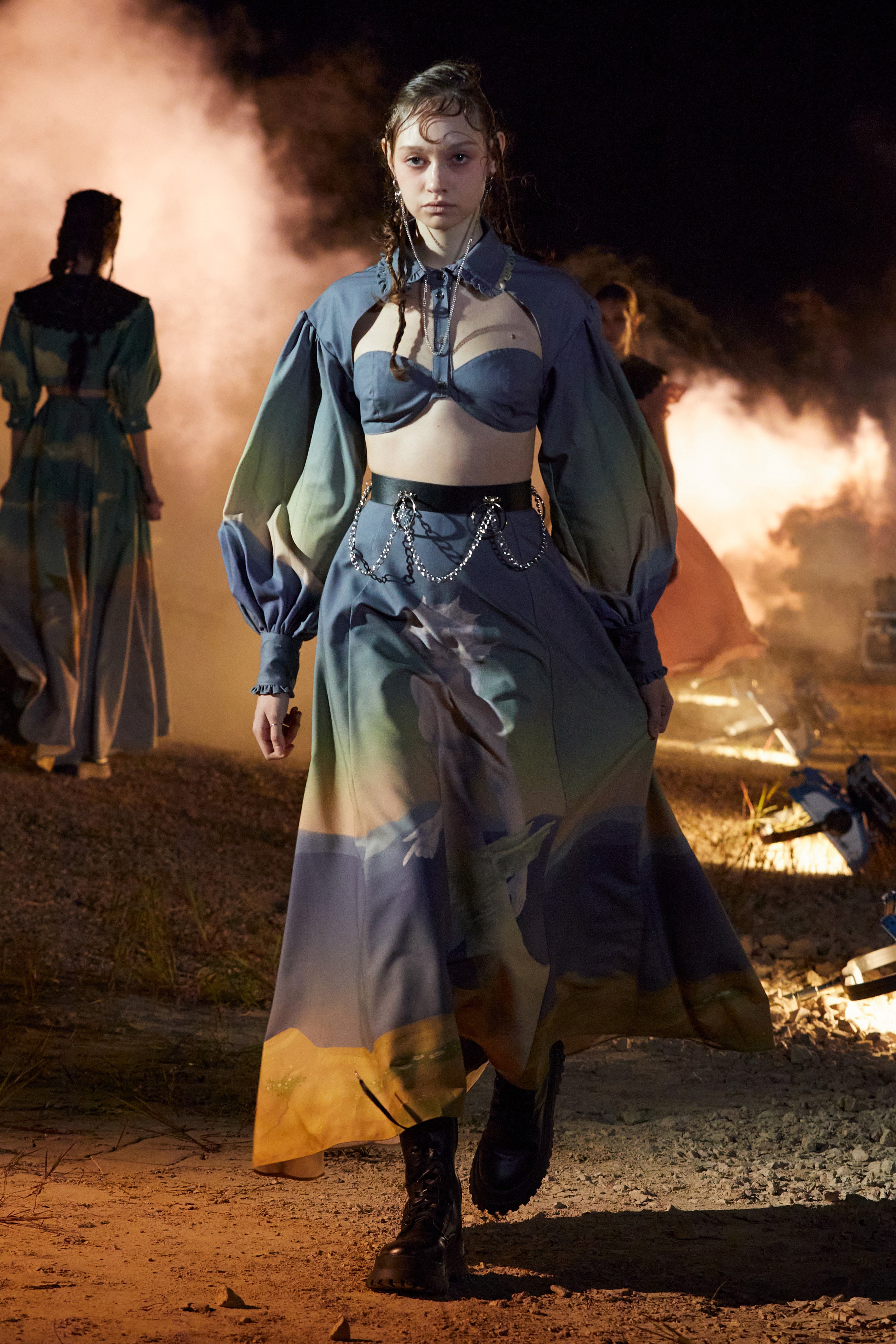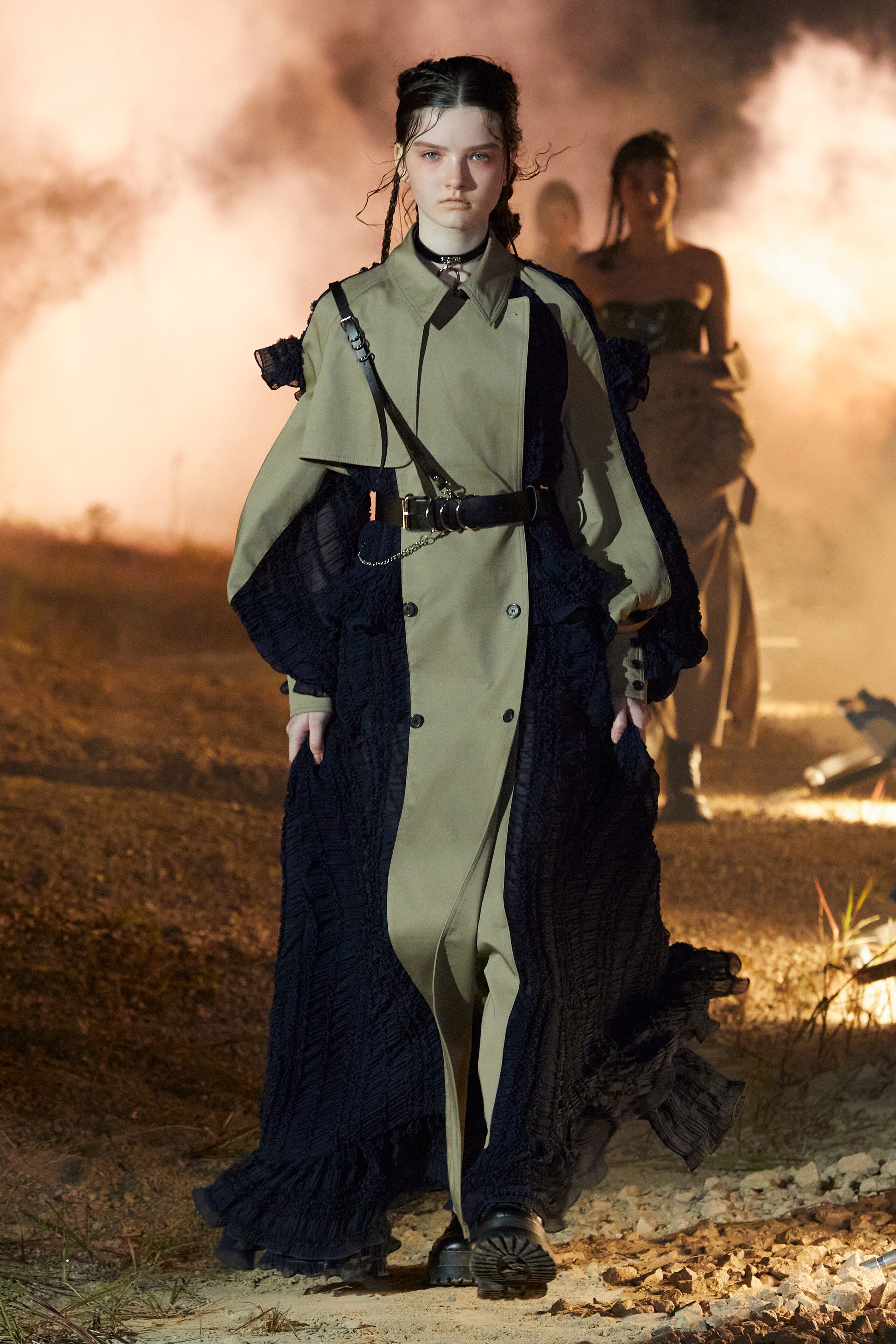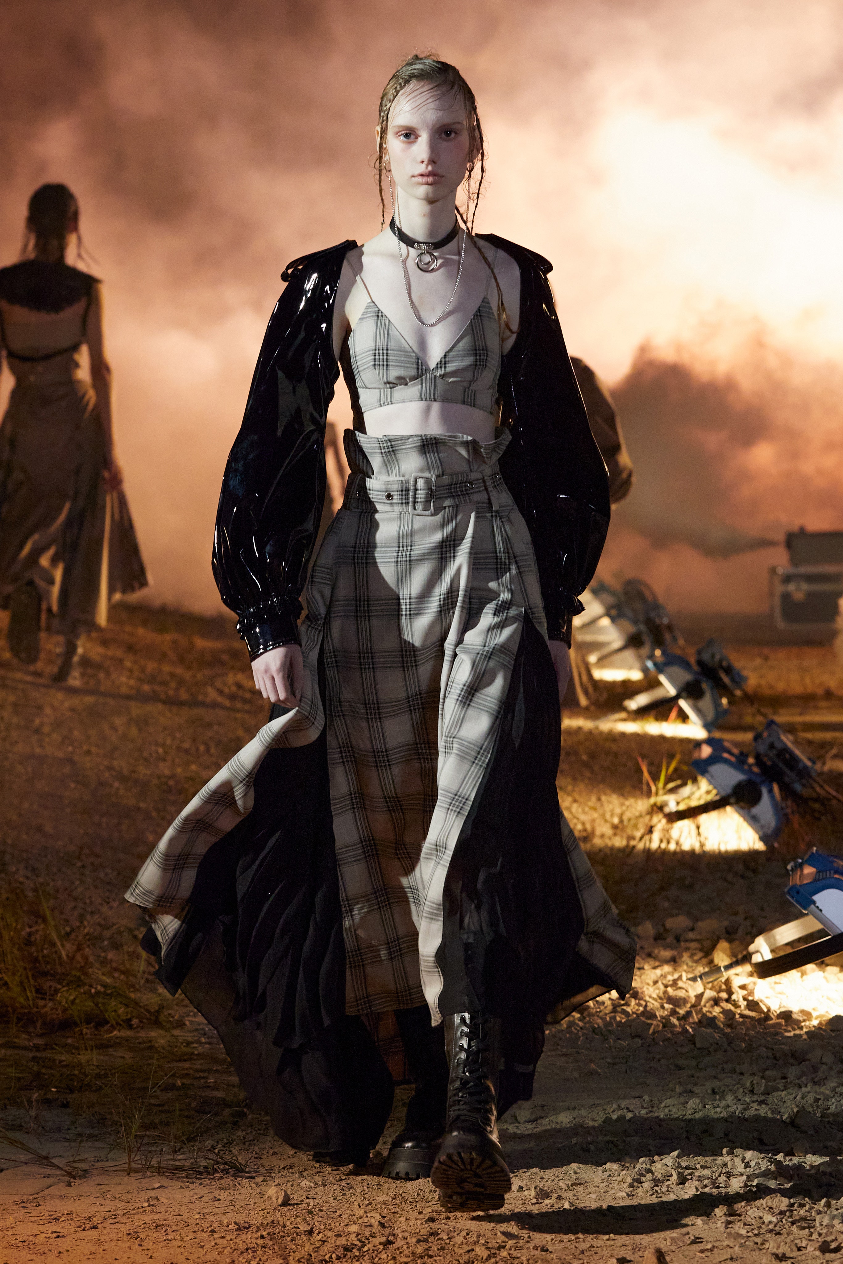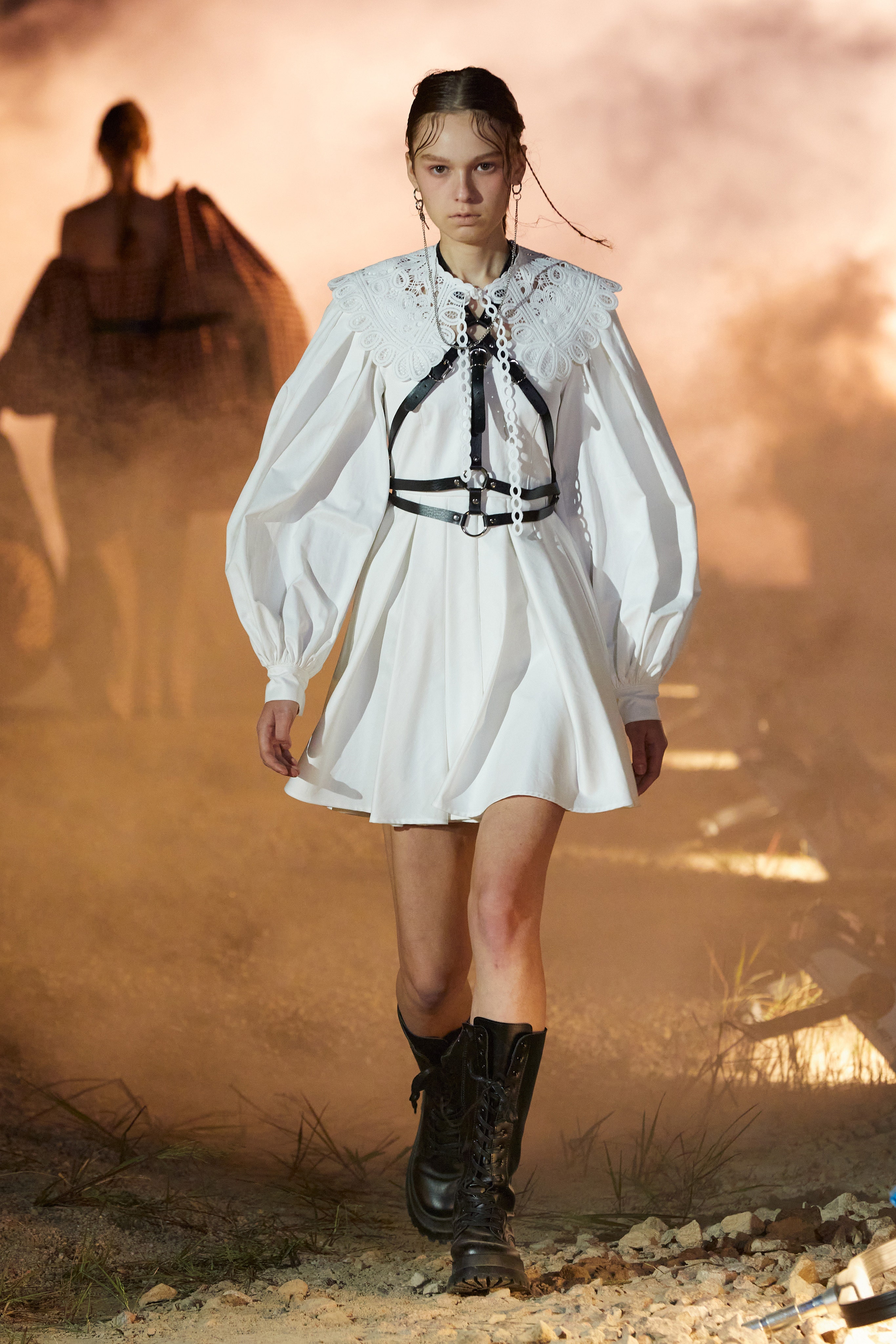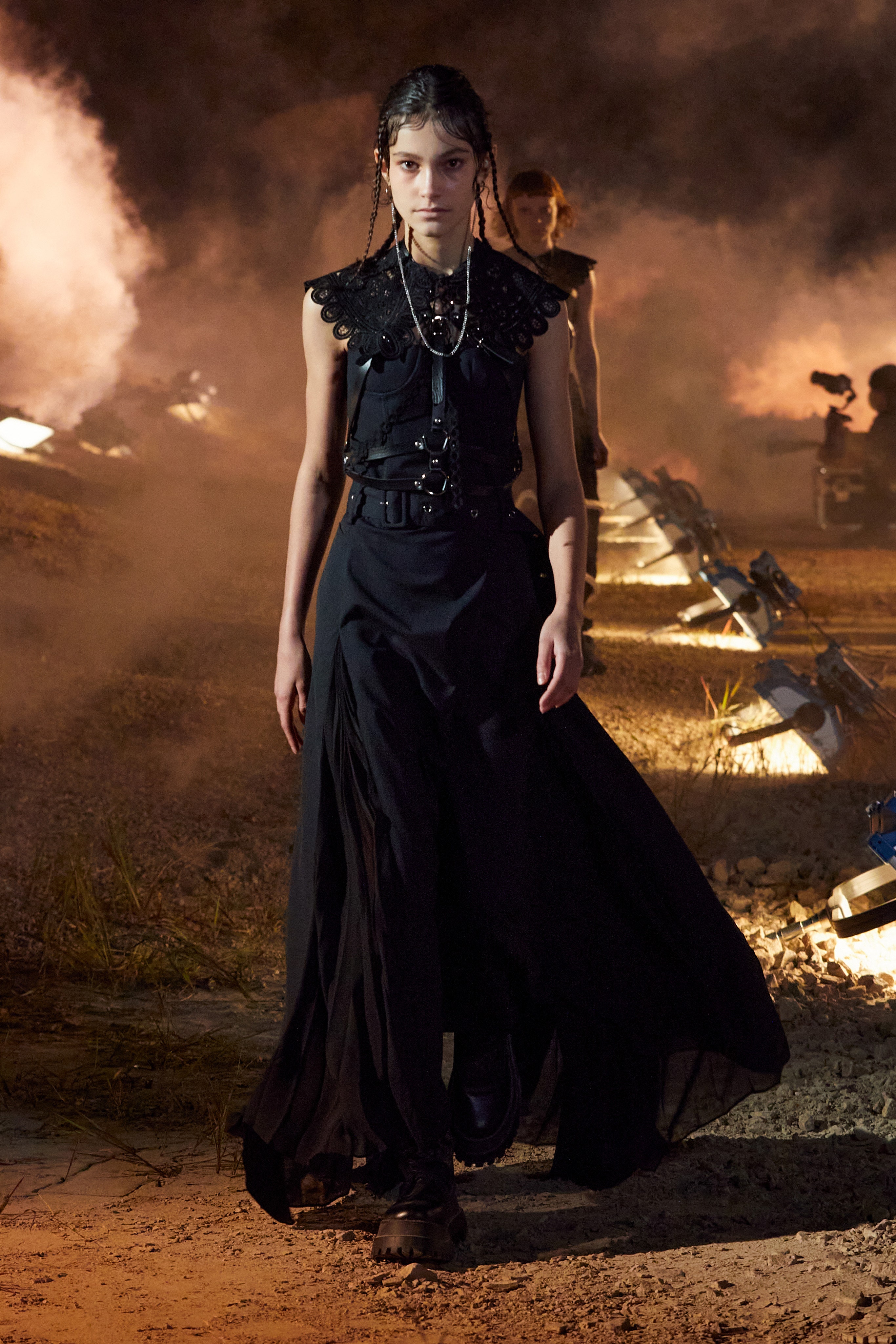 Изящные платья с обозначенной линией талии из шифона и шелка дополнили виниловые рукава, кожаные бондажи и харнессы, а также пояса с цепями. И напротив, в фетишистские кожаные платья дизайнер имплантировал кружевные воротнички и манишки. Коллекция носит название "Ночной странник" — к этому Хуанг пришел после своих прогулок по ночному городу во время карантина. Отзвуки субкультурных стилей из 90-х угадываются в прическах моделей из тонких кос, лоскутах клетчатой ткани в сложных тренчах и многослойных топах, а также в тяжелых лаковых ботинках.