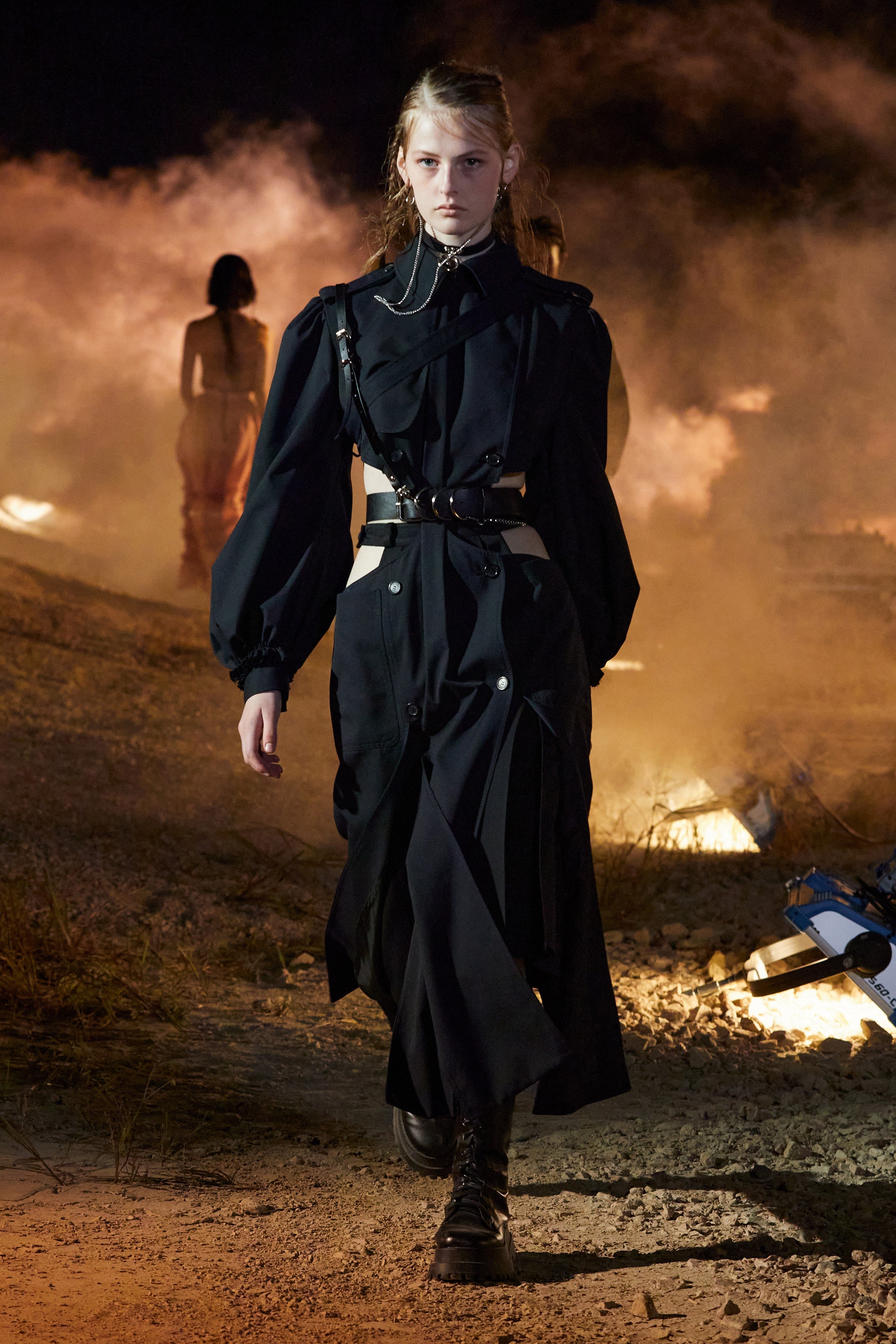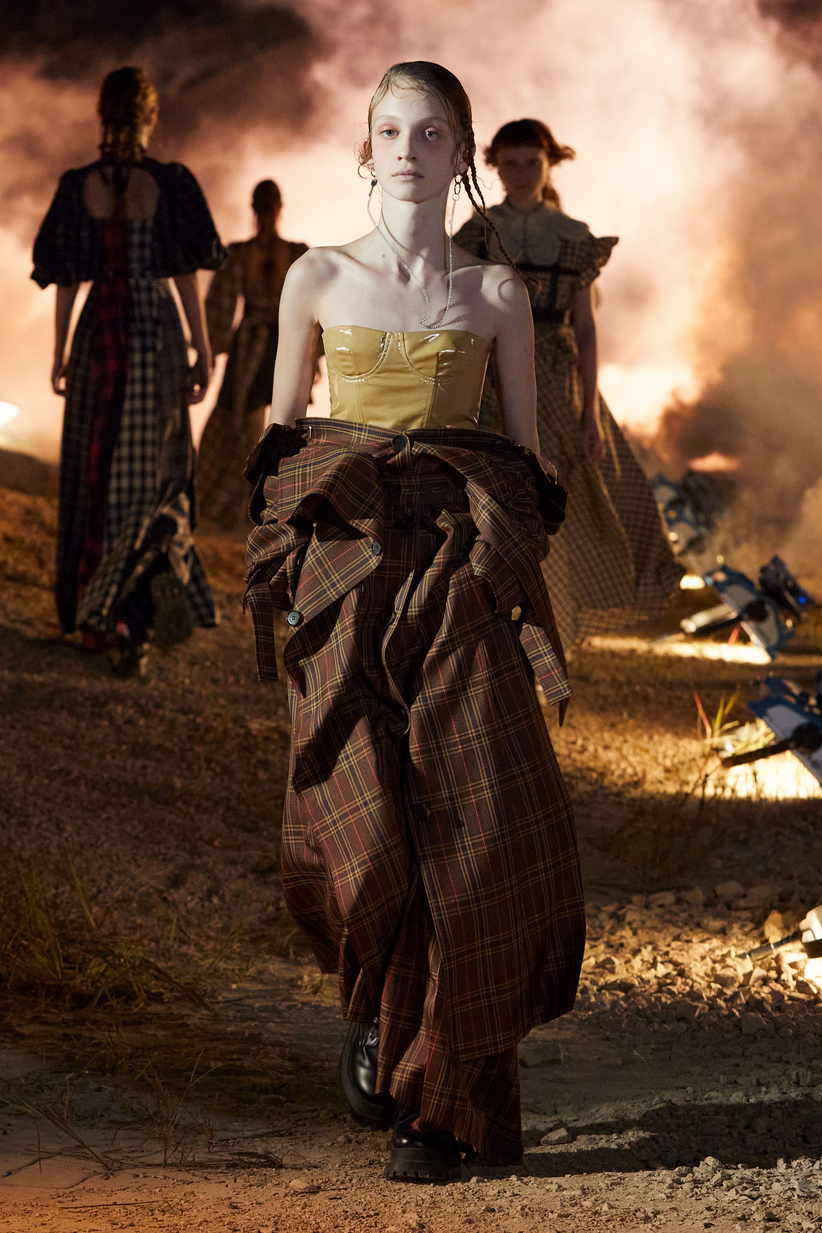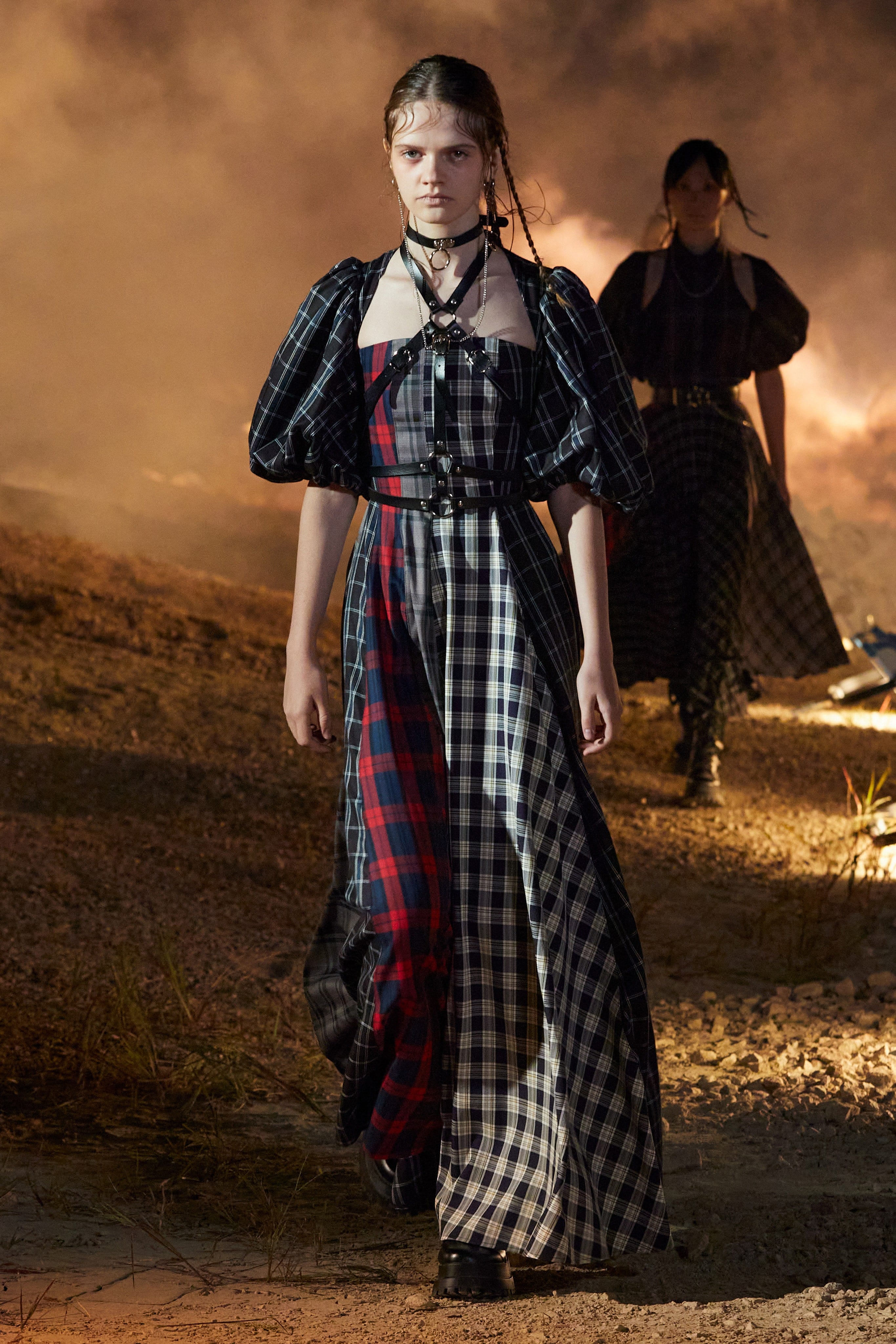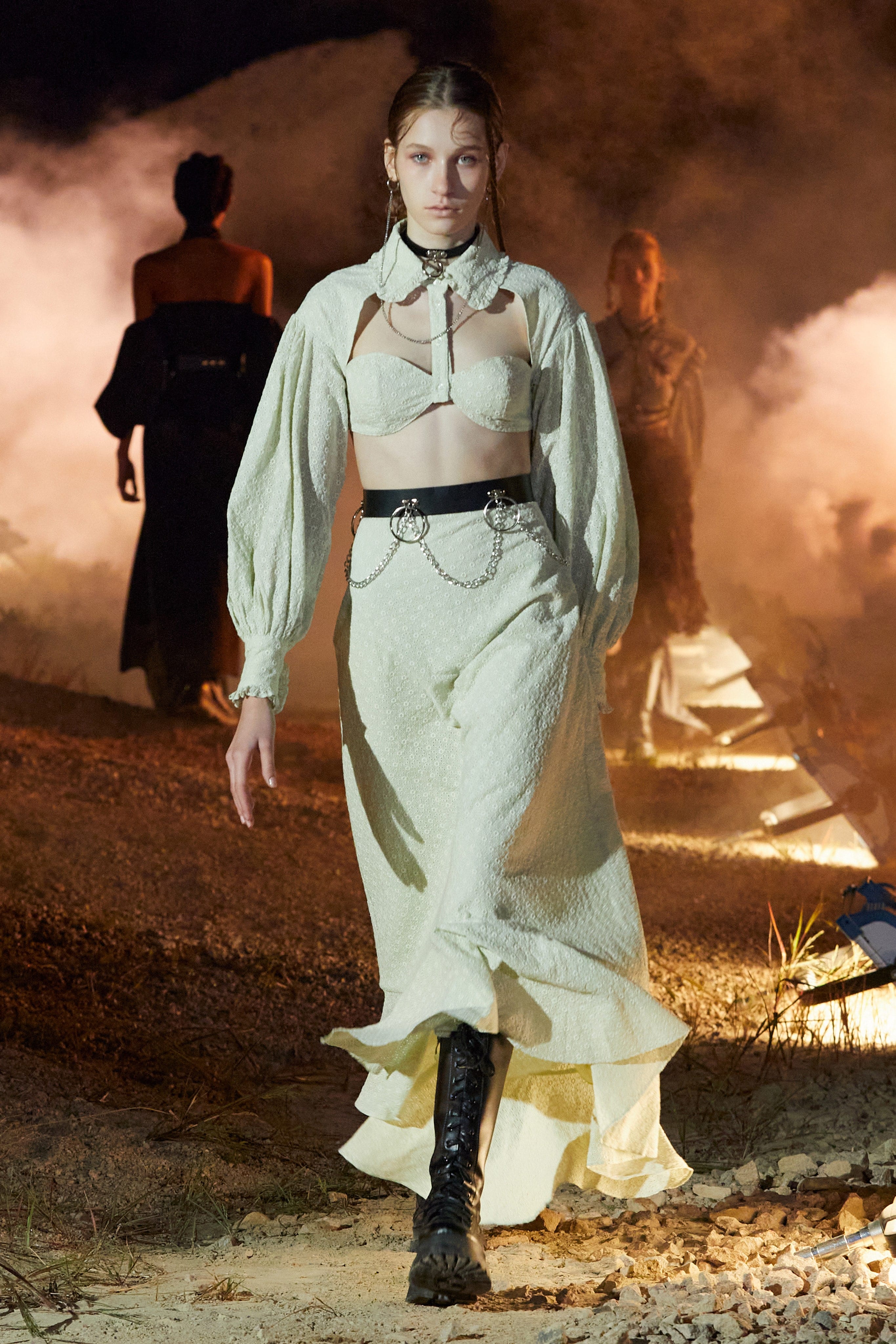 Изящные платья с обозначенной линией талии из шифона и шелка дополнили виниловые рукава, кожаные бондажи и харнессы, а также пояса с цепями. И напротив, в фетишистские кожаные платья дизайнер имплантировал кружевные воротнички и манишки. Коллекция носит название "Ночной странник" — к этому Хуанг пришел после своих прогулок по ночному городу во время карантина. Отзвуки субкультурных стилей из 90-х угадываются в прическах моделей из тонких кос, лоскутах клетчатой ткани в сложных тренчах и многослойных топах, а также в тяжелых лаковых ботинках.
