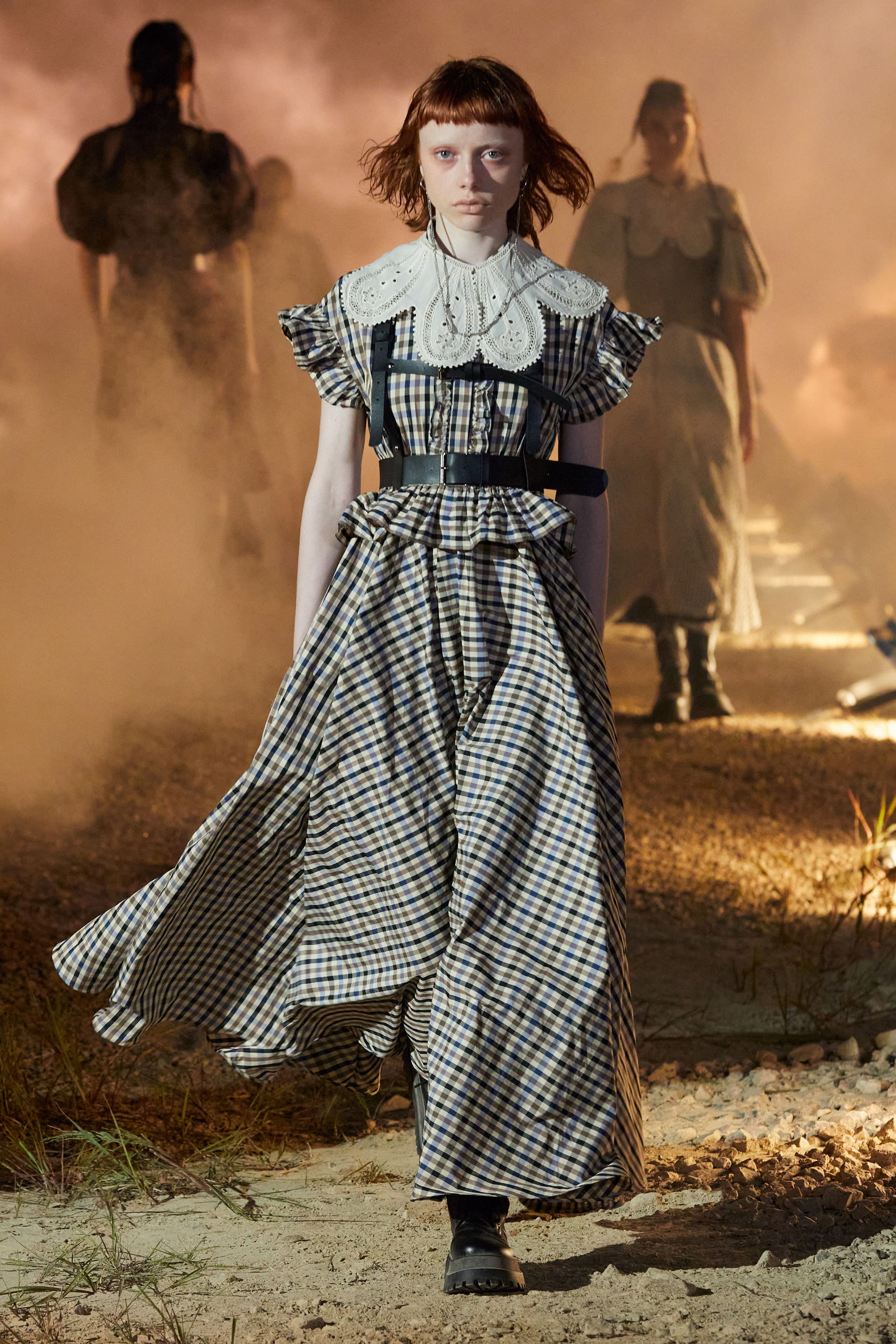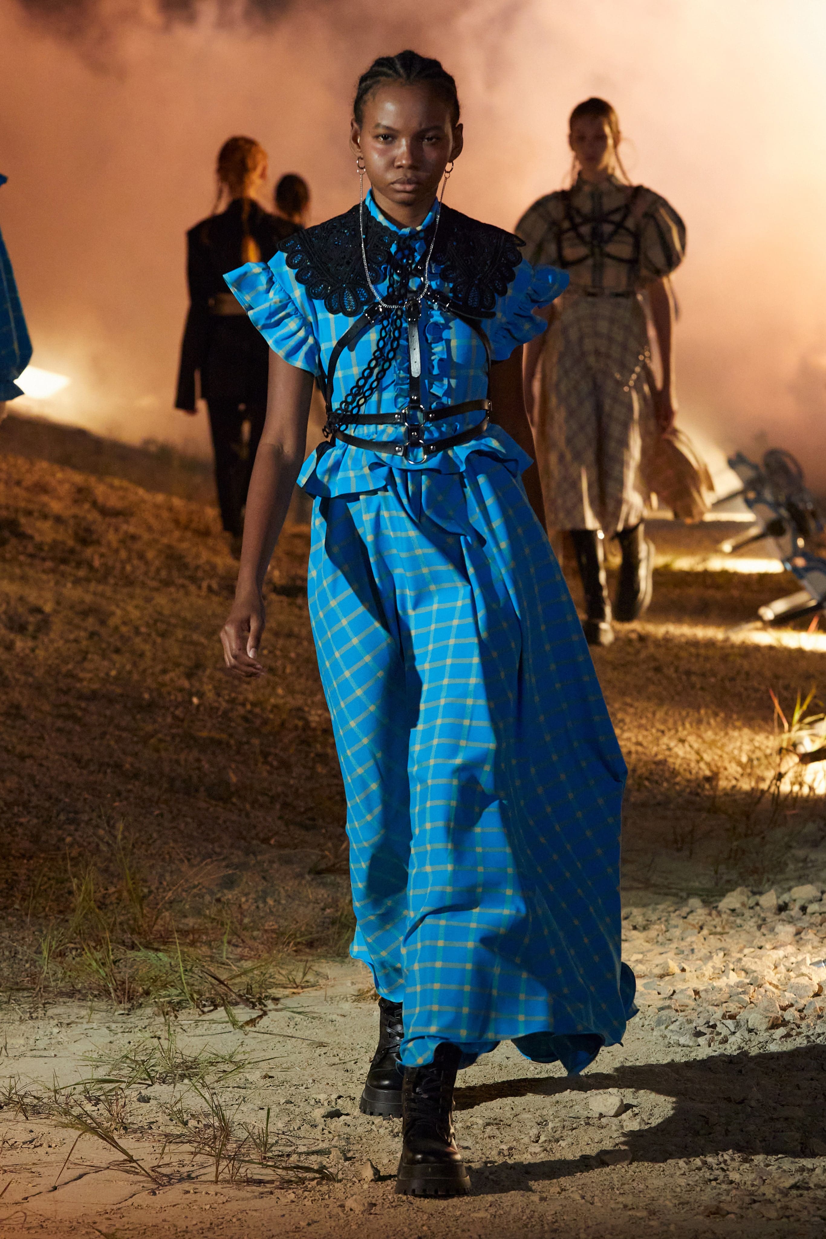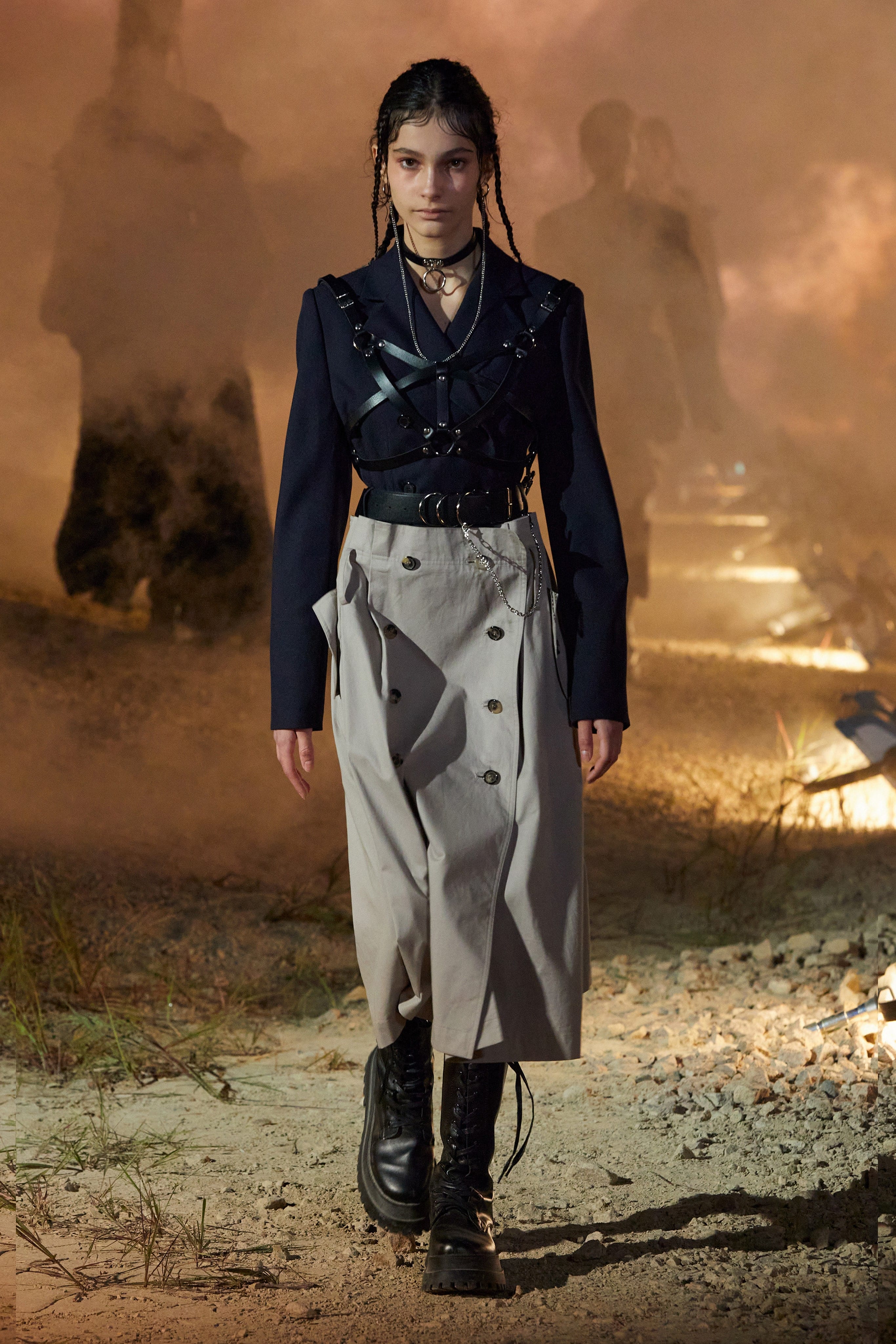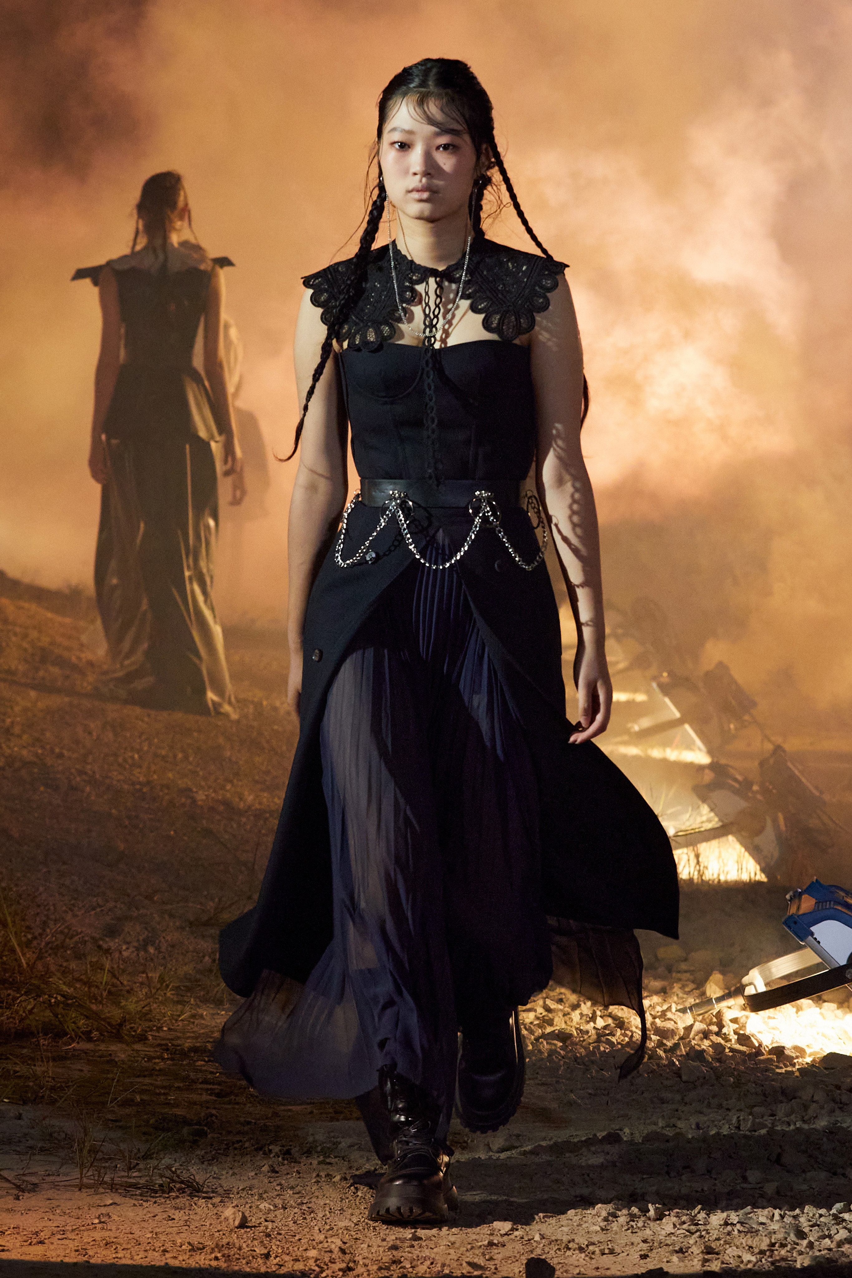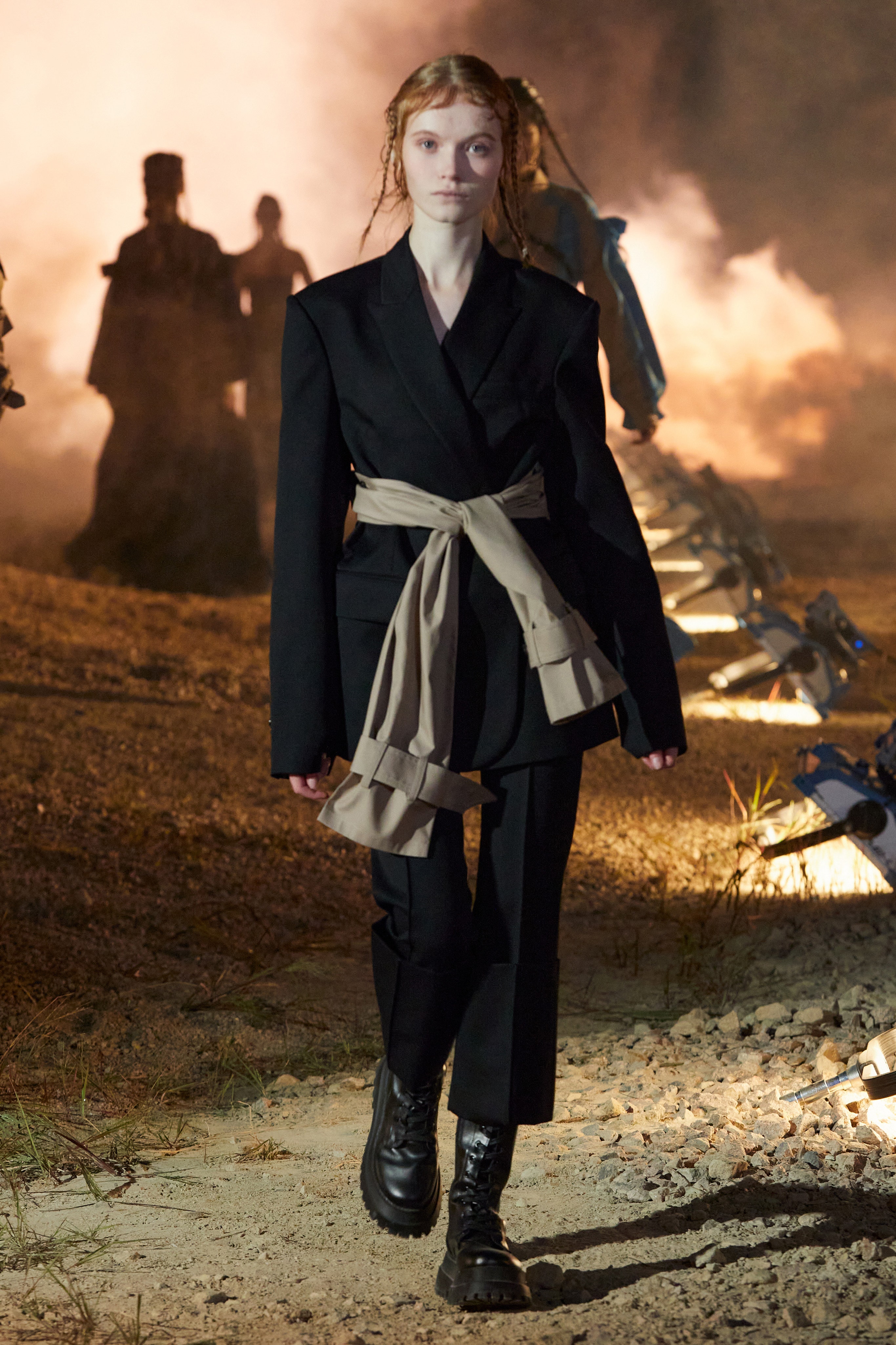 Изящные платья с обозначенной линией талии из шифона и шелка дополнили виниловые рукава, кожаные бондажи и харнессы, а также пояса с цепями. И напротив, в фетишистские кожаные платья дизайнер имплантировал кружевные воротнички и манишки. Коллекция носит название "Ночной странник" — к этому Хуанг пришел после своих прогулок по ночному городу во время карантина. Отзвуки субкультурных стилей из 90-х угадываются в прическах моделей из тонких кос, лоскутах клетчатой ткани в сложных тренчах и многослойных топах, а также в тяжелых лаковых ботинках.