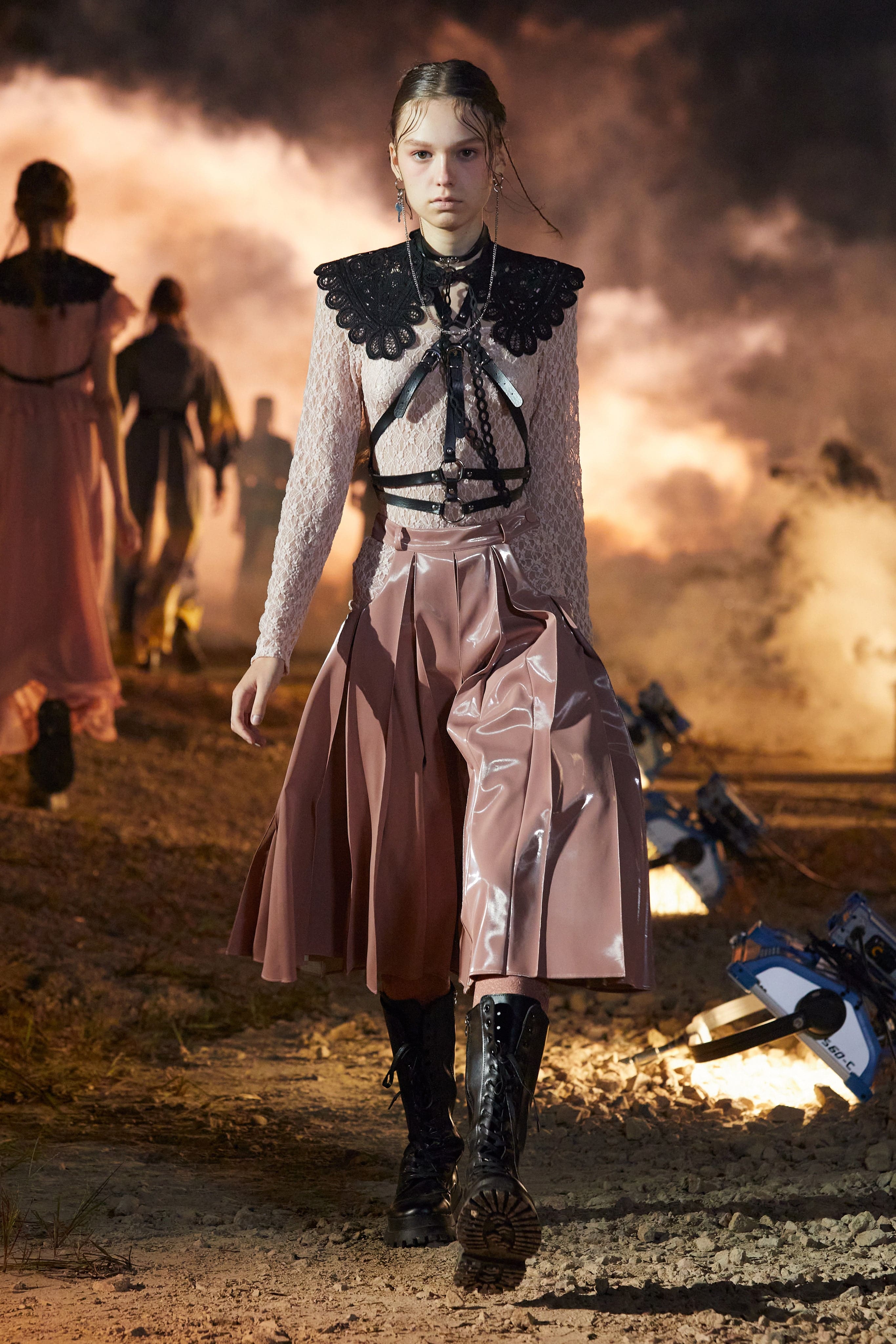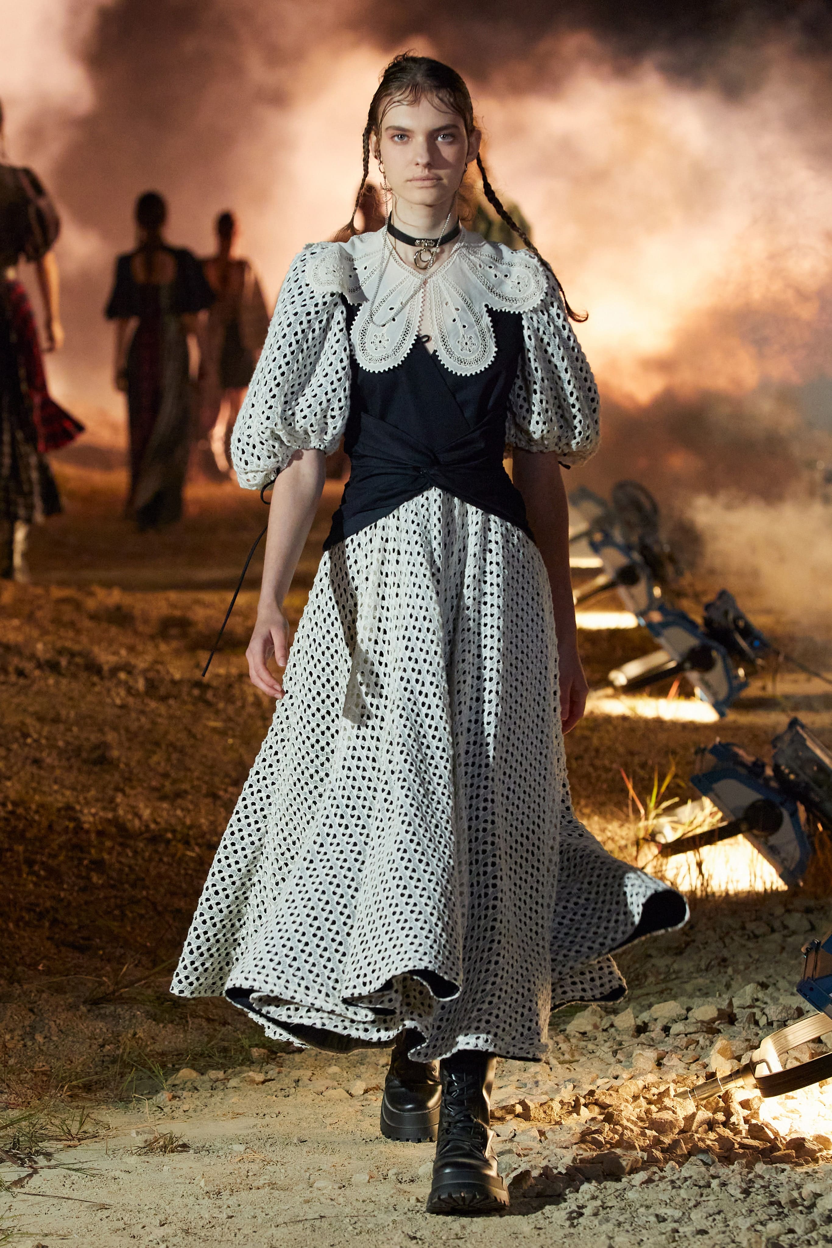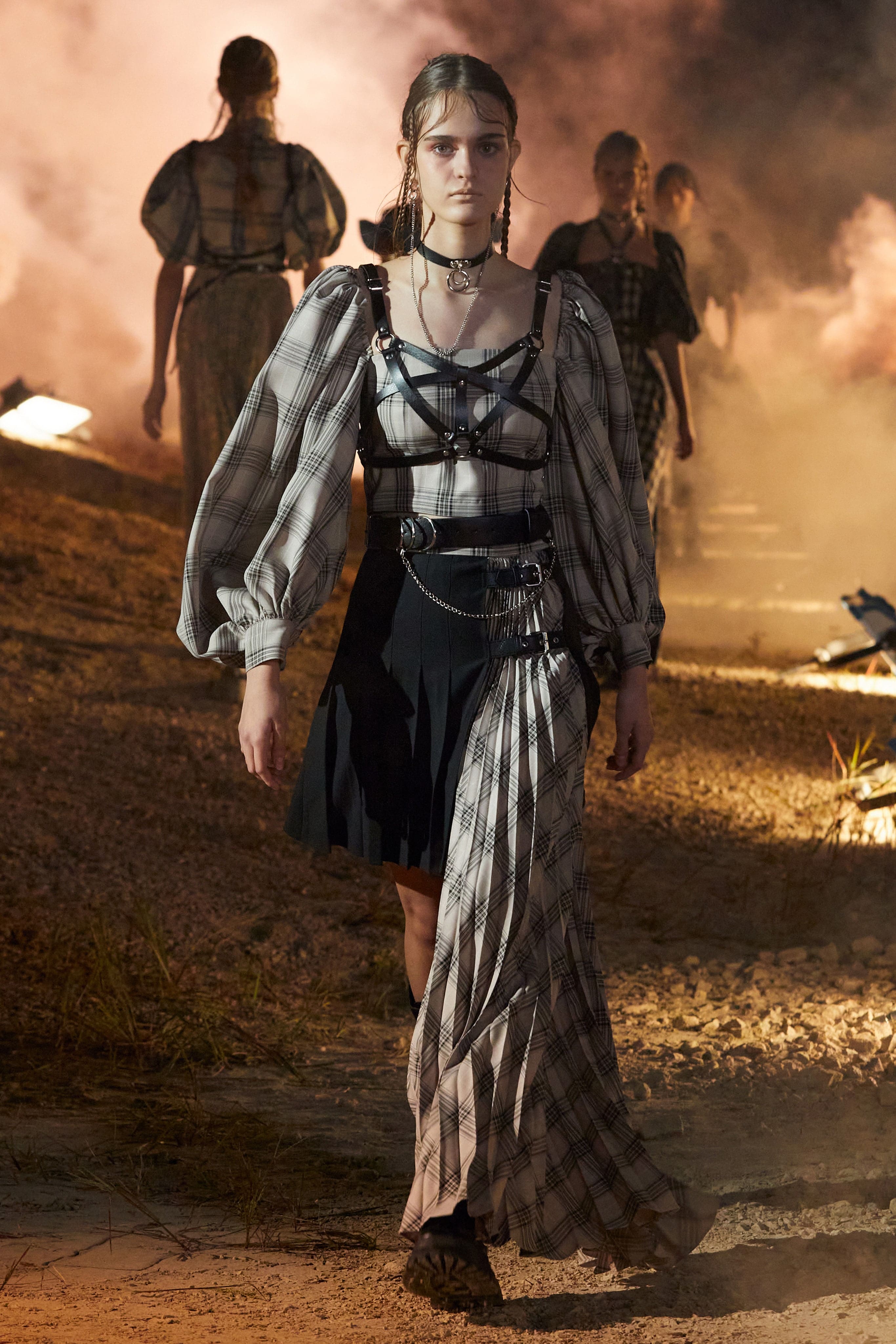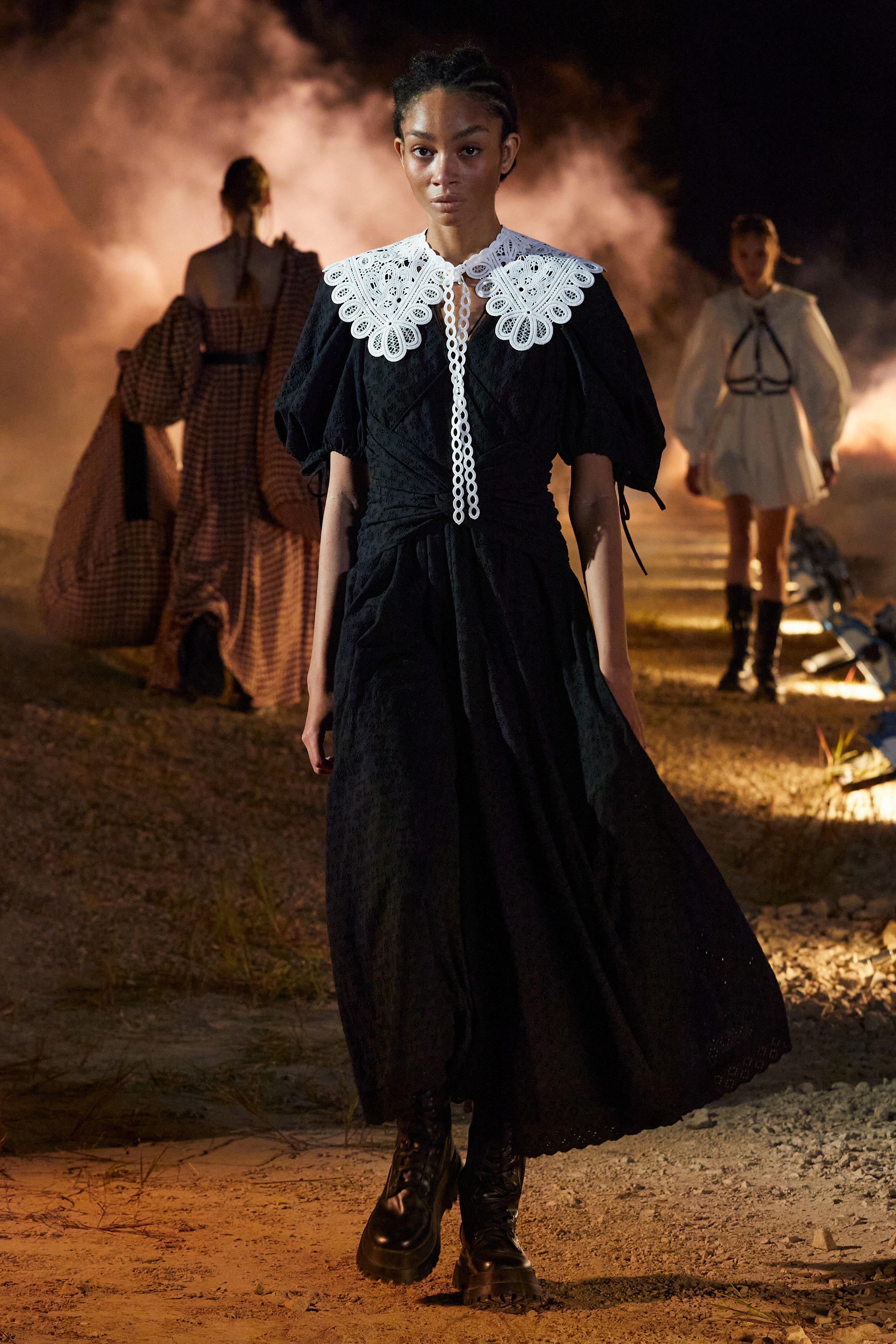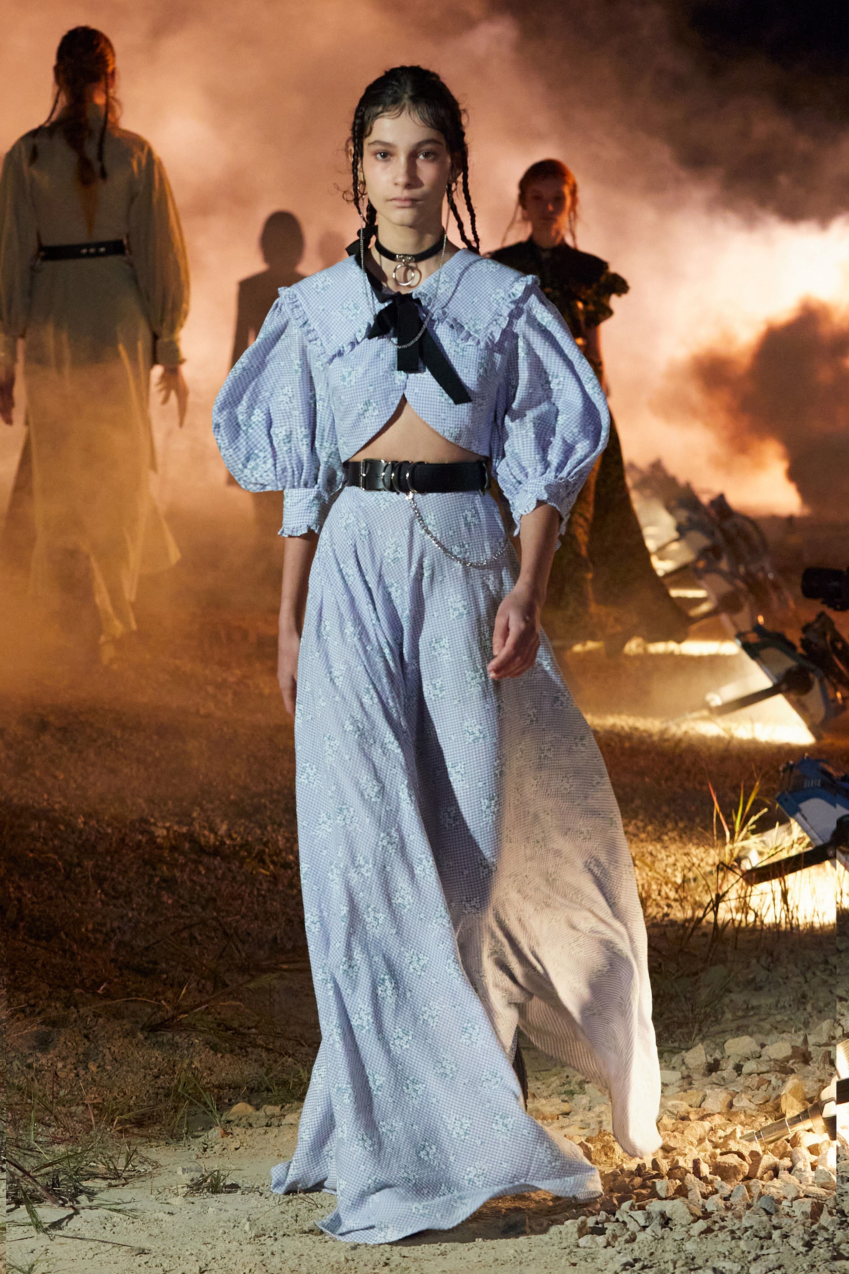 Изящные платья с обозначенной линией талии из шифона и шелка дополнили виниловые рукава, кожаные бондажи и харнессы, а также пояса с цепями. И напротив, в фетишистские кожаные платья дизайнер имплантировал кружевные воротнички и манишки. Коллекция носит название "Ночной странник" — к этому Хуанг пришел после своих прогулок по ночному городу во время карантина. Отзвуки субкультурных стилей из 90-х угадываются в прическах моделей из тонких кос, лоскутах клетчатой ткани в сложных тренчах и многослойных топах, а также в тяжелых лаковых ботинках.