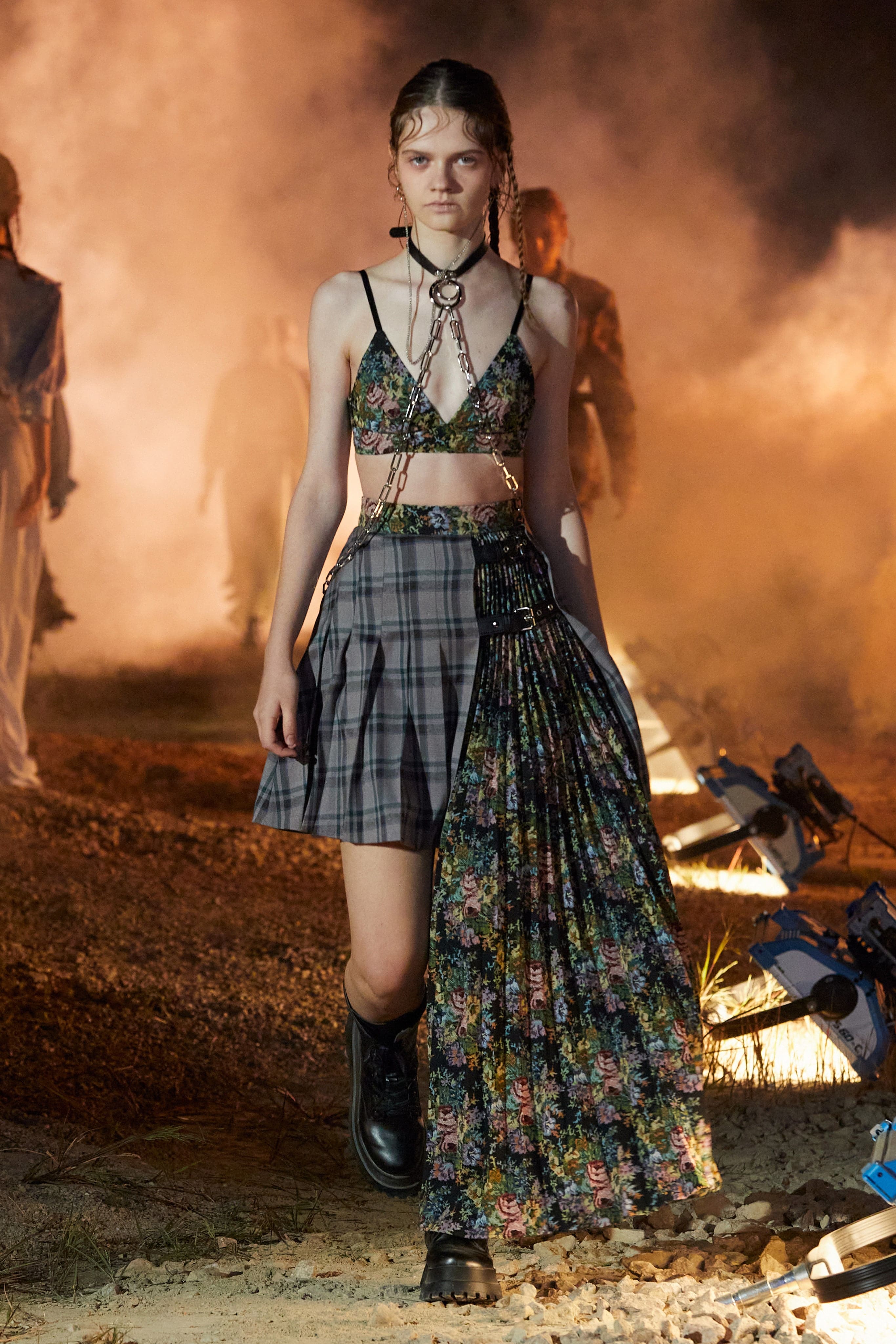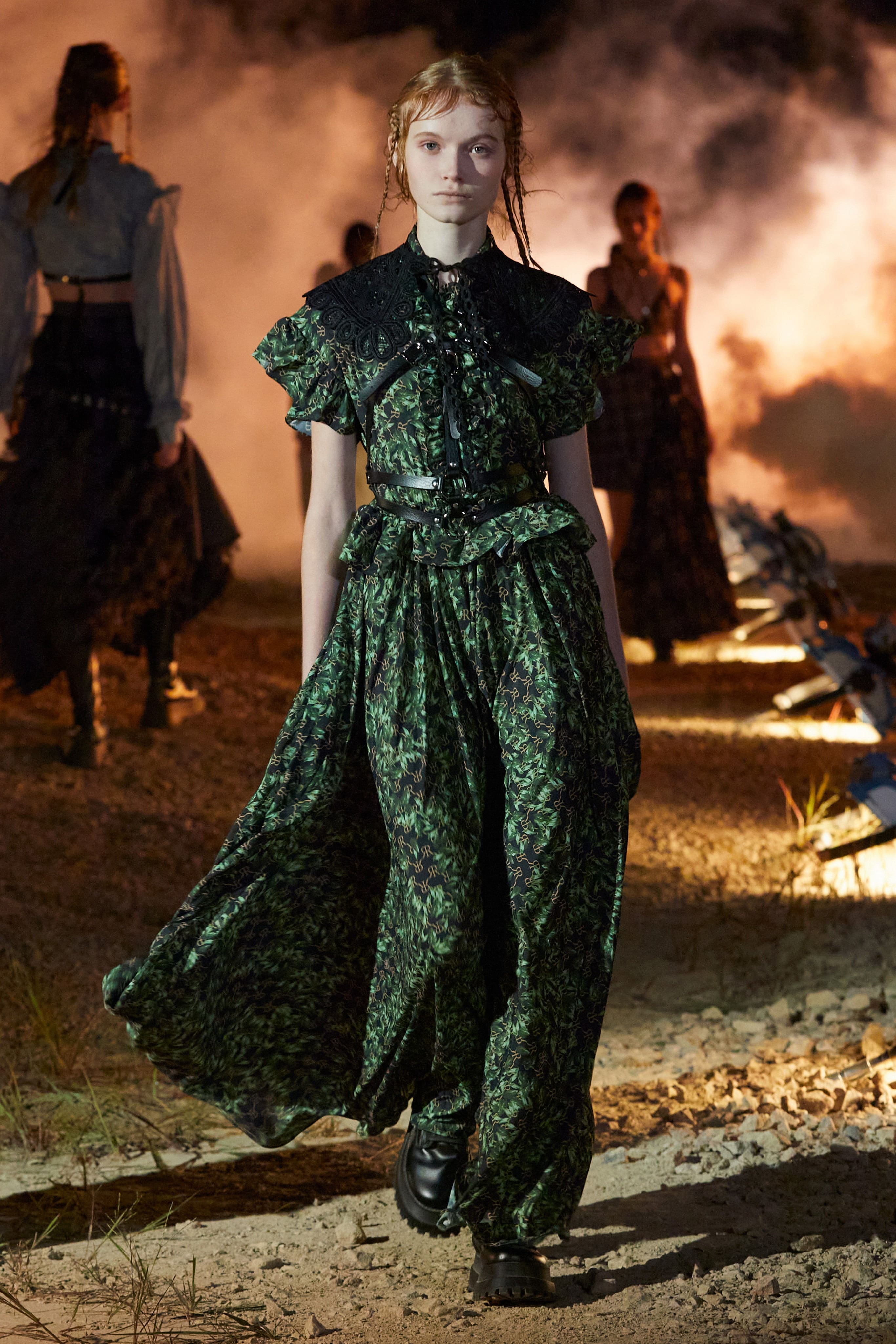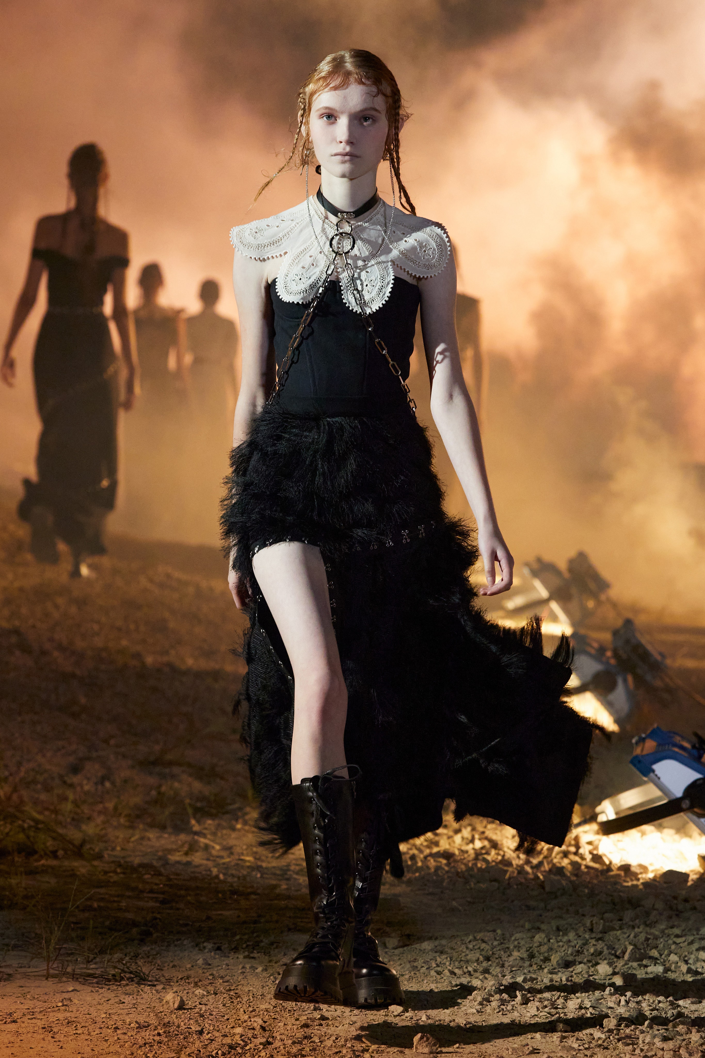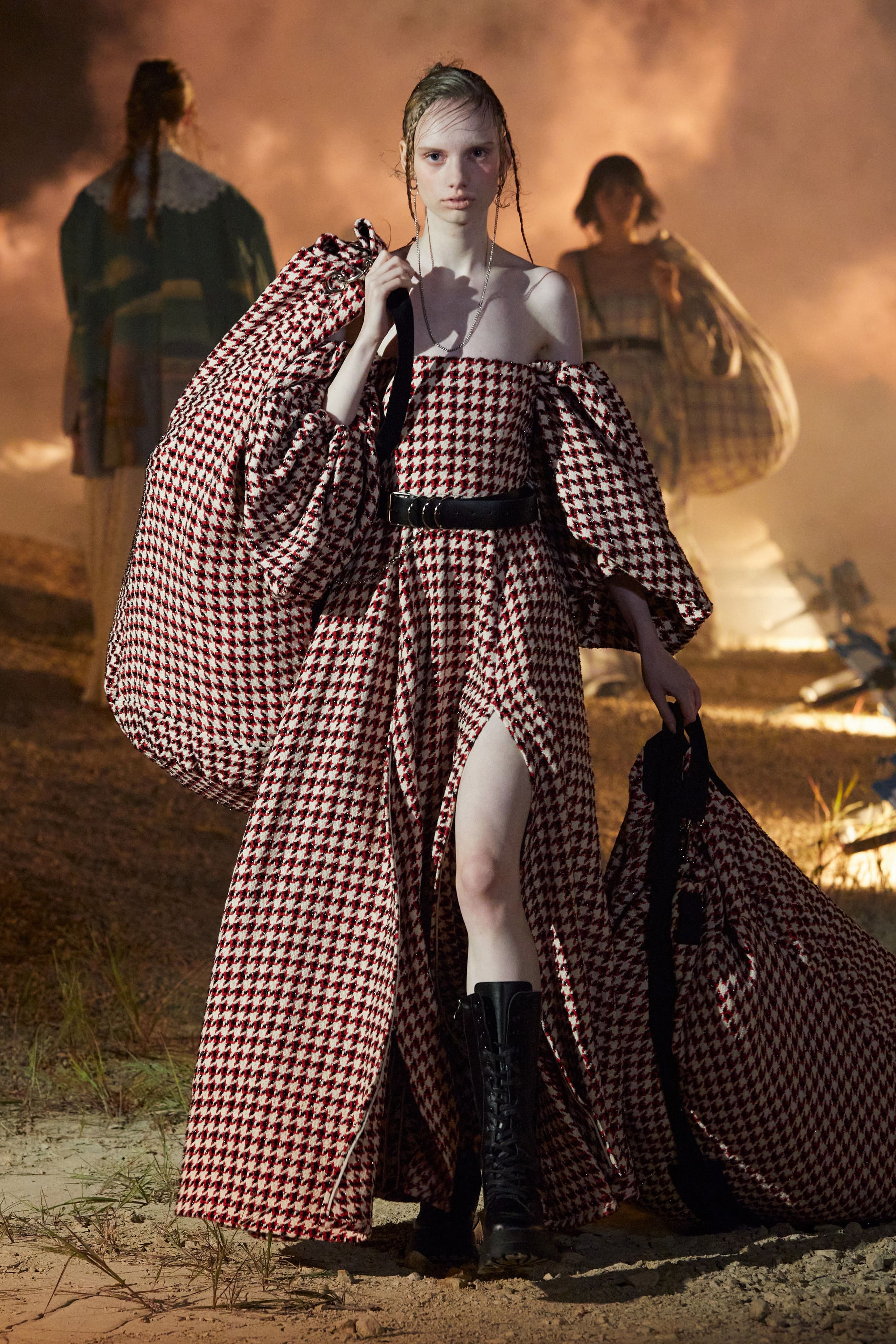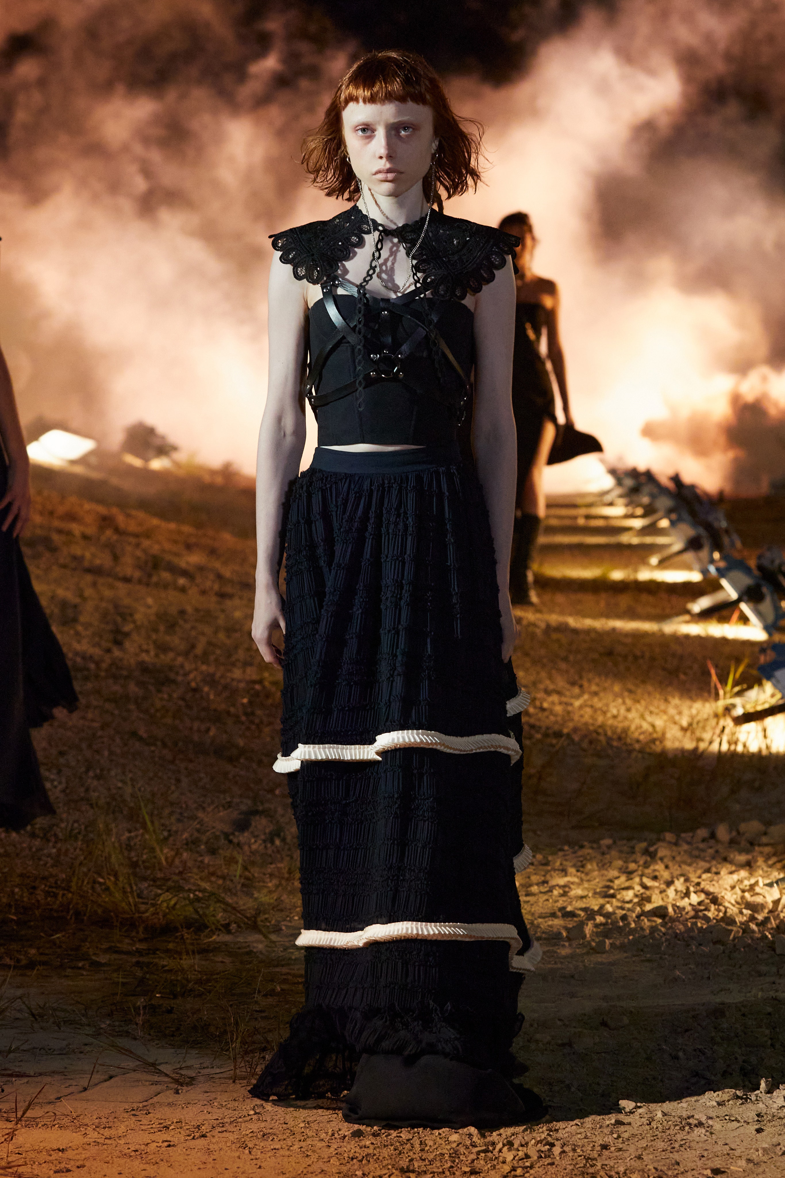 Изящные платья с обозначенной линией талии из шифона и шелка дополнили виниловые рукава, кожаные бондажи и харнессы, а также пояса с цепями. И напротив, в фетишистские кожаные платья дизайнер имплантировал кружевные воротнички и манишки. Коллекция носит название "Ночной странник" — к этому Хуанг пришел после своих прогулок по ночному городу во время карантина. Отзвуки субкультурных стилей из 90-х угадываются в прическах моделей из тонких кос, лоскутах клетчатой ткани в сложных тренчах и многослойных топах, а также в тяжелых лаковых ботинках.