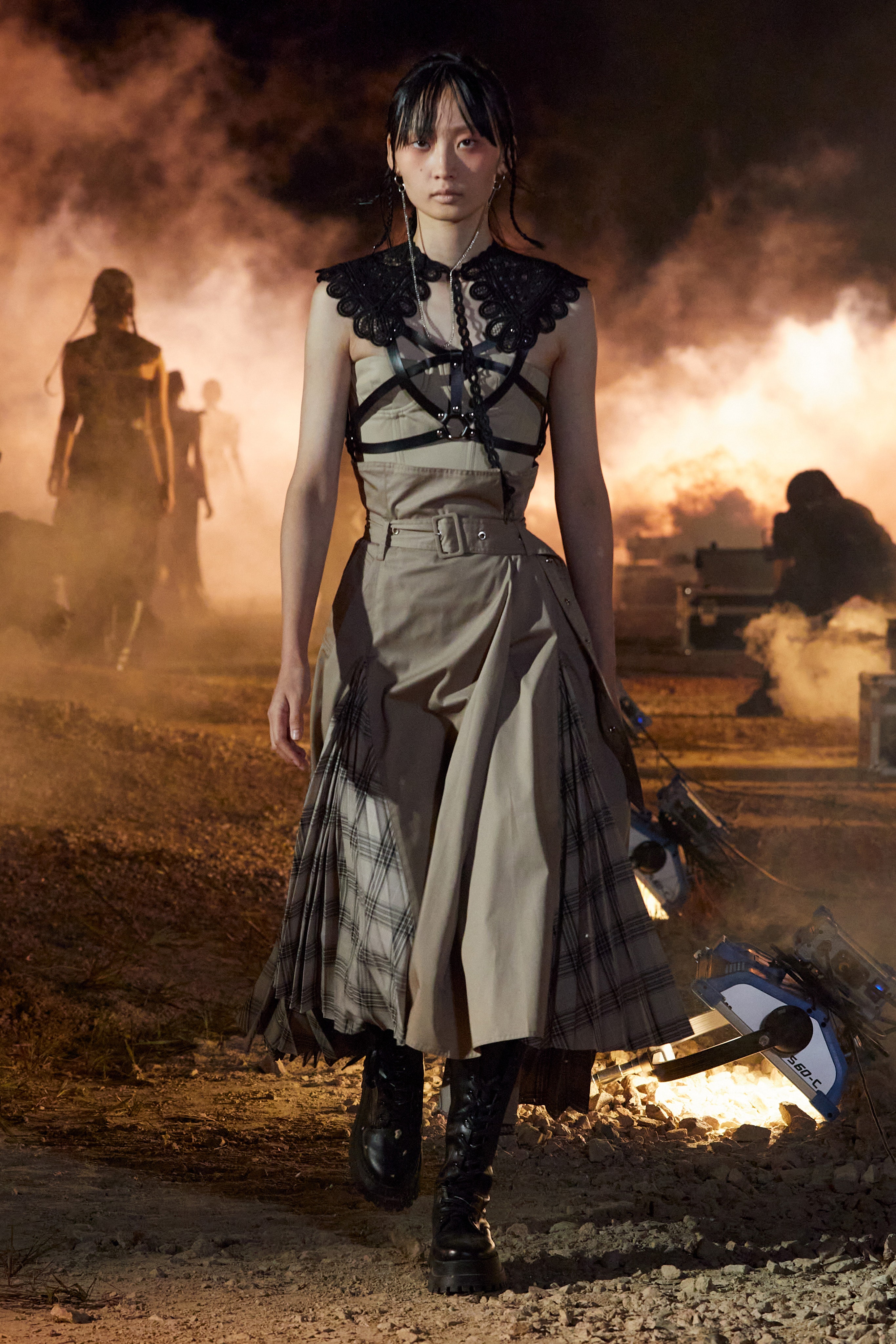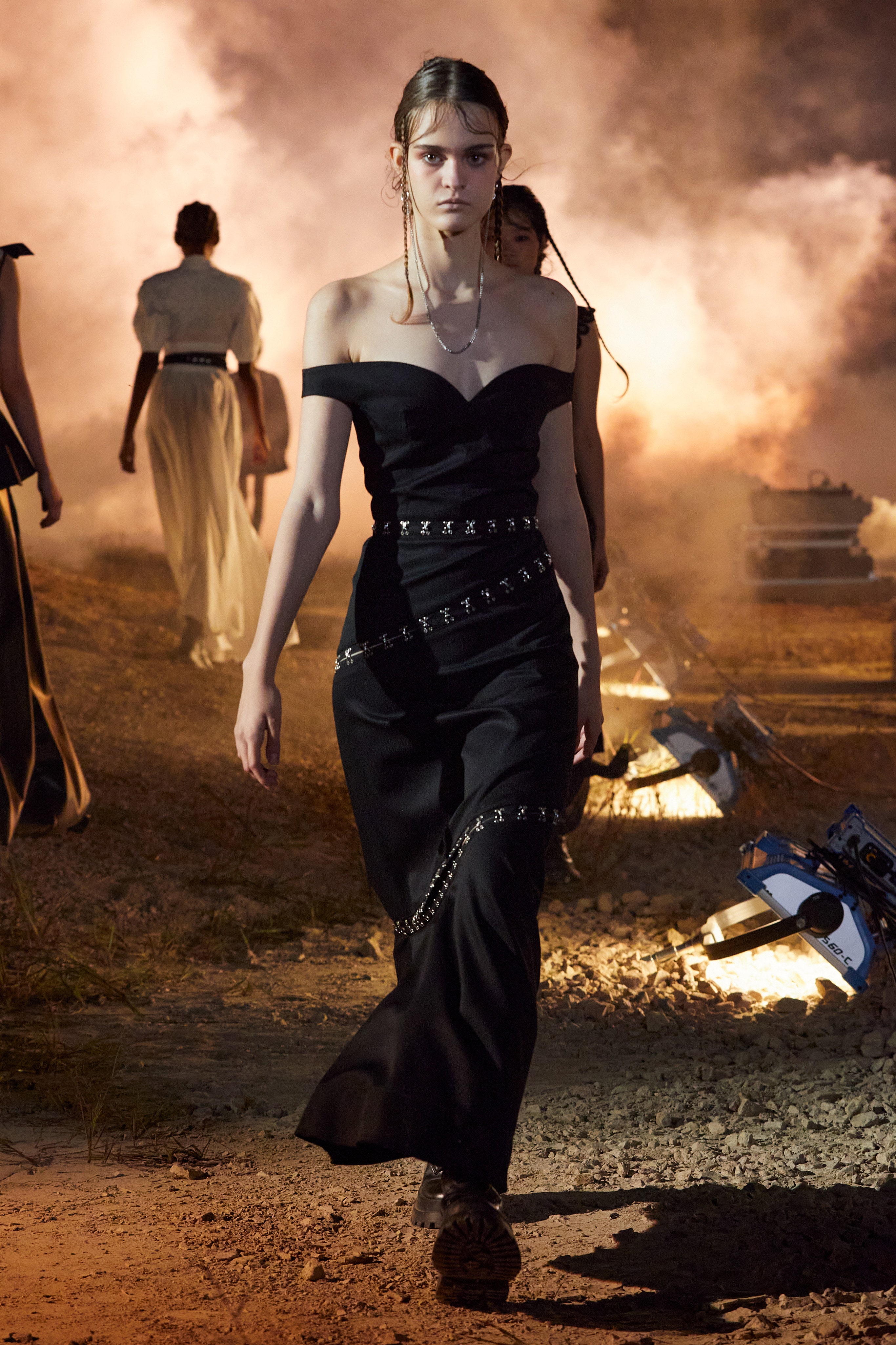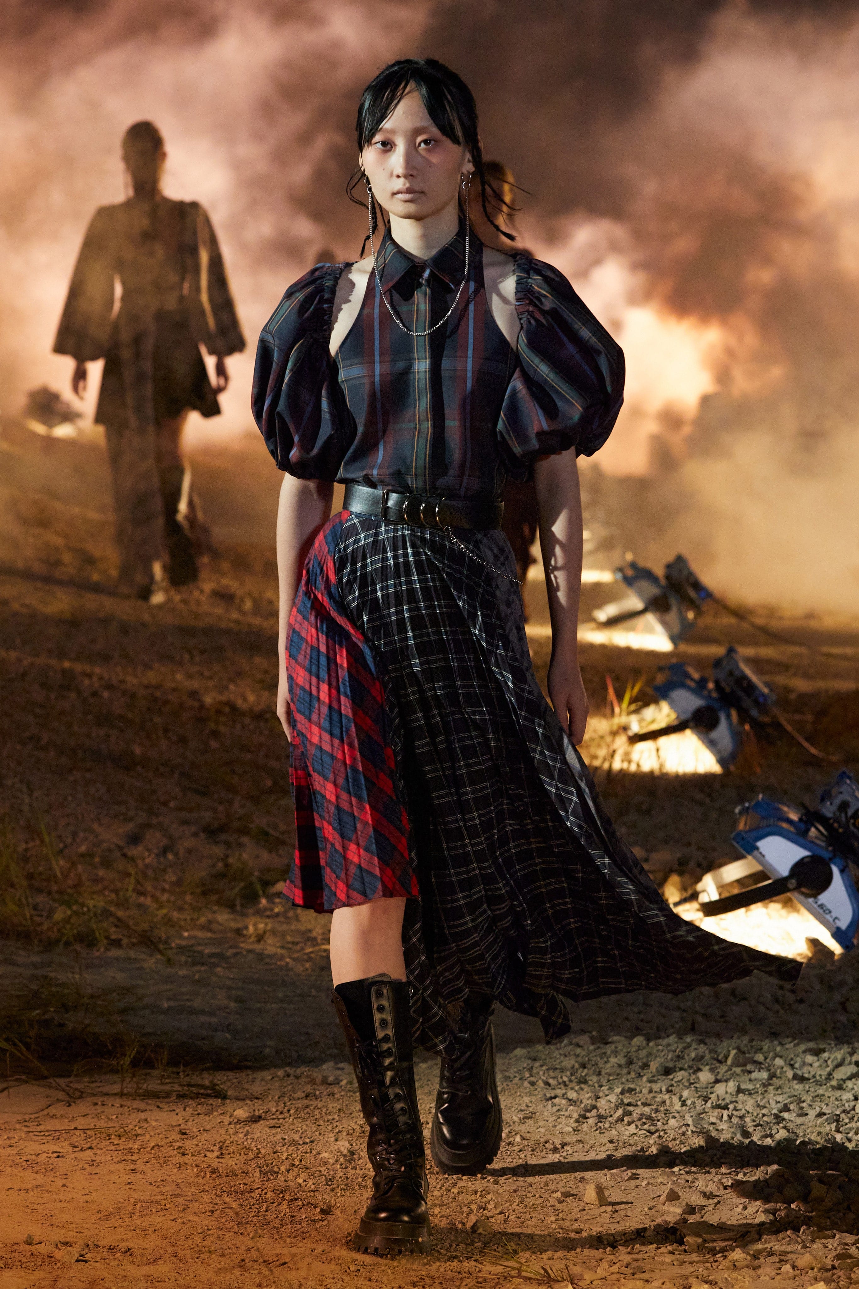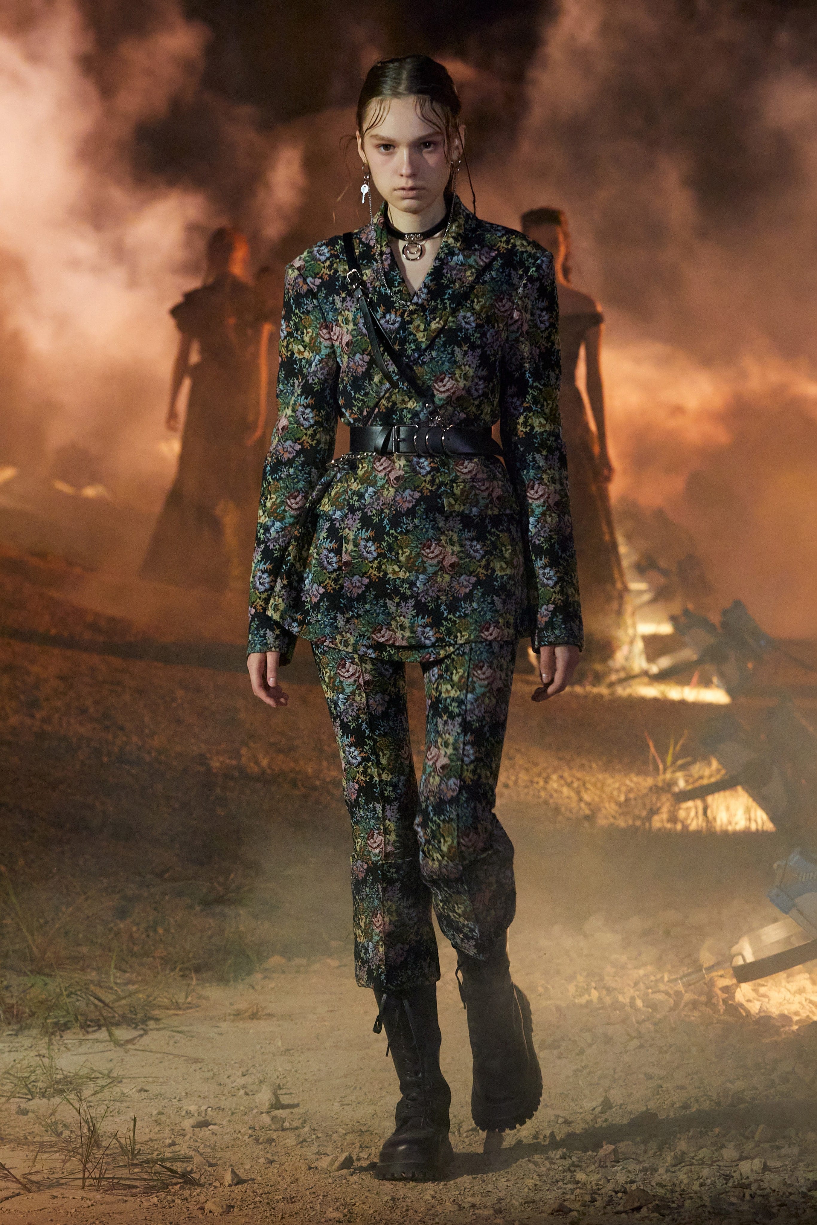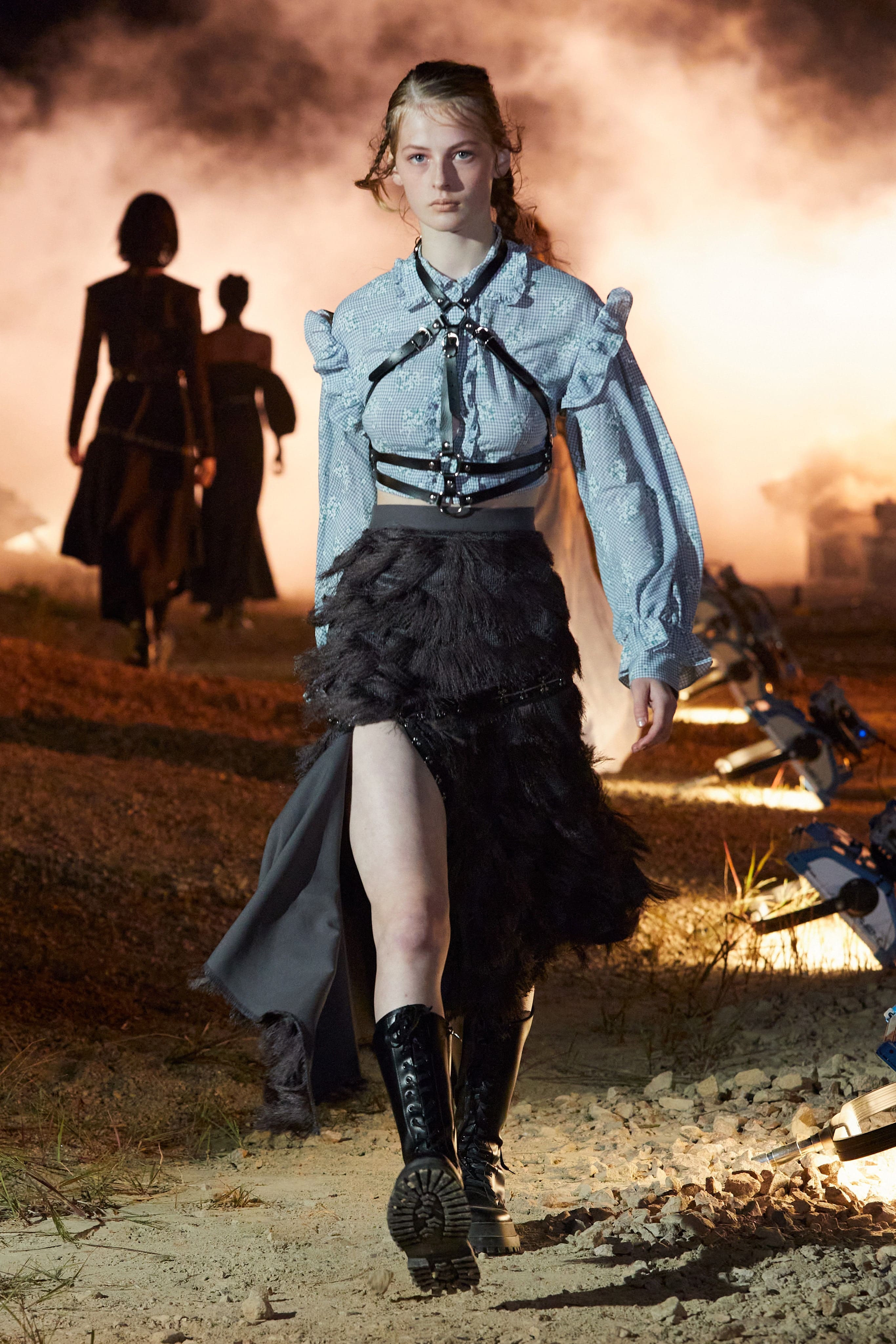 Изящные платья с обозначенной линией талии из шифона и шелка дополнили виниловые рукава, кожаные бондажи и харнессы, а также пояса с цепями. И напротив, в фетишистские кожаные платья дизайнер имплантировал кружевные воротнички и манишки. Коллекция носит название "Ночной странник" — к этому Хуанг пришел после своих прогулок по ночному городу во время карантина. Отзвуки субкультурных стилей из 90-х угадываются в прическах моделей из тонких кос, лоскутах клетчатой ткани в сложных тренчах и многослойных топах, а также в тяжелых лаковых ботинках.