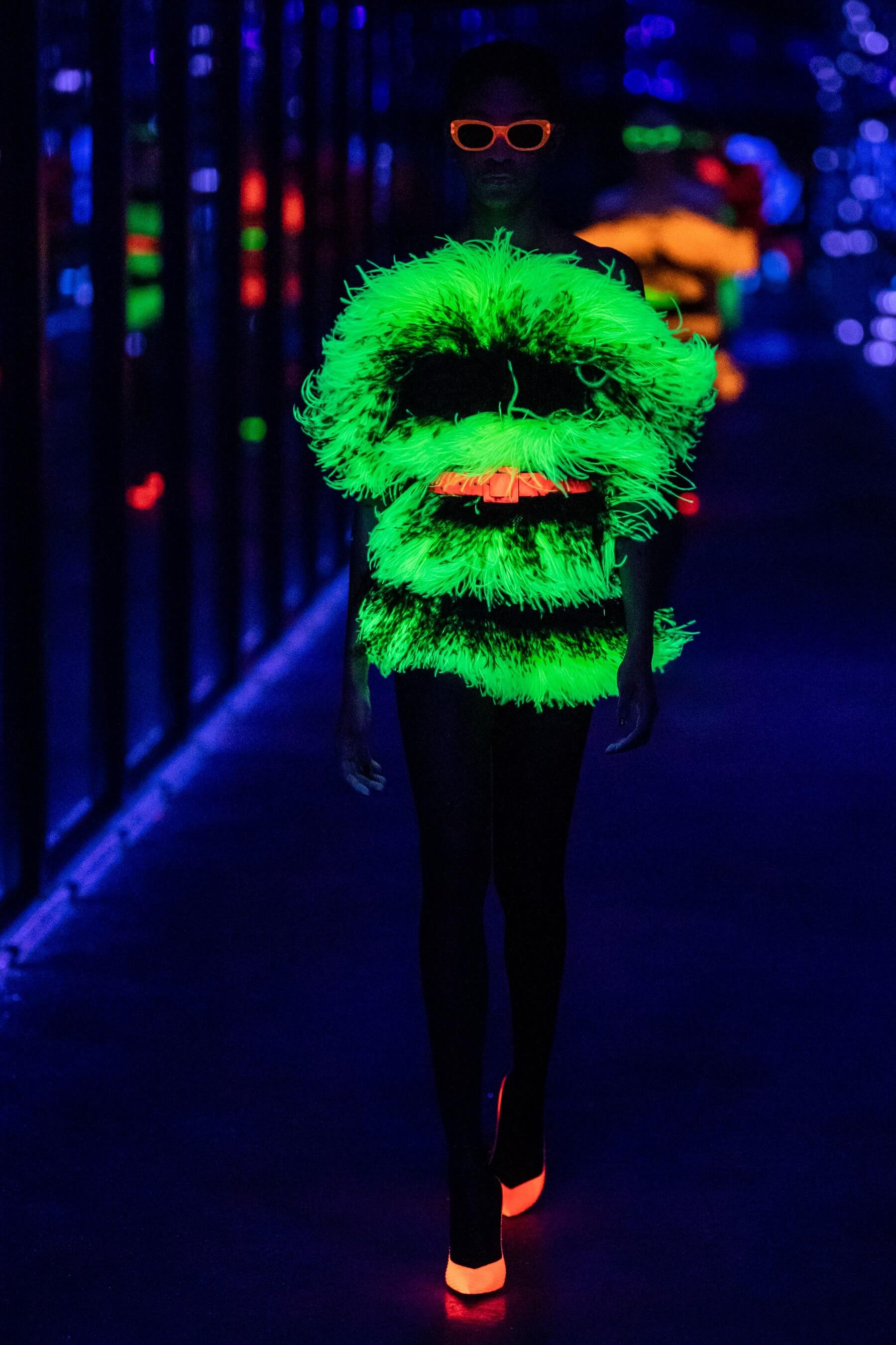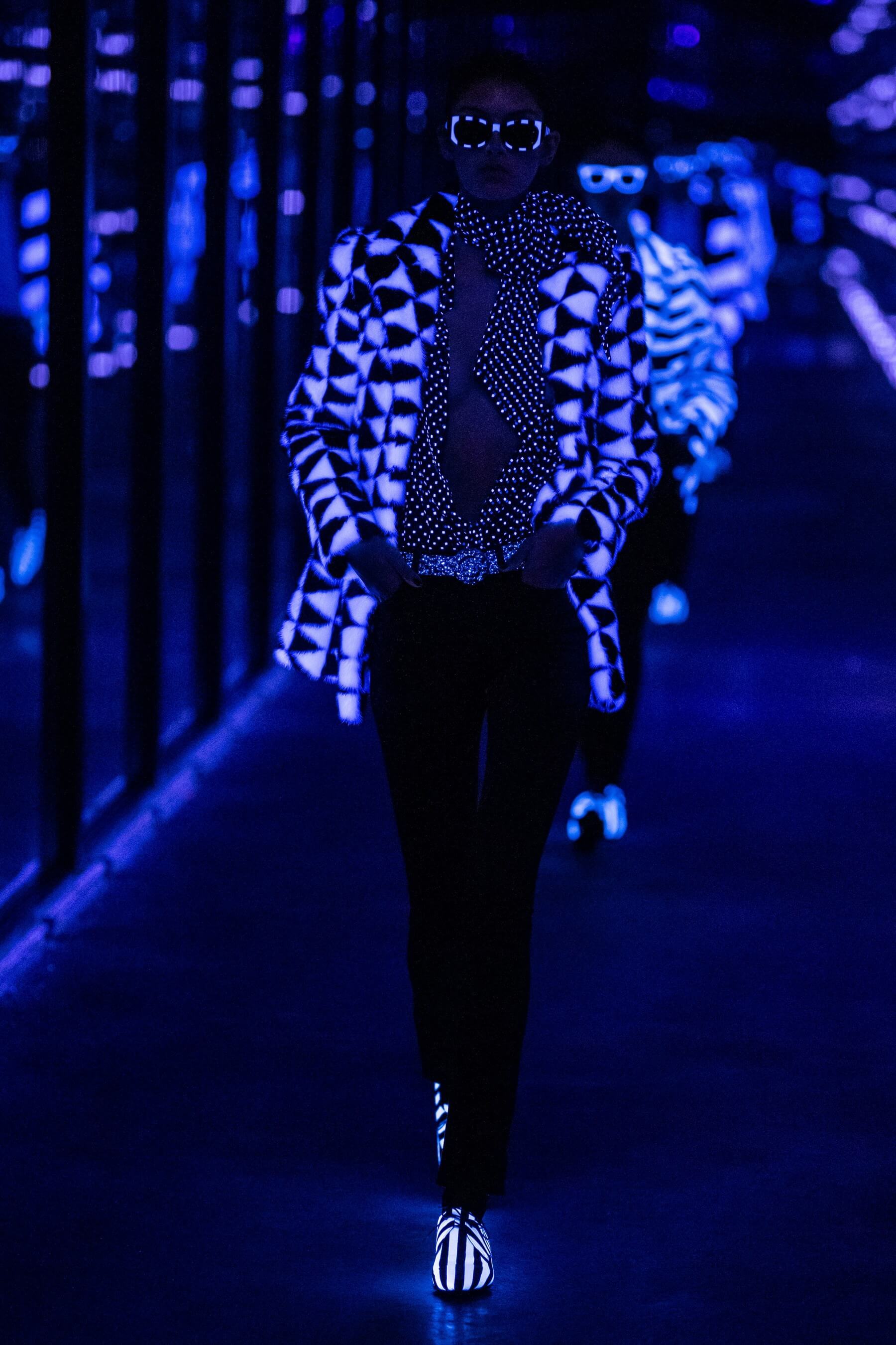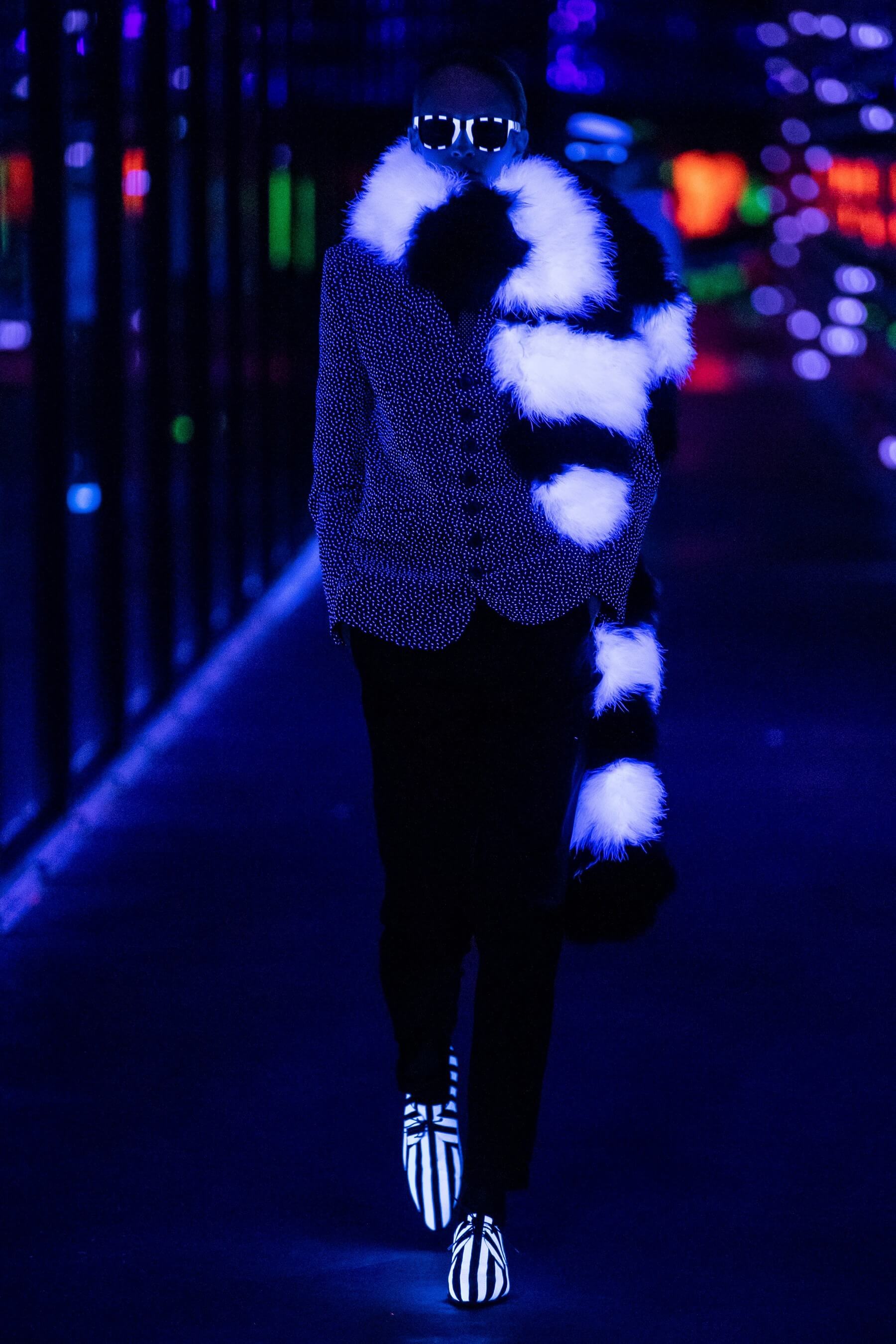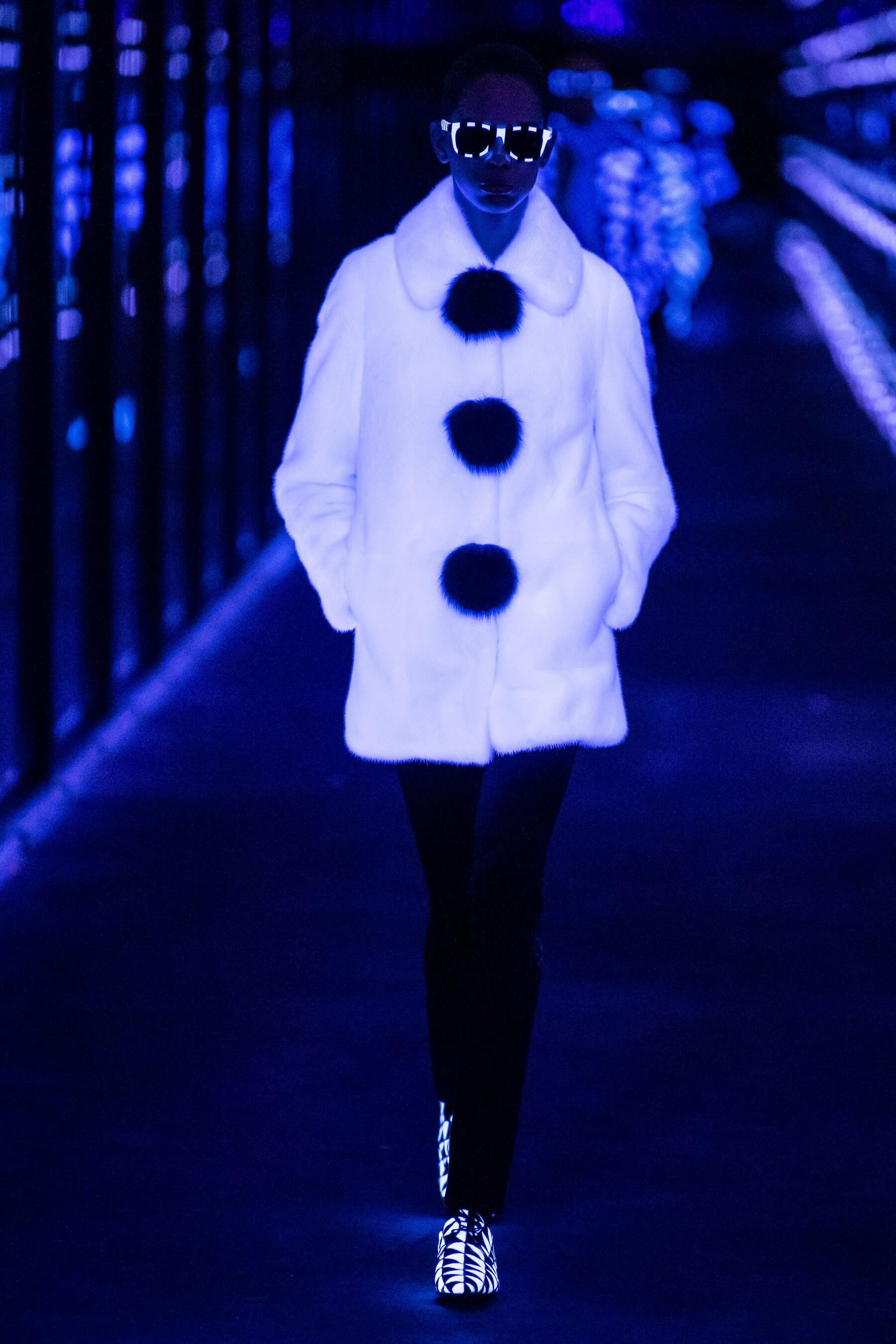 И наконец третий, финальный акт, который поверг зрителей в настоящее изумление, был похож на эстетическую галлюцинацию. Он прошел в неоновом свете с обратной стороны зеркала, что создавало иллюзию параллельного мира: модели превратились в фантастических пришельцев из киберпространства, появляясь то в полосатых пиджаках и платьях в светящийся горох и с геометричными шляпками на головах, то во флюоресцентных платьях маркерных цветов и кислотных пышных шубах.