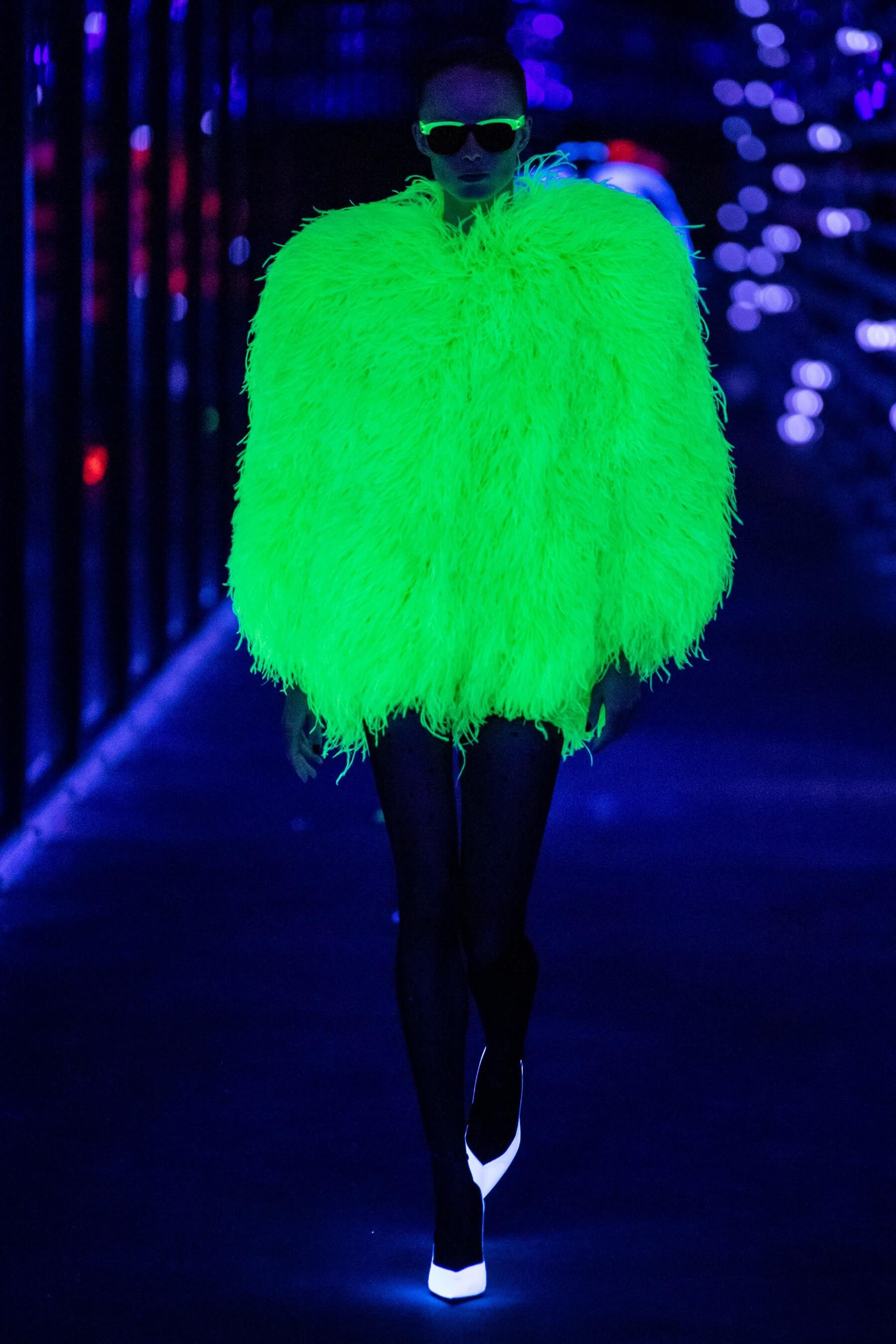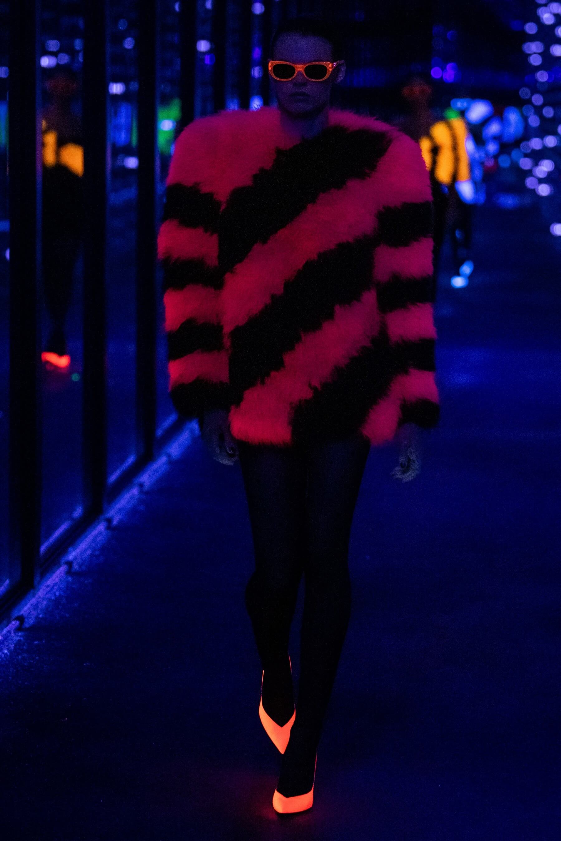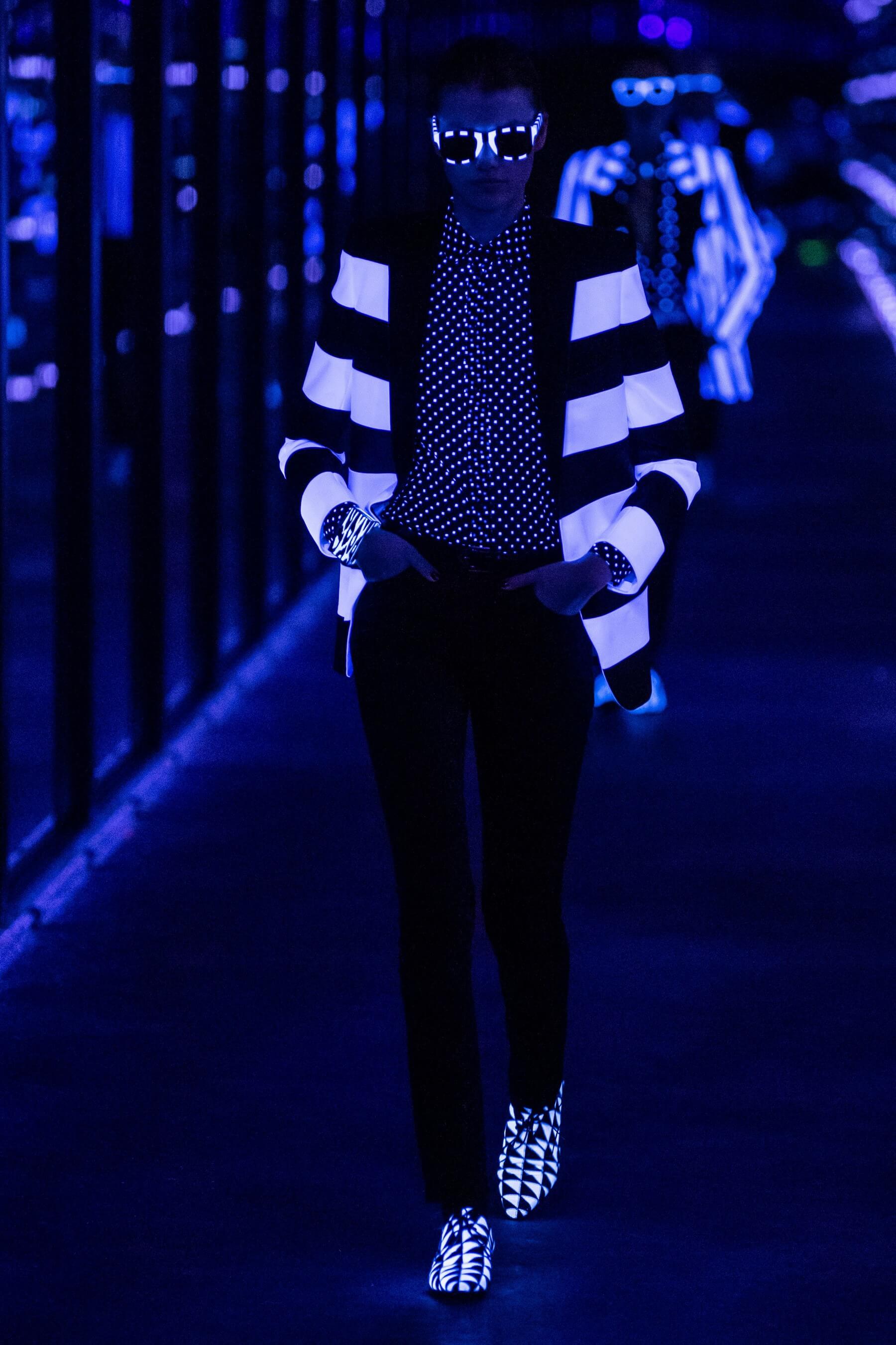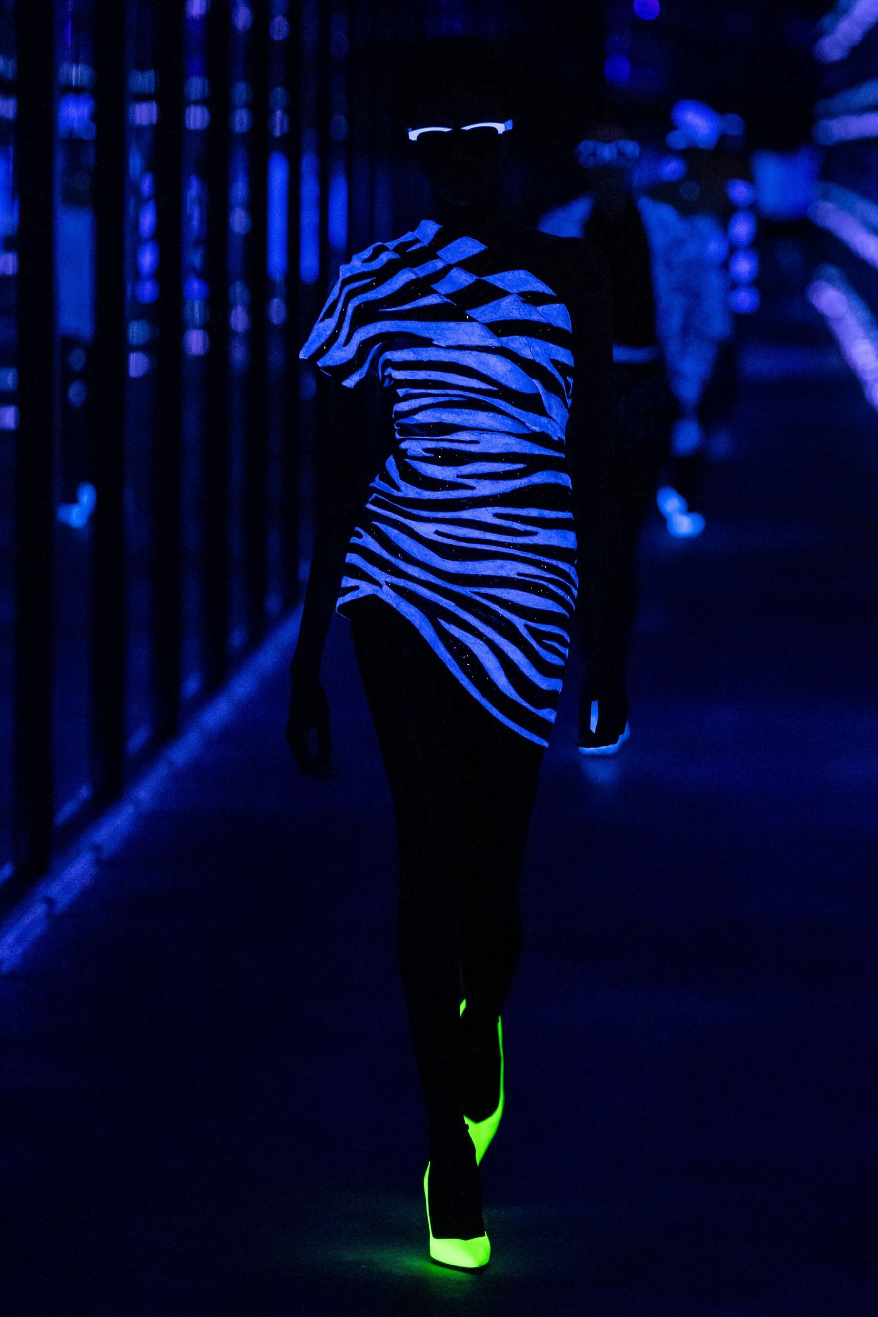 И наконец третий, финальный акт, который поверг зрителей в настоящее изумление, был похож на эстетическую галлюцинацию. Он прошел в неоновом свете с обратной стороны зеркала, что создавало иллюзию параллельного мира: модели превратились в фантастических пришельцев из киберпространства, появляясь то в полосатых пиджаках и платьях в светящийся горох и с геометричными шляпками на головах, то во флюоресцентных платьях маркерных цветов и кислотных пышных шубах.