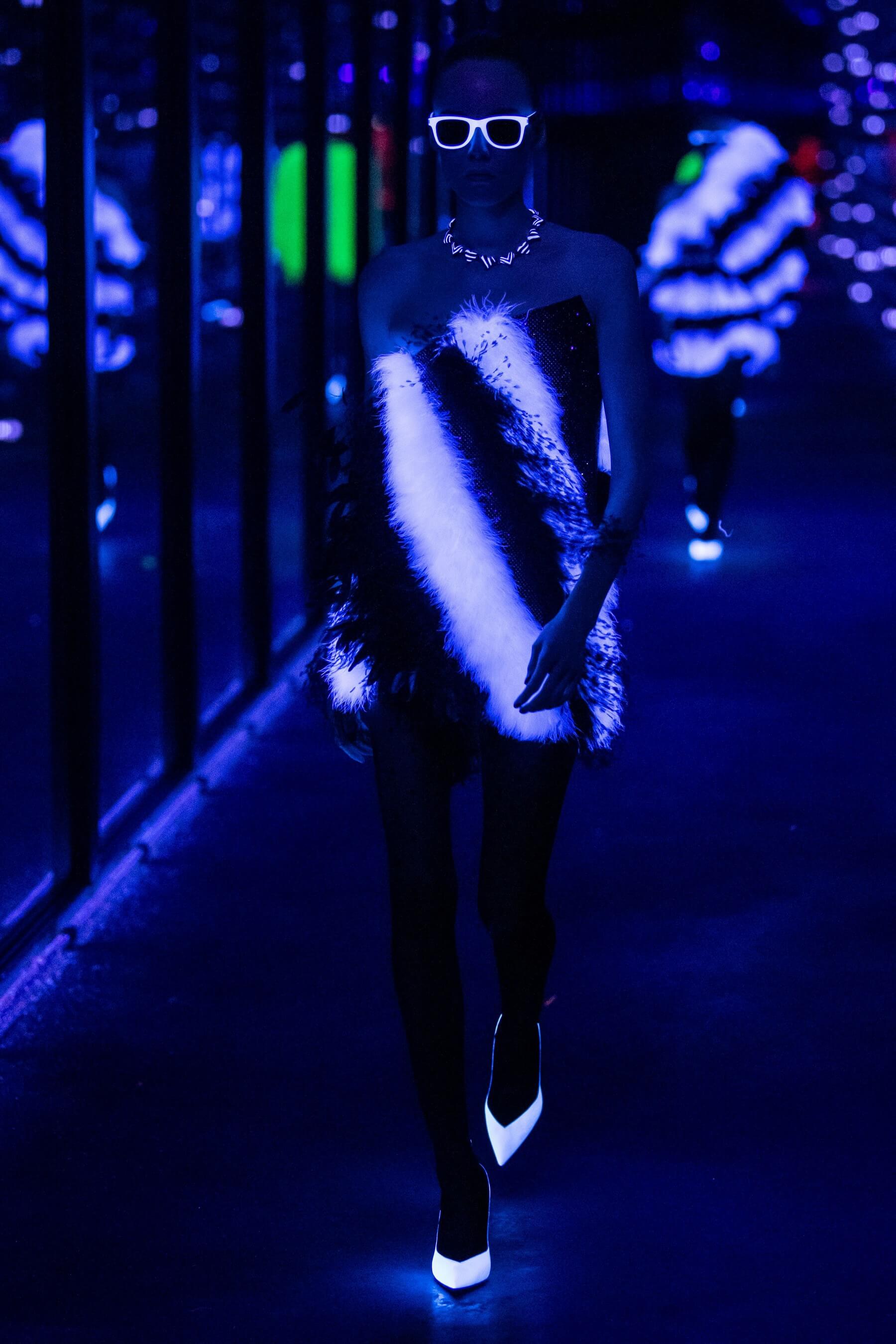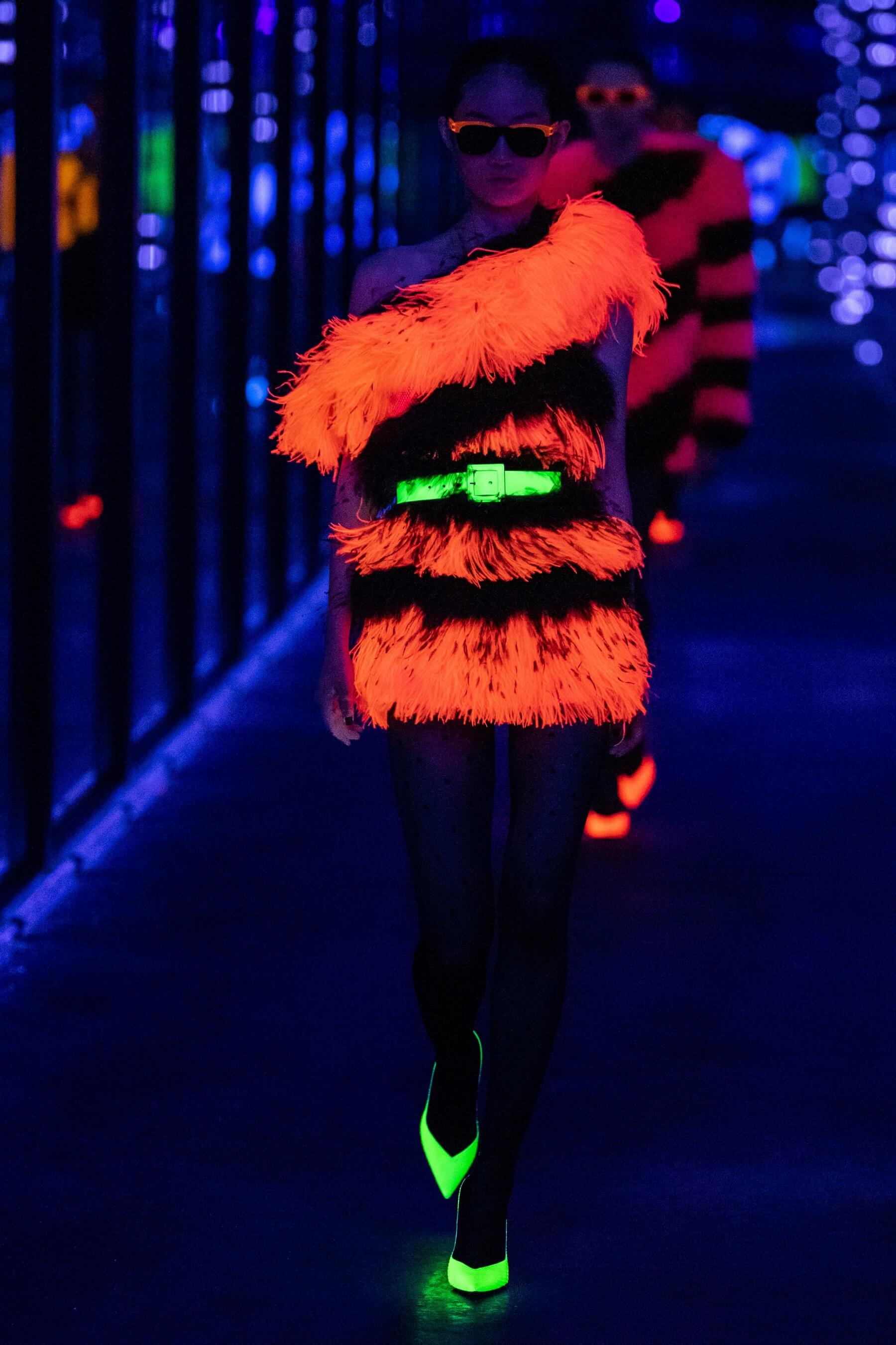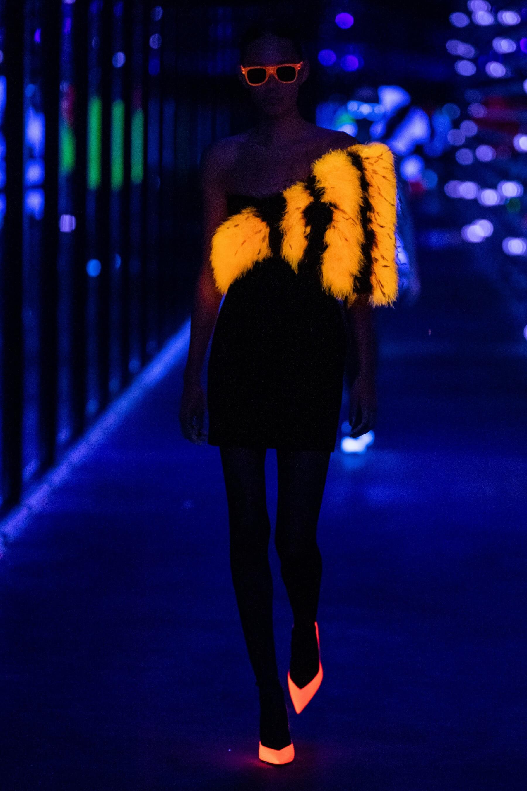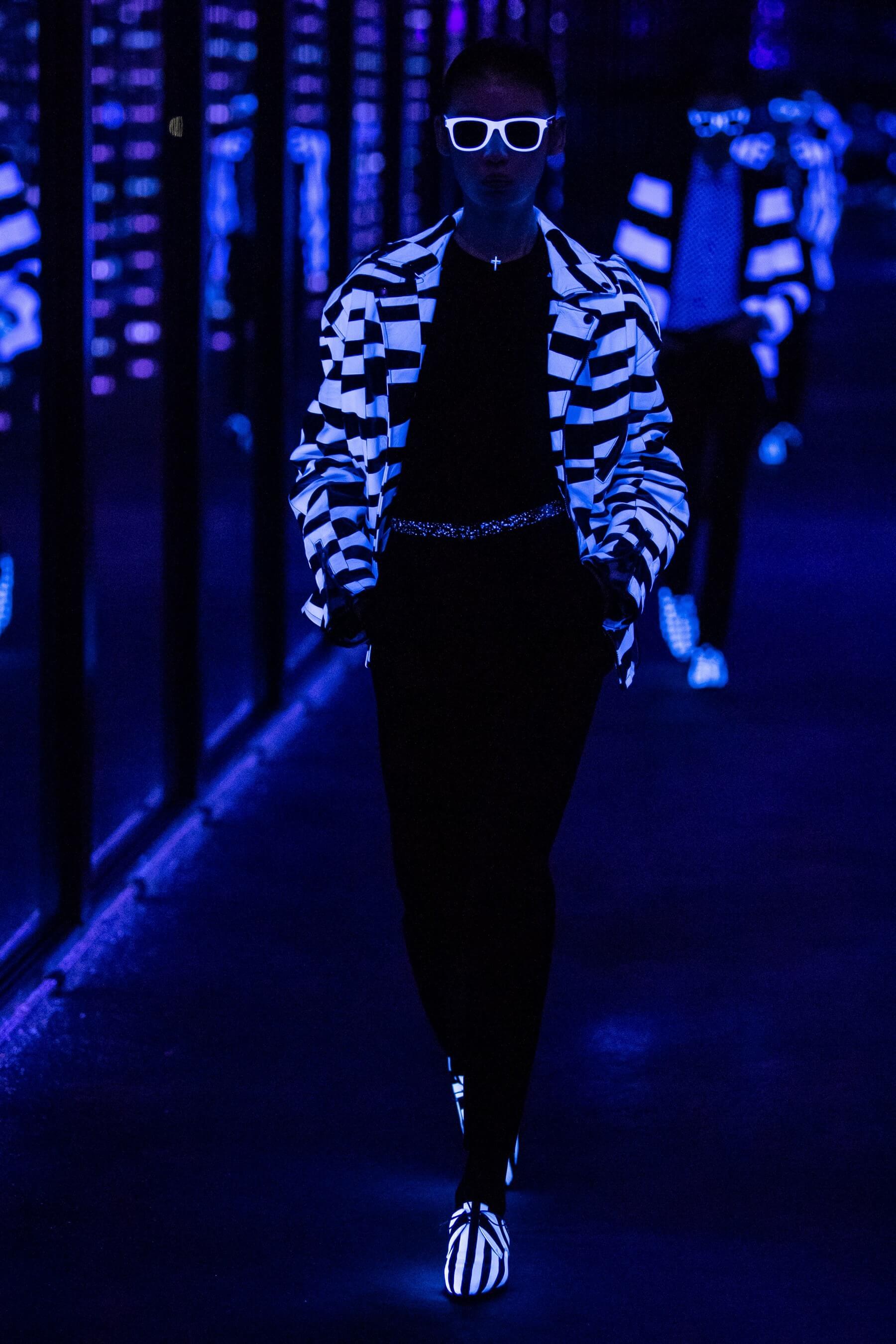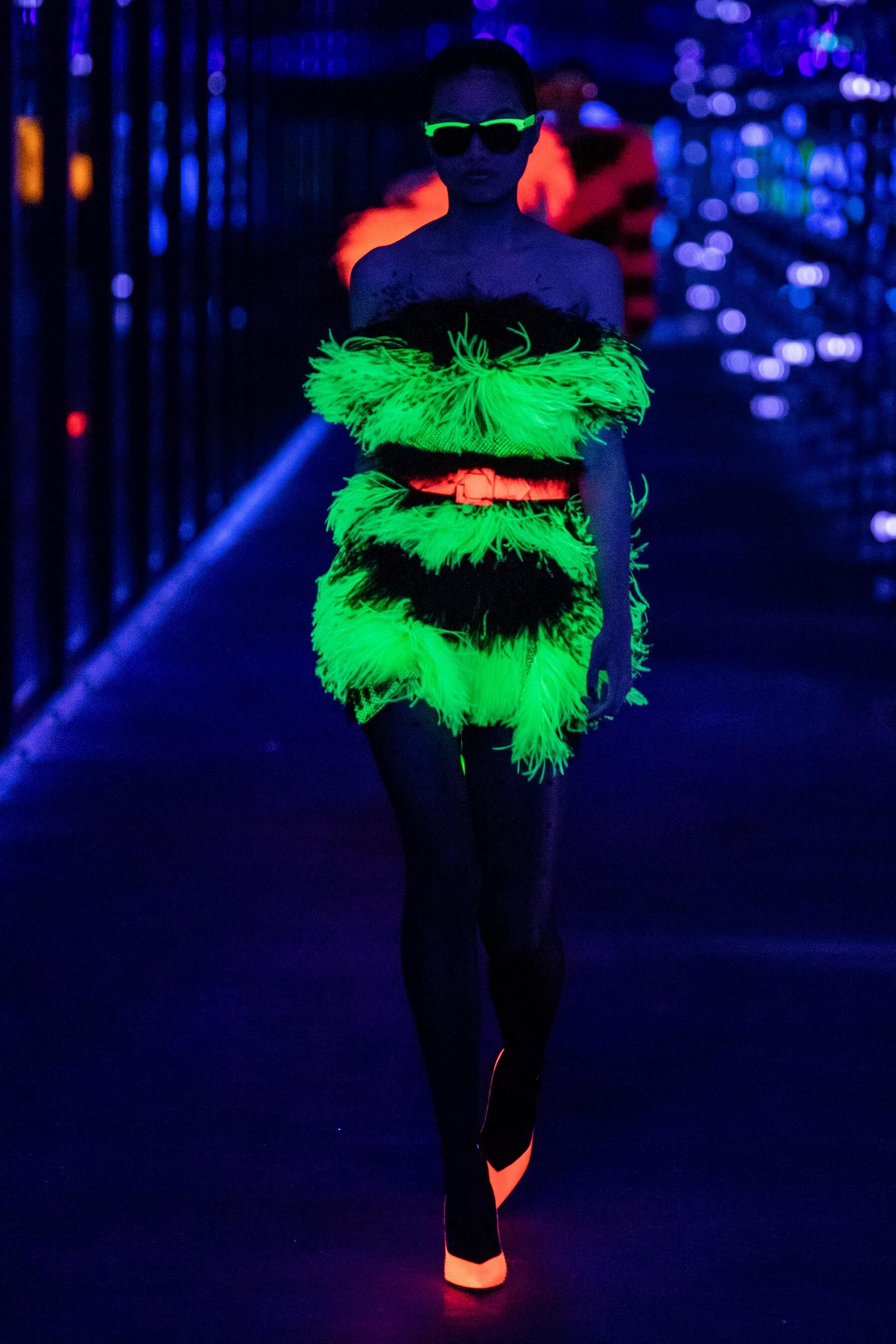 И наконец третий, финальный акт, который поверг зрителей в настоящее изумление, был похож на эстетическую галлюцинацию. Он прошел в неоновом свете с обратной стороны зеркала, что создавало иллюзию параллельного мира: модели превратились в фантастических пришельцев из киберпространства, появляясь то в полосатых пиджаках и платьях в светящийся горох и с геометричными шляпками на головах, то во флюоресцентных платьях маркерных цветов и кислотных пышных шубах.