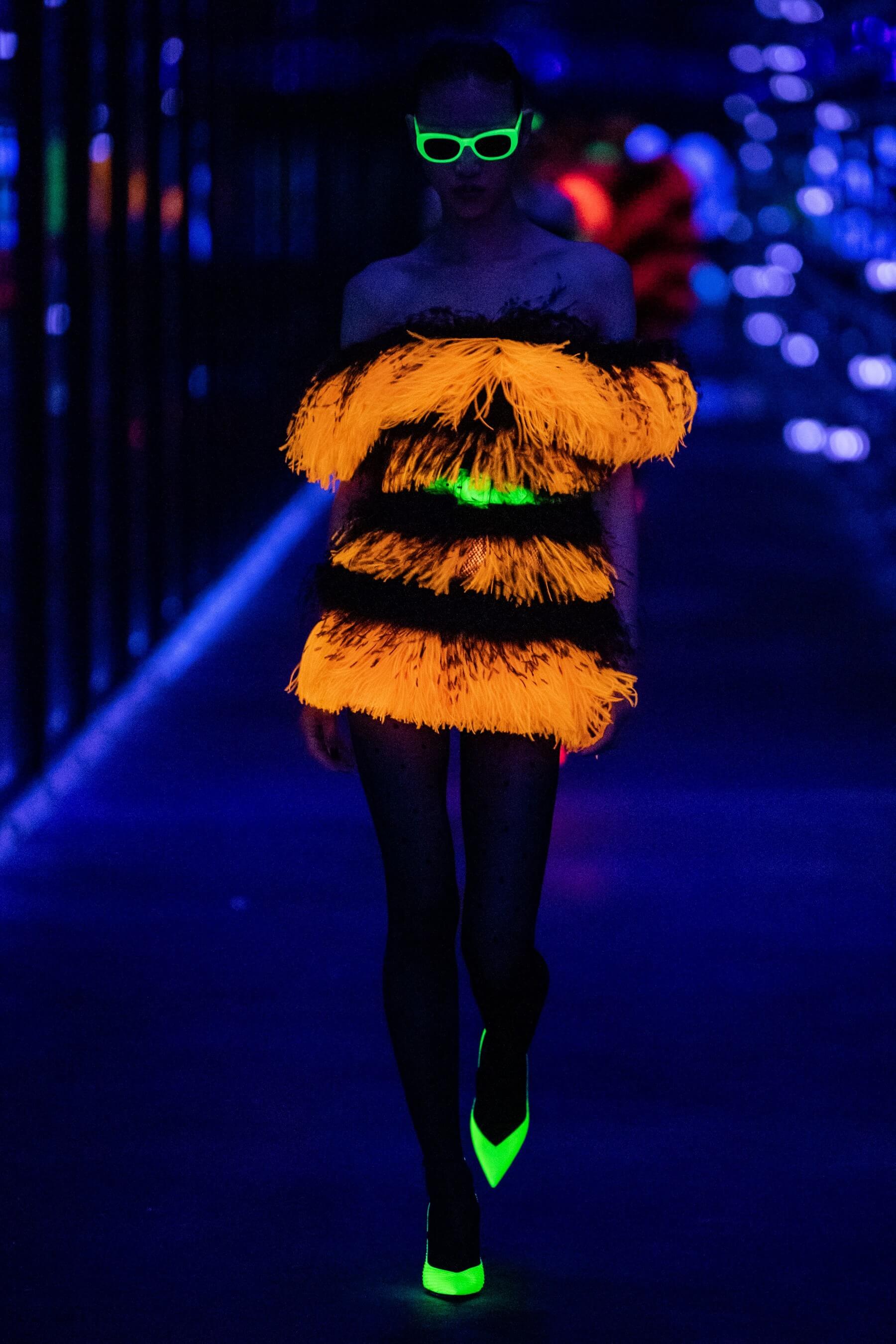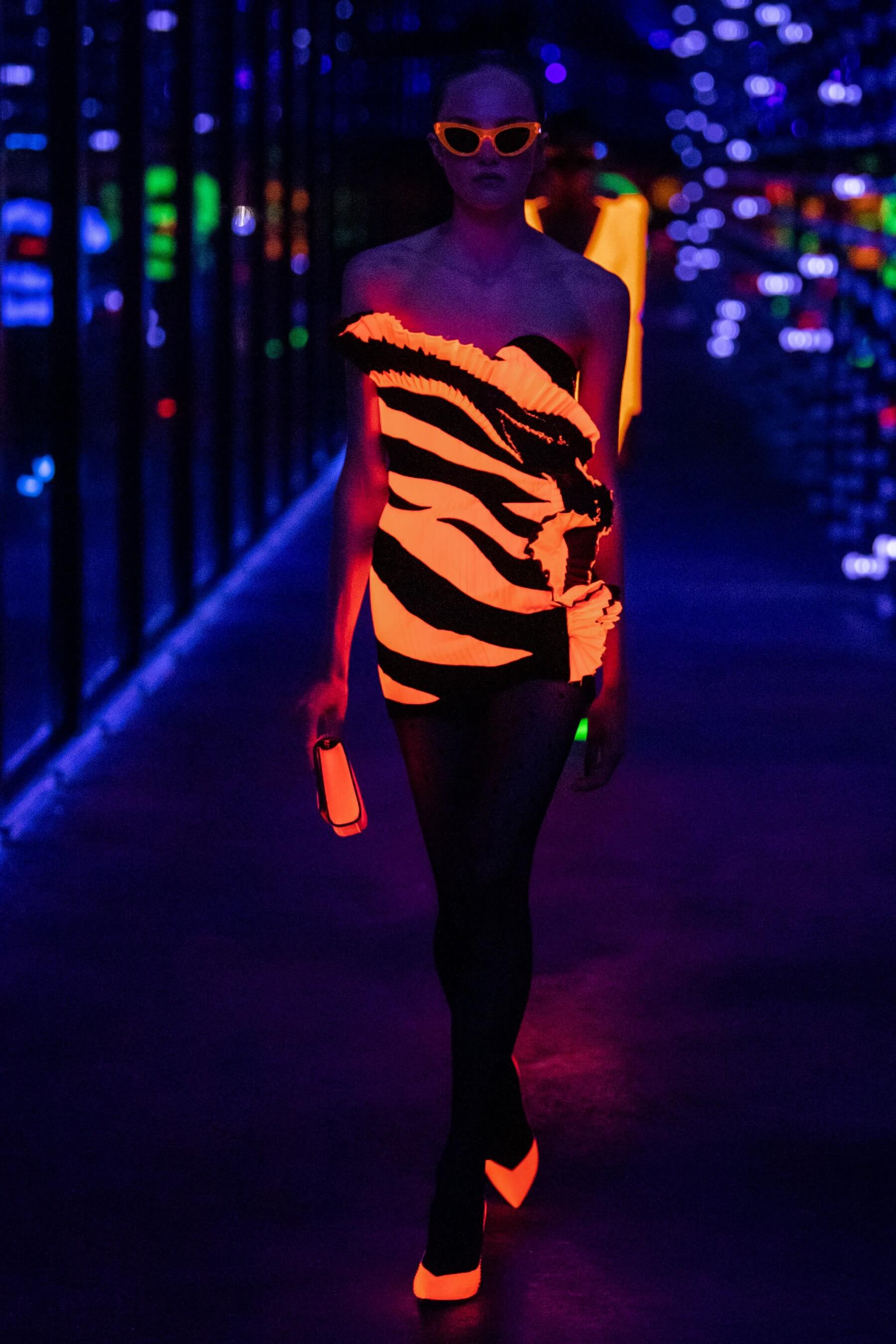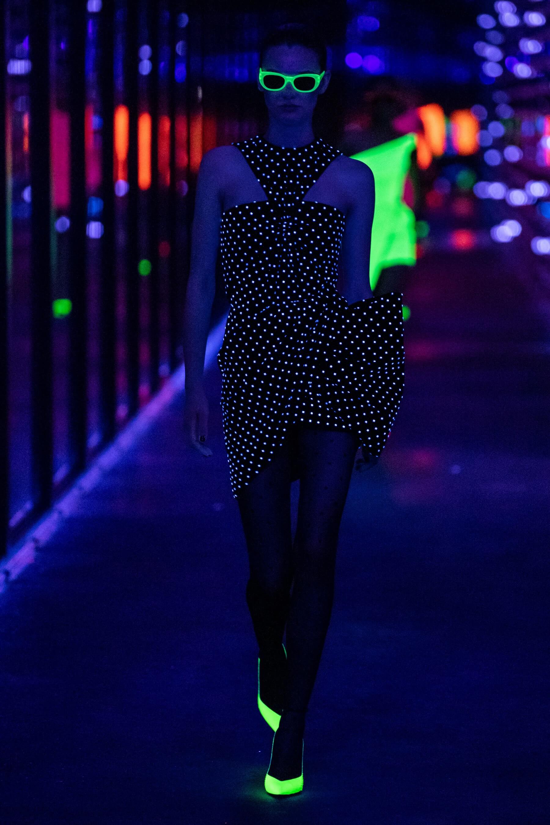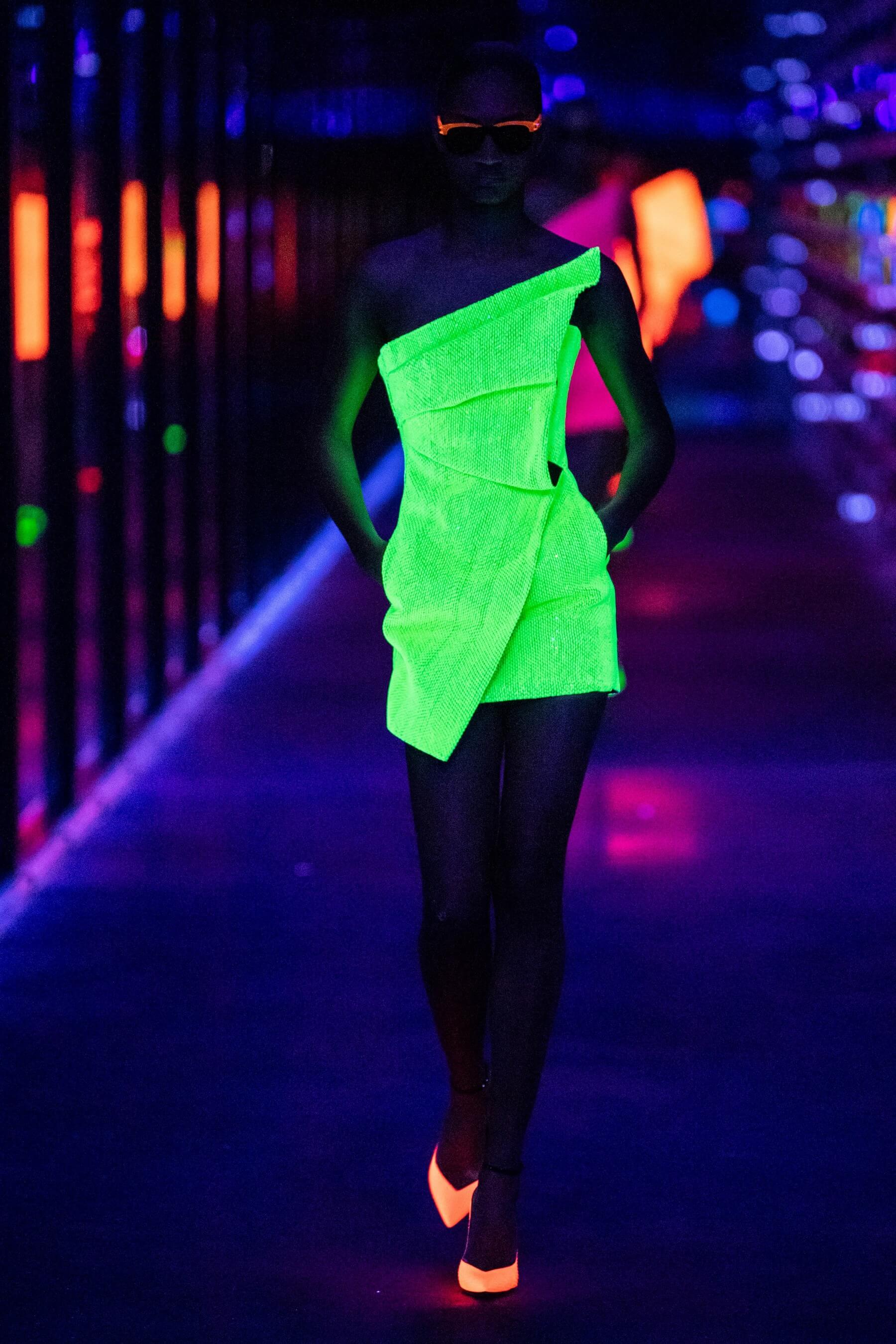 И наконец третий, финальный акт, который поверг зрителей в настоящее изумление, был похож на эстетическую галлюцинацию. Он прошел в неоновом свете с обратной стороны зеркала, что создавало иллюзию параллельного мира: модели превратились в фантастических пришельцев из киберпространства, появляясь то в полосатых пиджаках и платьях в светящийся горох и с геометричными шляпками на головах, то во флюоресцентных платьях маркерных цветов и кислотных пышных шубах.