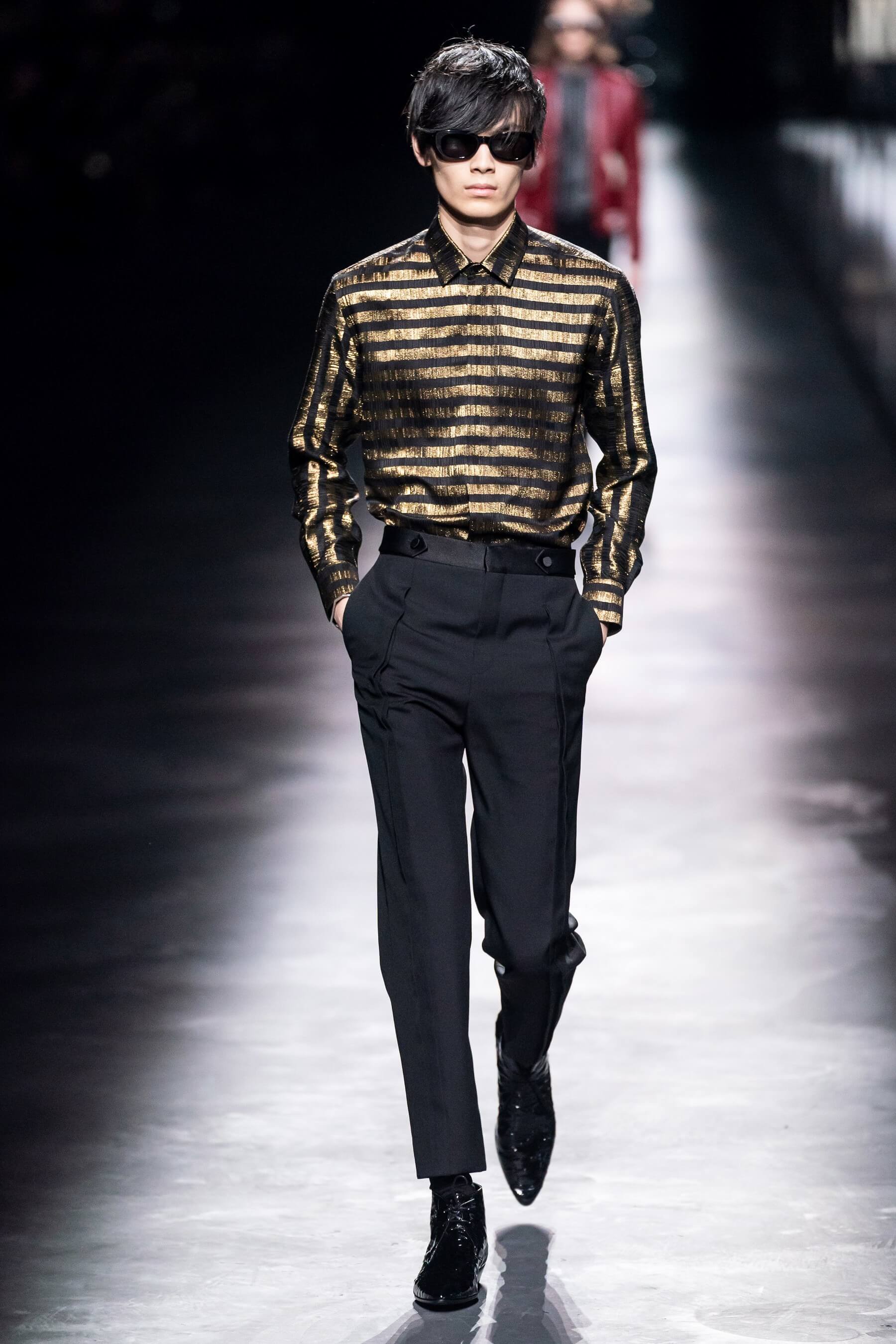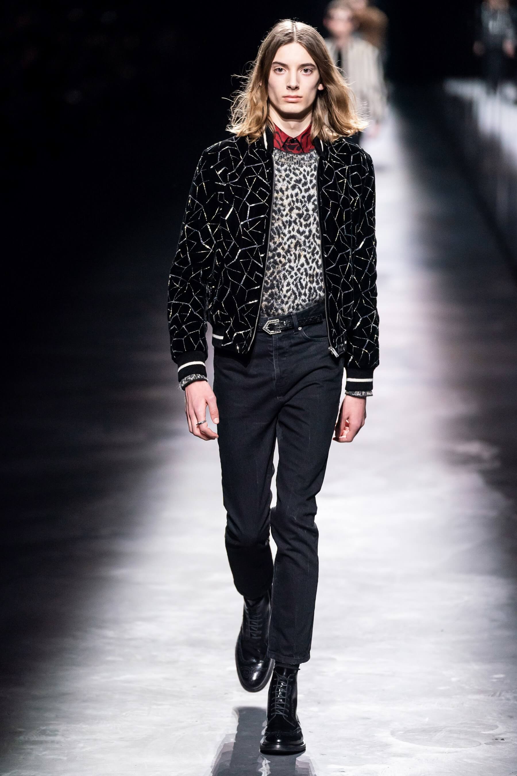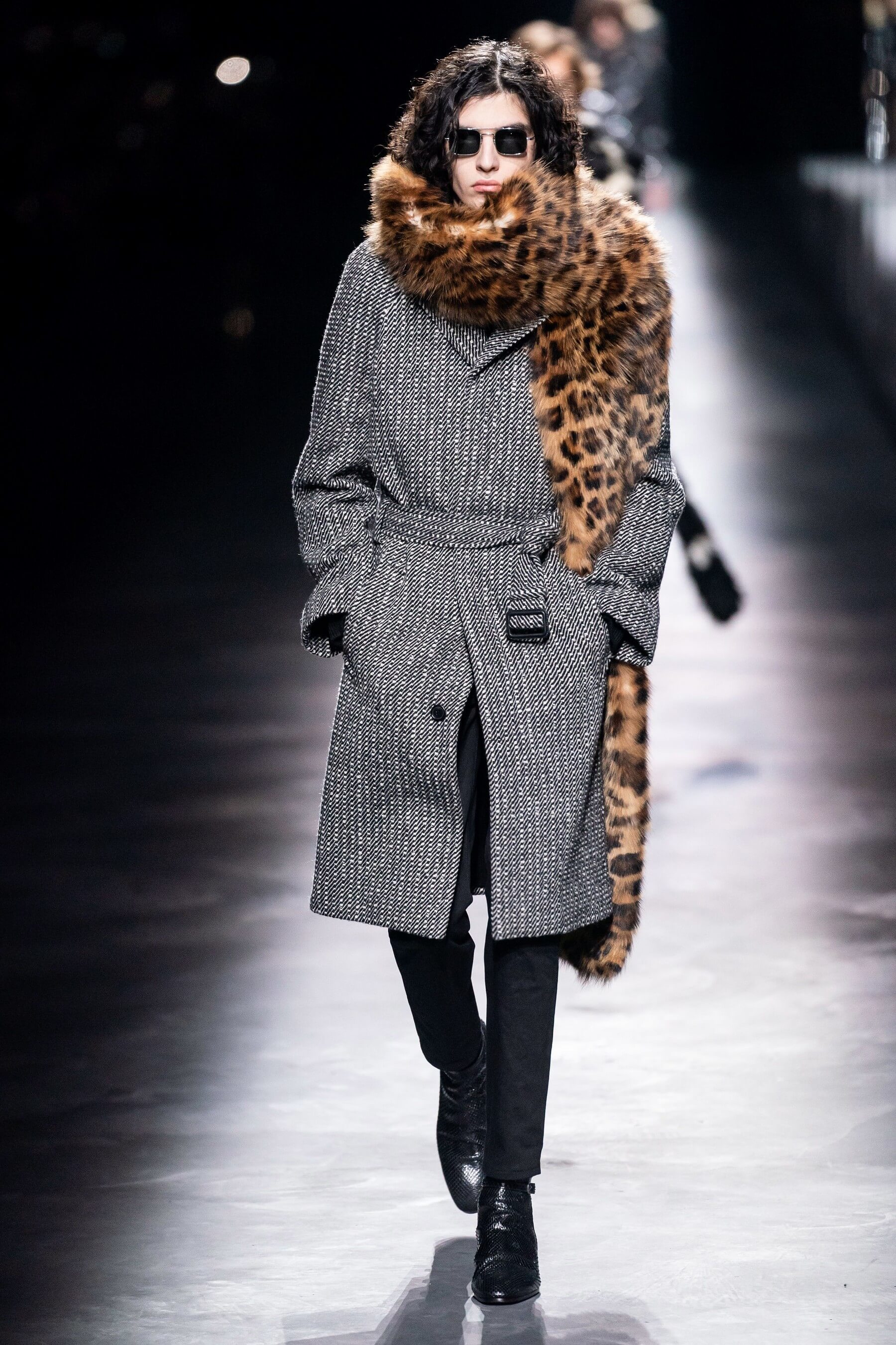 Во второй части было представлено около 20 мужских образов, выстроенных на золотых рубашках, алых кожаных пиджаках, блестящих костюмах и пушистых шарфах с хищным окрасом.