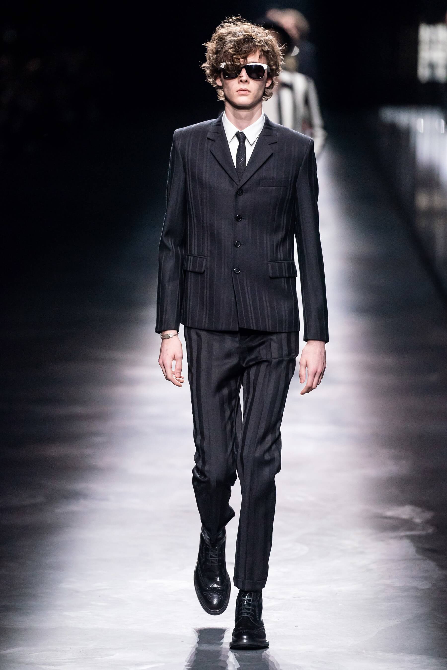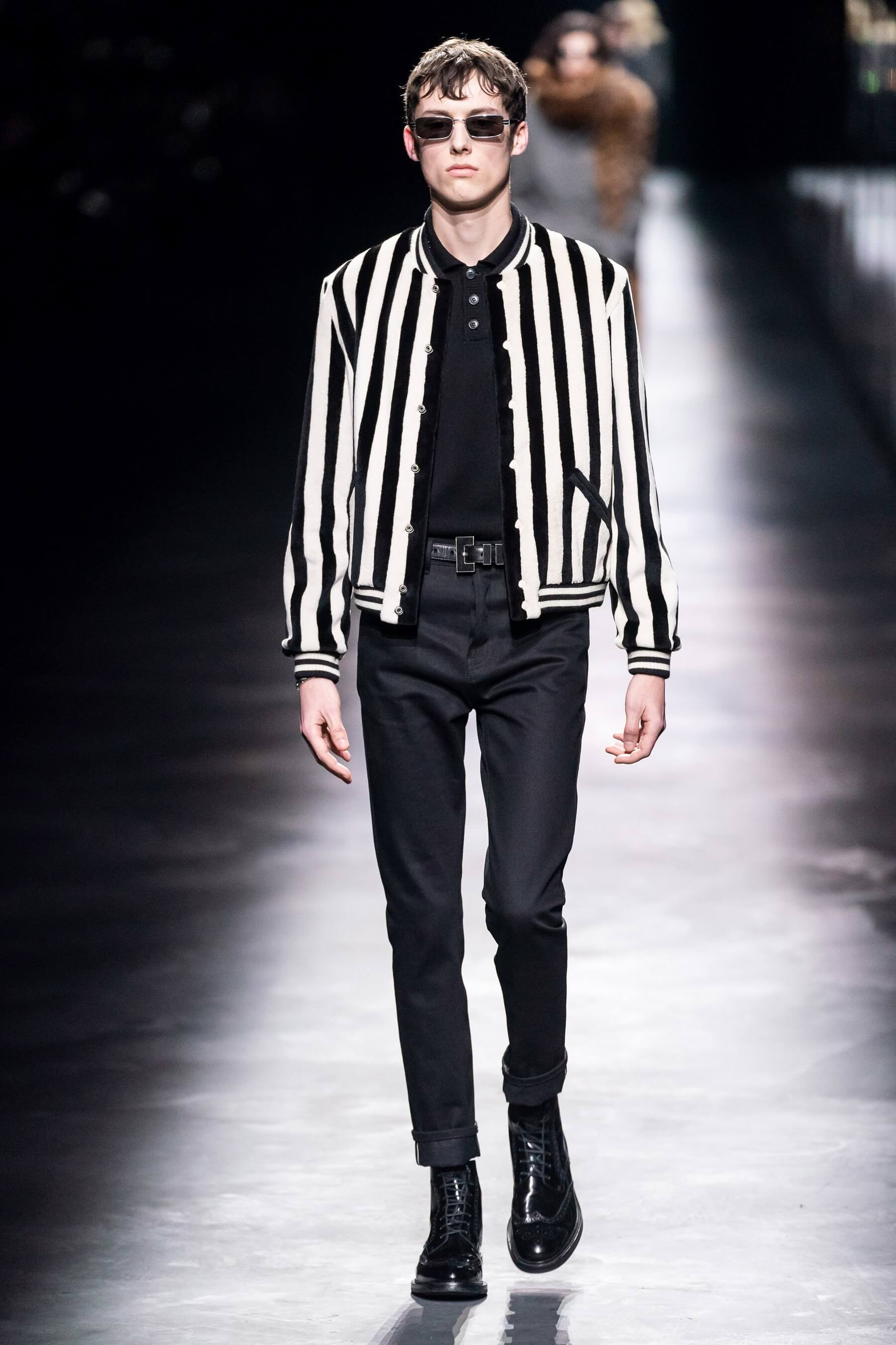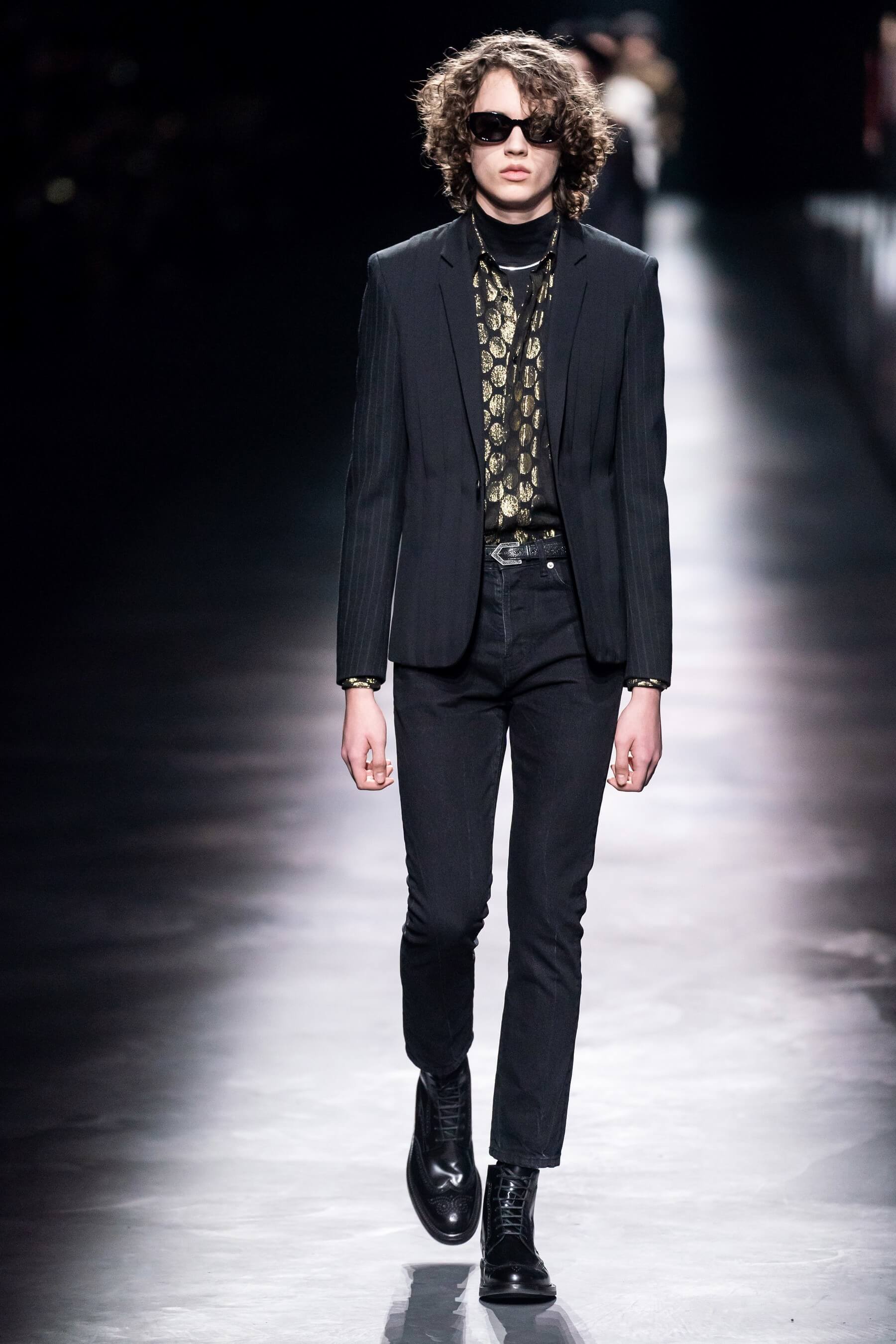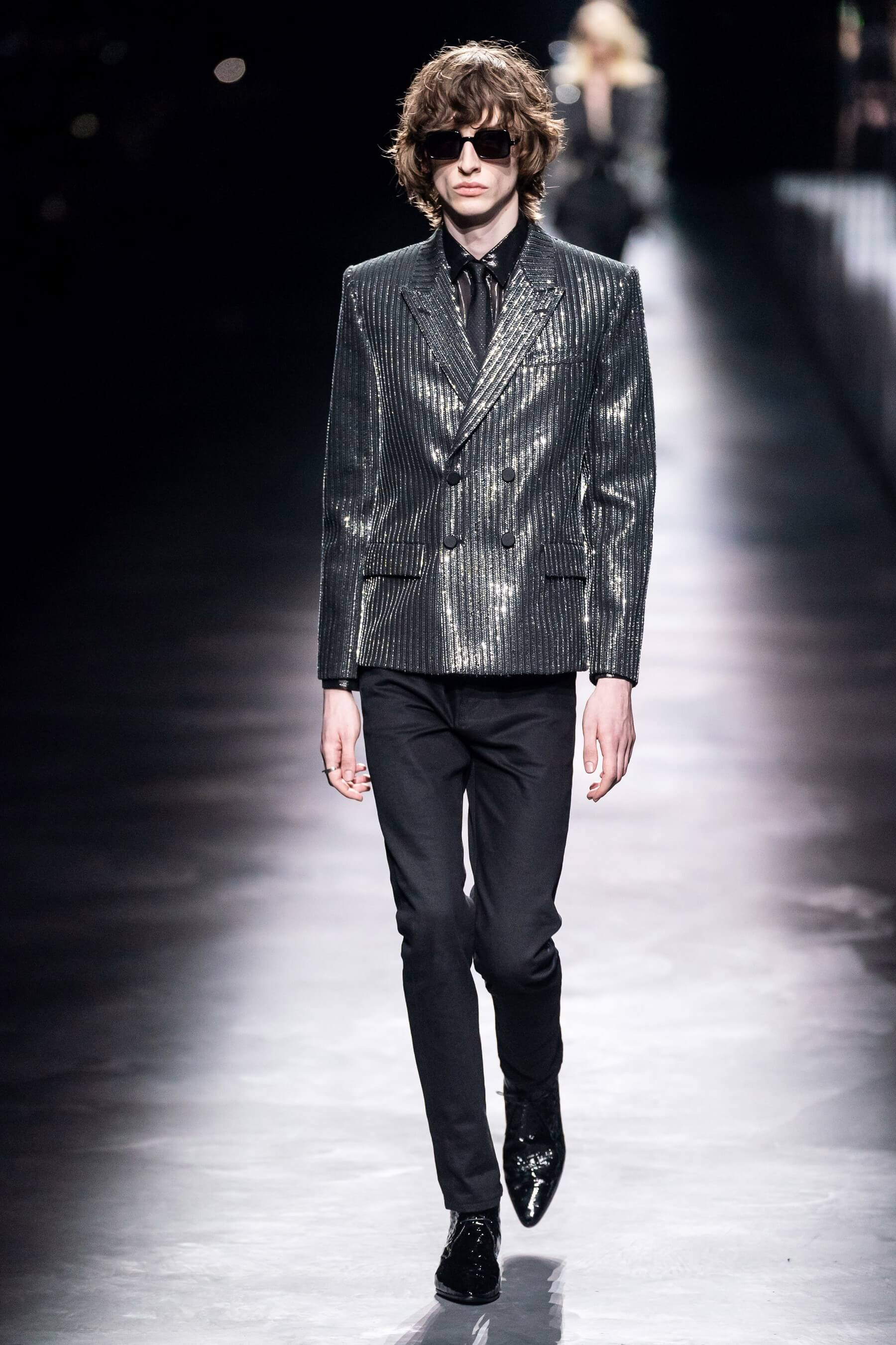 Во второй части было представлено около 20 мужских образов, выстроенных на золотых рубашках, алых кожаных пиджаках, блестящих костюмах и пушистых шарфах с хищным окрасом.