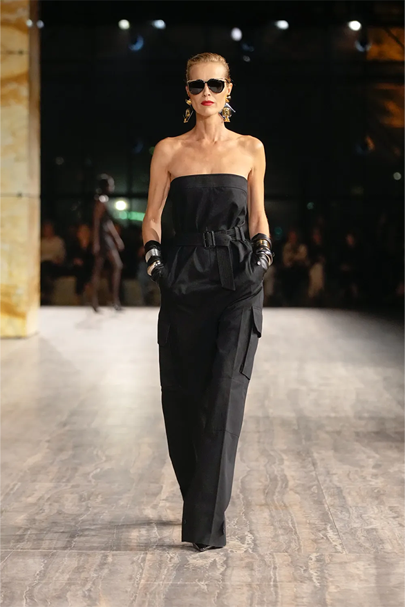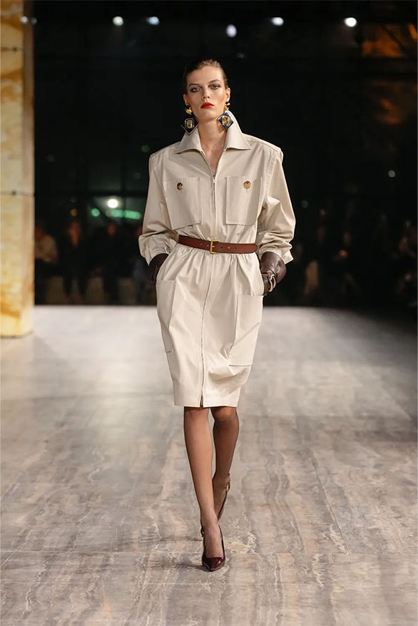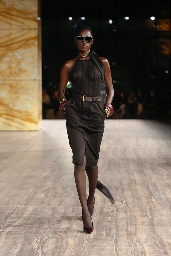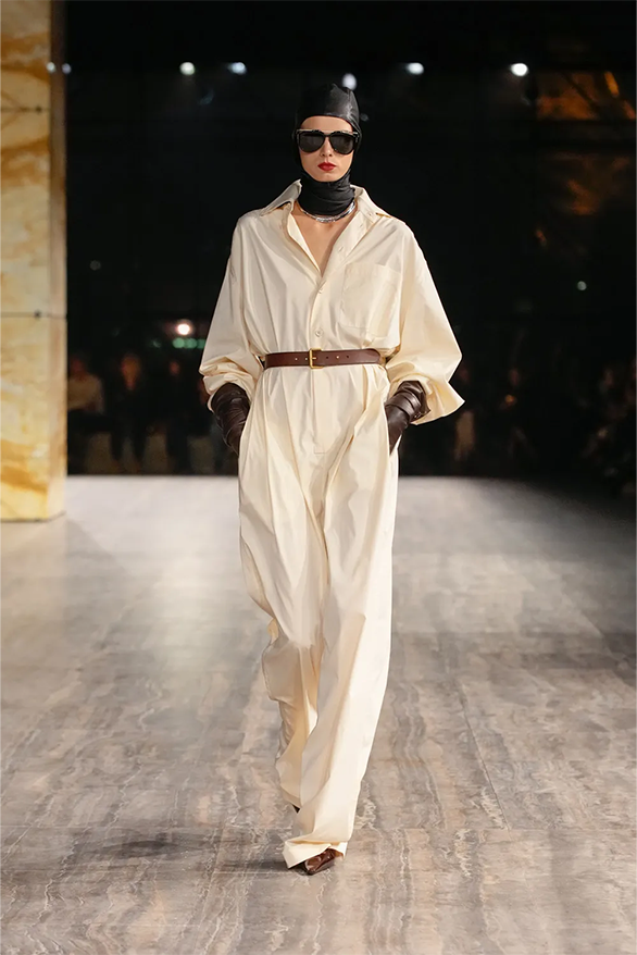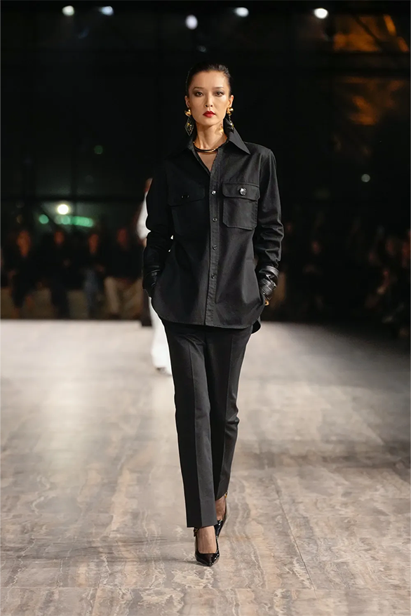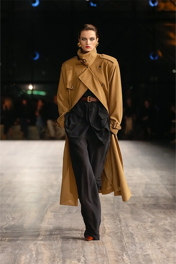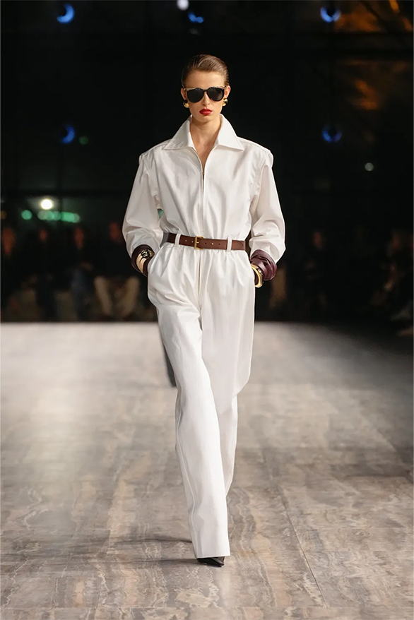Цього сезону Saint Laurent також повернувся до своєї архівної історії. На тлі мармурових стін і Ейфелевої вежі моделі демонструвати базові та витончені силуети. Образи з весняно-літньої колекції були натхненні фірмовими кодами бренду. «Концепція є прагматичною з денними кутюрними образами й вільнішим силуетом», — йдеться в нотатках до шоу.