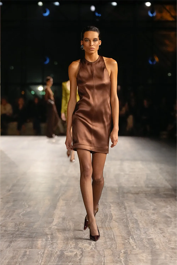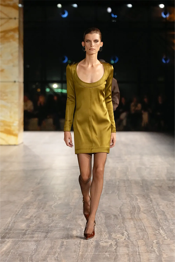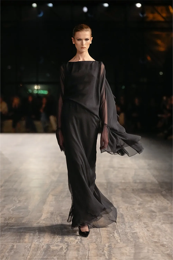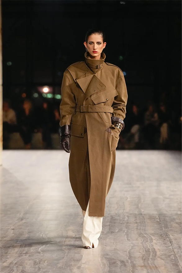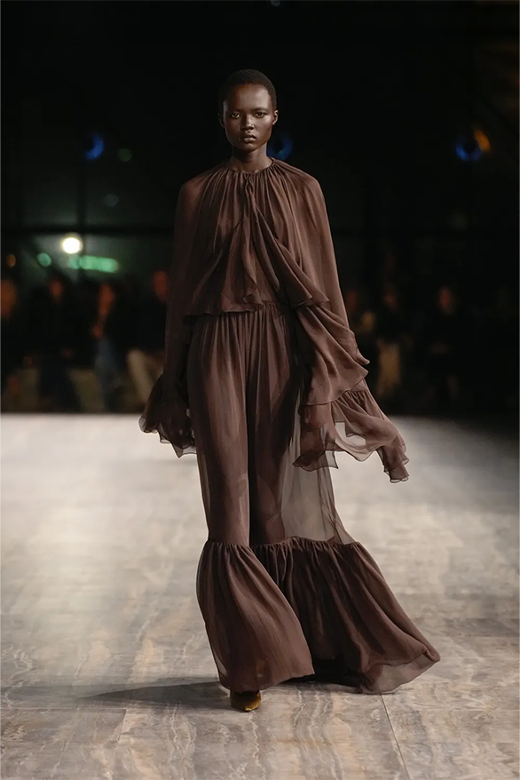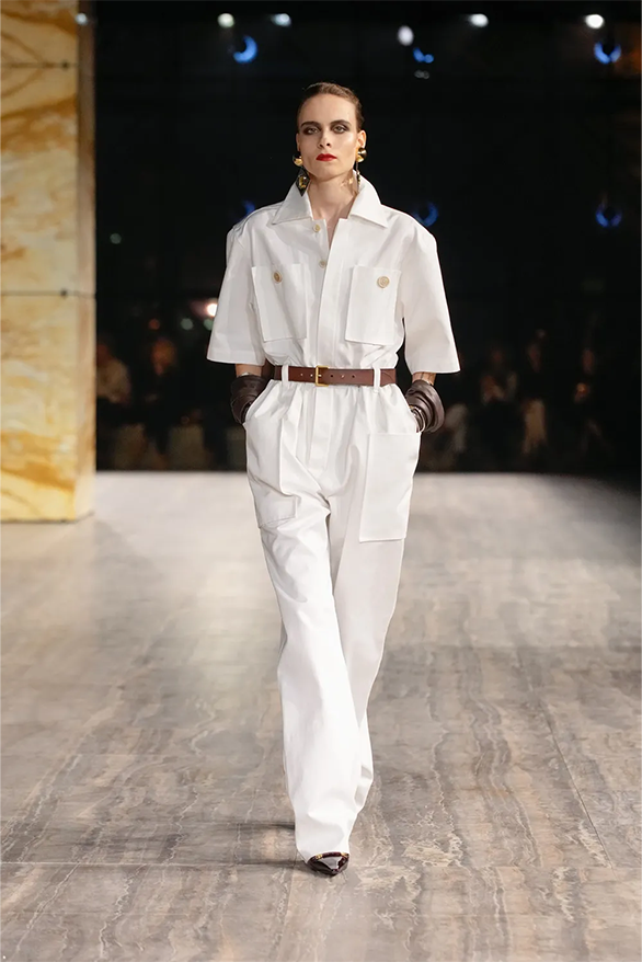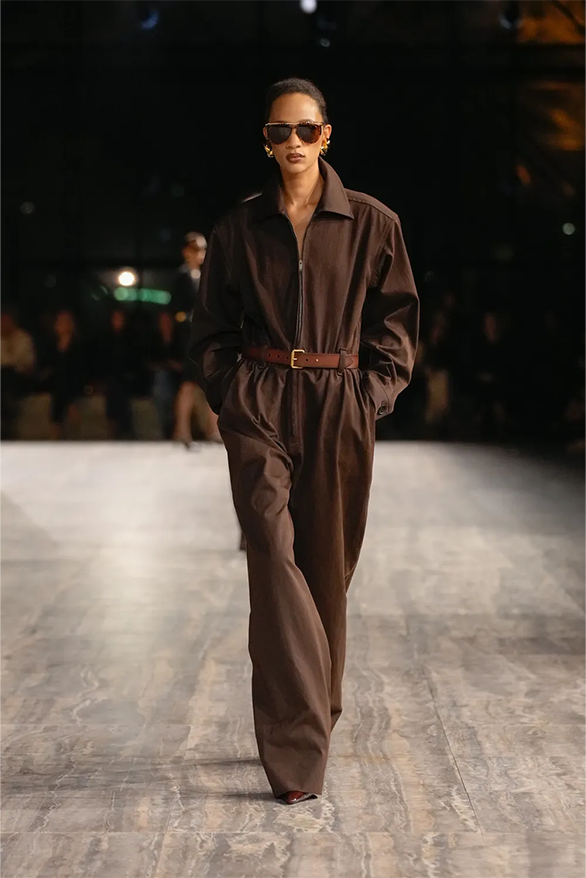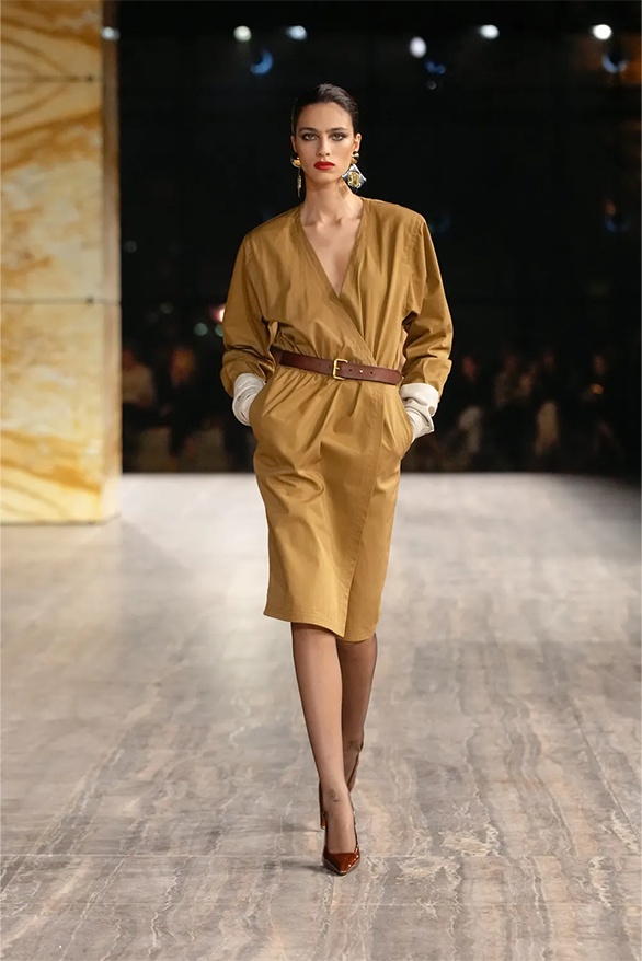 Цього сезону Saint Laurent також повернувся до своєї архівної історії. На тлі мармурових стін і Ейфелевої вежі моделі демонструвати базові та витончені силуети. Образи з весняно-літньої колекції були натхненні фірмовими кодами бренду. «Концепція є прагматичною з денними кутюрними образами й вільнішим силуетом», — йдеться в нотатках до шоу.