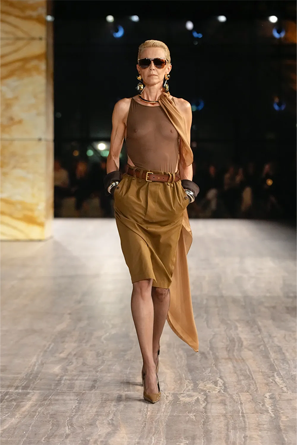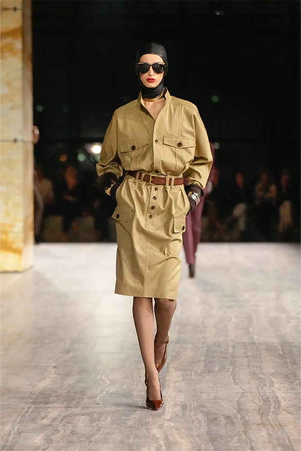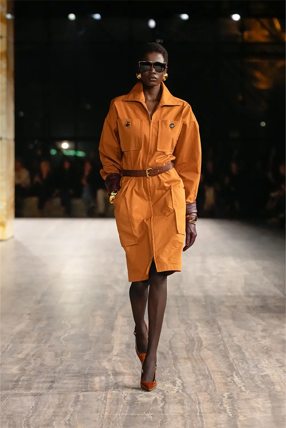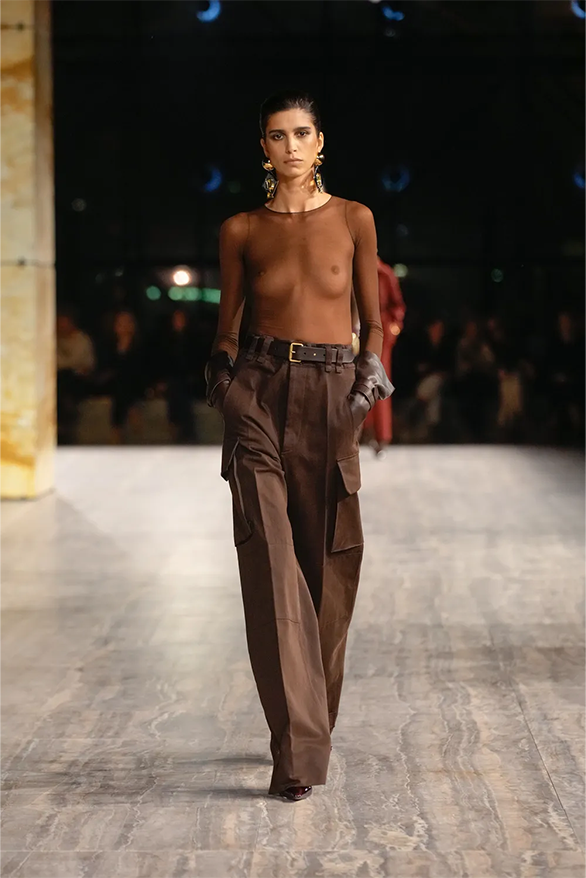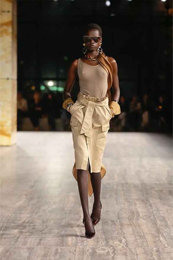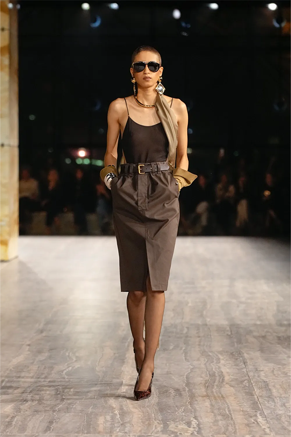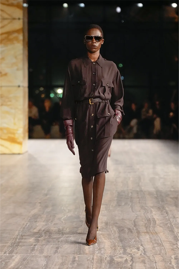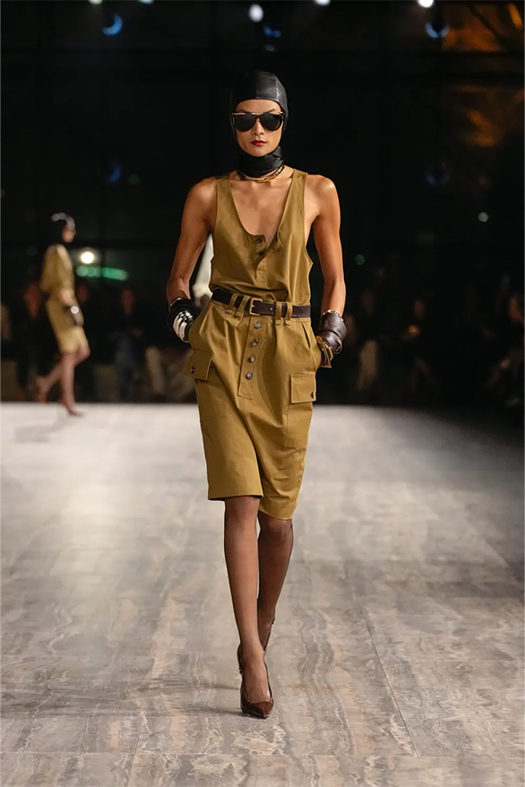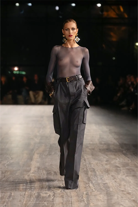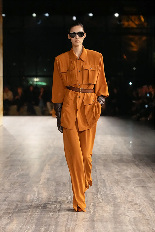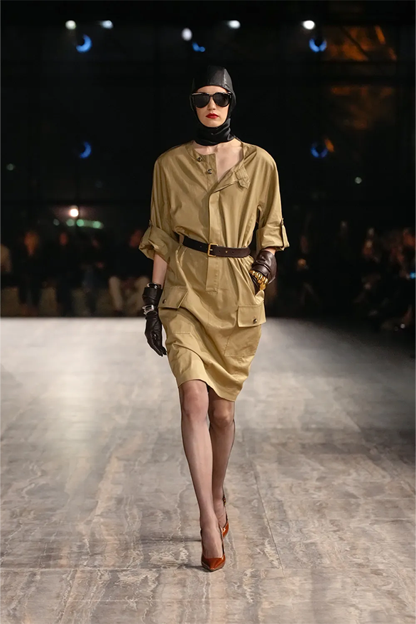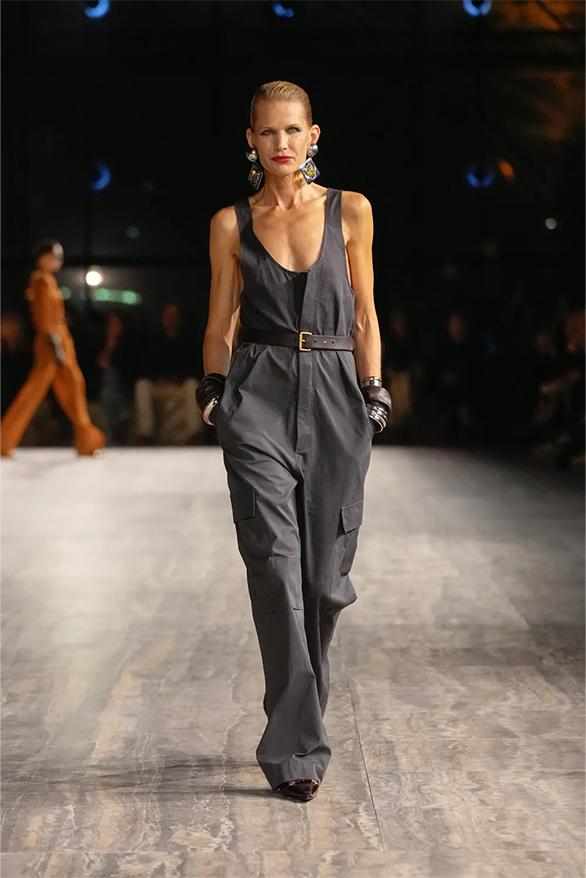 Штани-карго, спідниці-олівці, повітряні блузки та сукня-кафтан були прикладами з минулого Saint Laurent, якому дизайнер Ентоні Ваккарелло надав гламурного вигляду. Теплі, гірчичні й темні відтінки прикрашали образи, зроблені з бавовни. Цупкі матеріали кольору хакі контрастували з грайливими прозорами текстурами.