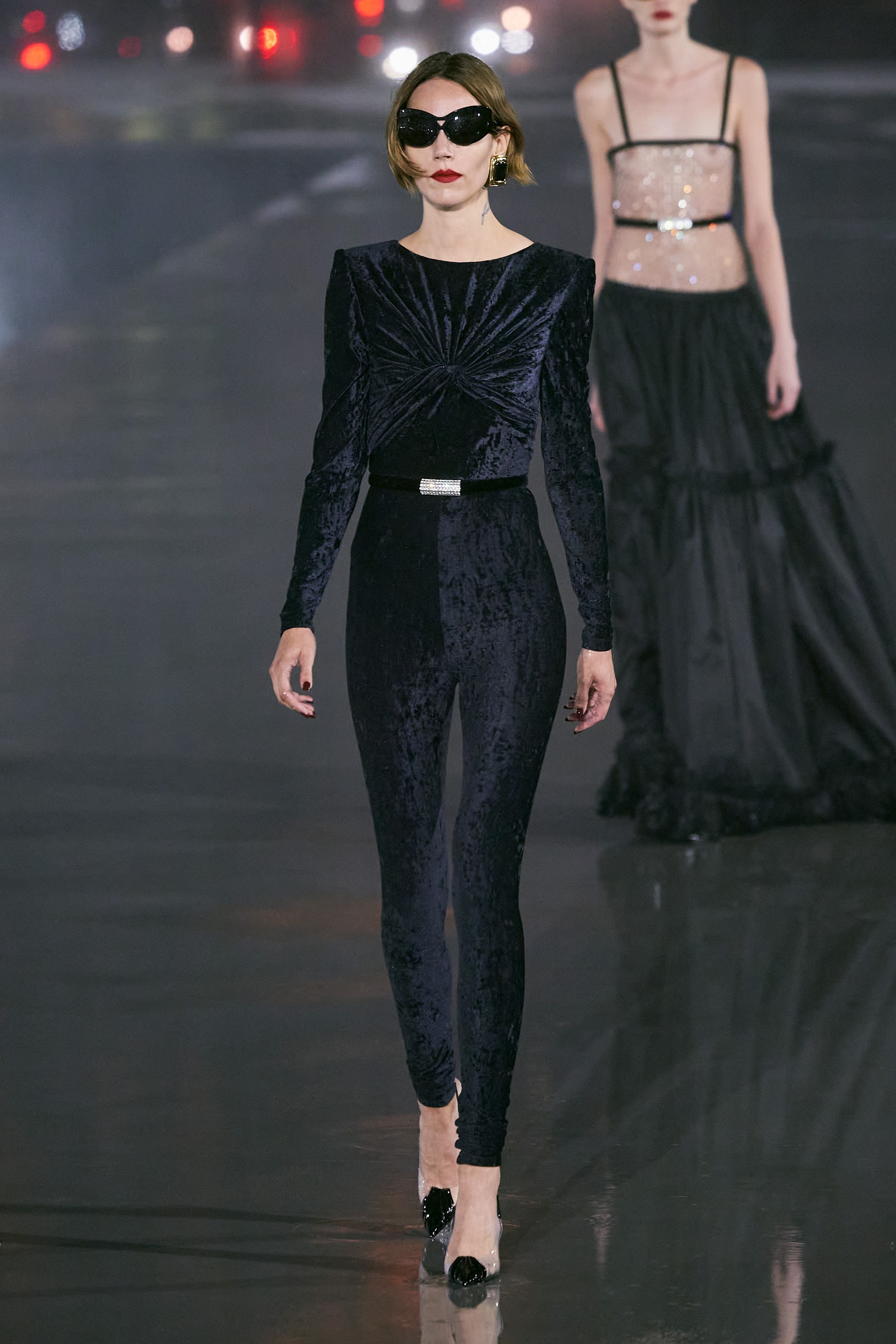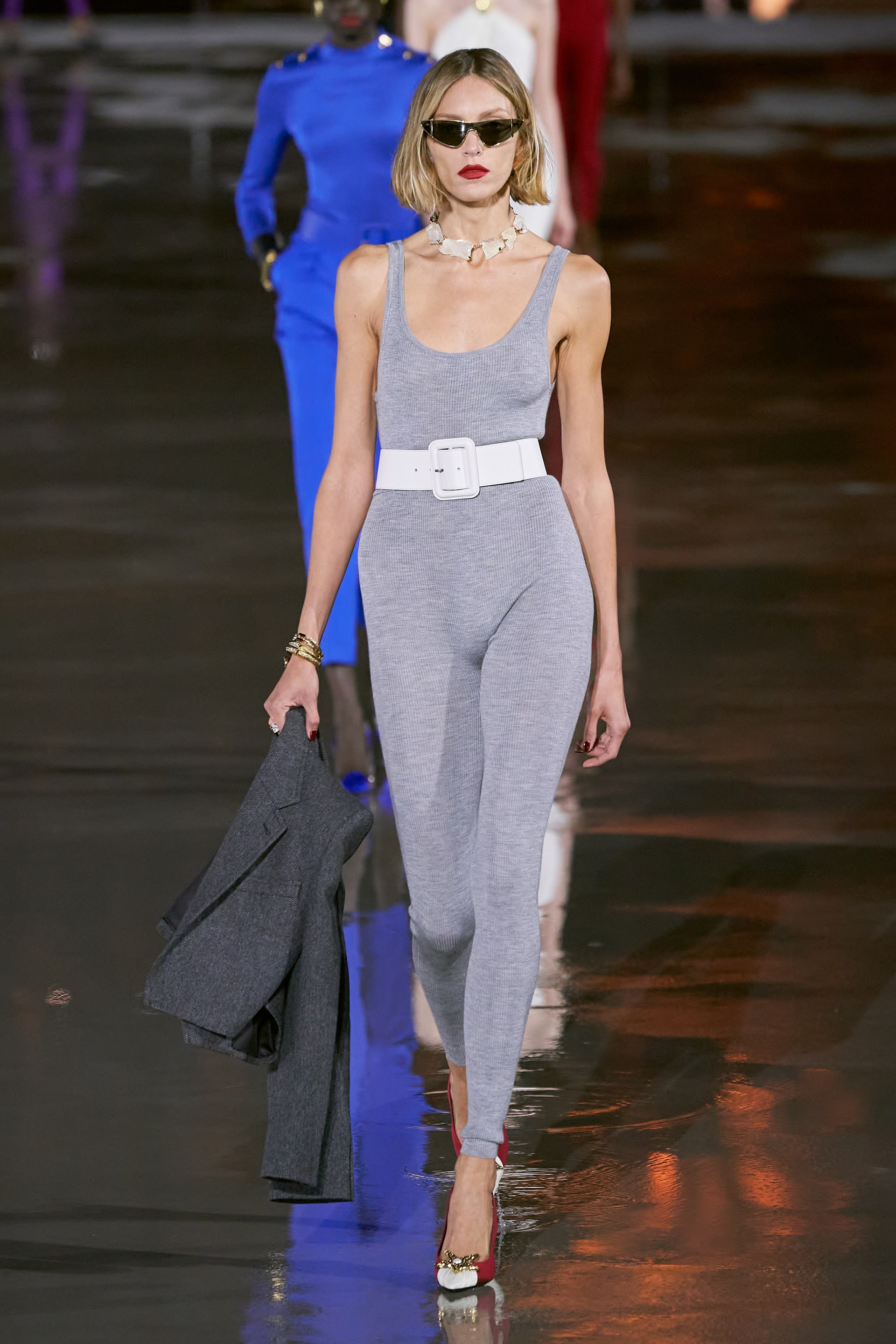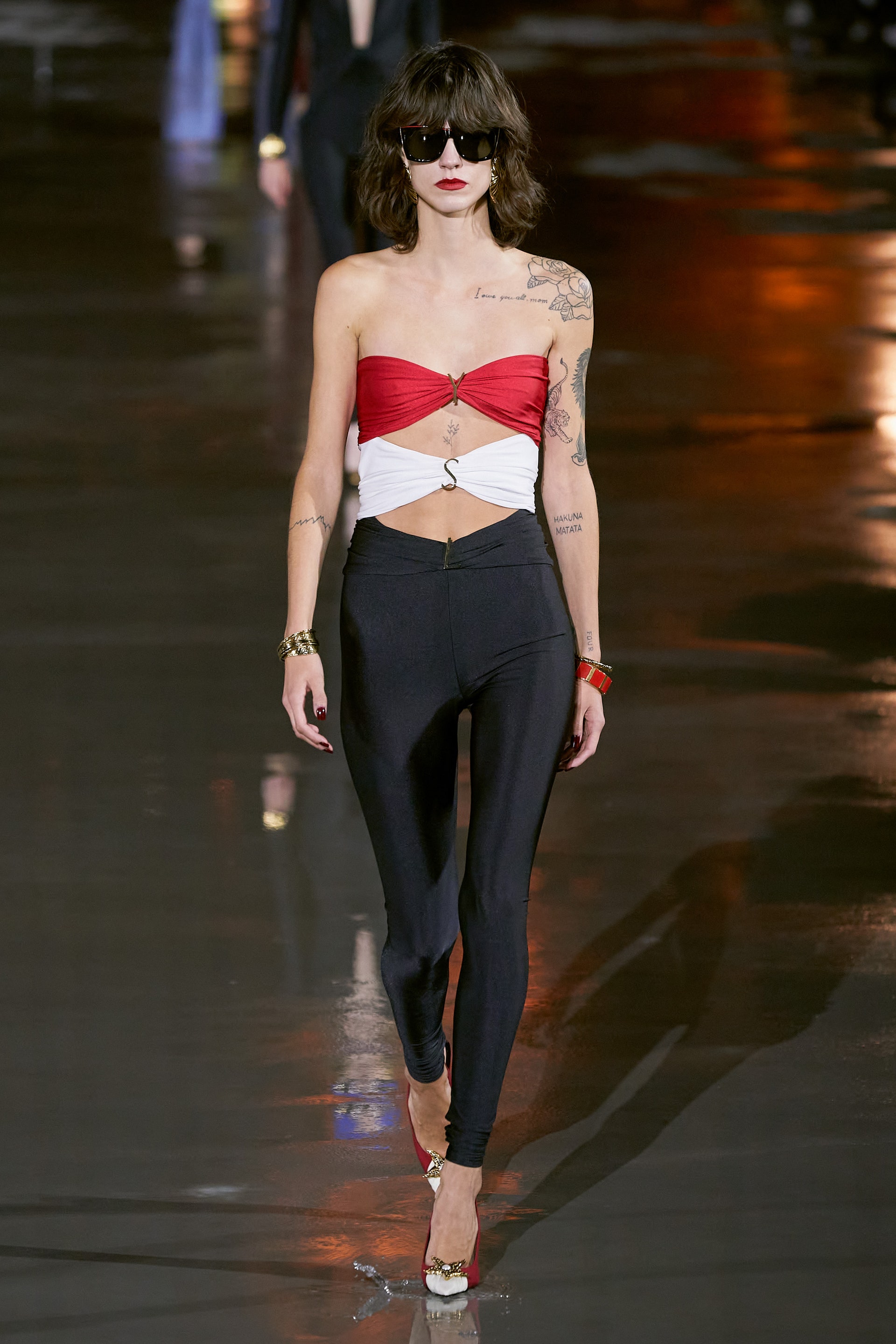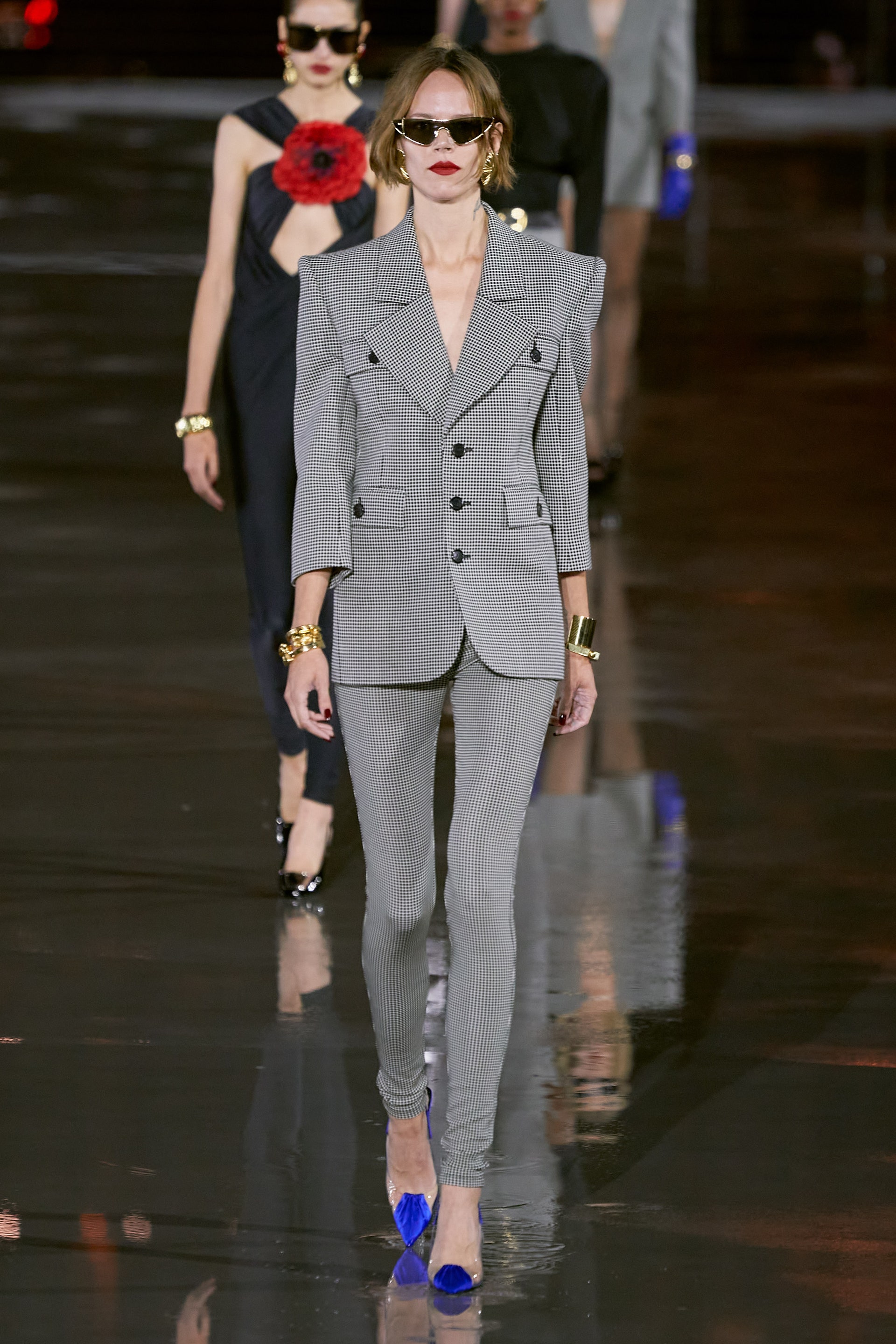 Энтони Ваккарелло вдохновился образом музы месье Сен-Лорана Паломы Пикассо. Её узнаваемый облик — темные волосы, алая помада и тушь — послужил референсом к бьюти-приемам показа. Дизайнер также воспроизвел высокие платформы, которые носит сам. Идеально скроенные пиджаки дополнили узкие джинсы с завышенной талией, брюки-сигареты и заткнутые за пояс клатчи (Палома продевала за пояс театральную программку подобным образом). В иных случаях Ваккарелло позволил себе кокетливо срифмовать благопристойность и соблазн, надев на моделей буржуазные маленькие жакеты с золотыми пуговицами и соблазнительные вечерние платья, обнажающие тело.