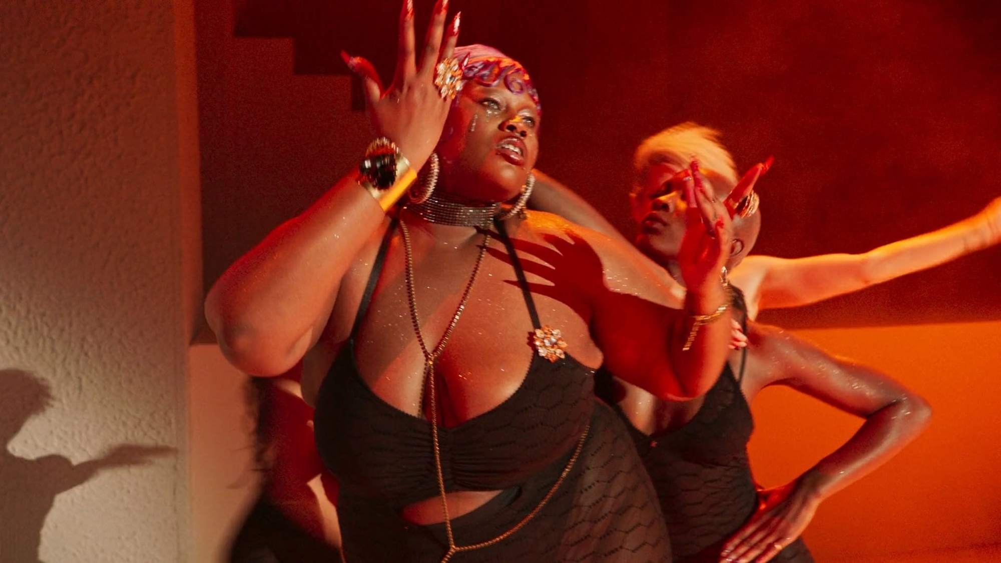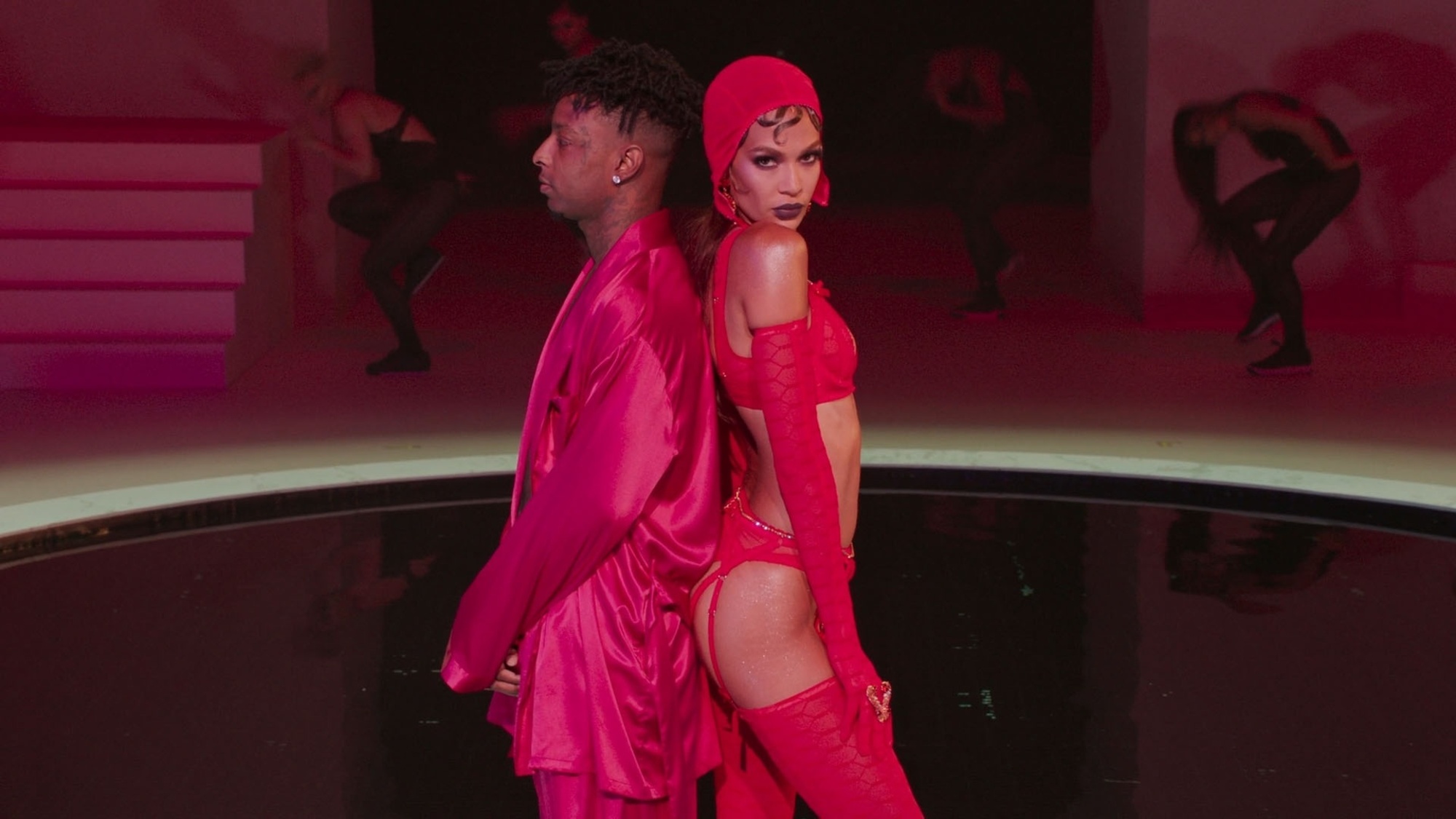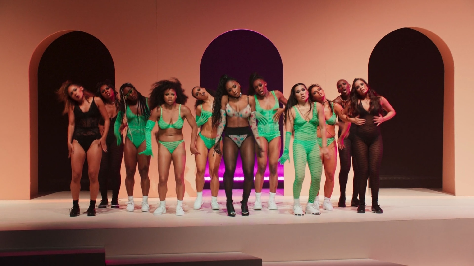 Звездный состав представили Джиджи Хадид в синем белье, накидке и чокере с цепочкой, Эмили Ратаковски в пурпурном топе и стрингах, модель Су Джу Пак в белье со змеиным принтом, TikTok-блогер с 83 миллионами подписчиков Белла Порч в черном боди, Адриана Лима в коричневом белье с высокими перчатками из тюля и другие селебрити.