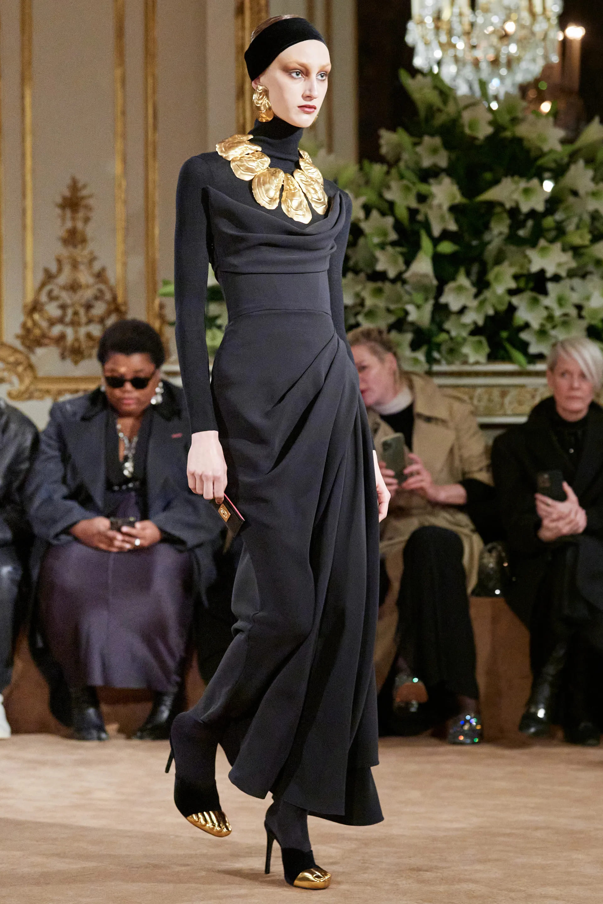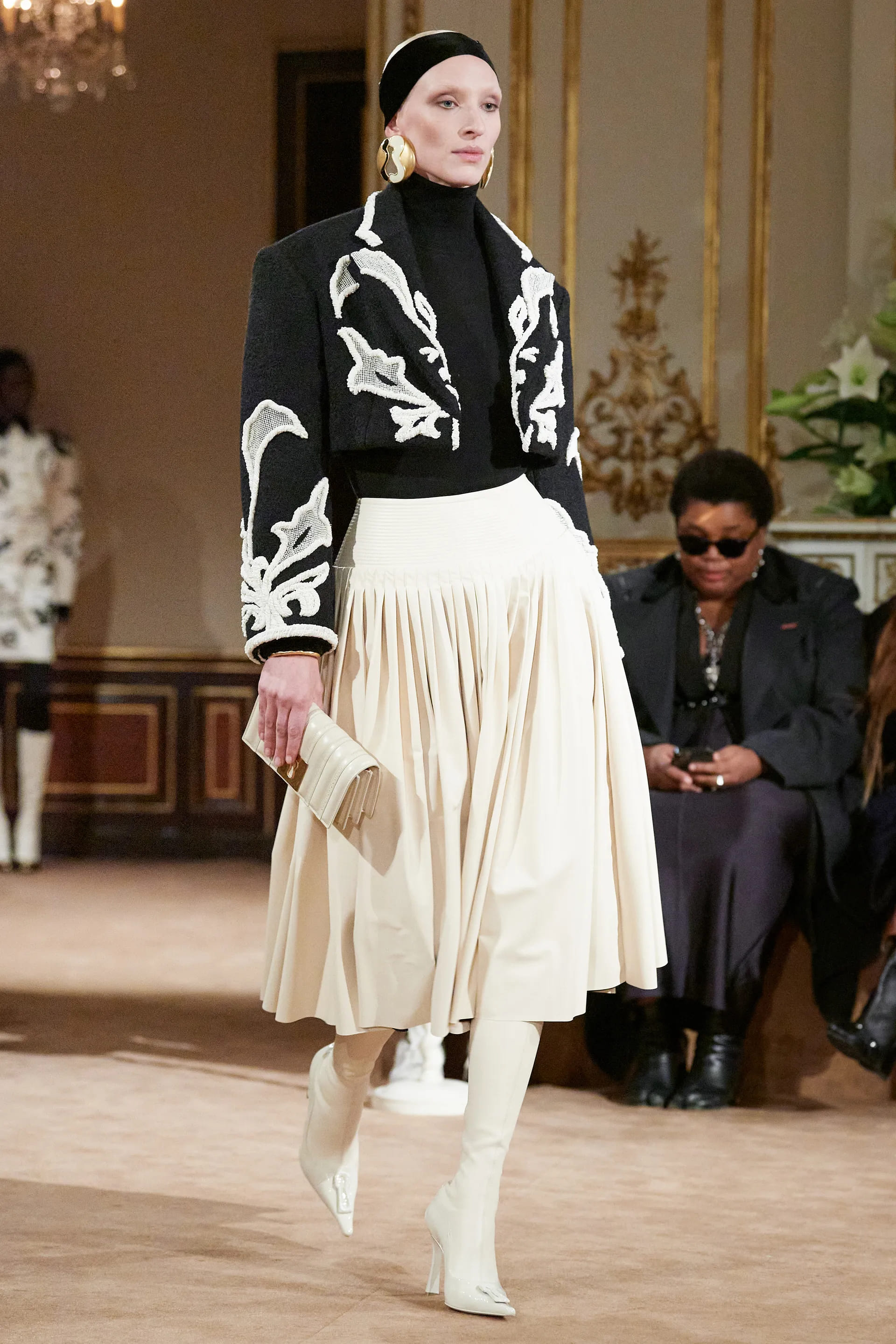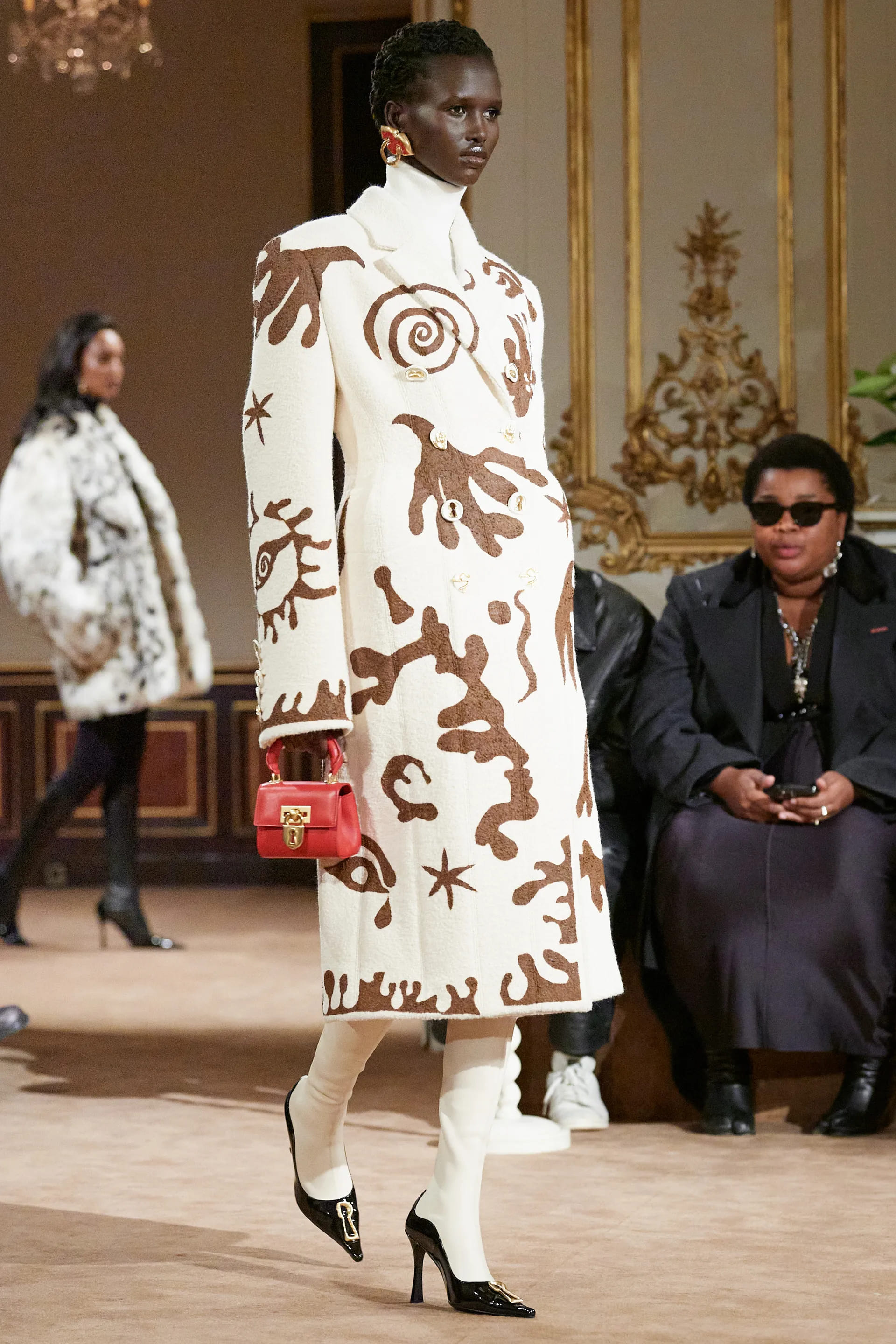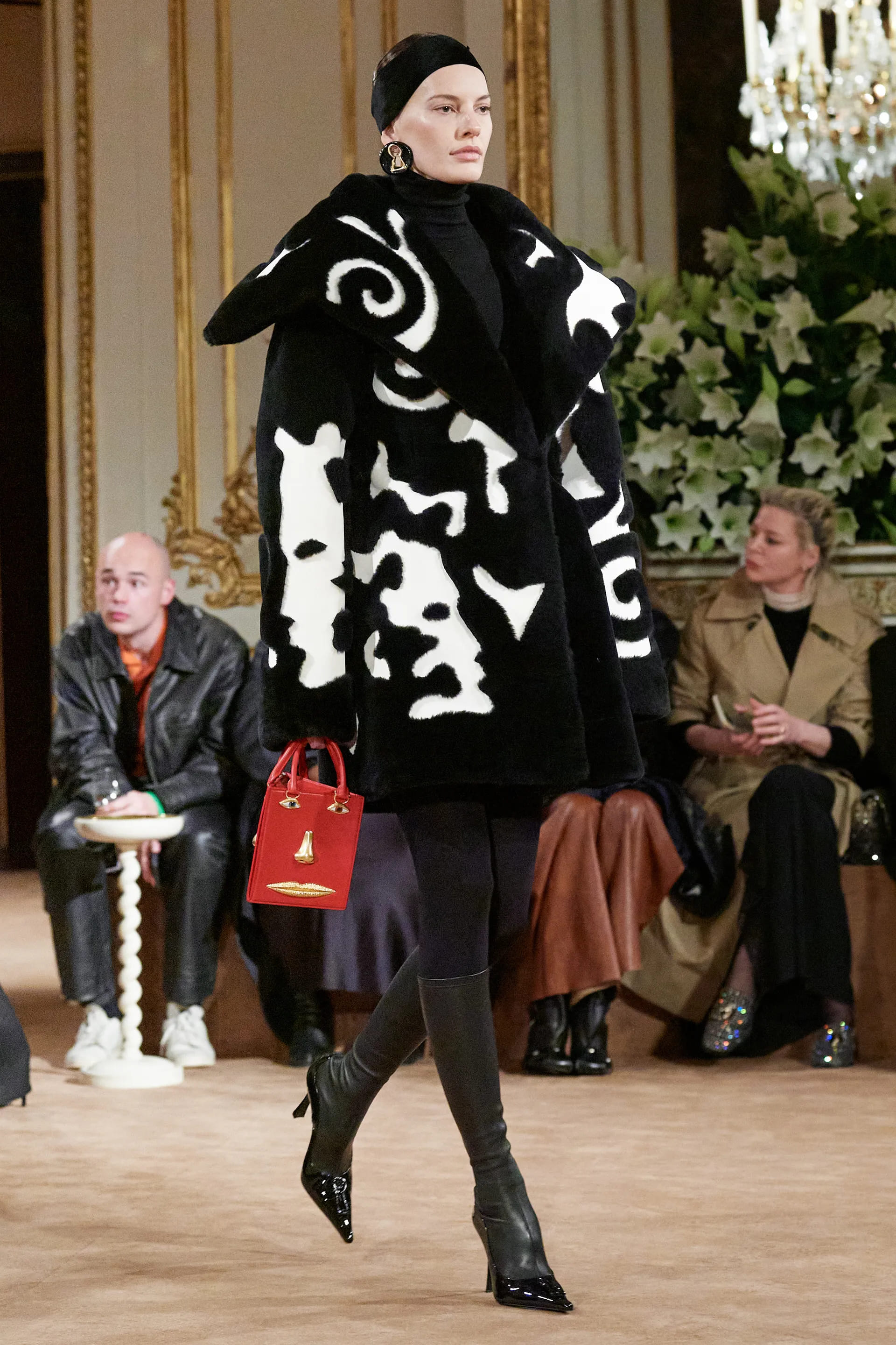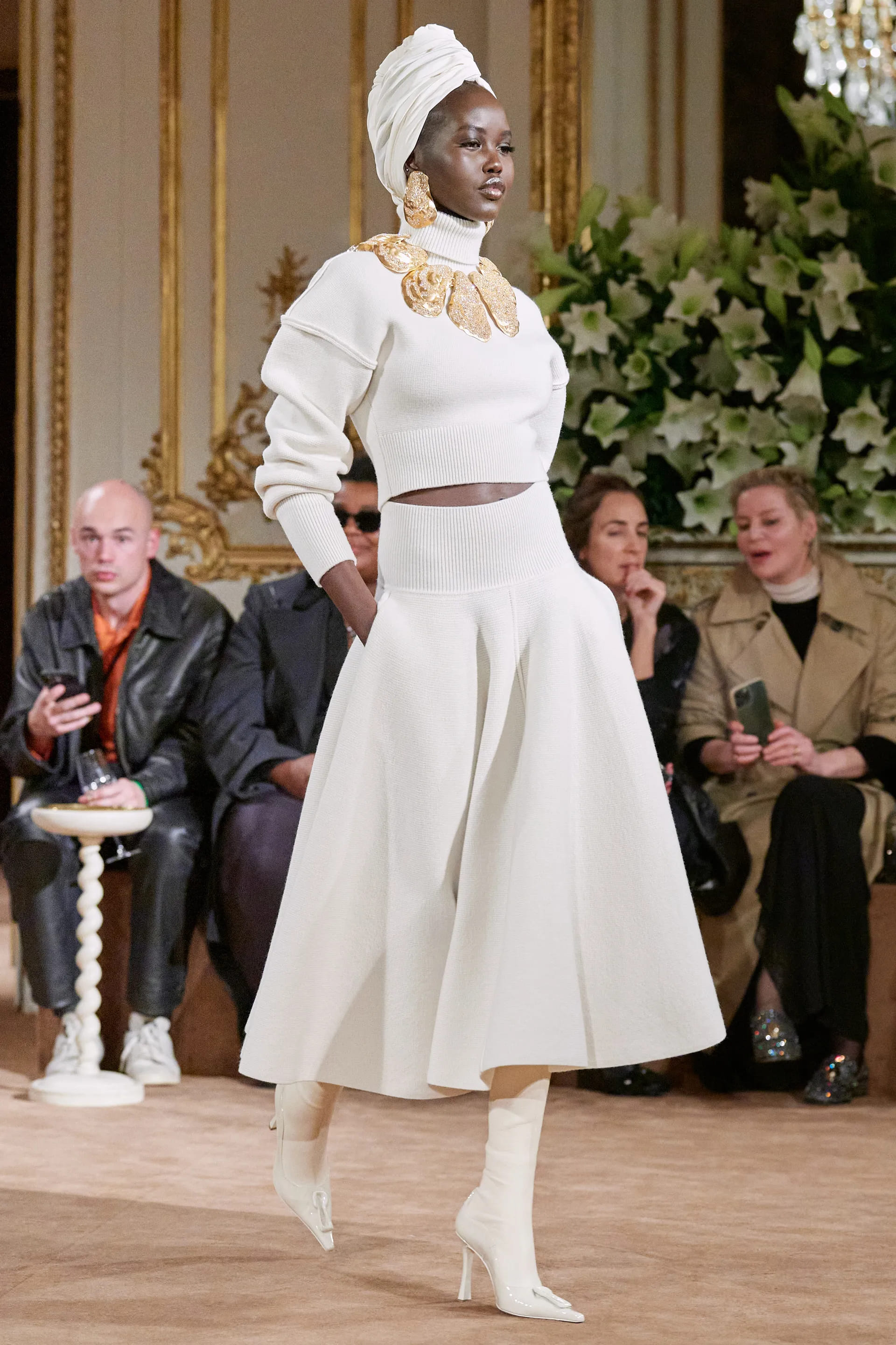 Показ відкрило об’ємне силуетне пальто з максірукавами та фактурними ґудзиками. Доповнений об’ємним білим тюрбаном та високими молочними шкіряними черевиками, образ давав відсилки до футуристичного, свіжого, радикального погляду Ельзи, з яким вона увірвалася у світ моди в 1930-ті.