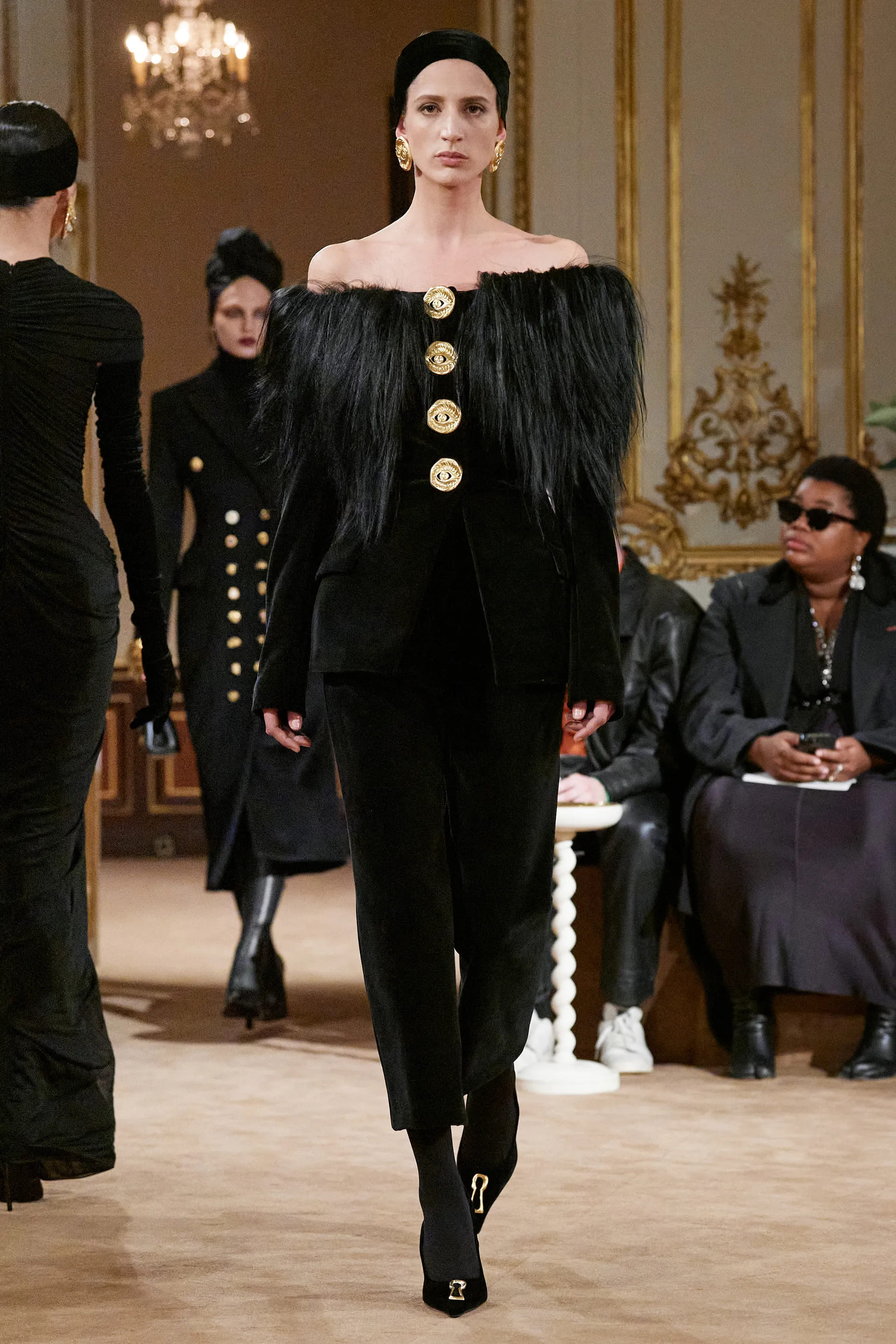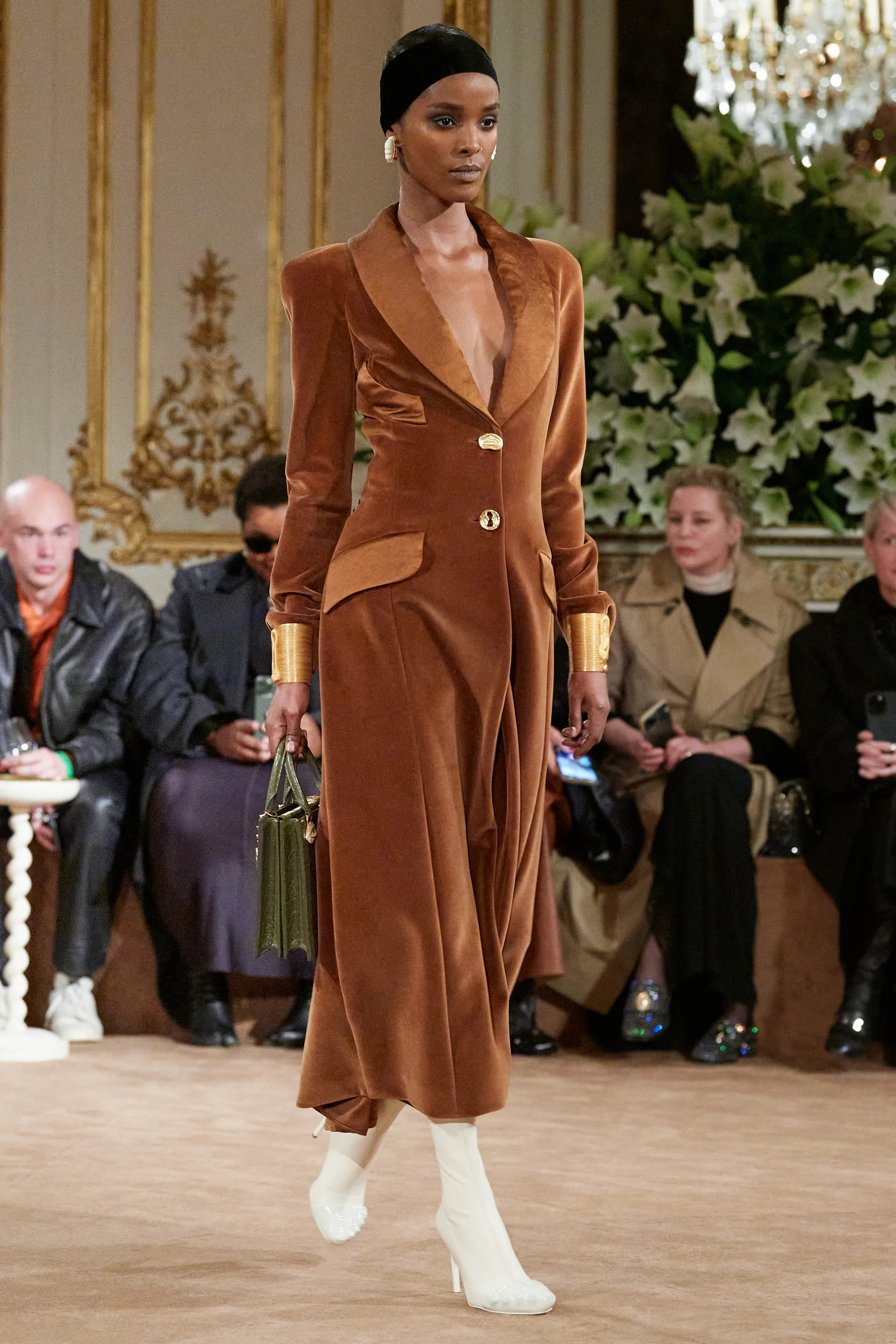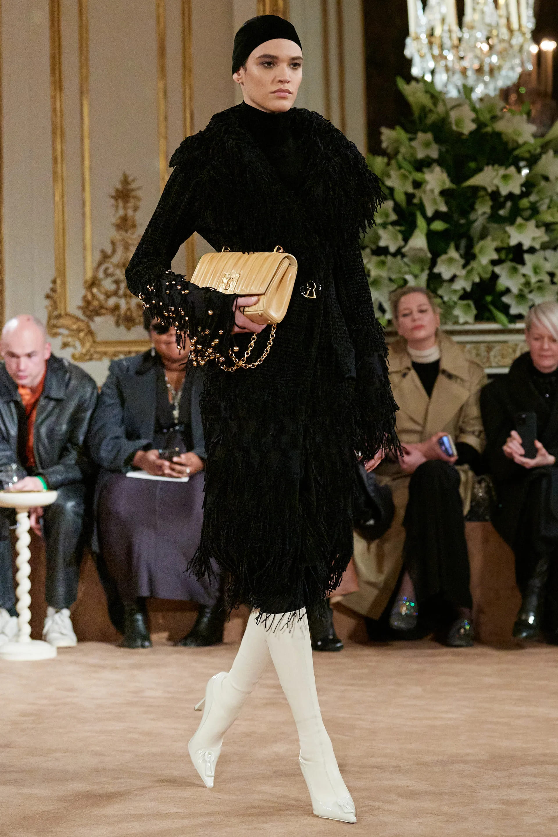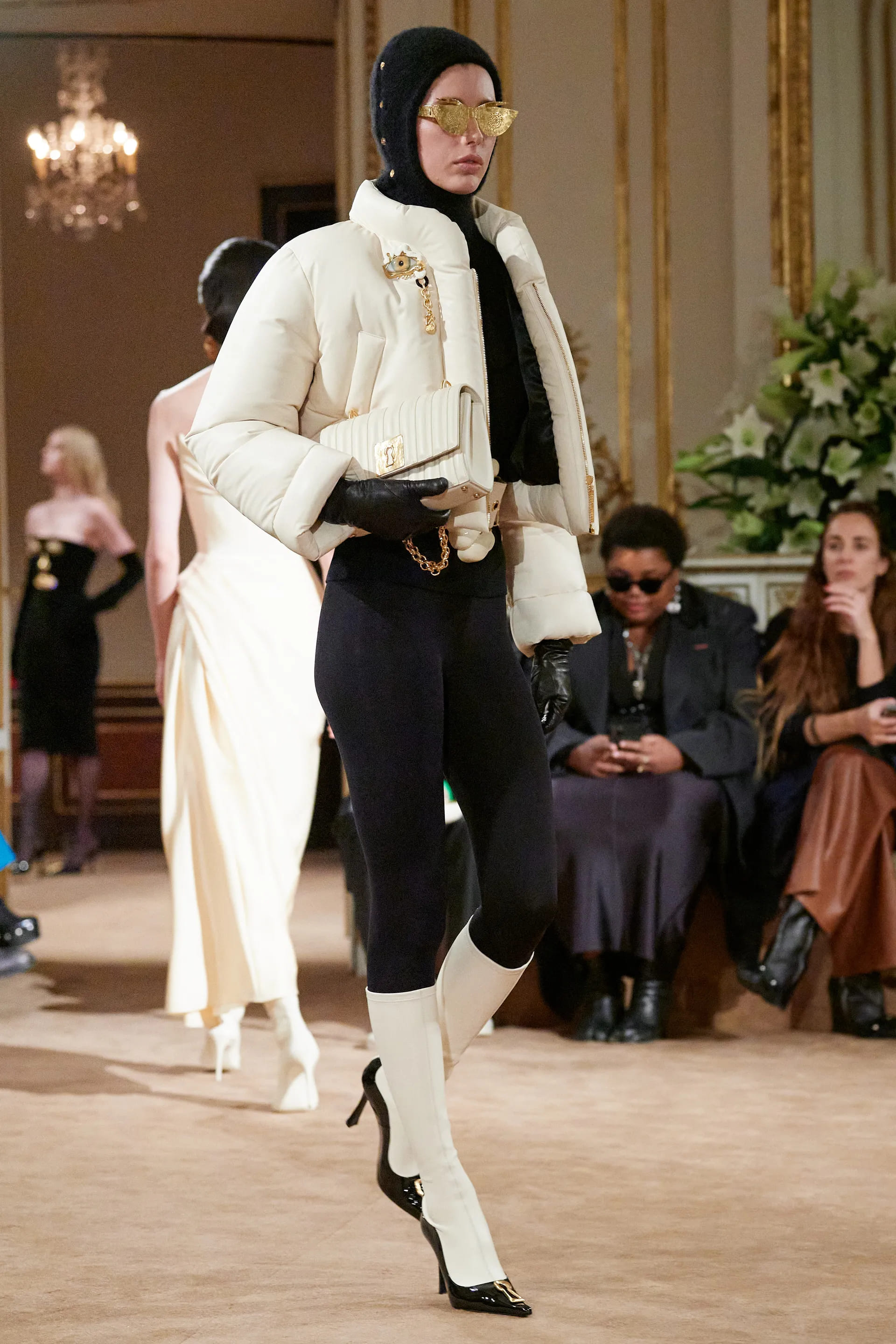 Показ відкрило об’ємне силуетне пальто з максірукавами та фактурними ґудзиками. Доповнений об’ємним білим тюрбаном та високими молочними шкіряними черевиками, образ давав відсилки до футуристичного, свіжого, радикального погляду Ельзи, з яким вона увірвалася у світ моди в 1930-ті.