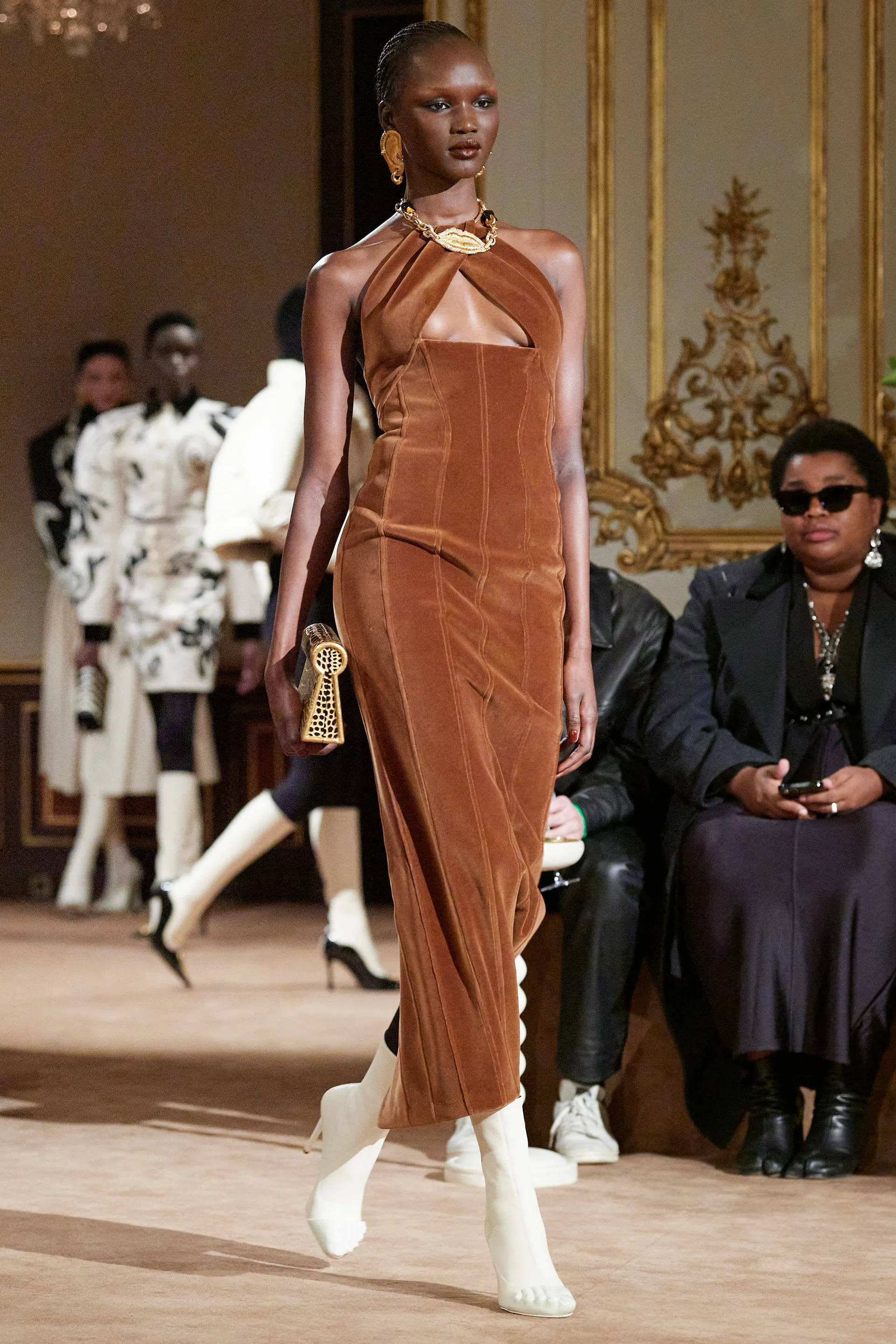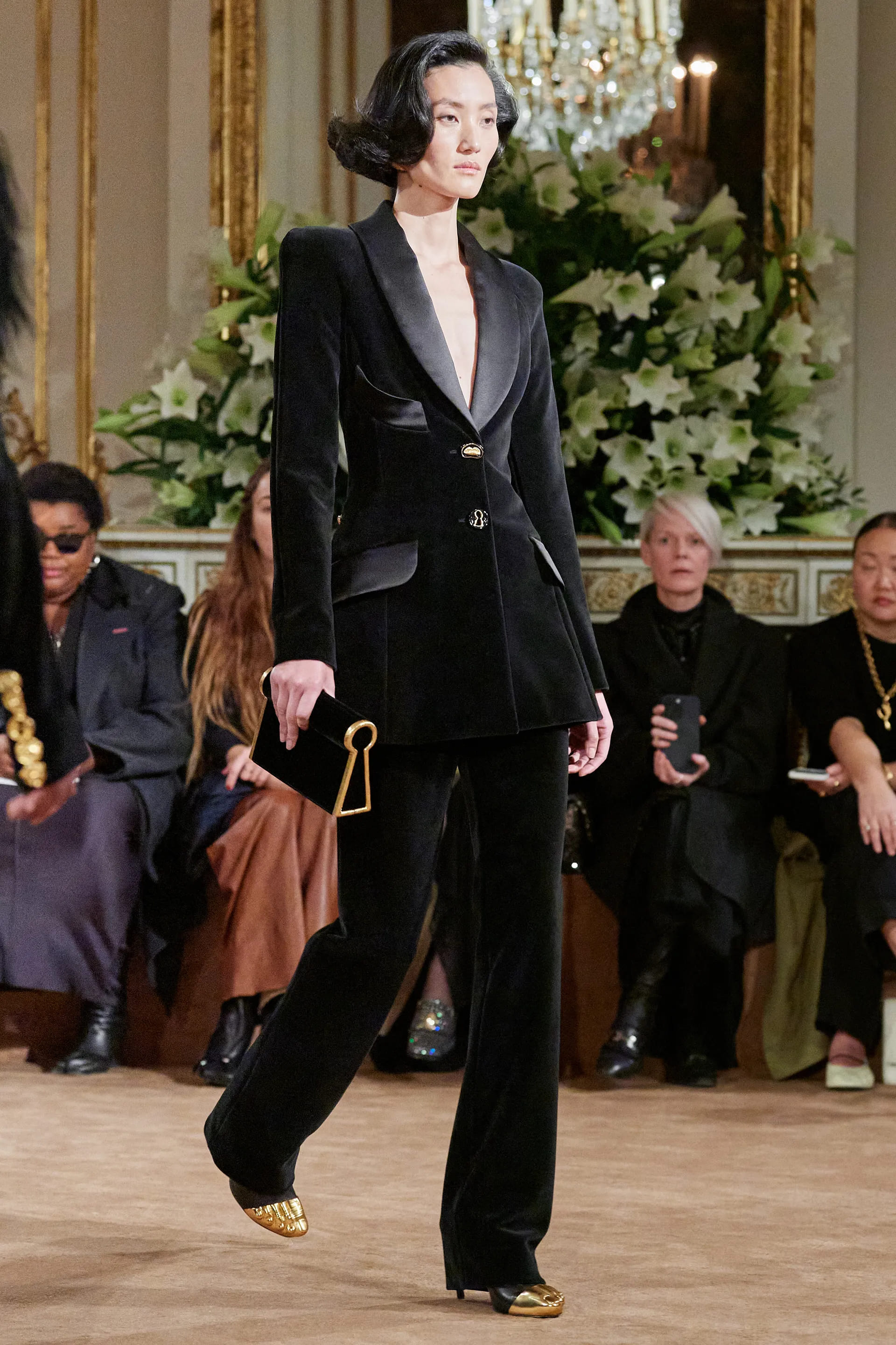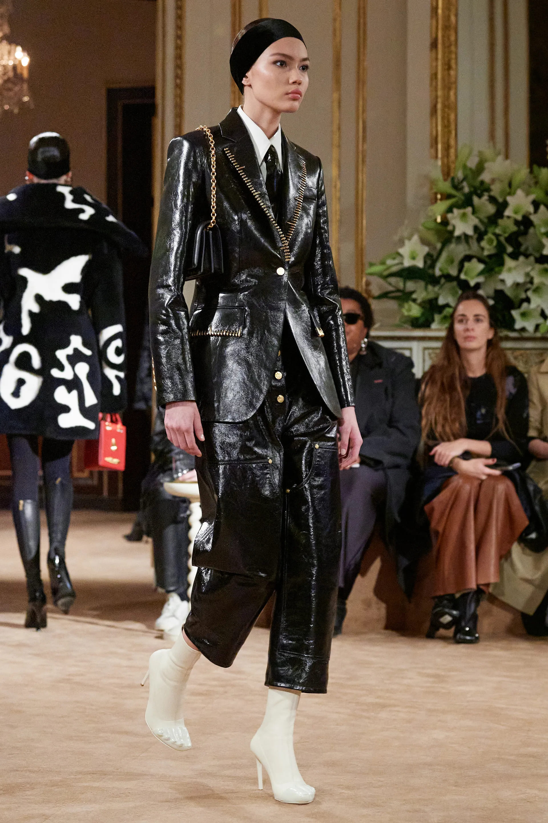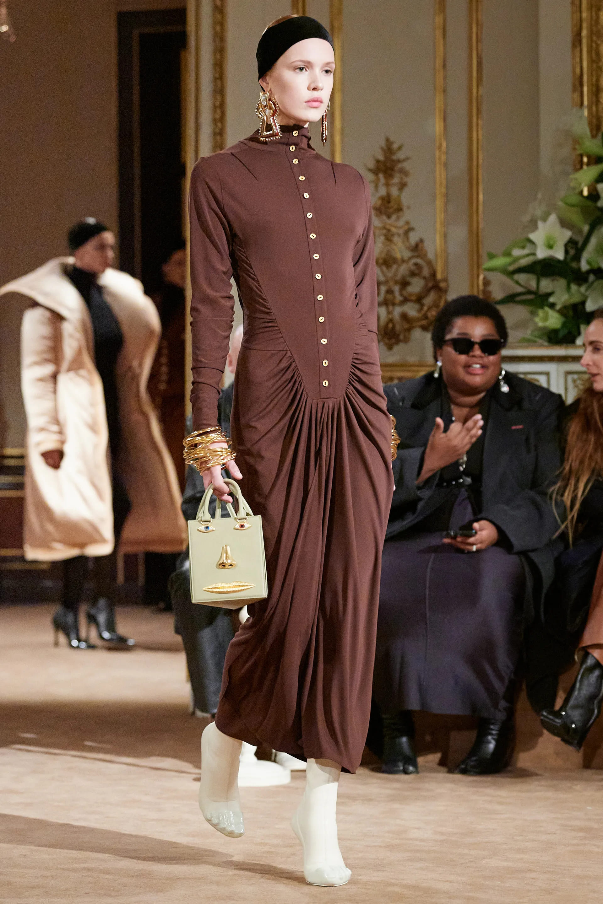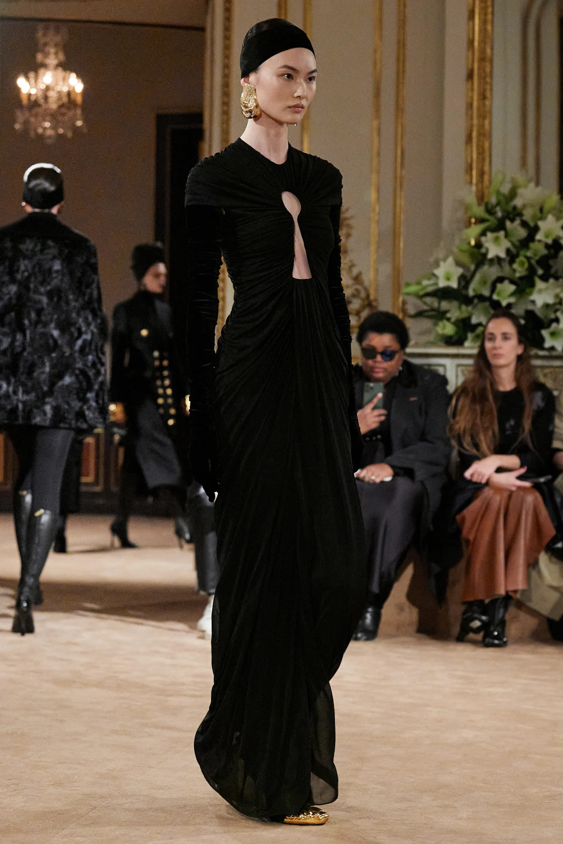 Показ відкрило об’ємне силуетне пальто з максірукавами та фактурними ґудзиками. Доповнений об’ємним білим тюрбаном та високими молочними шкіряними черевиками, образ давав відсилки до футуристичного, свіжого, радикального погляду Ельзи, з яким вона увірвалася у світ моди в 1930-ті.